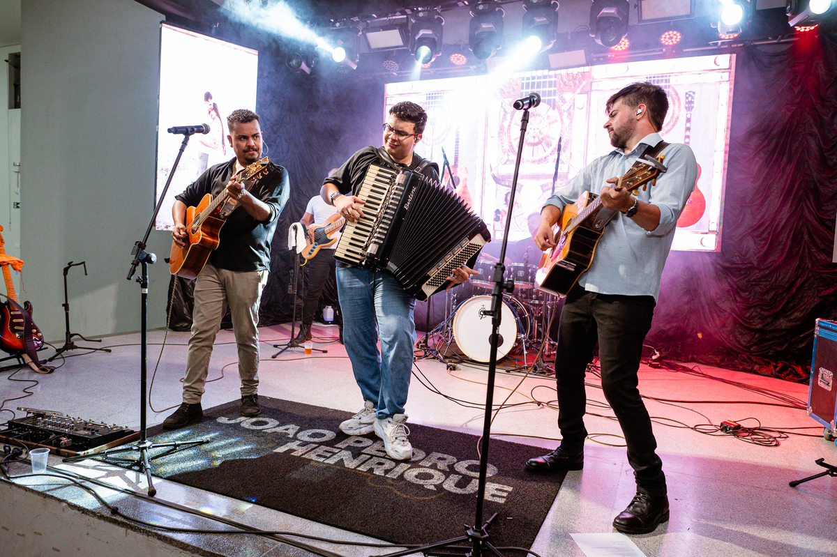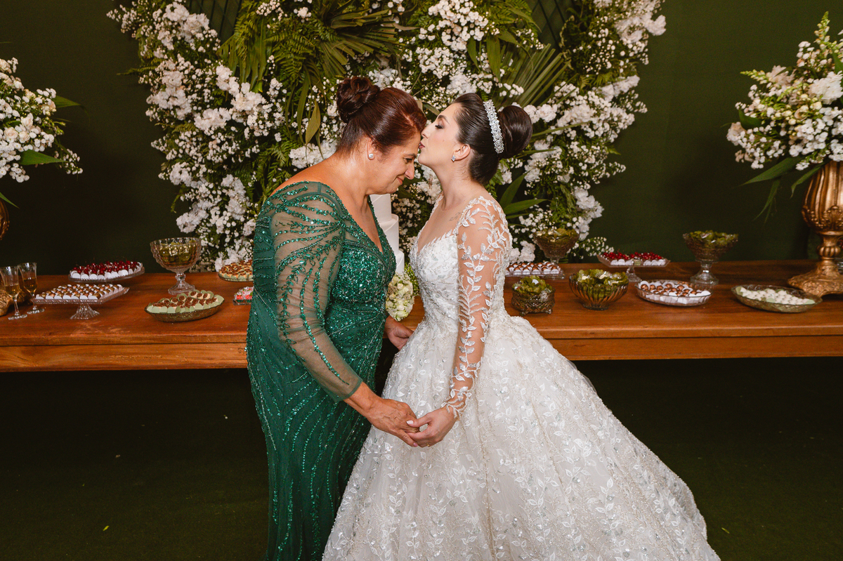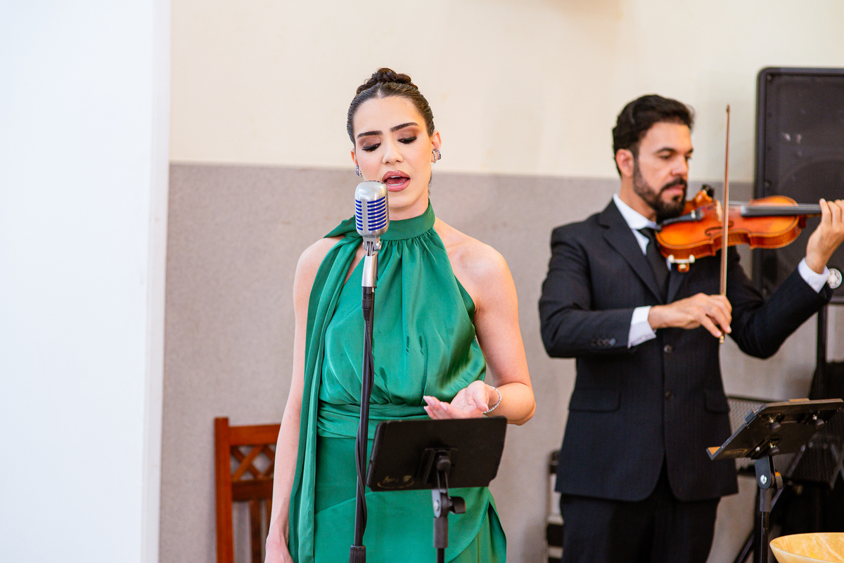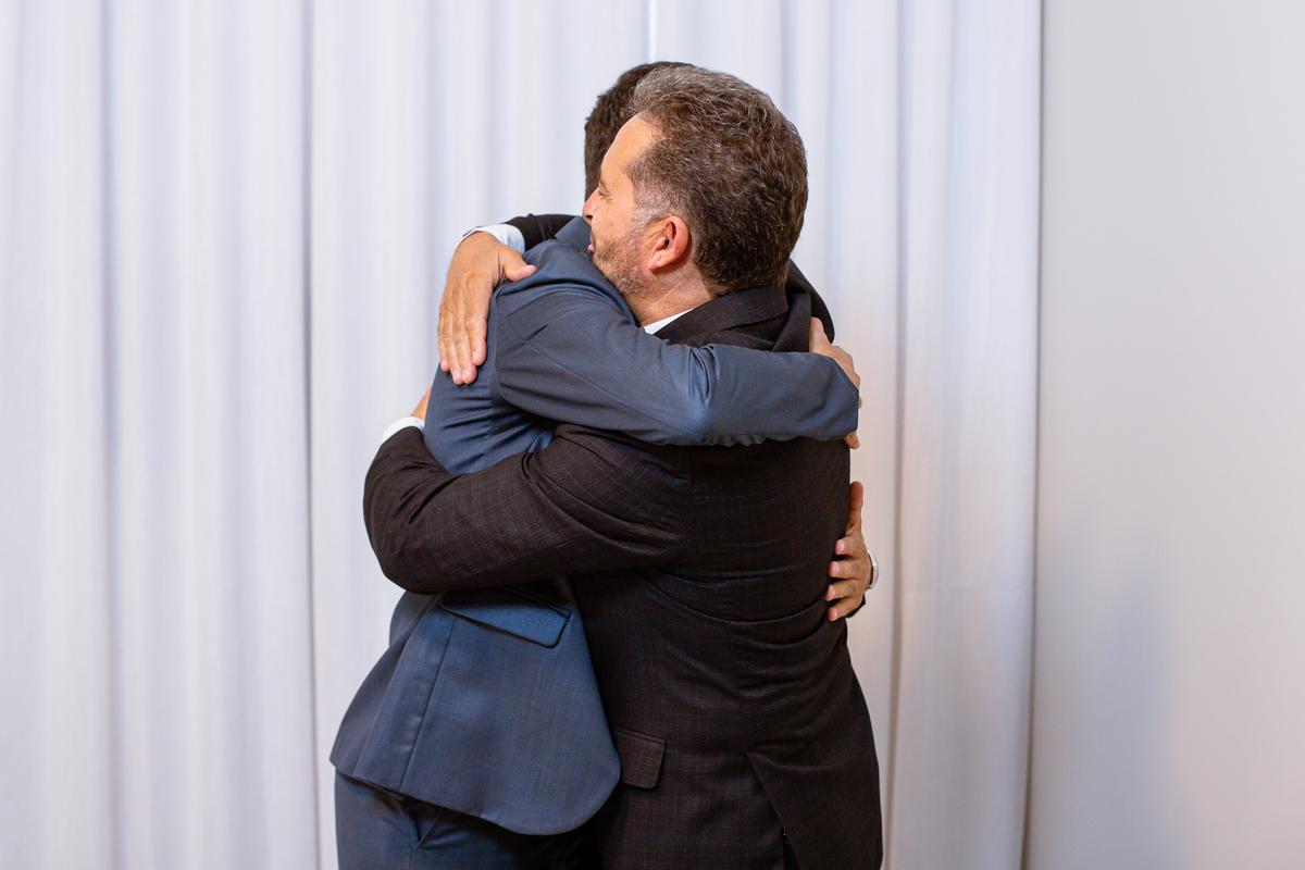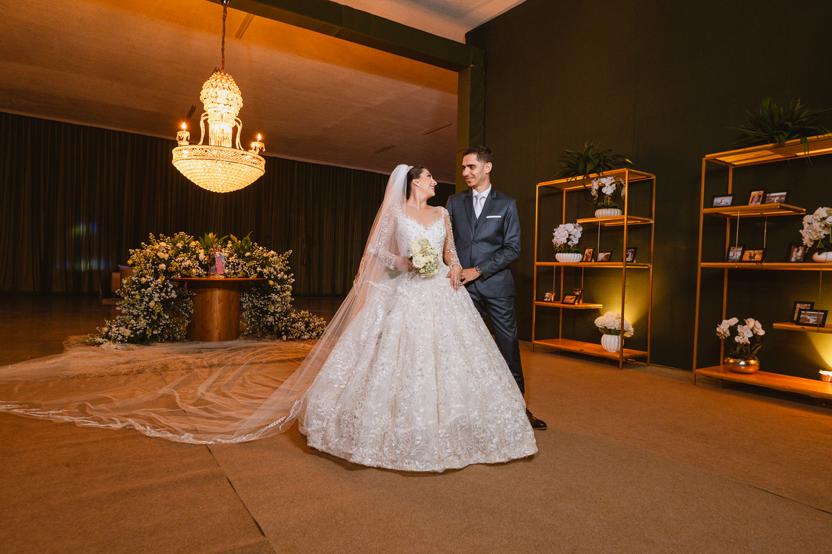 Enfim, depois desse momento super emocionante, os dois se posicionaram detrás da porta. O músico responsável pela anunciação da entrada da noiva começou a tocar sua trombeta no corredor. Era chegada a hora mais esperada. Os corações todos aflitos, mal podiam conter a explosão de sentimentos. Depois de chegar ao final do corredor, o músico se virou e finalizou a marcha nupcial. As portas foram abertas e Amanda surgiu de braços dados com seu pai. A luz daquela tarde entrou naquele ambiente como se fosse um sopro. A noiva parou na primeira parte e olhou nos olhos de seu pai que lhe retribuiu com um largo sorriso. Eles caminharam lentamente rumo ao encontro com o noivo. Poucos passos depois, eles pararam e aguardaram a vinda de Murilo. O noivo caminhou até eles, esperou seu sogro se despedir de Amanda e recebeu dele a mão de sua noiva. Foi um momento muito especial de carinho. Quem conhece o pai da noiva sabe o quanto ele não é de demonstrar carinho em público. Mas ele fez! Olhou nos olhos da filha, parou de frente, encostou a cabeça de leve em sua testa e depois a beijou. Por fim, entregou a mão dela para seu amado noivo e ainda com as lágrimas descendo o rosto, ele os deixou.