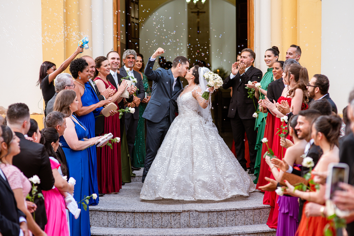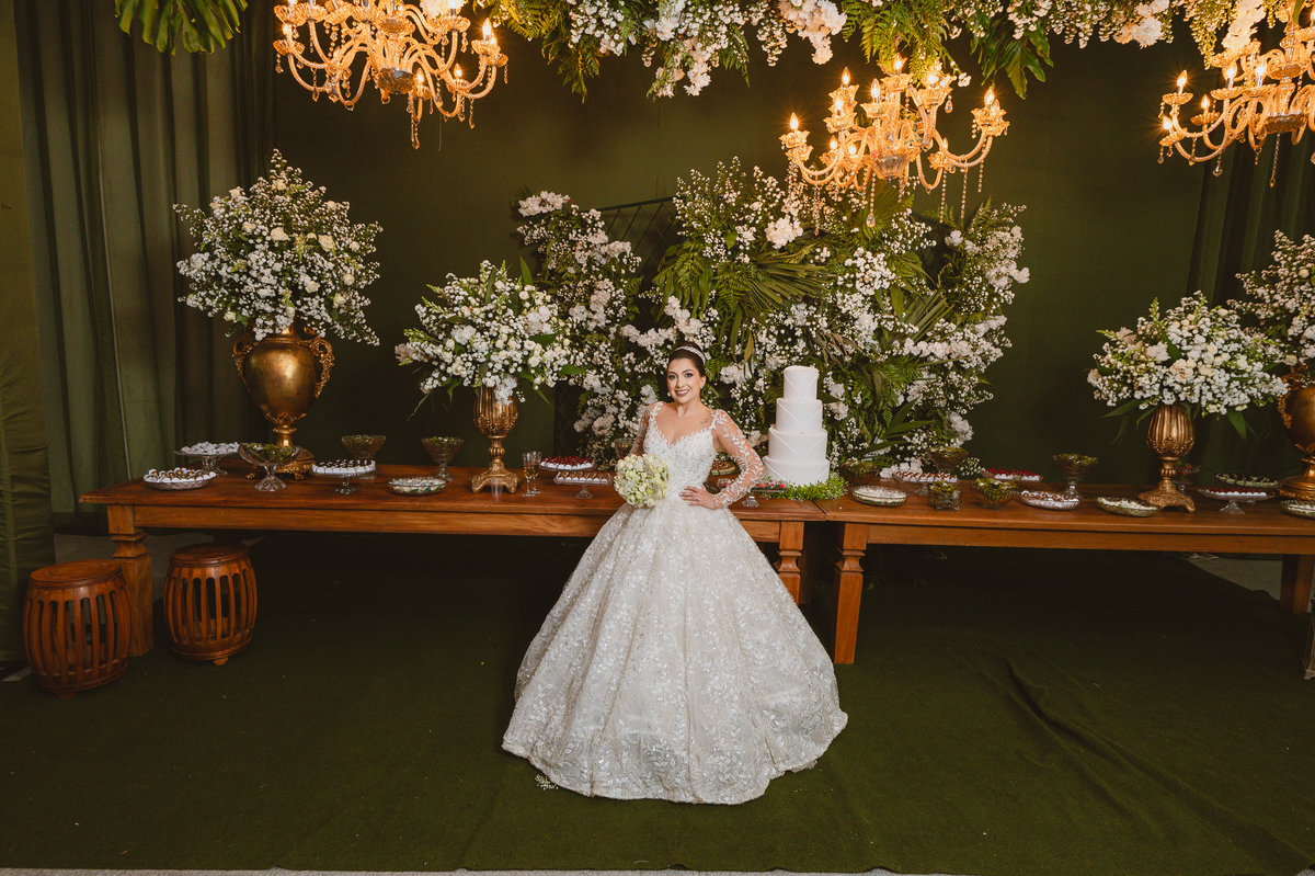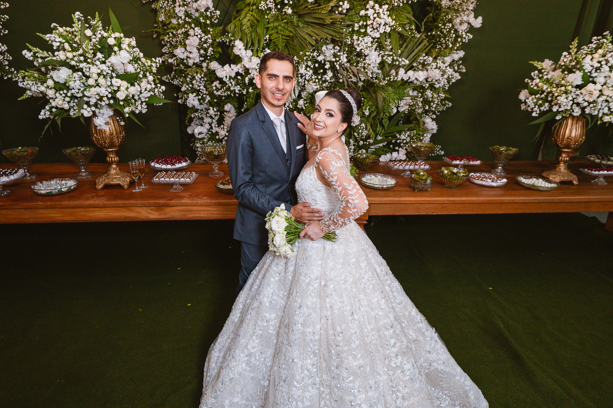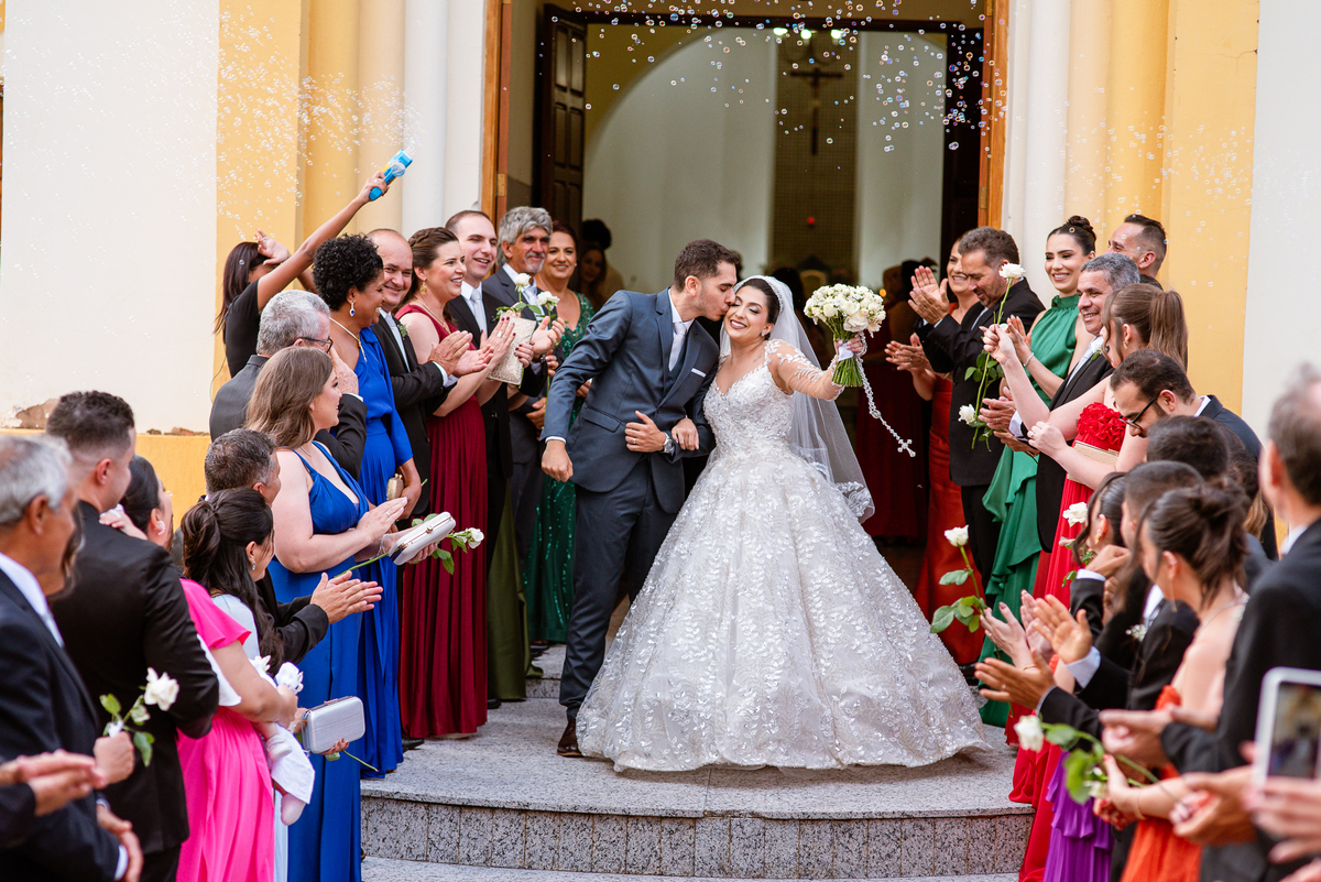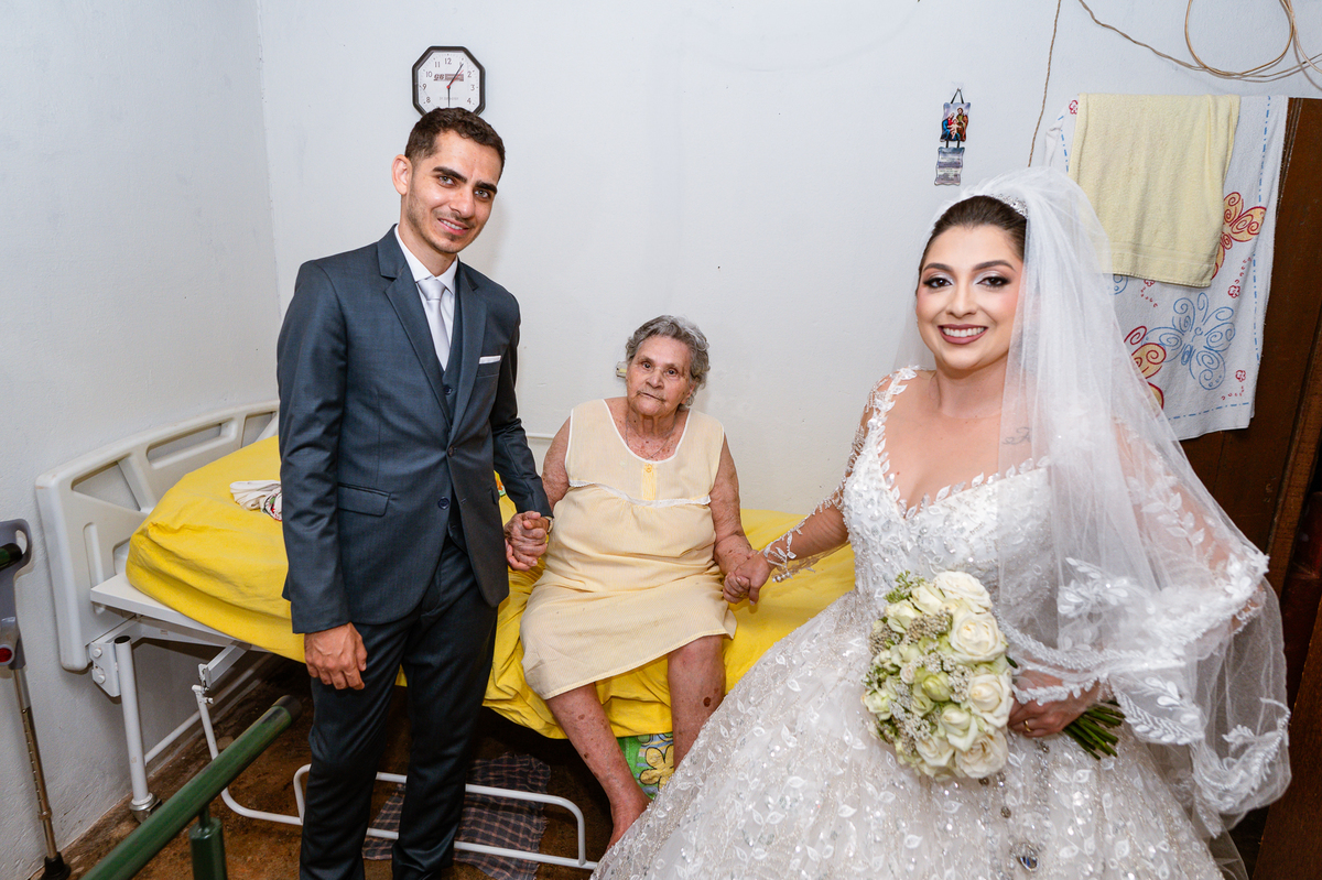 Os nubentes assinaram os documentos e iniciamos nossas fotografias de praxe no altar. Mas quando pensávamos que não haveria mais surpresas, a irmã do noivo surpreendeu ao fazer uma bela homenagem aos dois. Ela cantou uma música junto com a equipe musical e fez com que muitos convidados se emocionassem muito. Ao fim, ela abraçou Amanda e logo depois seu irmão, visivelmente emocionado. Ela mal conseguiu terminar de cantar, pois as lágrimas insistiam em cair de seu rosto. Depois dessa emoção fortíssima, encerramos as fotografias e preparamos para a saída do casal. Do lado de fora, os padrinhos já estavam enfileirados aguardando seus apadrinhados passarem. E com muita festa e bolhinhas de sabão, eles receberam os recém-casados. Depois de fazermos as fotos do lado de fora, eles desejaram fazer parte do ensaio de noivos dentro da Igreja, o que prontamente atendemos. Depois das fotos, eles me pediram para ir fazer uma foto muito especial. A avó de Murilo infelizmente não consegue sair de casa, o que impossibilitou de ir ao casamento. Mas nada nos impediria de irmos pessoalmente lá visitar ela. Chegando lá, foi uma emoção muito bacana. Mesmo sem enxergar, ela ficou muito feliz com a visita dos seus netos. Fizemos as fotos do casal com a vovó, e no final ela ainda nos presenteou com um sorrisão lindo. Disse que ficou muito feliz com a visita e se entristecia de não poder comparecer ao casamento. Foi muito legal essa visita à ela. Posteriormente, fomos para a recepção onde finalizamos o mini ensaio. A decoração estava lindíssima, os convidados todos ficaram surpreendidos com a beleza do lugar.