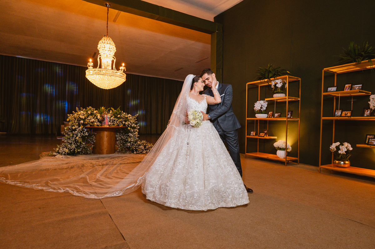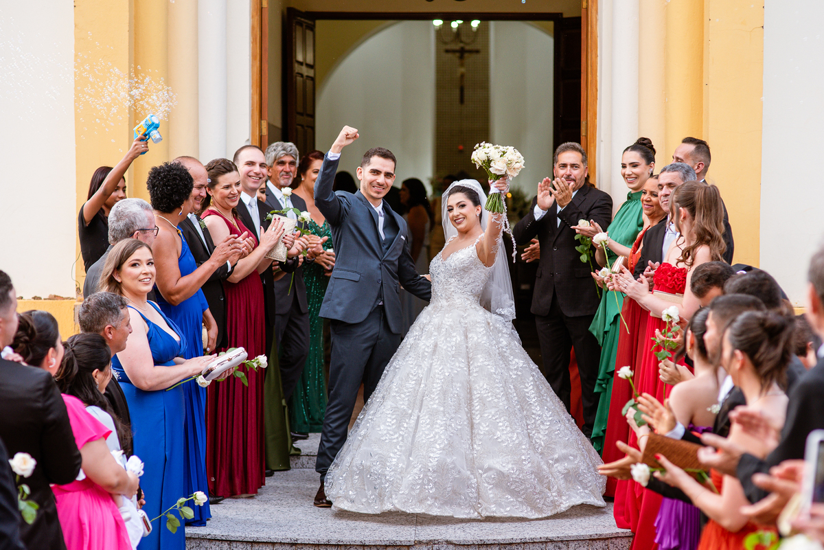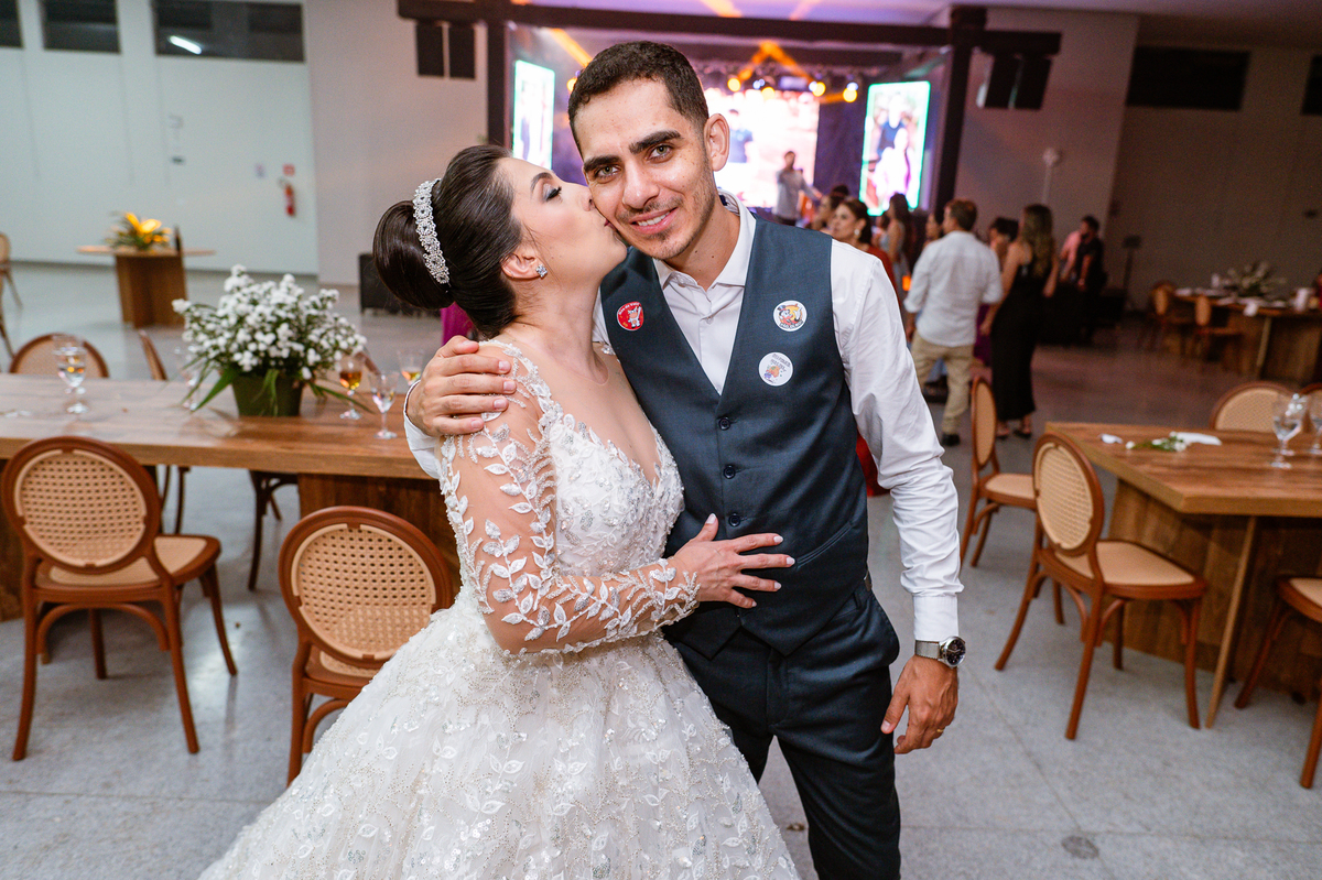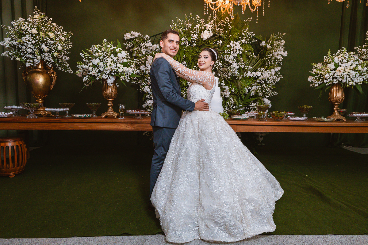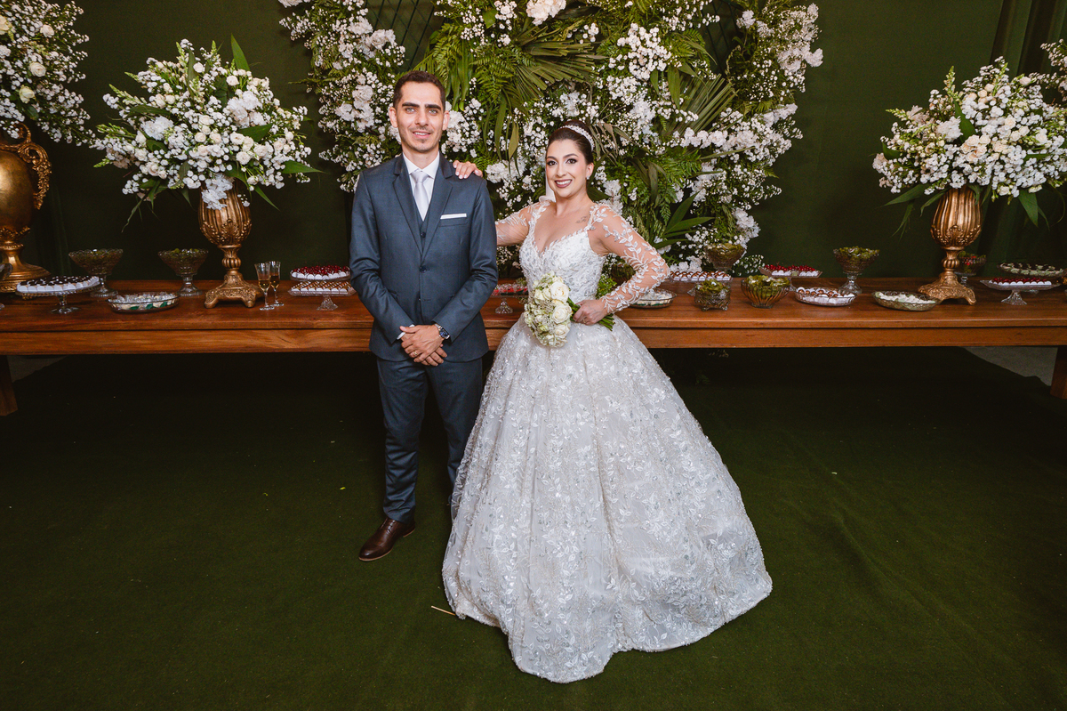 Os nubentes assinaram os documentos e iniciamos nossas fotografias de praxe no altar. Mas quando pensávamos que não haveria mais surpresas, a irmã do noivo surpreendeu ao fazer uma bela homenagem aos dois. Ela cantou uma música junto com a equipe musical e fez com que muitos convidados se emocionassem muito. Ao fim, ela abraçou Amanda e logo depois seu irmão, visivelmente emocionado. Ela mal conseguiu terminar de cantar, pois as lágrimas insistiam em cair de seu rosto. Depois dessa emoção fortíssima, encerramos as fotografias e preparamos para a saída do casal. Do lado de fora, os padrinhos já estavam enfileirados aguardando seus apadrinhados passarem. E com muita festa e bolhinhas de sabão, eles receberam os recém-casados. Depois de fazermos as fotos do lado de fora, eles desejaram fazer parte do ensaio de noivos dentro da Igreja, o que prontamente atendemos. Depois das fotos, eles me pediram para ir fazer uma foto muito especial. A avó de Murilo infelizmente não consegue sair de casa, o que impossibilitou de ir ao casamento. Mas nada nos impediria de irmos pessoalmente lá visitar ela. Chegando lá, foi uma emoção muito bacana. Mesmo sem enxergar, ela ficou muito feliz com a visita dos seus netos. Fizemos as fotos do casal com a vovó, e no final ela ainda nos presenteou com um sorrisão lindo. Disse que ficou muito feliz com a visita e se entristecia de não poder comparecer ao casamento. Foi muito legal essa visita à ela. Posteriormente, fomos para a recepção onde finalizamos o mini ensaio. A decoração estava lindíssima, os convidados todos ficaram surpreendidos com a beleza do lugar.