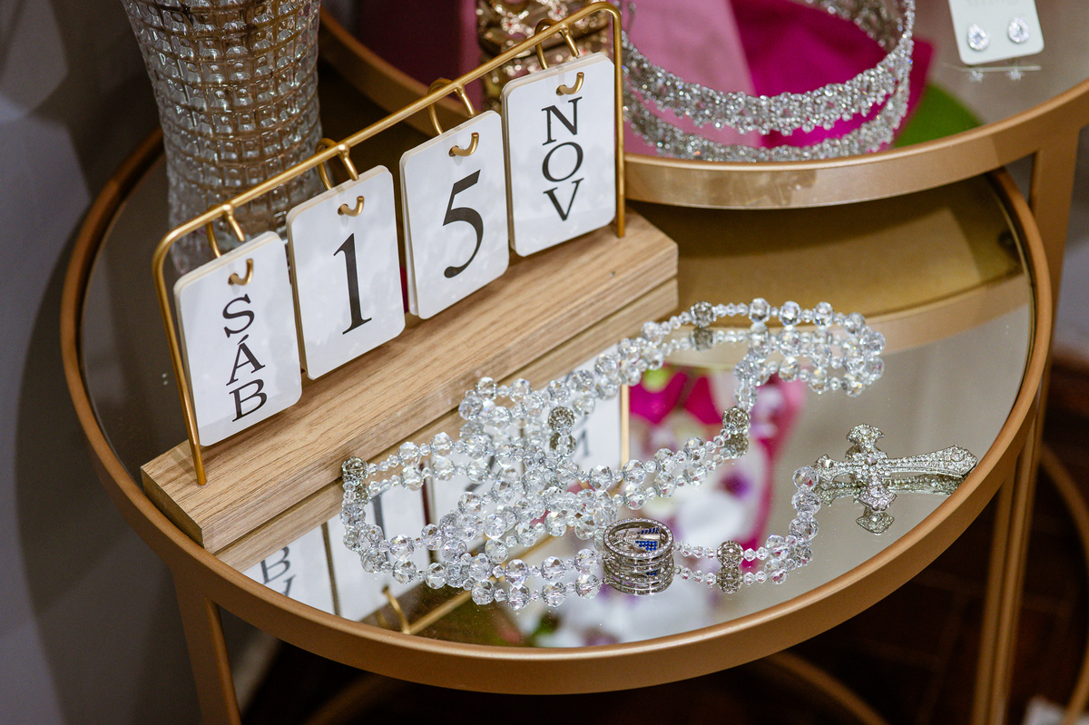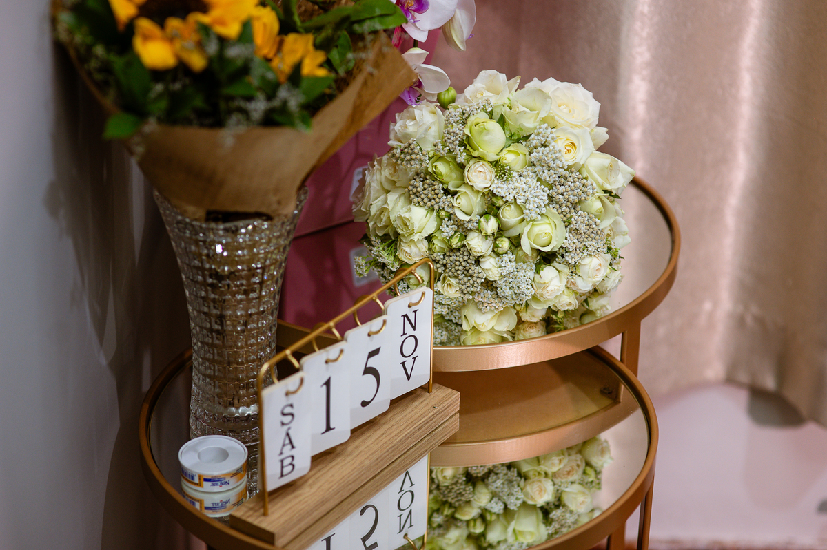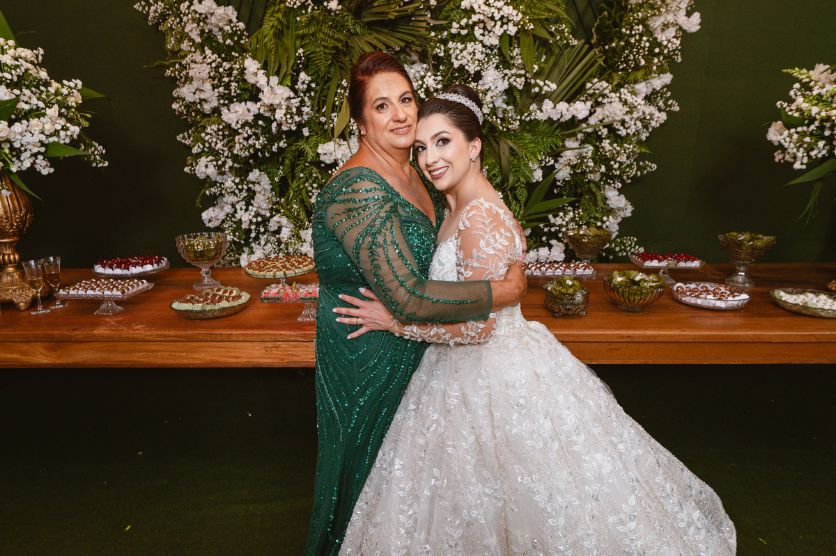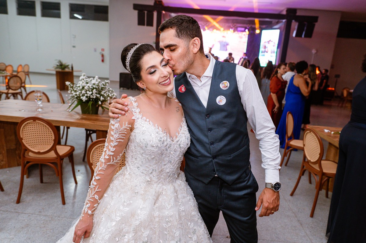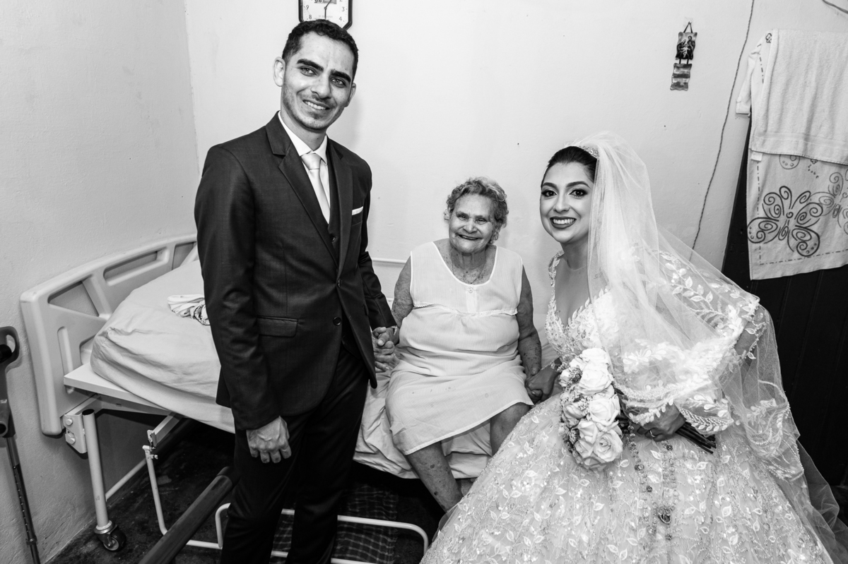 Os nubentes assinaram os documentos e iniciamos nossas fotografias de praxe no altar. Mas quando pensávamos que não haveria mais surpresas, a irmã do noivo surpreendeu ao fazer uma bela homenagem aos dois. Ela cantou uma música junto com a equipe musical e fez com que muitos convidados se emocionassem muito. Ao fim, ela abraçou Amanda e logo depois seu irmão, visivelmente emocionado. Ela mal conseguiu terminar de cantar, pois as lágrimas insistiam em cair de seu rosto. Depois dessa emoção fortíssima, encerramos as fotografias e preparamos para a saída do casal. Do lado de fora, os padrinhos já estavam enfileirados aguardando seus apadrinhados passarem. E com muita festa e bolhinhas de sabão, eles receberam os recém-casados. Depois de fazermos as fotos do lado de fora, eles desejaram fazer parte do ensaio de noivos dentro da Igreja, o que prontamente atendemos. Depois das fotos, eles me pediram para ir fazer uma foto muito especial. A avó de Murilo infelizmente não consegue sair de casa, o que impossibilitou de ir ao casamento. Mas nada nos impediria de irmos pessoalmente lá visitar ela. Chegando lá, foi uma emoção muito bacana. Mesmo sem enxergar, ela ficou muito feliz com a visita dos seus netos. Fizemos as fotos do casal com a vovó, e no final ela ainda nos presenteou com um sorrisão lindo. Disse que ficou muito feliz com a visita e se entristecia de não poder comparecer ao casamento. Foi muito legal essa visita à ela. Posteriormente, fomos para a recepção onde finalizamos o mini ensaio. A decoração estava lindíssima, os convidados todos ficaram surpreendidos com a beleza do lugar.
