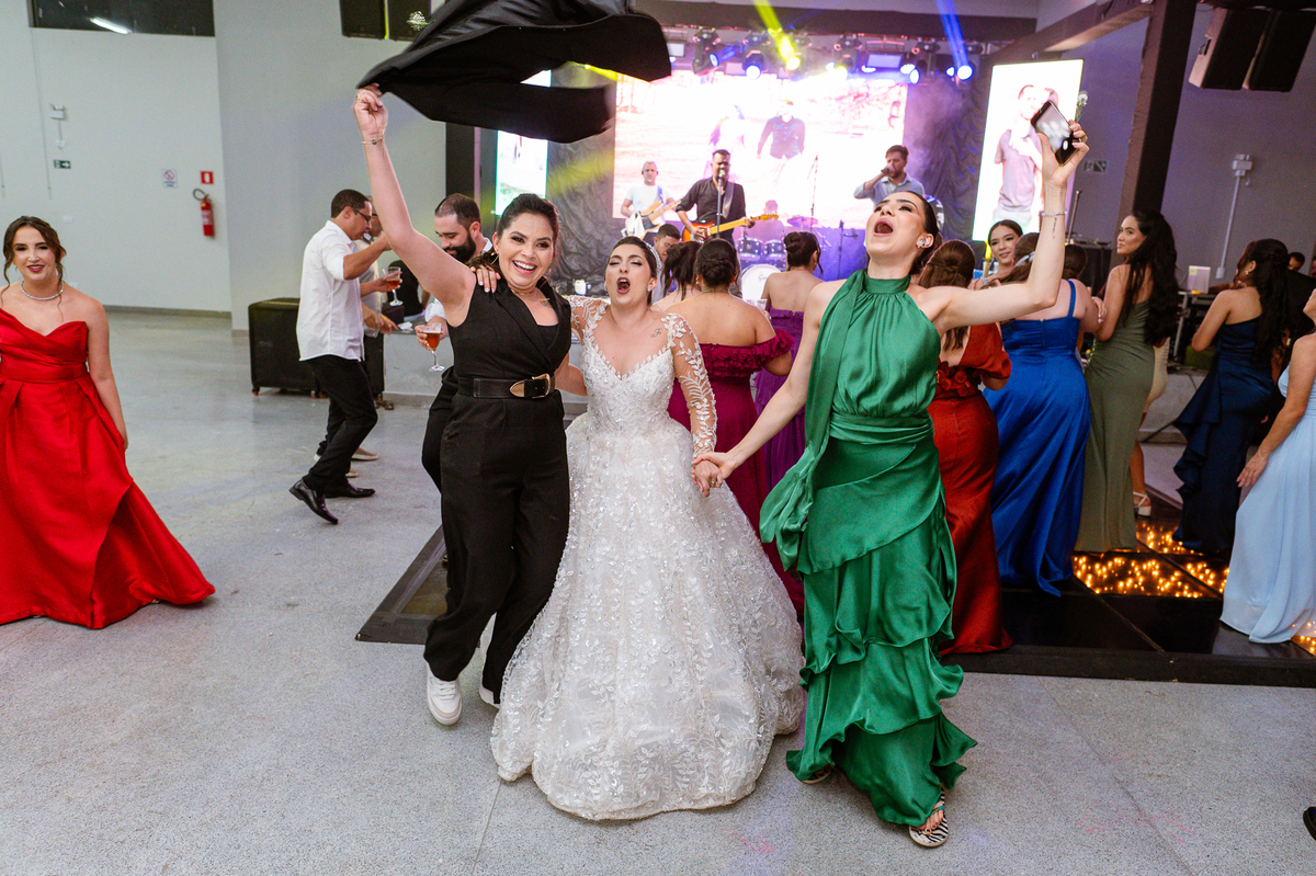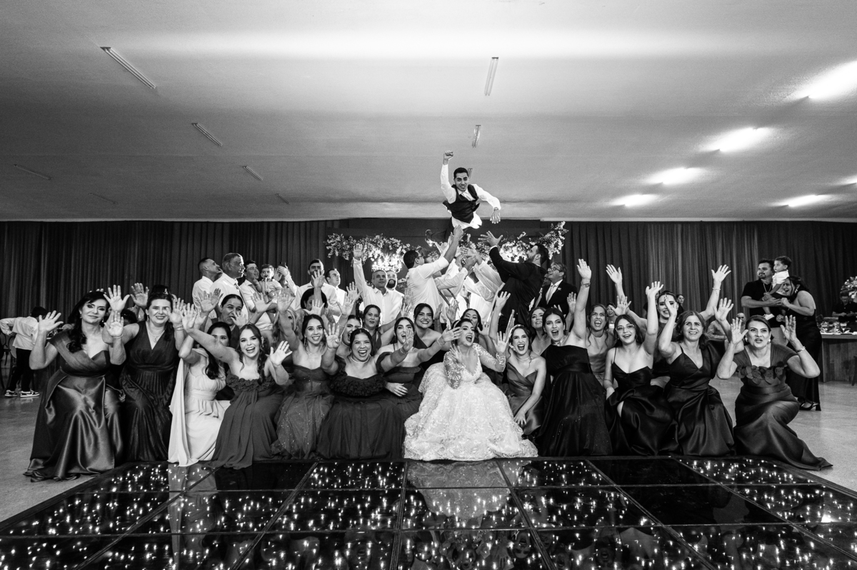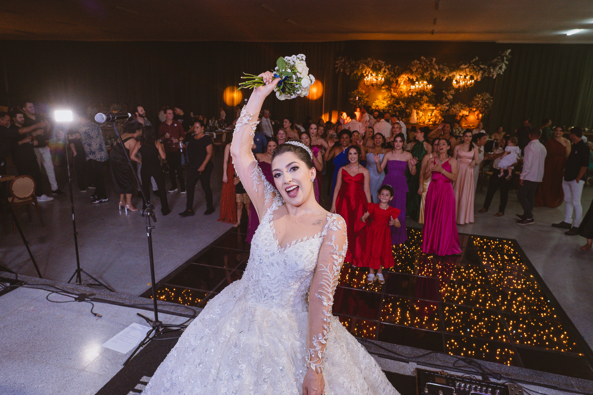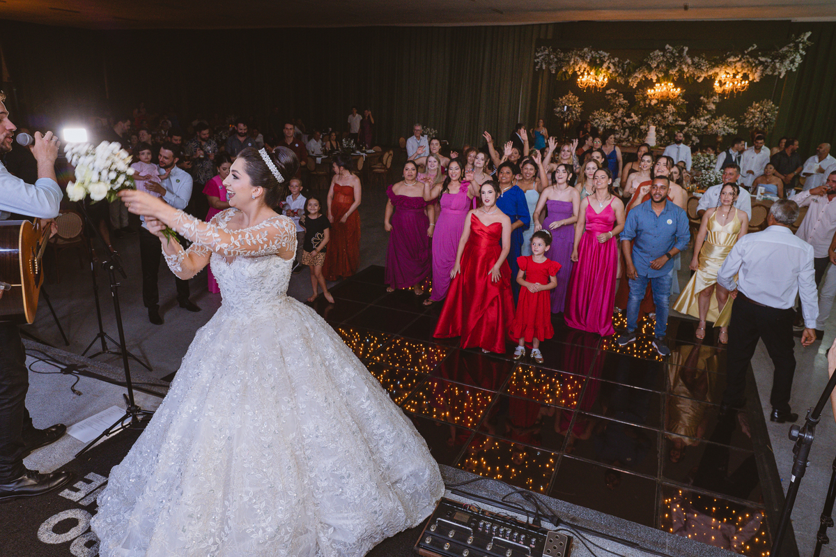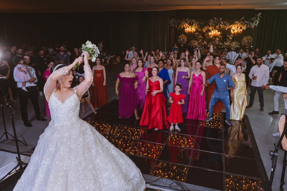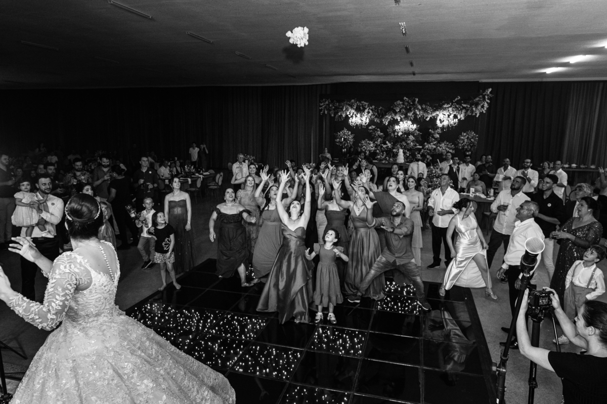 E chegou a hora de a noiva jogar o buquê pra próxima sortuda. Amanda fez questão de convidar todas as solteira, nome por nome no microfone. Depois de reunir todas elas, dançaram no palco e depois de algumas vezes simulando, Amanda jogou seu buquê. A sortuda pulou muito alto e agarrou com toda força, sem chance para as concorrentes do lado. Teve até um padrinho que tentou subir junto mas não teve êxito. Fizemos as fotos dela com a sortuda e partimos para fotografar a pista de dança. O pessoal estava muito animado. Teve convidada que puxou Amanda e dançou muito com ela. Além disso, os cantores chamaram os recém-casados para o palco e convidaram também as madrinhas e depois os padrinhos para dançarem juntos lá em cima. Foi uma farra que até os pais dos noivos participaram também. Depois de algumas horas fotografando, encerramos nossa participação com a certeza de termos efetuado mais um trabalho maravilhoso.