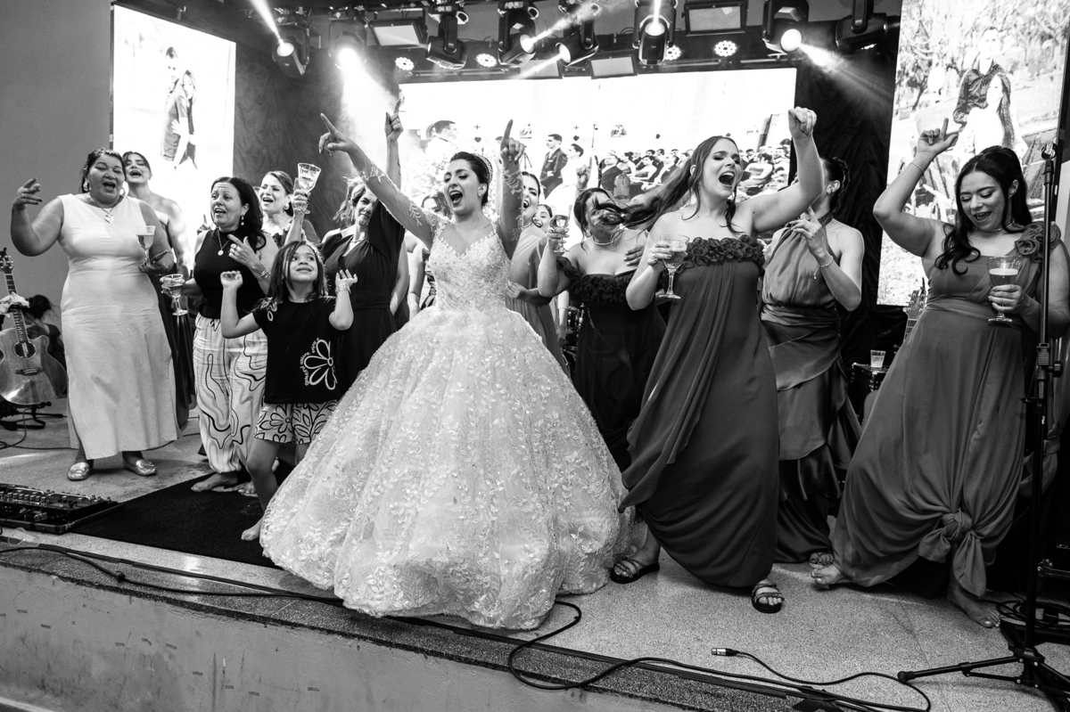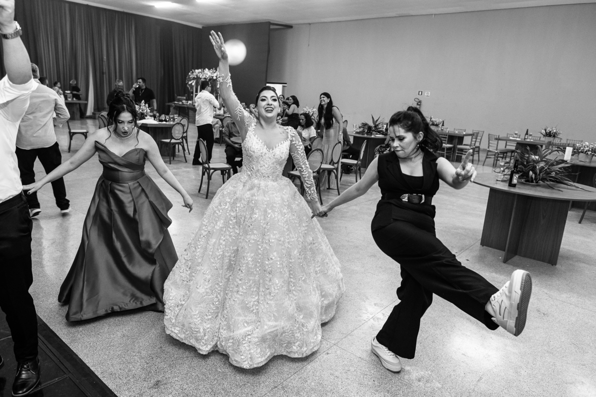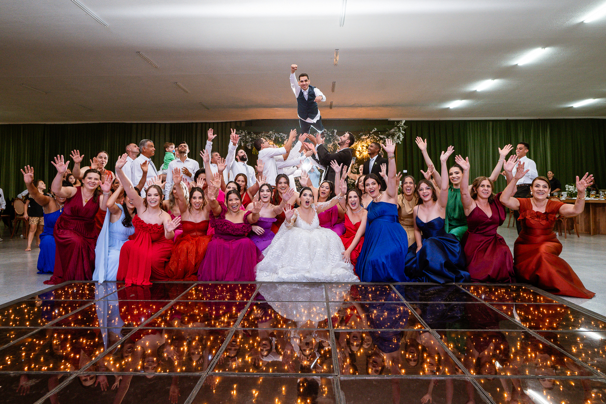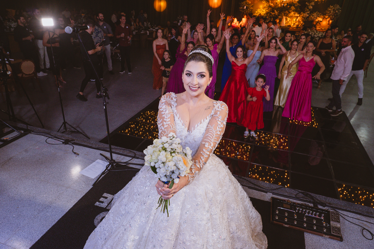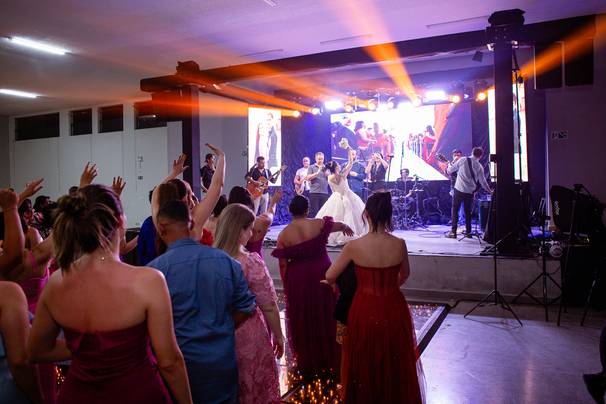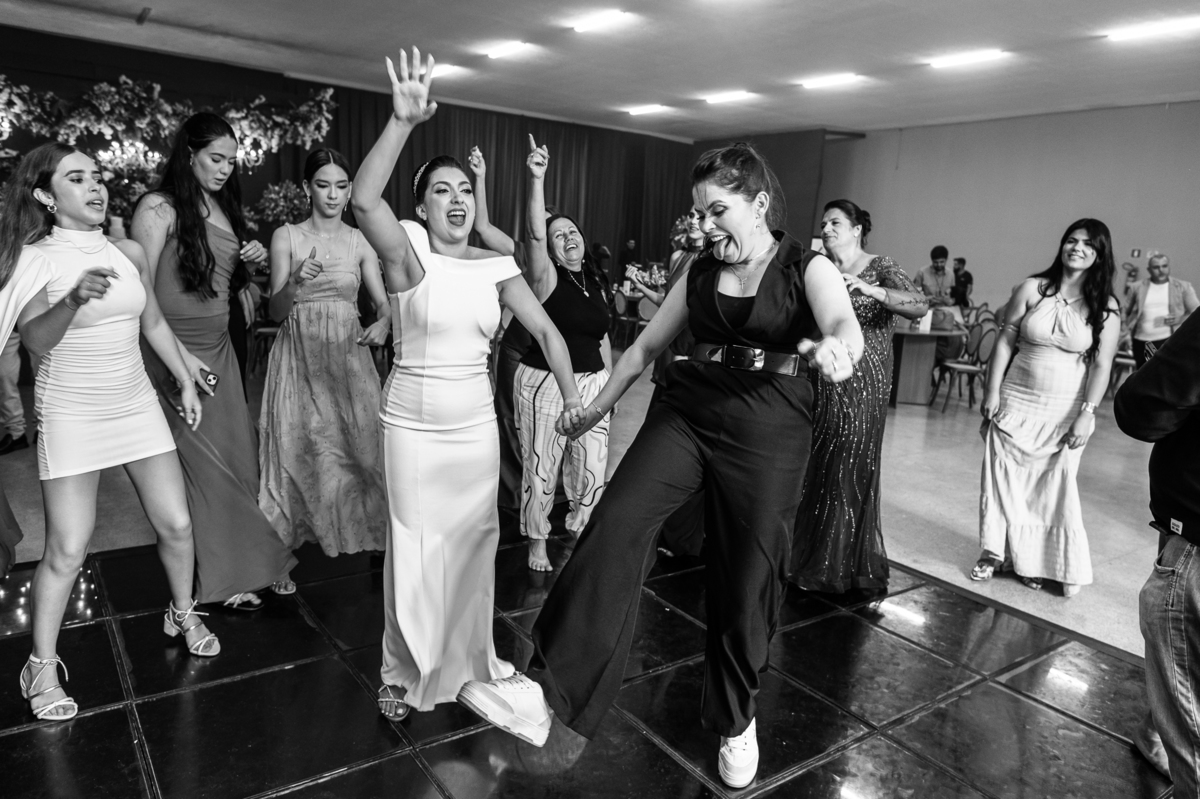 E chegou a hora de a noiva jogar o buquê pra próxima sortuda. Amanda fez questão de convidar todas as solteira, nome por nome no microfone. Depois de reunir todas elas, dançaram no palco e depois de algumas vezes simulando, Amanda jogou seu buquê. A sortuda pulou muito alto e agarrou com toda força, sem chance para as concorrentes do lado. Teve até um padrinho que tentou subir junto mas não teve êxito. Fizemos as fotos dela com a sortuda e partimos para fotografar a pista de dança. O pessoal estava muito animado. Teve convidada que puxou Amanda e dançou muito com ela. Além disso, os cantores chamaram os recém-casados para o palco e convidaram também as madrinhas e depois os padrinhos para dançarem juntos lá em cima. Foi uma farra que até os pais dos noivos participaram também. Depois de algumas horas fotografando, encerramos nossa participação com a certeza de termos efetuado mais um trabalho maravilhoso.