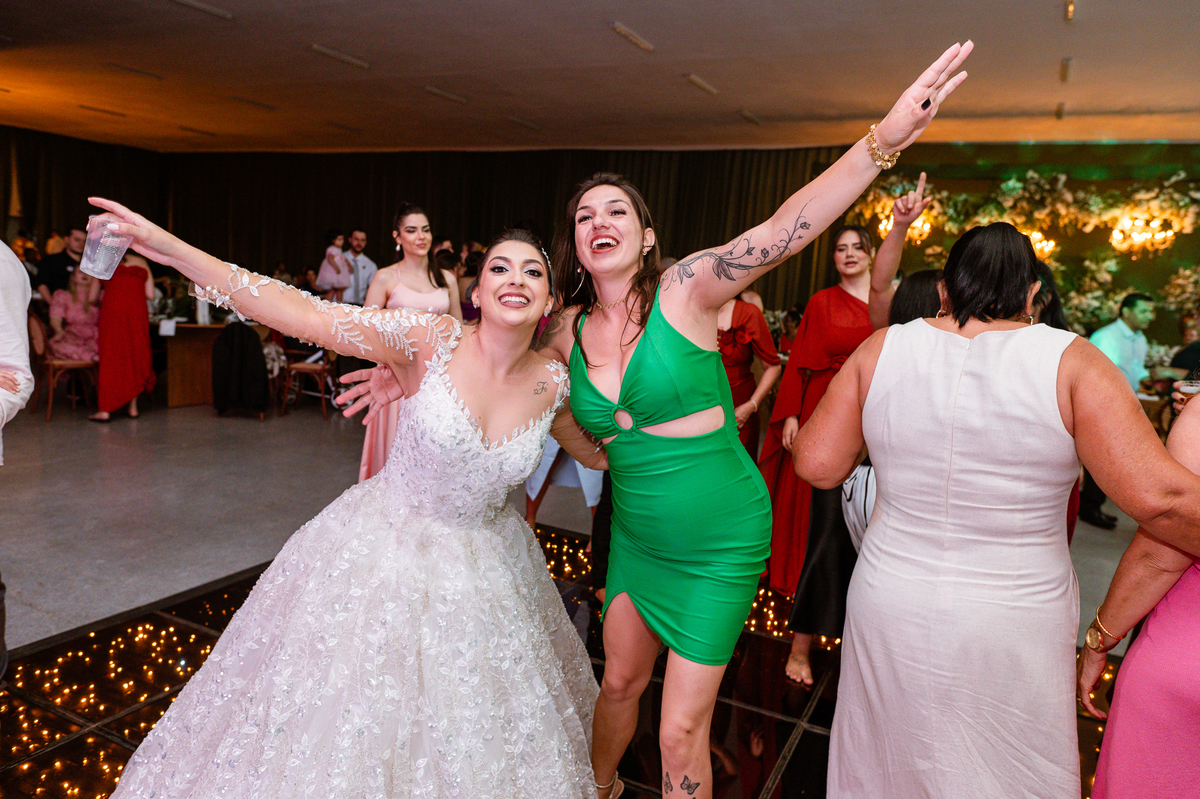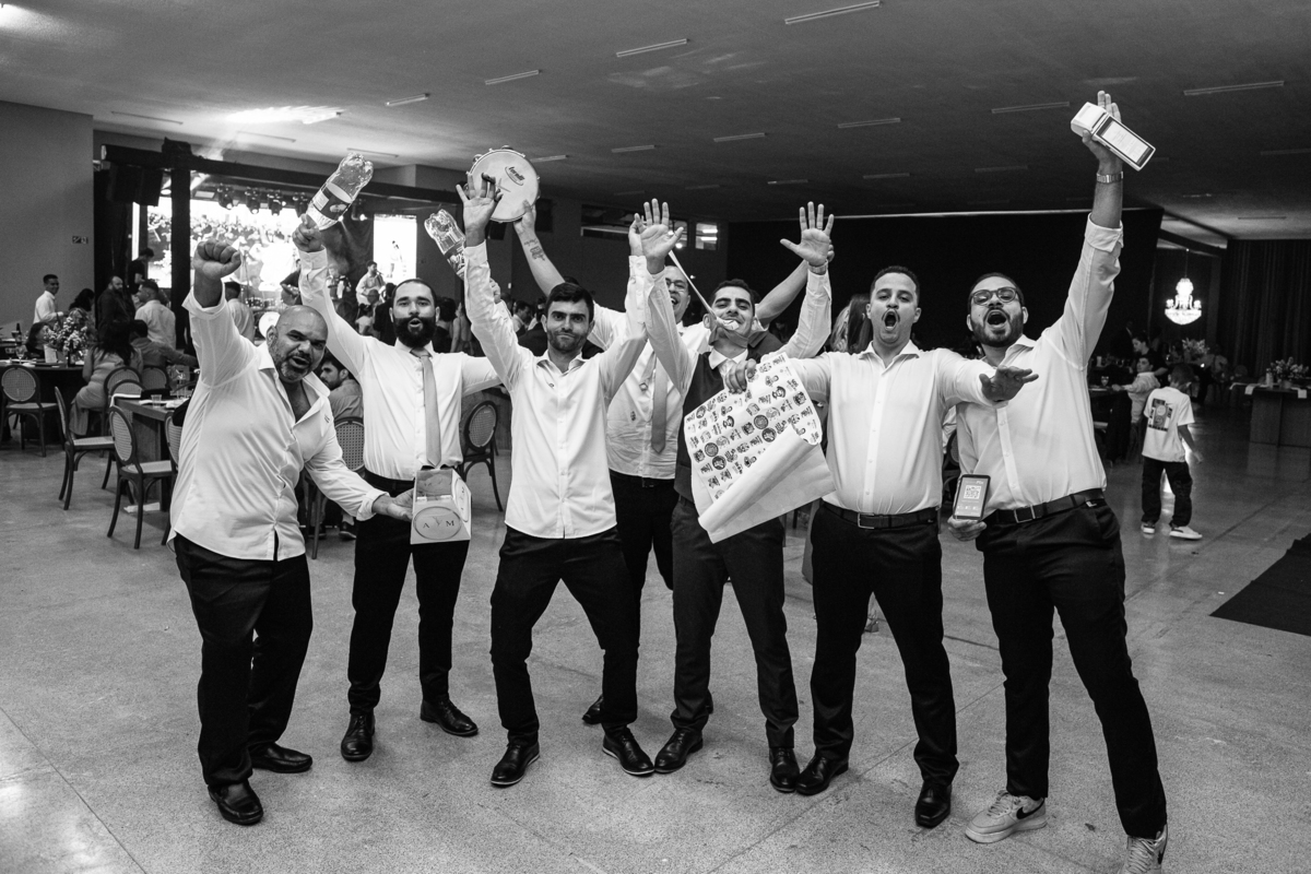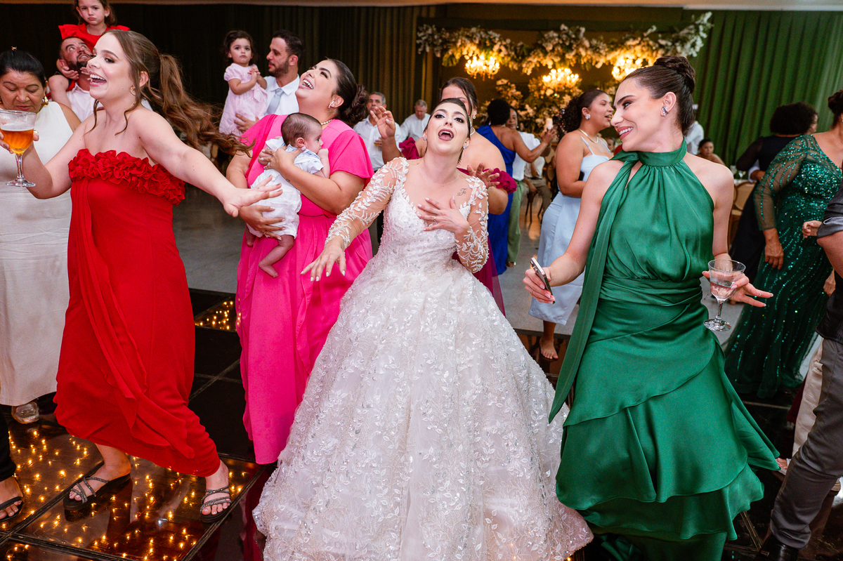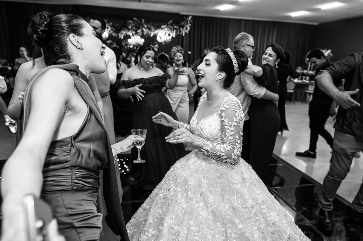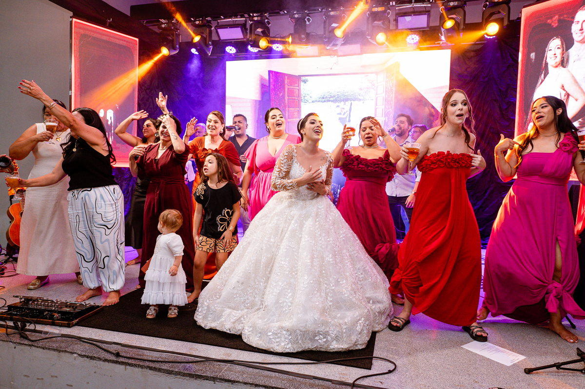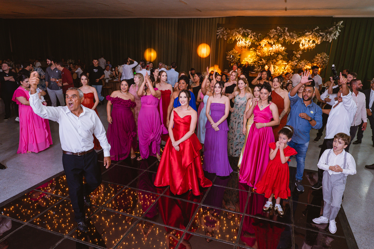 E chegou a hora de a noiva jogar o buquê pra próxima sortuda. Amanda fez questão de convidar todas as solteira, nome por nome no microfone. Depois de reunir todas elas, dançaram no palco e depois de algumas vezes simulando, Amanda jogou seu buquê. A sortuda pulou muito alto e agarrou com toda força, sem chance para as concorrentes do lado. Teve até um padrinho que tentou subir junto mas não teve êxito. Fizemos as fotos dela com a sortuda e partimos para fotografar a pista de dança. O pessoal estava muito animado. Teve convidada que puxou Amanda e dançou muito com ela. Além disso, os cantores chamaram os recém-casados para o palco e convidaram também as madrinhas e depois os padrinhos para dançarem juntos lá em cima. Foi uma farra que até os pais dos noivos participaram também. Depois de algumas horas fotografando, encerramos nossa participação com a certeza de termos efetuado mais um trabalho maravilhoso.