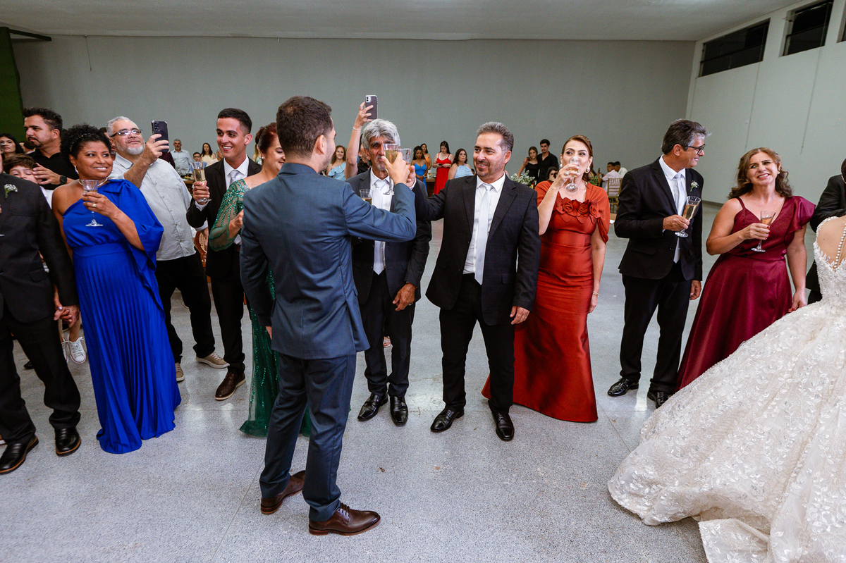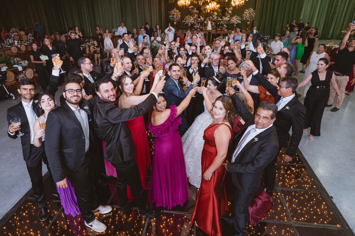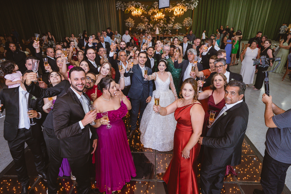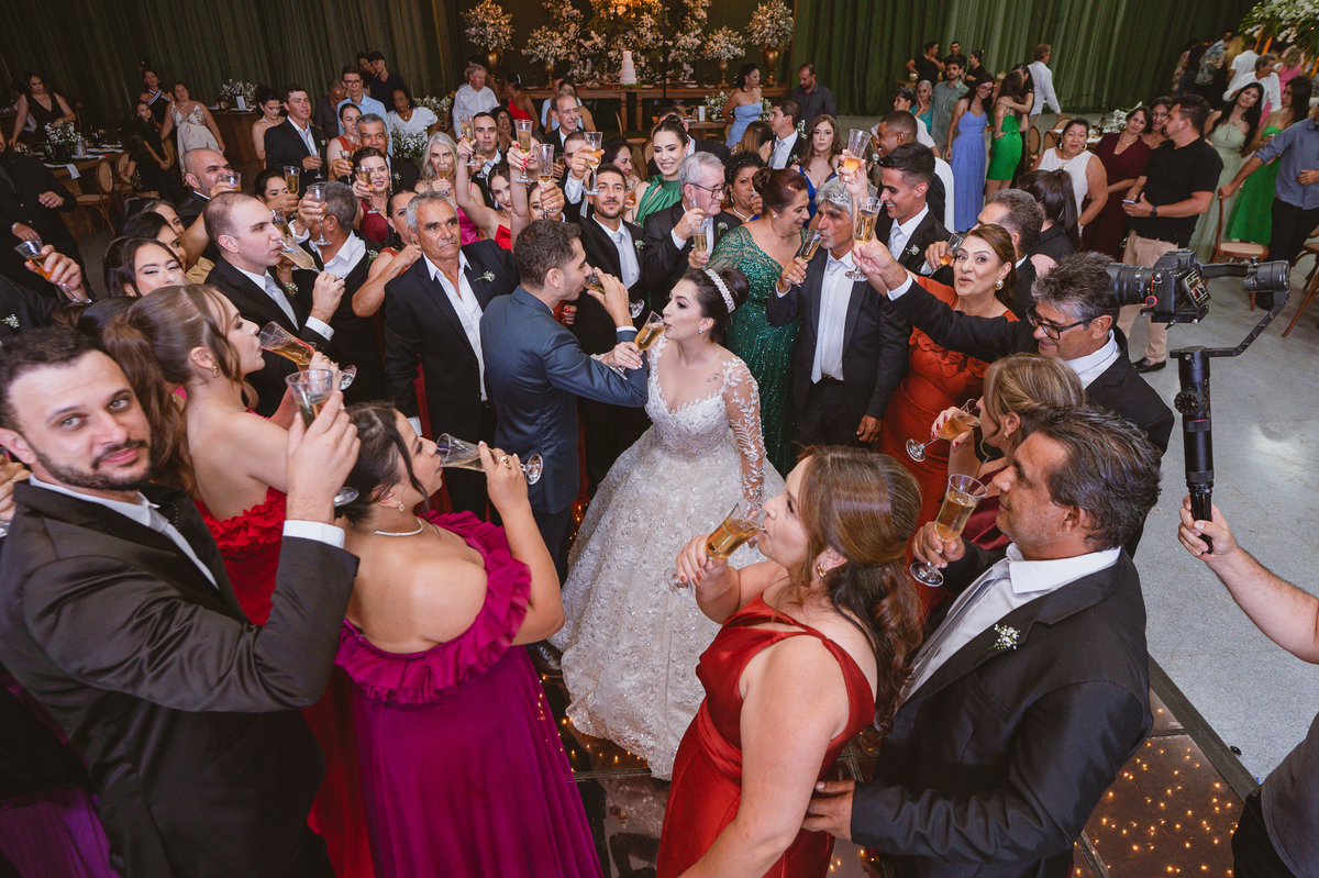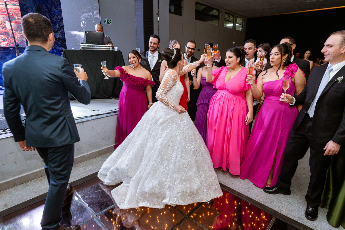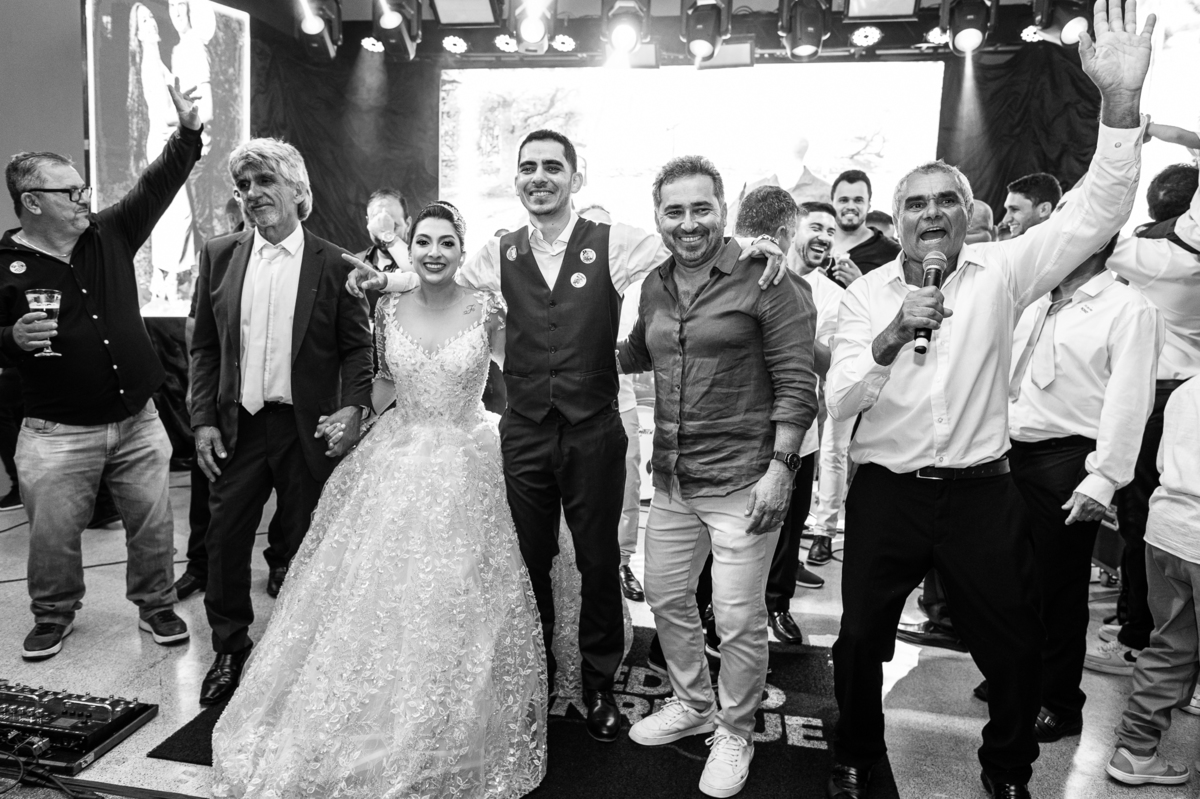 O casal foi anunciado para entrarem na pista de dança onde os padrinhos já os aguardava para o brinde. Eles entraram com muita festa e alegria e passaram brindando de mão em mão, eles se posicionaram ao centro da pista e junto com todos eles comemoraram muito e fizemos as fotos de todos. Fizemos também as fotos dos noivos na mesa do bolo junto com todos os convidados que desejaram fazê-lo. Posteriormente, Murilo foi convidado pelos padrinhos para passarem a gravata. E fizeram uma farra por todo salão. Amanda preferiu cumprimentar seus convidados e aproveitar para curtir o som da dupla que encantou todo mundo. Depois, eles dançaram e curtiram juntos na pista de dança, onde fizemos também uma trend onde o noivo é jogado pra cima. E ficou sensacional!