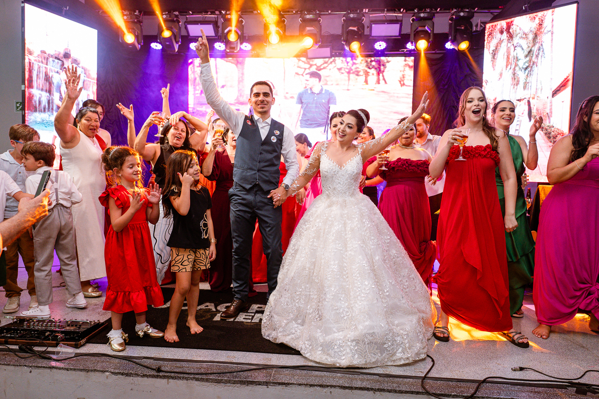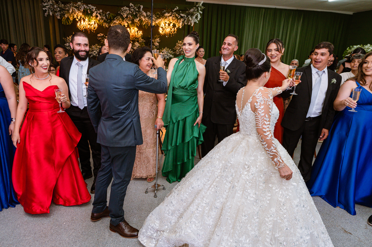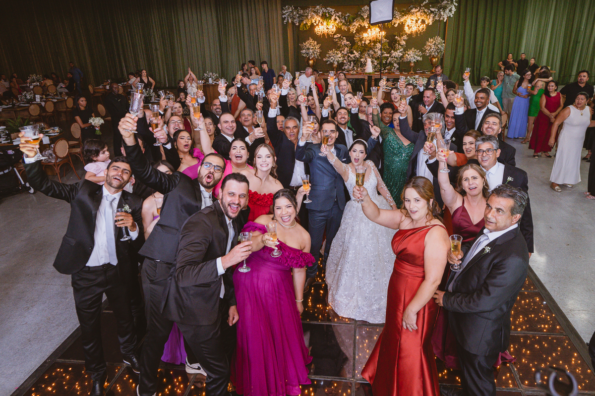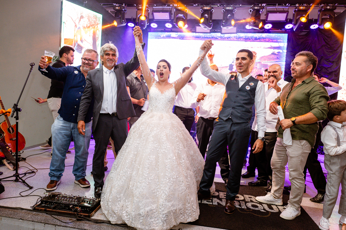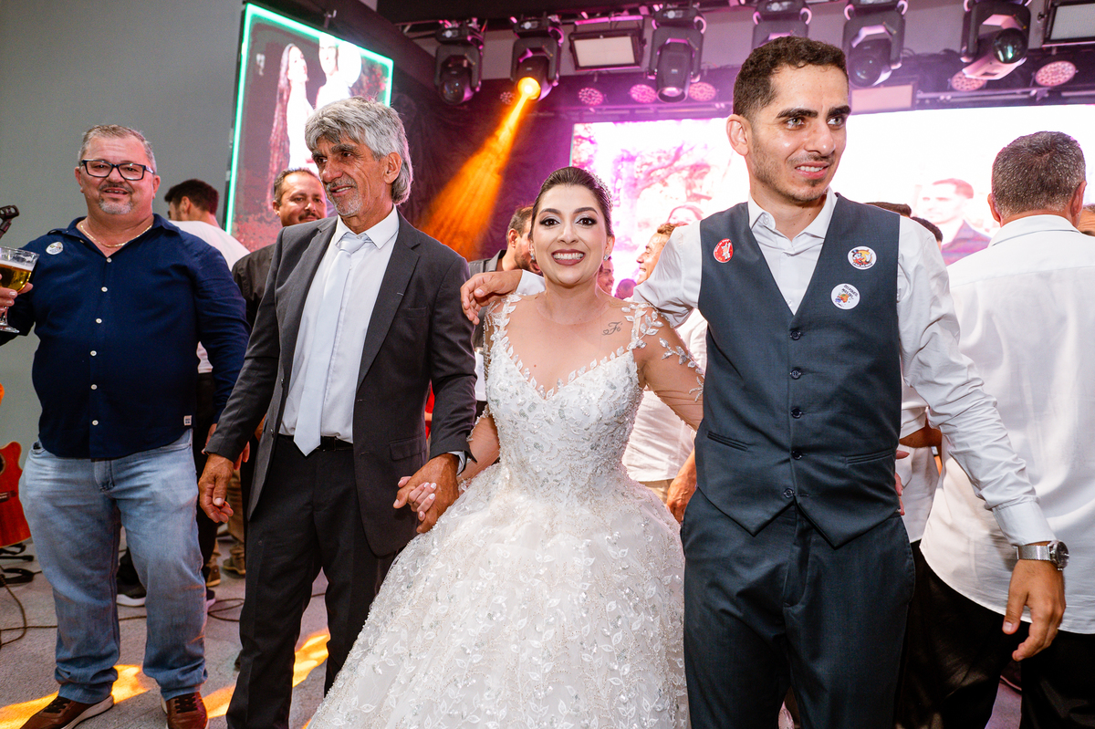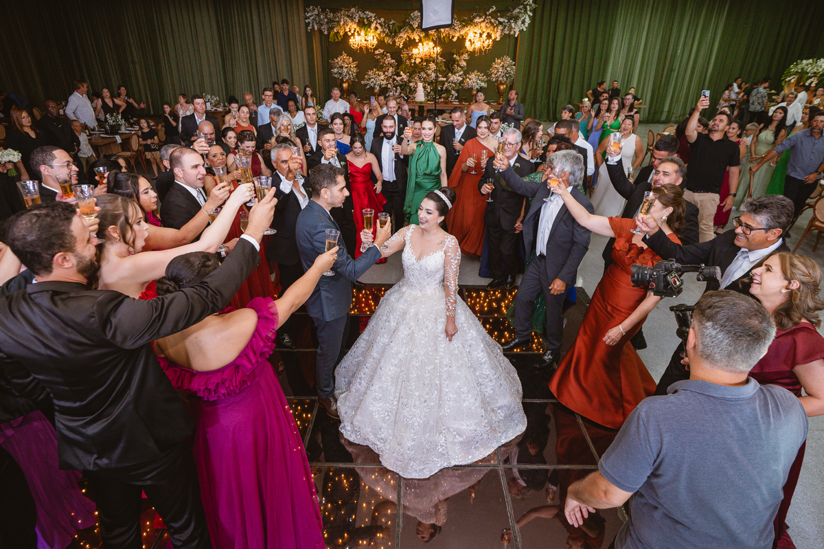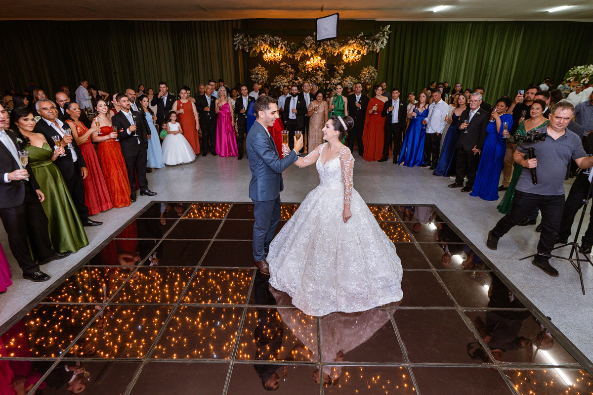 O casal foi anunciado para entrarem na pista de dança onde os padrinhos já os aguardava para o brinde. Eles entraram com muita festa e alegria e passaram brindando de mão em mão, eles se posicionaram ao centro da pista e junto com todos eles comemoraram muito e fizemos as fotos de todos. Fizemos também as fotos dos noivos na mesa do bolo junto com todos os convidados que desejaram fazê-lo. Posteriormente, Murilo foi convidado pelos padrinhos para passarem a gravata. E fizeram uma farra por todo salão. Amanda preferiu cumprimentar seus convidados e aproveitar para curtir o som da dupla que encantou todo mundo. Depois, eles dançaram e curtiram juntos na pista de dança, onde fizemos também uma trend onde o noivo é jogado pra cima. E ficou sensacional!