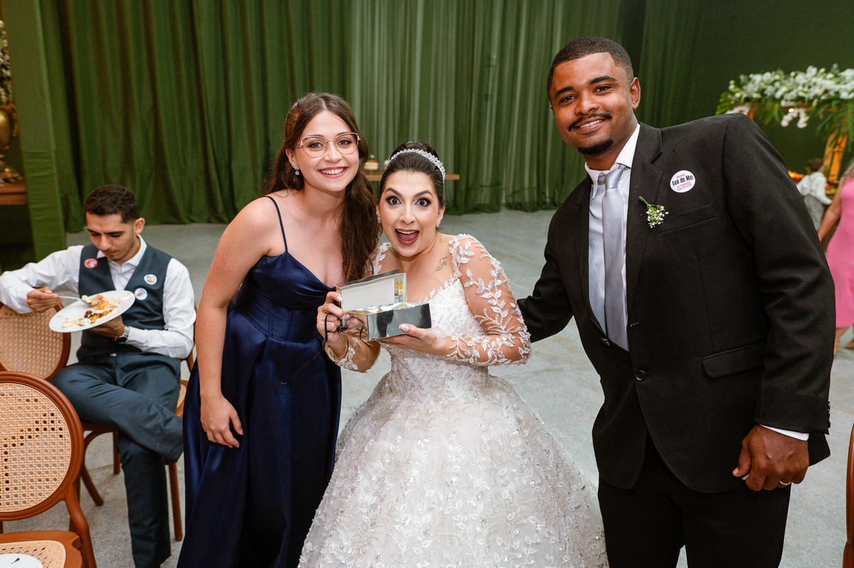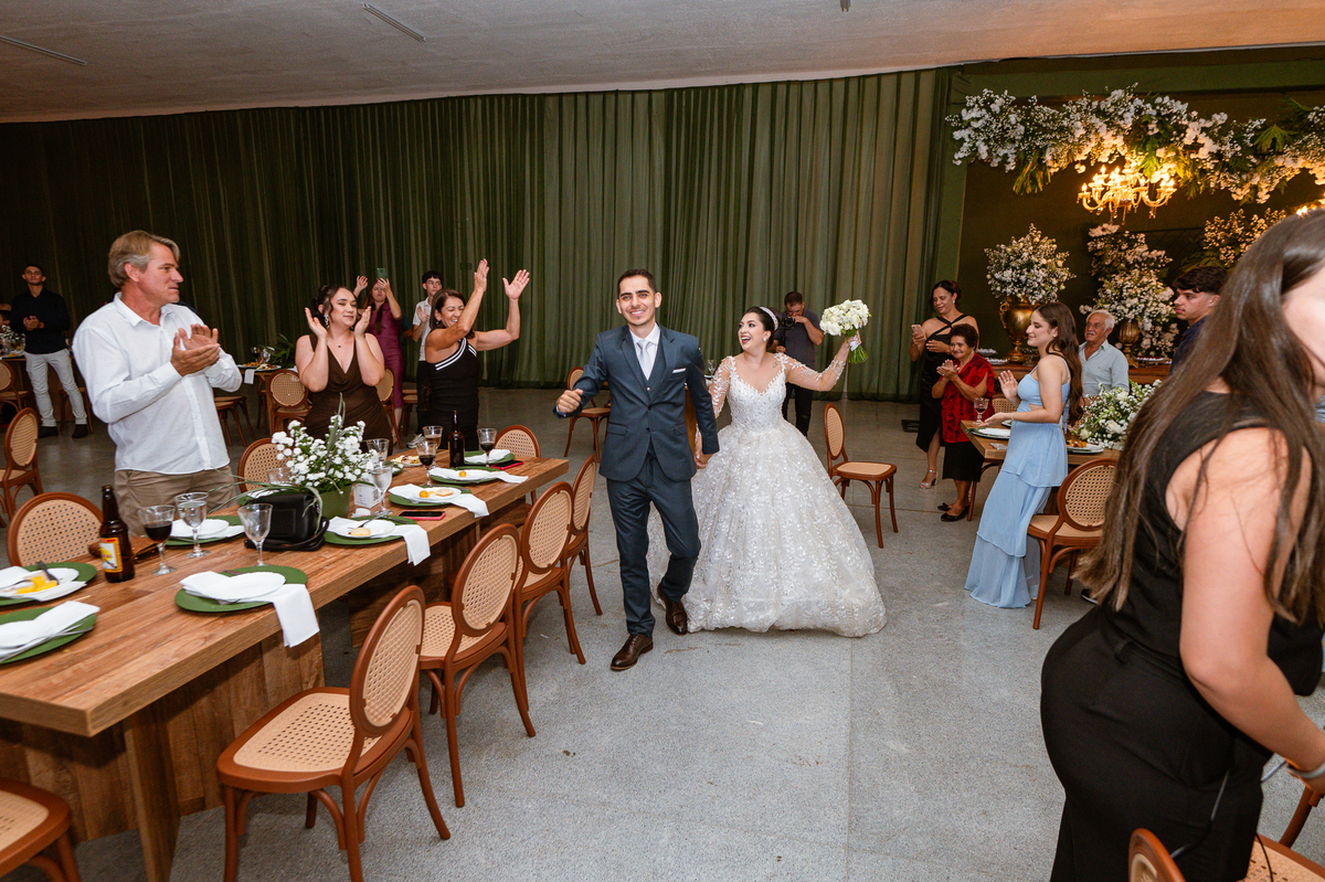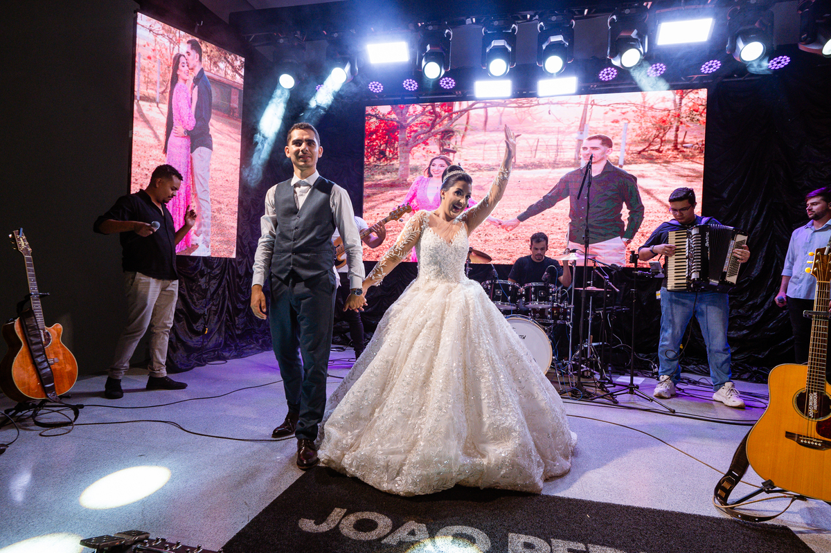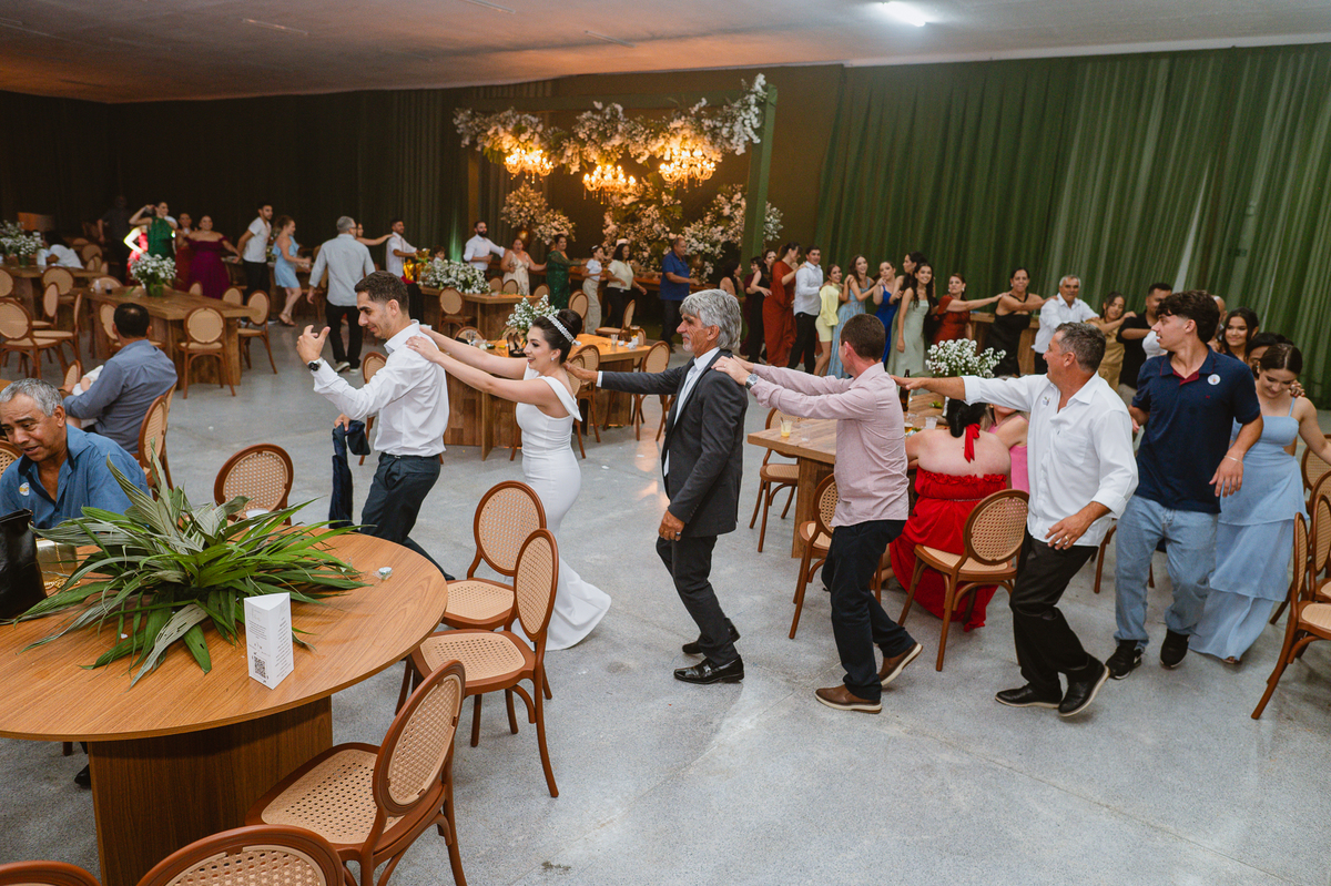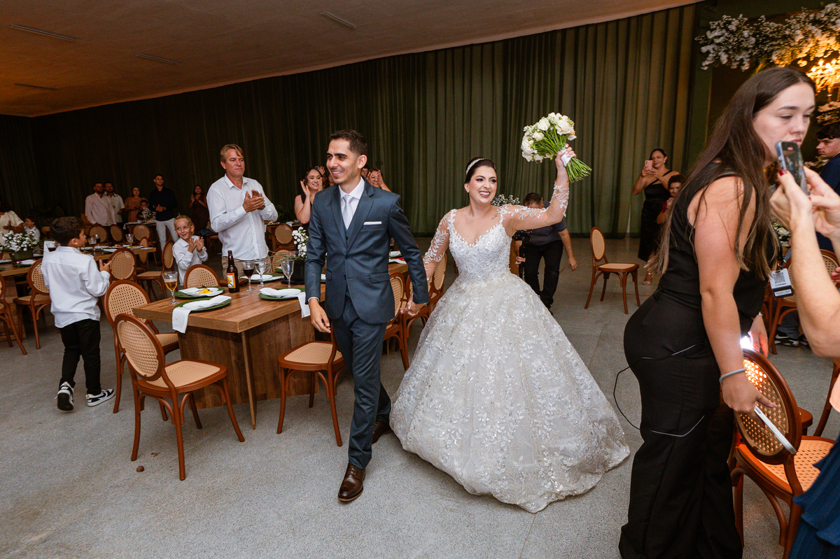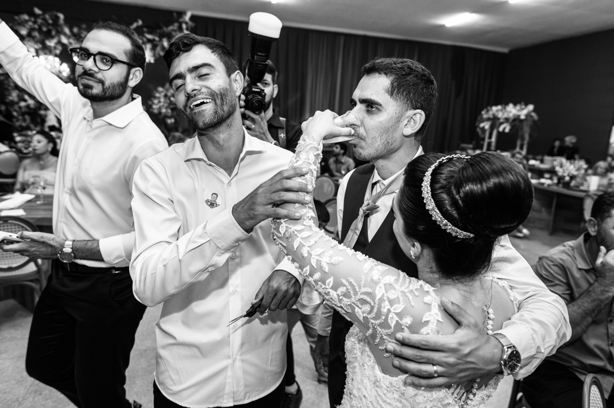O casal foi anunciado para entrarem na pista de dança onde os padrinhos já os aguardava para o brinde. Eles entraram com muita festa e alegria e passaram brindando de mão em mão, eles se posicionaram ao centro da pista e junto com todos eles comemoraram muito e fizemos as fotos de todos. Fizemos também as fotos dos noivos na mesa do bolo junto com todos os convidados que desejaram fazê-lo. Posteriormente, Murilo foi convidado pelos padrinhos para passarem a gravata. E fizeram uma farra por todo salão. Amanda preferiu cumprimentar seus convidados e aproveitar para curtir o som da dupla que encantou todo mundo. Depois, eles dançaram e curtiram juntos na pista de dança, onde fizemos também uma trend onde o noivo é jogado pra cima. E ficou sensacional!