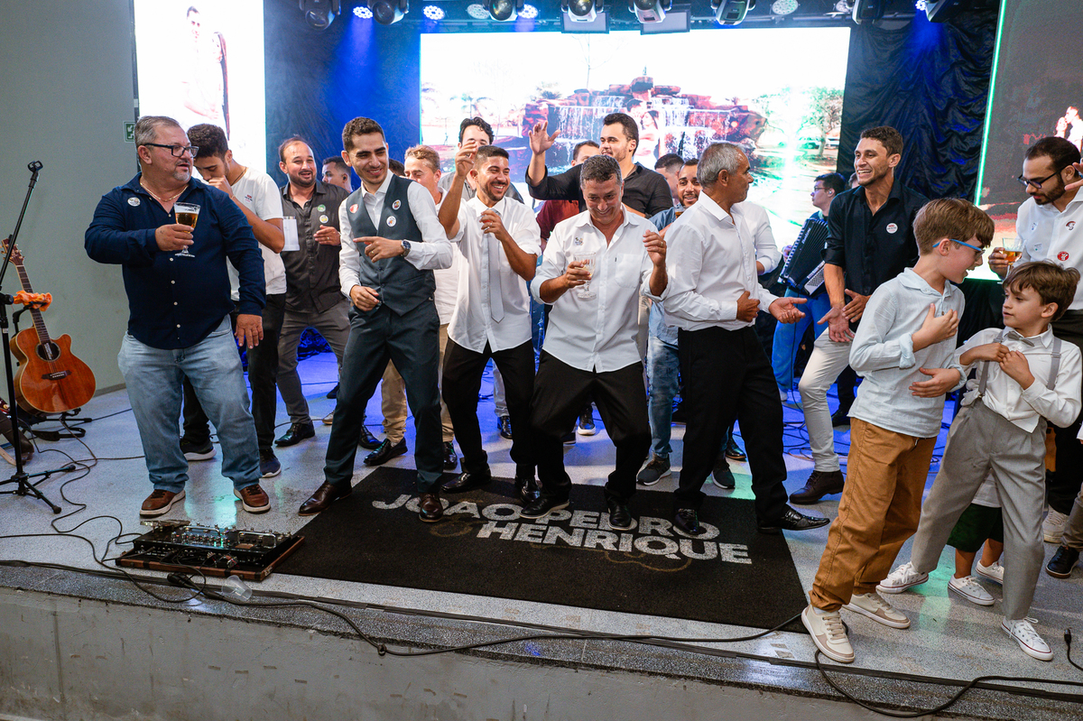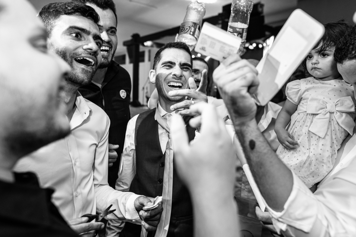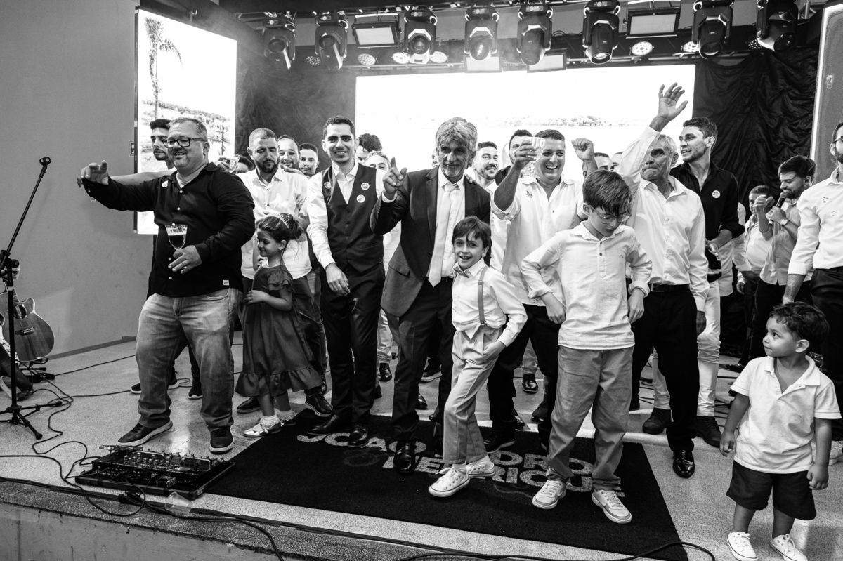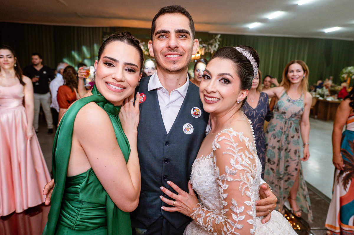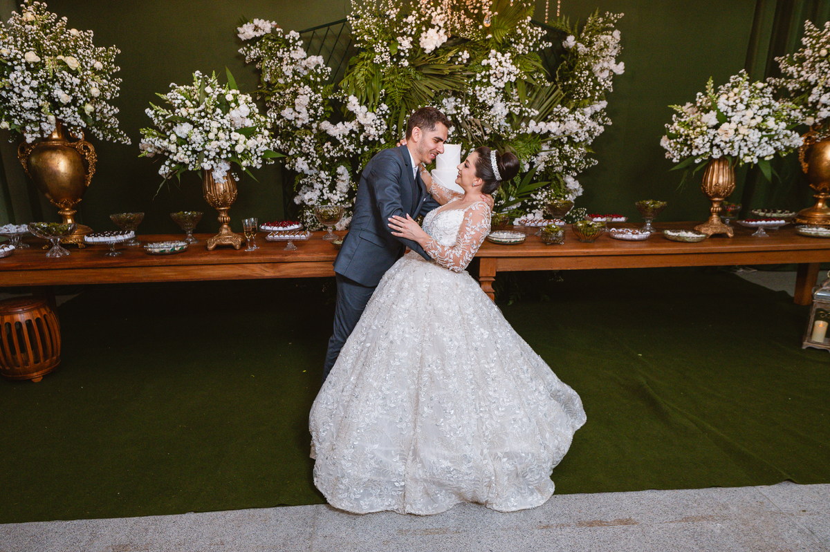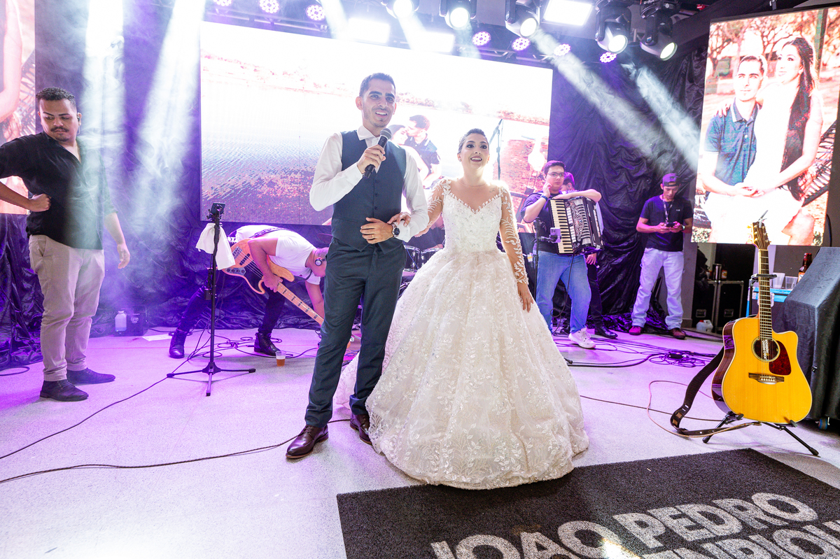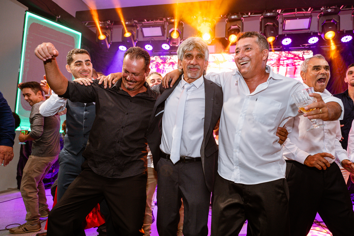 O casal foi anunciado para entrarem na pista de dança onde os padrinhos já os aguardava para o brinde. Eles entraram com muita festa e alegria e passaram brindando de mão em mão, eles se posicionaram ao centro da pista e junto com todos eles comemoraram muito e fizemos as fotos de todos. Fizemos também as fotos dos noivos na mesa do bolo junto com todos os convidados que desejaram fazê-lo. Posteriormente, Murilo foi convidado pelos padrinhos para passarem a gravata. E fizeram uma farra por todo salão. Amanda preferiu cumprimentar seus convidados e aproveitar para curtir o som da dupla que encantou todo mundo. Depois, eles dançaram e curtiram juntos na pista de dança, onde fizemos também uma trend onde o noivo é jogado pra cima. E ficou sensacional!