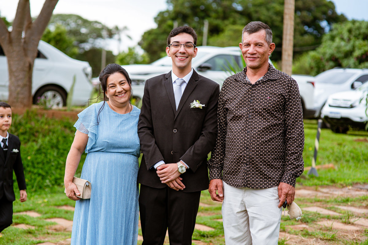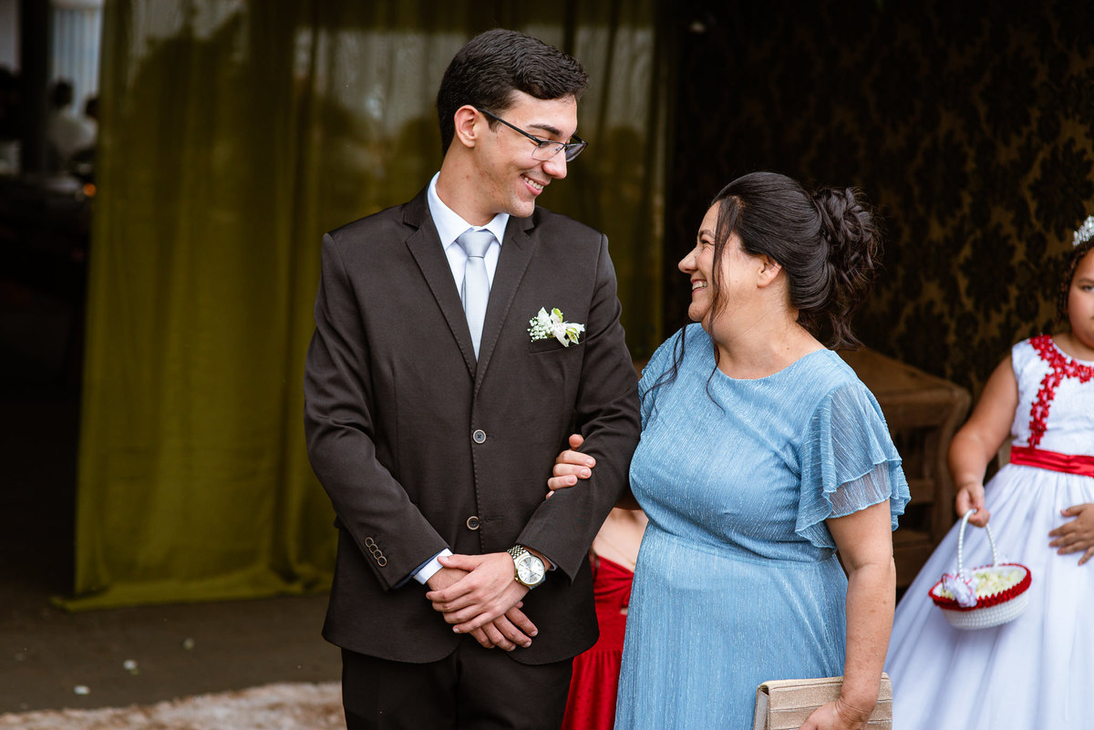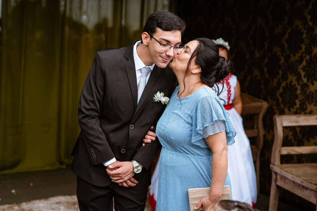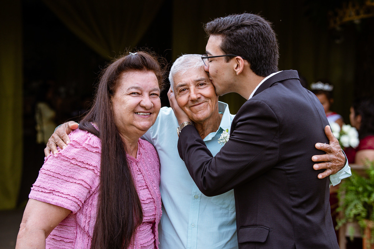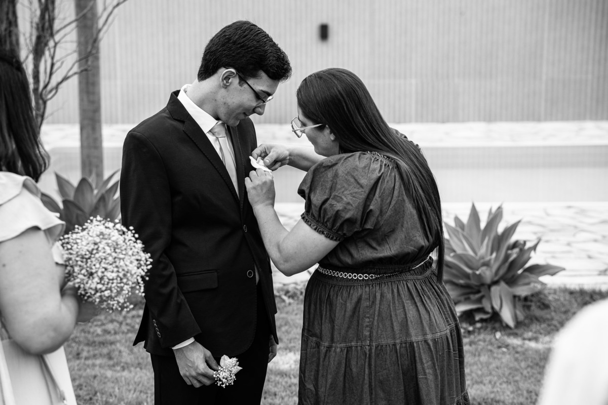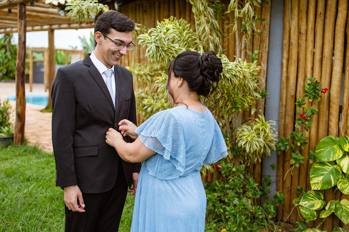 O tempo foi passando e a hora de colocar o vestido chegou. Enquanto Eduarda terminava de se organizar, no sítio onde o casamento estava marcado, Adriel também fazia sua parte. Com a ajuda de sua mãe, ele colocou seu traje de noivo. Com um beijo carinhoso, ele selou aquele momento de carinho entre mãe e filho. Ela fez questão de ajustar todos os detalhes do terno para que seu filho ficasse ainda mais lindo. Fizemos as fotos deles e seus parentes e logo Adriel começou a recepcionar os convidados que chegavam aos poucos. Tudo estava pronto para que o casamento começasse. Eduarda colocou seu vestido e ficou lindíssima. E esse casamento teve suas particularidades, pois a noiva não fez uso de maquiagem alguma, nem brincos nem adereços para seu dia. Como ela quis, assim fizemos. Ela nos contou algumas fotos que desejaria fazer e nós prontamente atendemos. Fotografamos com sua mãe e avó, como se demonstrássemos as três gerações da família. A foto ficou linda.