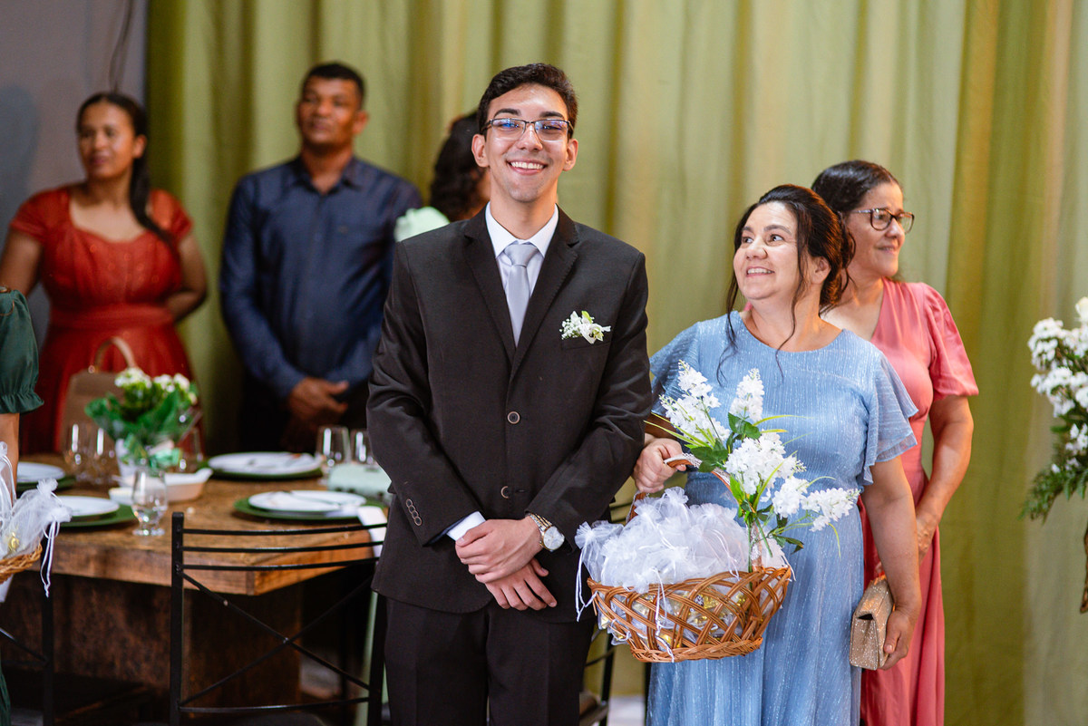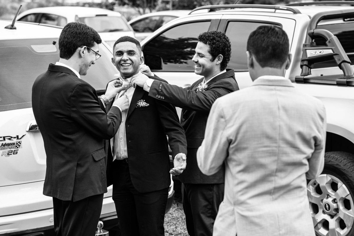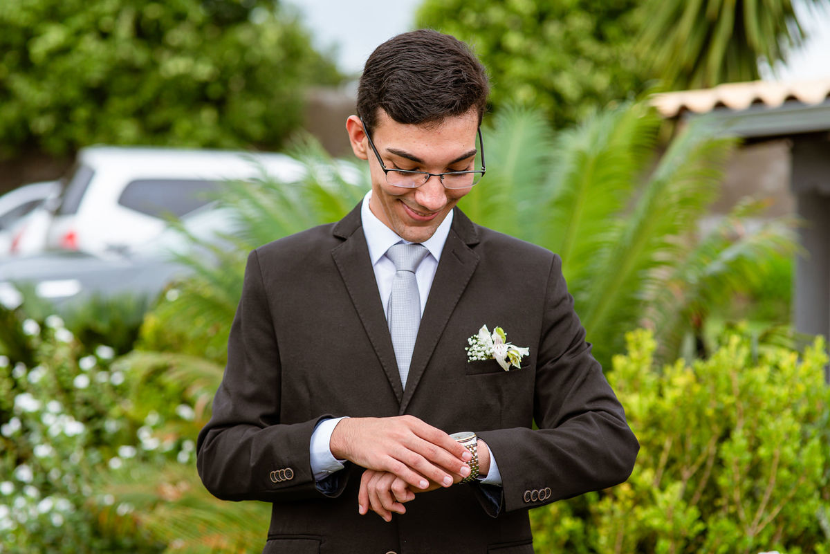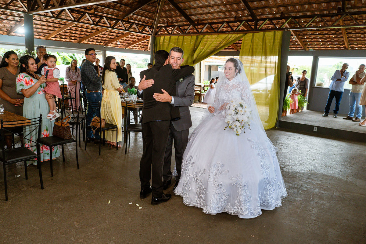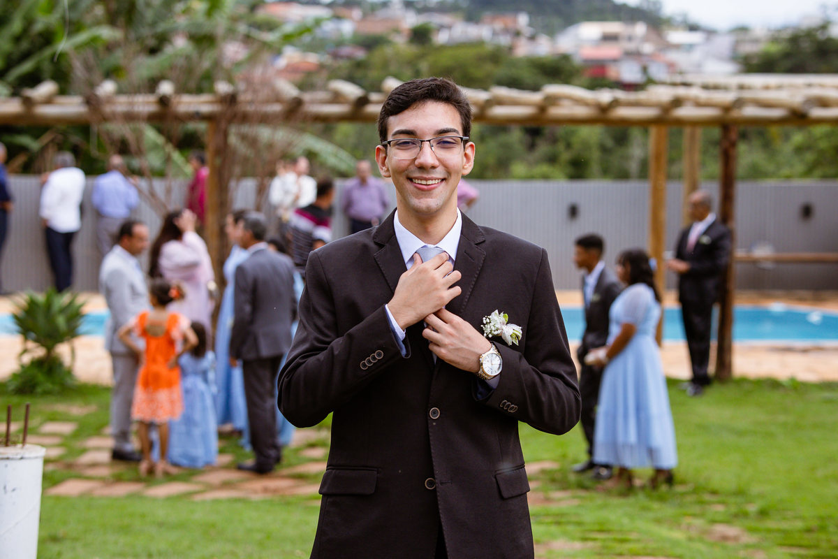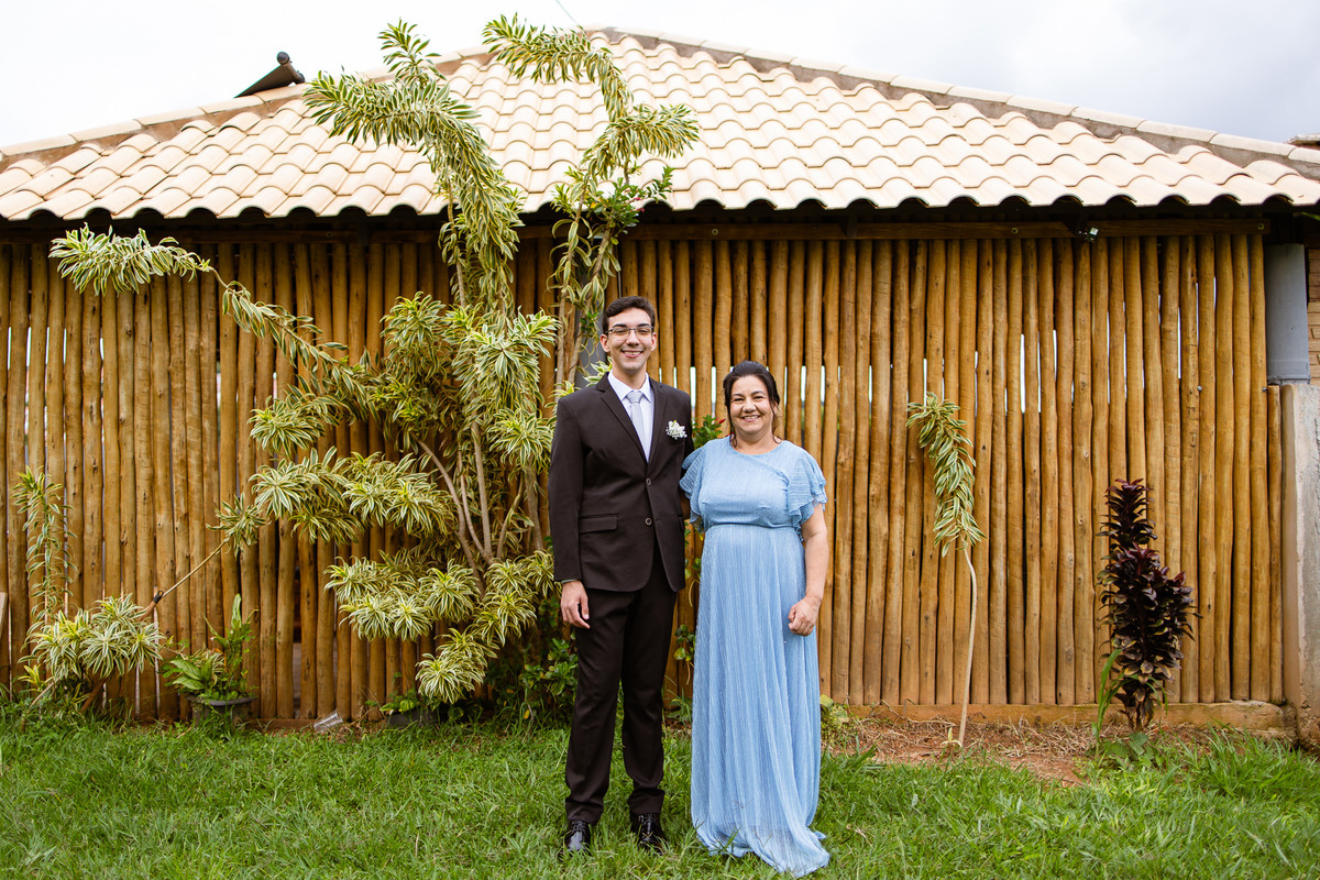 O tempo foi passando e a hora de colocar o vestido chegou. Enquanto Eduarda terminava de se organizar, no sítio onde o casamento estava marcado, Adriel também fazia sua parte. Com a ajuda de sua mãe, ele colocou seu traje de noivo. Com um beijo carinhoso, ele selou aquele momento de carinho entre mãe e filho. Ela fez questão de ajustar todos os detalhes do terno para que seu filho ficasse ainda mais lindo. Fizemos as fotos deles e seus parentes e logo Adriel começou a recepcionar os convidados que chegavam aos poucos. Tudo estava pronto para que o casamento começasse. Eduarda colocou seu vestido e ficou lindíssima. E esse casamento teve suas particularidades, pois a noiva não fez uso de maquiagem alguma, nem brincos nem adereços para seu dia. Como ela quis, assim fizemos. Ela nos contou algumas fotos que desejaria fazer e nós prontamente atendemos. Fotografamos com sua mãe e avó, como se demonstrássemos as três gerações da família. A foto ficou linda.