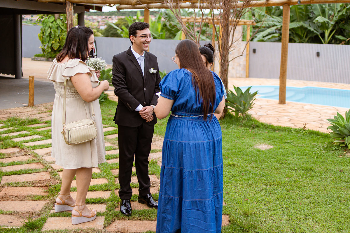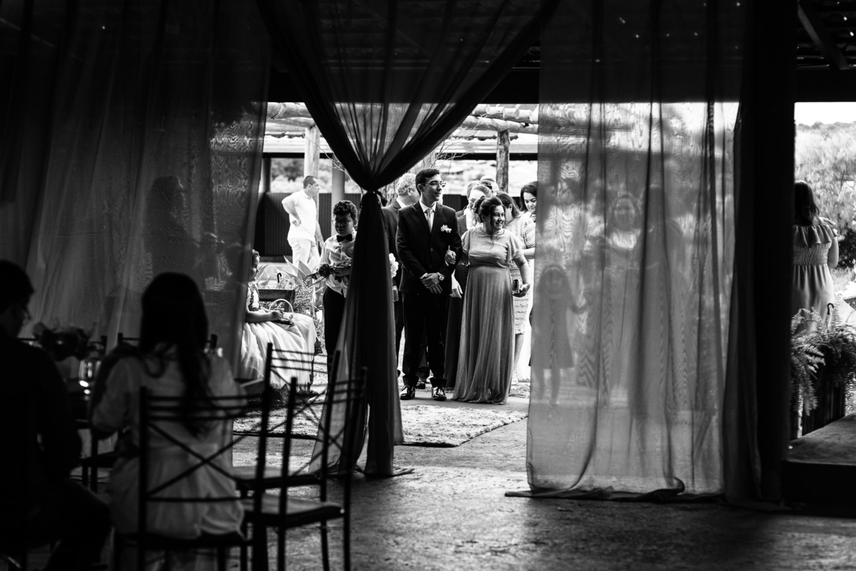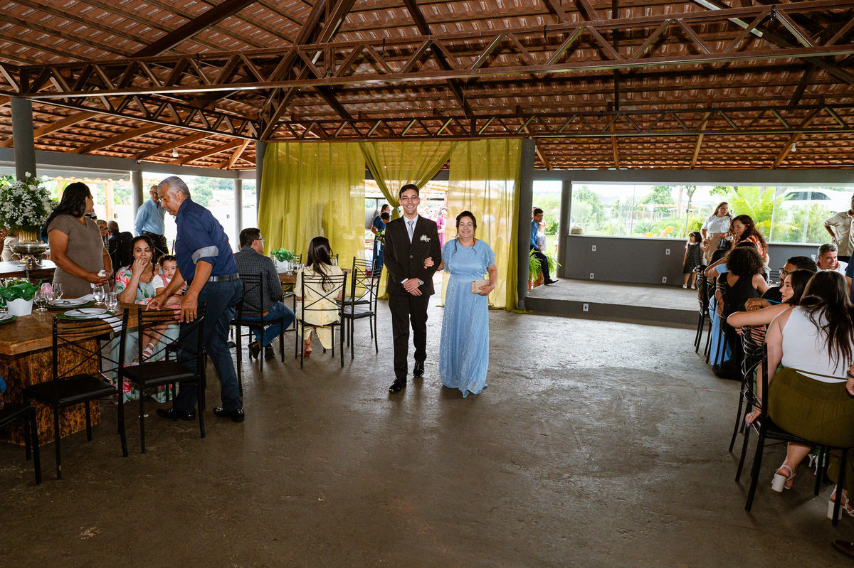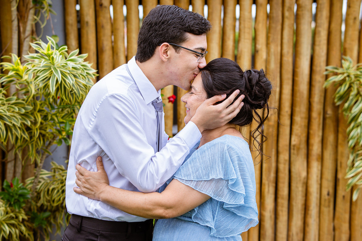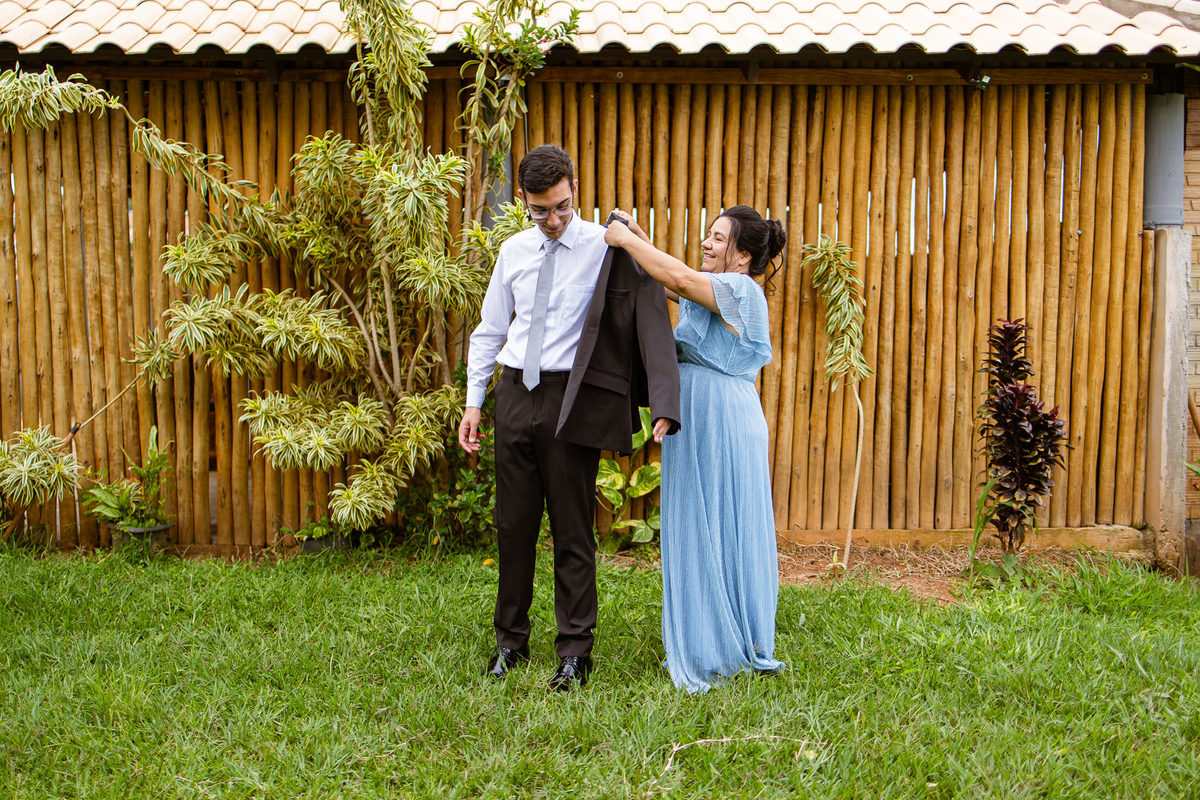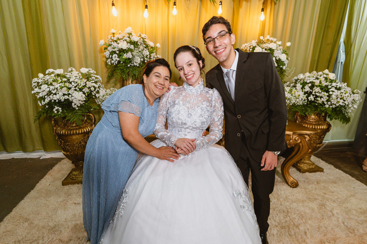 O tempo foi passando e a hora de colocar o vestido chegou. Enquanto Eduarda terminava de se organizar, no sítio onde o casamento estava marcado, Adriel também fazia sua parte. Com a ajuda de sua mãe, ele colocou seu traje de noivo. Com um beijo carinhoso, ele selou aquele momento de carinho entre mãe e filho. Ela fez questão de ajustar todos os detalhes do terno para que seu filho ficasse ainda mais lindo. Fizemos as fotos deles e seus parentes e logo Adriel começou a recepcionar os convidados que chegavam aos poucos. Tudo estava pronto para que o casamento começasse. Eduarda colocou seu vestido e ficou lindíssima. E esse casamento teve suas particularidades, pois a noiva não fez uso de maquiagem alguma, nem brincos nem adereços para seu dia. Como ela quis, assim fizemos. Ela nos contou algumas fotos que desejaria fazer e nós prontamente atendemos. Fotografamos com sua mãe e avó, como se demonstrássemos as três gerações da família. A foto ficou linda.
