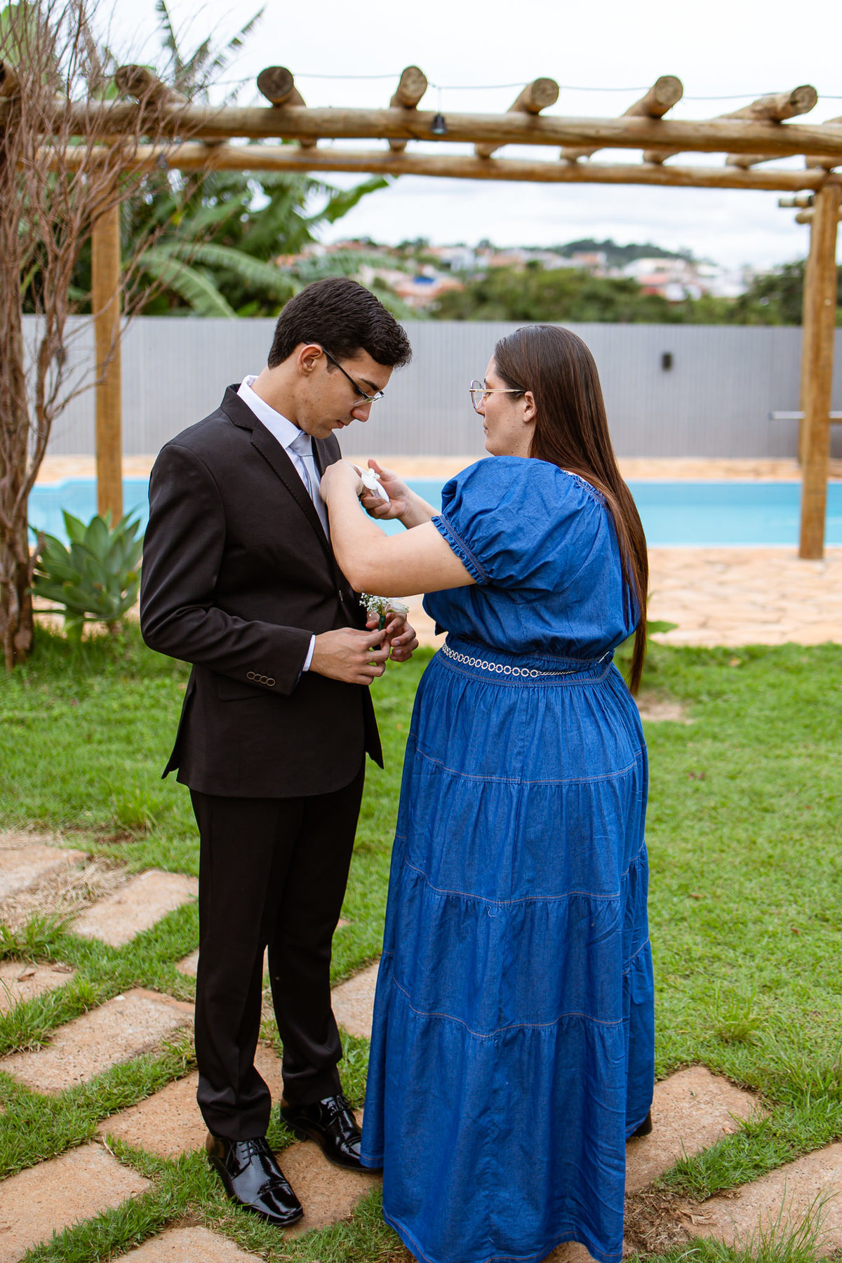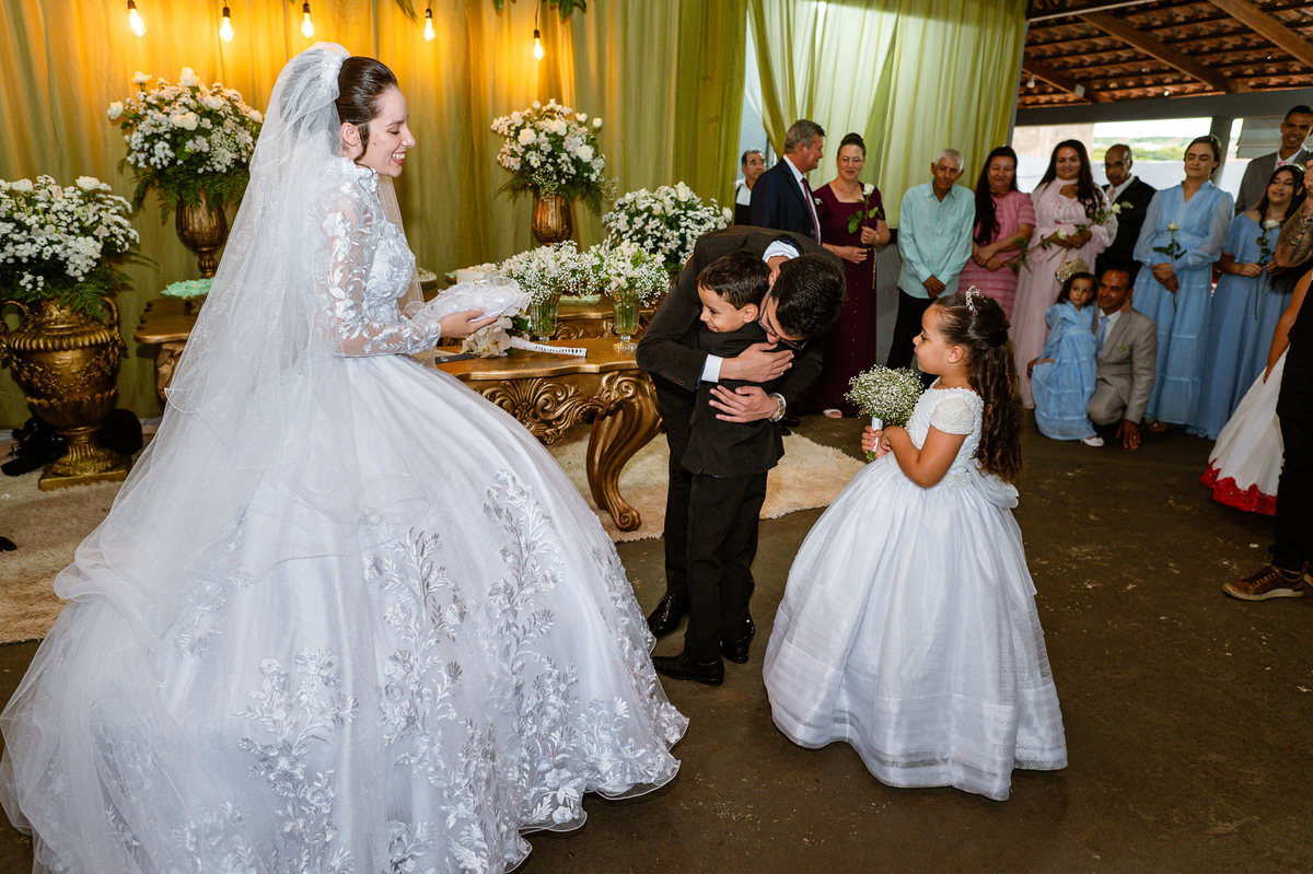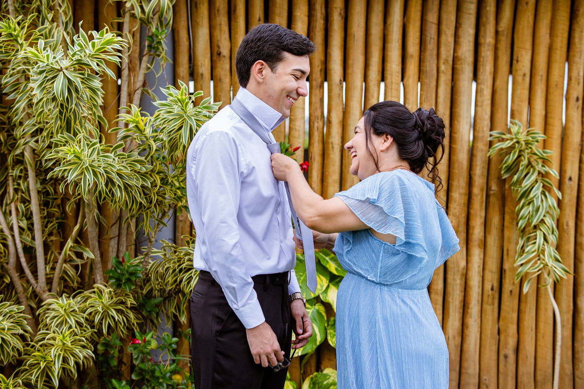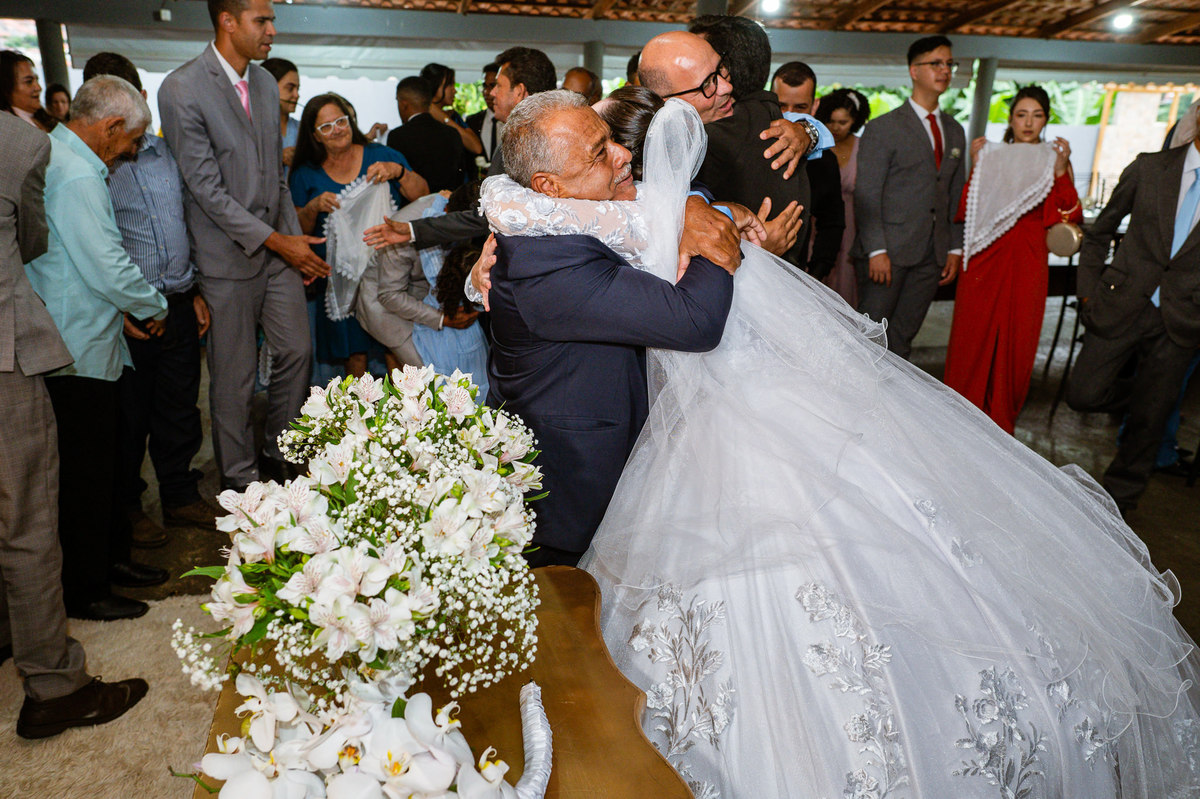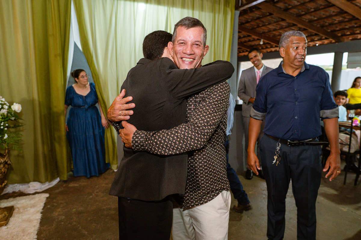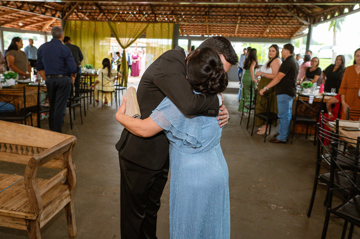 O tempo foi passando e a hora de colocar o vestido chegou. Enquanto Eduarda terminava de se organizar, no sítio onde o casamento estava marcado, Adriel também fazia sua parte. Com a ajuda de sua mãe, ele colocou seu traje de noivo. Com um beijo carinhoso, ele selou aquele momento de carinho entre mãe e filho. Ela fez questão de ajustar todos os detalhes do terno para que seu filho ficasse ainda mais lindo. Fizemos as fotos deles e seus parentes e logo Adriel começou a recepcionar os convidados que chegavam aos poucos. Tudo estava pronto para que o casamento começasse. Eduarda colocou seu vestido e ficou lindíssima. E esse casamento teve suas particularidades, pois a noiva não fez uso de maquiagem alguma, nem brincos nem adereços para seu dia. Como ela quis, assim fizemos. Ela nos contou algumas fotos que desejaria fazer e nós prontamente atendemos. Fotografamos com sua mãe e avó, como se demonstrássemos as três gerações da família. A foto ficou linda.