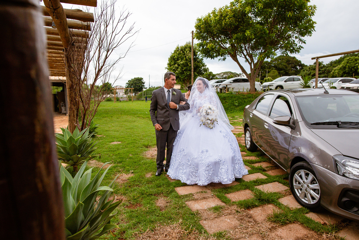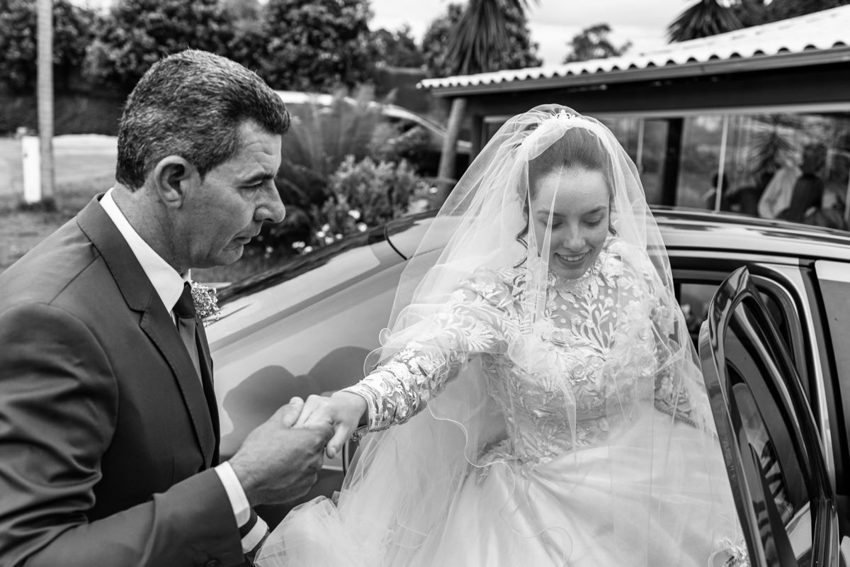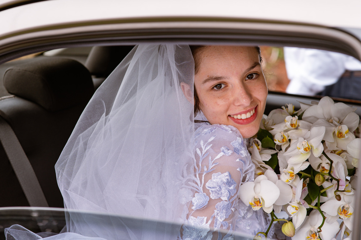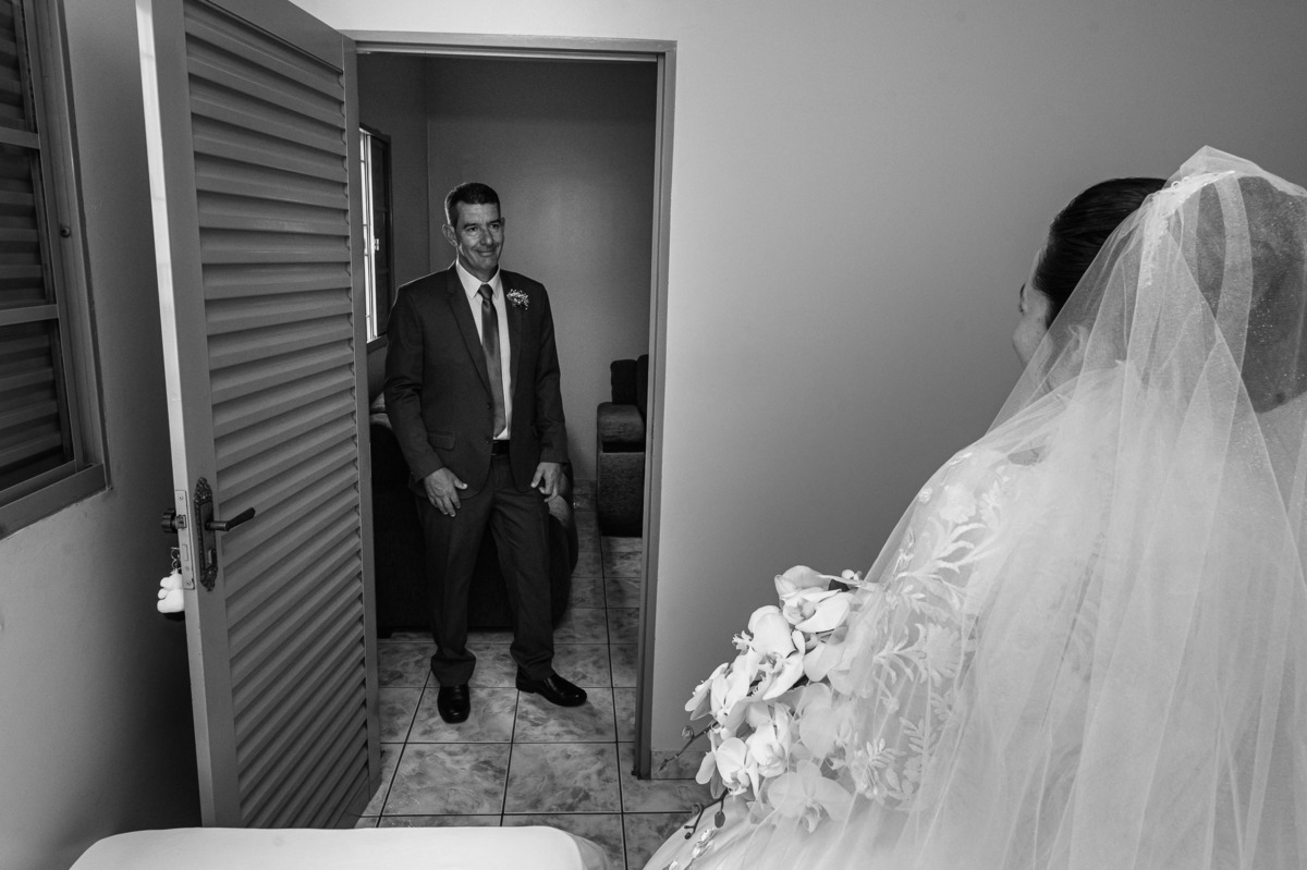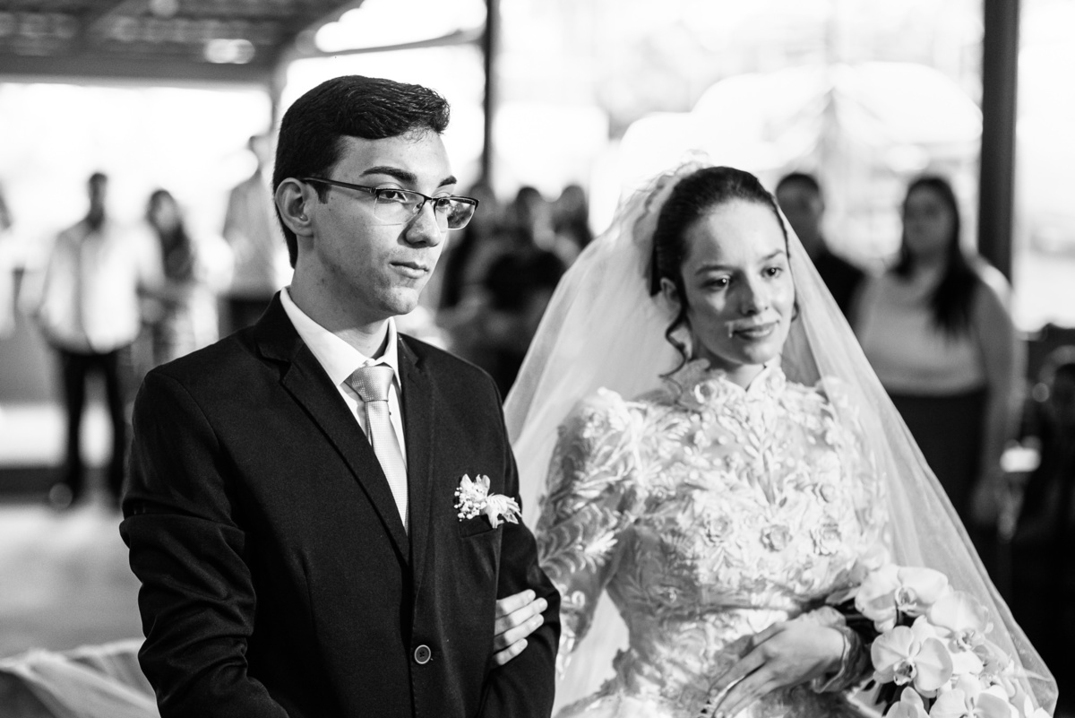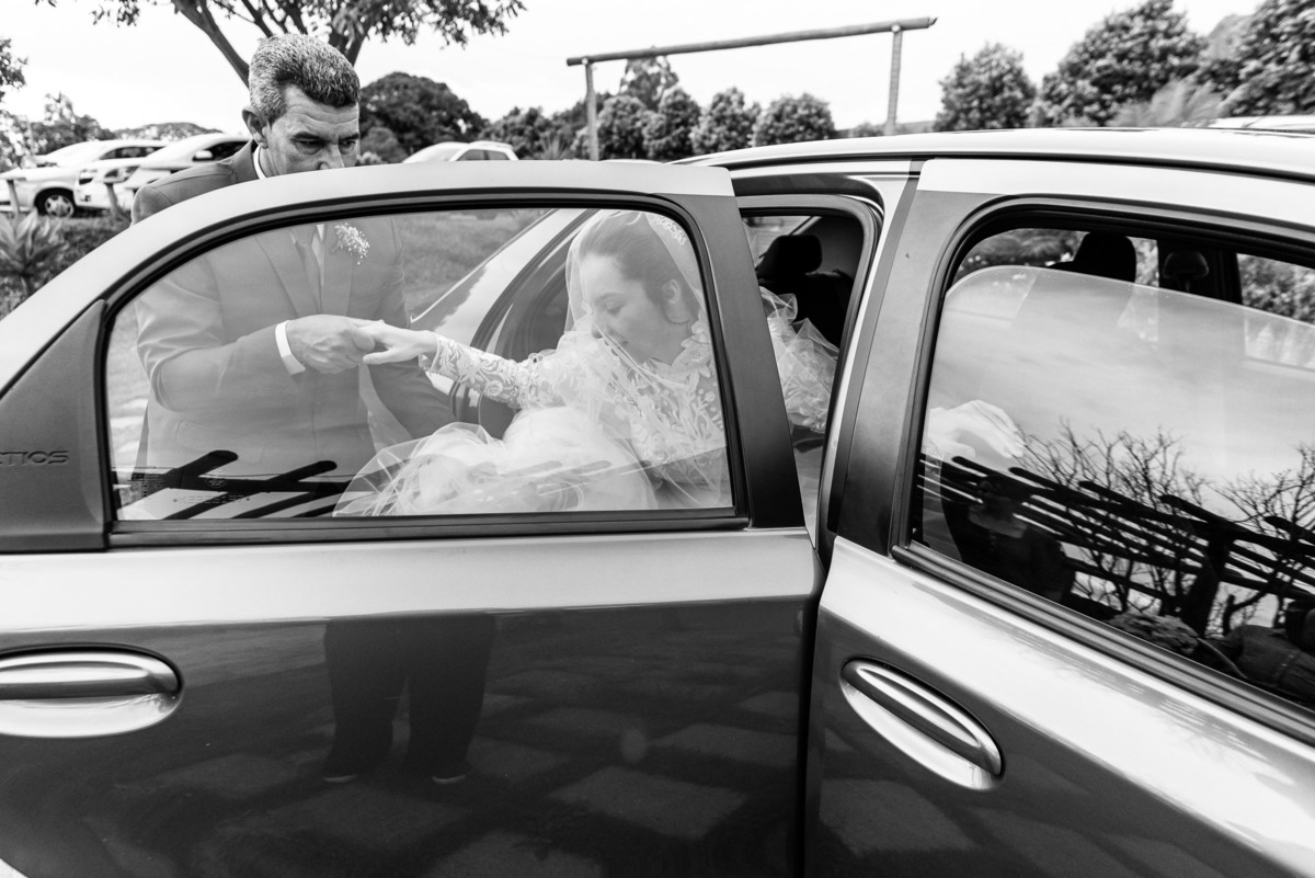Ela fez também questão de que seu pai a visse pela primeira vez vestida de noiva e registrássemos a reação dele. E foi incrível ver tudo isso acontecendo dentro do lar deles. Registramos tudo e ainda tivemos tempo de fazer alguns retratos da noiva do lado de fora da casa. Então, partimos para a cerimônia. Lá chegando, os convidados estavam terminando de se organizar. Eduarda exalava felicidade, transbordando alegria. Fizemos suas tradicionais fotografias no carro e então a cerimônia foi iniciada. Padrinhos e madrinhas entraram e também a florista. Pouco depois, era a vez do noivo. Eduarda desceu do carro com a ajuda de seu pai que já de antemão estava ali do lado dela o tempo todo. De braços dados, eles se encaminharam para a entrada do salão. As cortinas foram fechadas e por entre elas era possível ver a silhueta dos dois. Adriel estava posicionado de costas para ter a melhor reação ao ver sua noiva pela primeira vez.