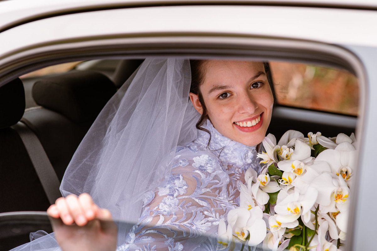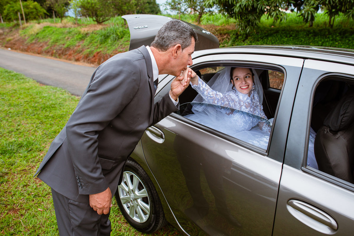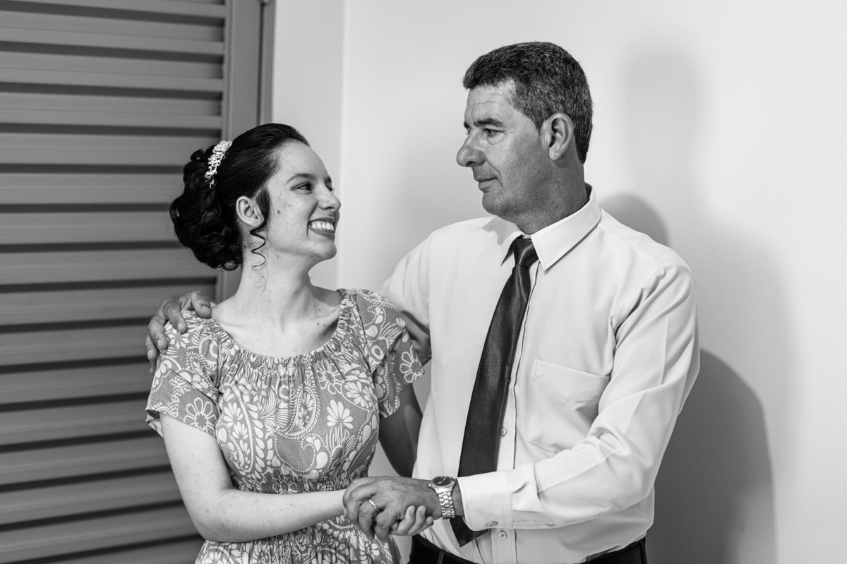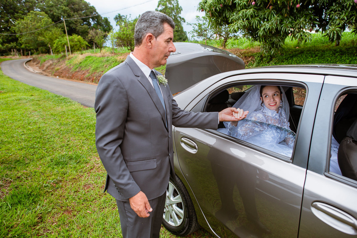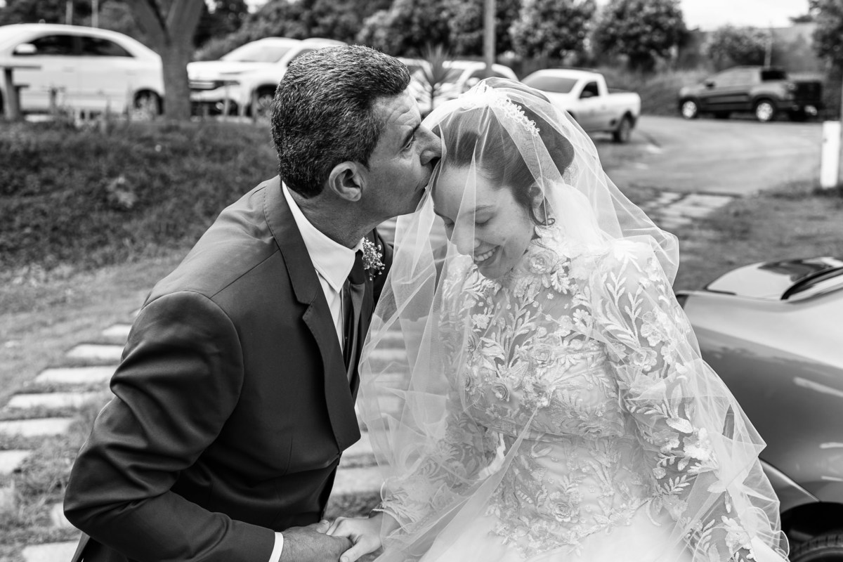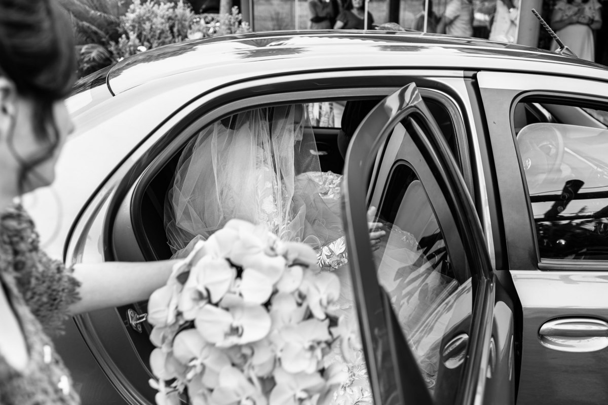 Ela fez também questão de que seu pai a visse pela primeira vez vestida de noiva e registrássemos a reação dele. E foi incrível ver tudo isso acontecendo dentro do lar deles. Registramos tudo e ainda tivemos tempo de fazer alguns retratos da noiva do lado de fora da casa. Então, partimos para a cerimônia. Lá chegando, os convidados estavam terminando de se organizar. Eduarda exalava felicidade, transbordando alegria. Fizemos suas tradicionais fotografias no carro e então a cerimônia foi iniciada. Padrinhos e madrinhas entraram e também a florista. Pouco depois, era a vez do noivo. Eduarda desceu do carro com a ajuda de seu pai que já de antemão estava ali do lado dela o tempo todo. De braços dados, eles se encaminharam para a entrada do salão. As cortinas foram fechadas e por entre elas era possível ver a silhueta dos dois. Adriel estava posicionado de costas para ter a melhor reação ao ver sua noiva pela primeira vez.