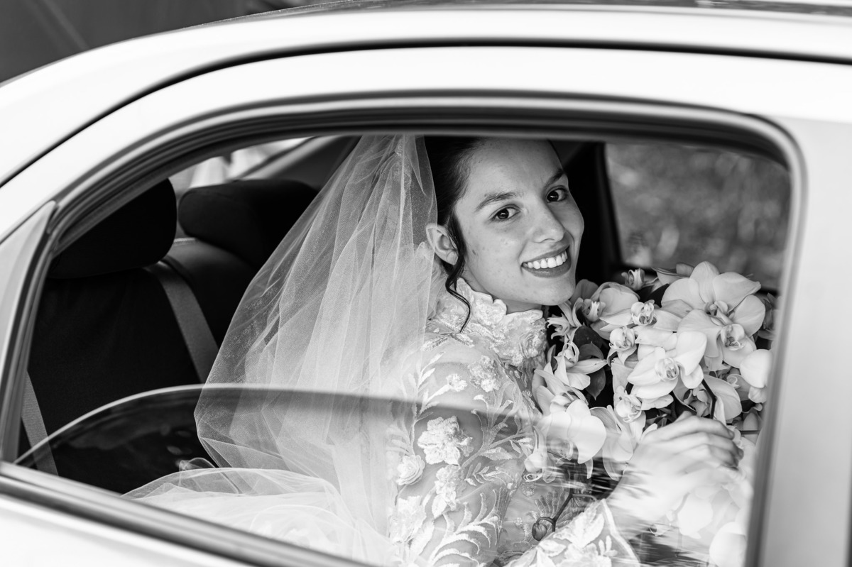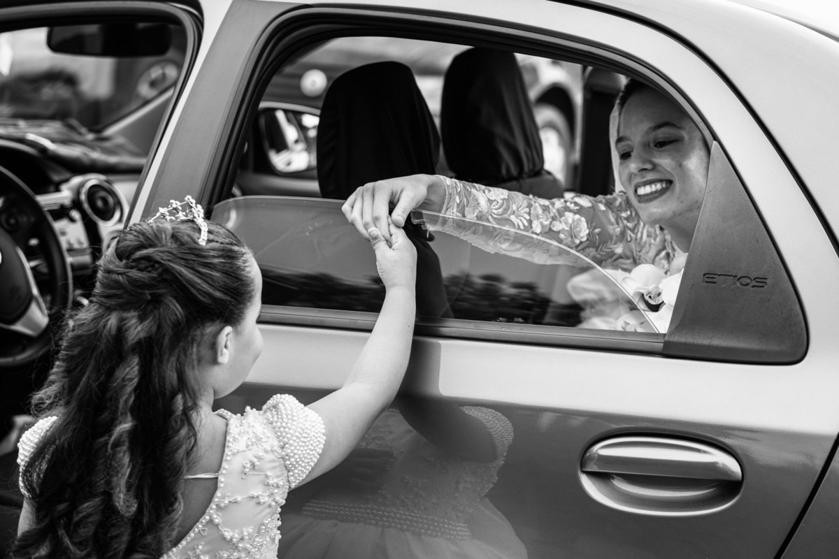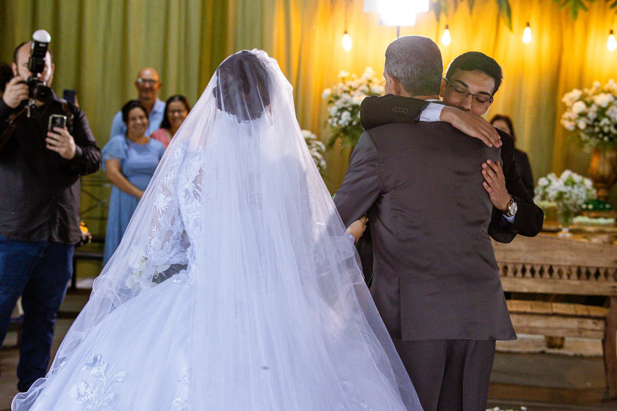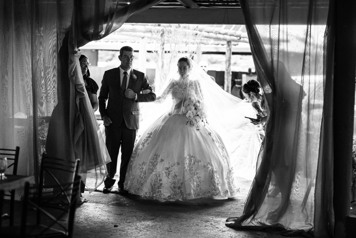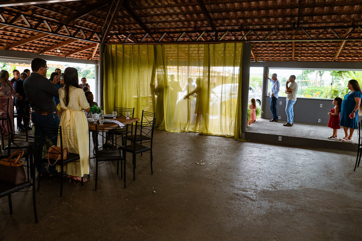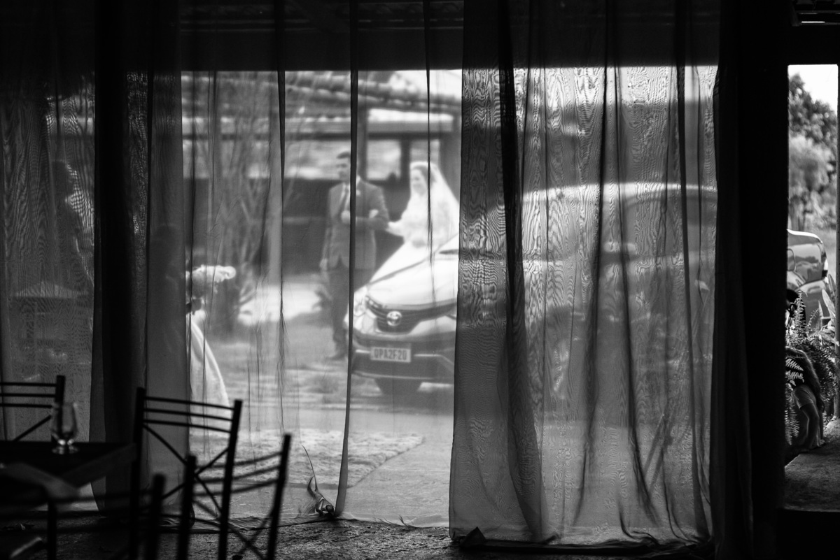 Ela fez também questão de que seu pai a visse pela primeira vez vestida de noiva e registrássemos a reação dele. E foi incrível ver tudo isso acontecendo dentro do lar deles. Registramos tudo e ainda tivemos tempo de fazer alguns retratos da noiva do lado de fora da casa. Então, partimos para a cerimônia. Lá chegando, os convidados estavam terminando de se organizar. Eduarda exalava felicidade, transbordando alegria. Fizemos suas tradicionais fotografias no carro e então a cerimônia foi iniciada. Padrinhos e madrinhas entraram e também a florista. Pouco depois, era a vez do noivo. Eduarda desceu do carro com a ajuda de seu pai que já de antemão estava ali do lado dela o tempo todo. De braços dados, eles se encaminharam para a entrada do salão. As cortinas foram fechadas e por entre elas era possível ver a silhueta dos dois. Adriel estava posicionado de costas para ter a melhor reação ao ver sua noiva pela primeira vez.