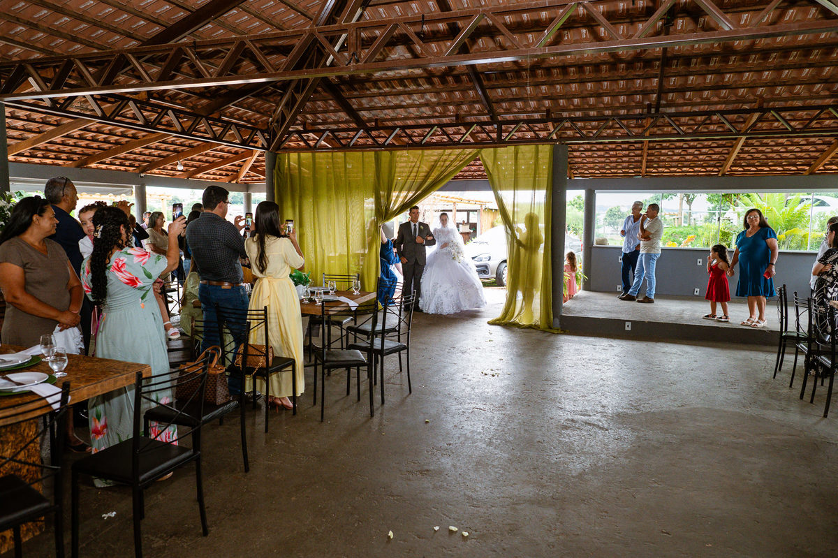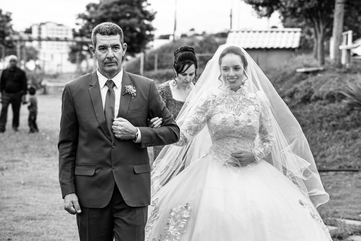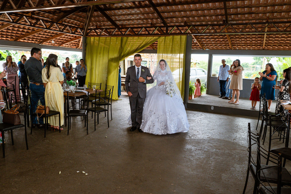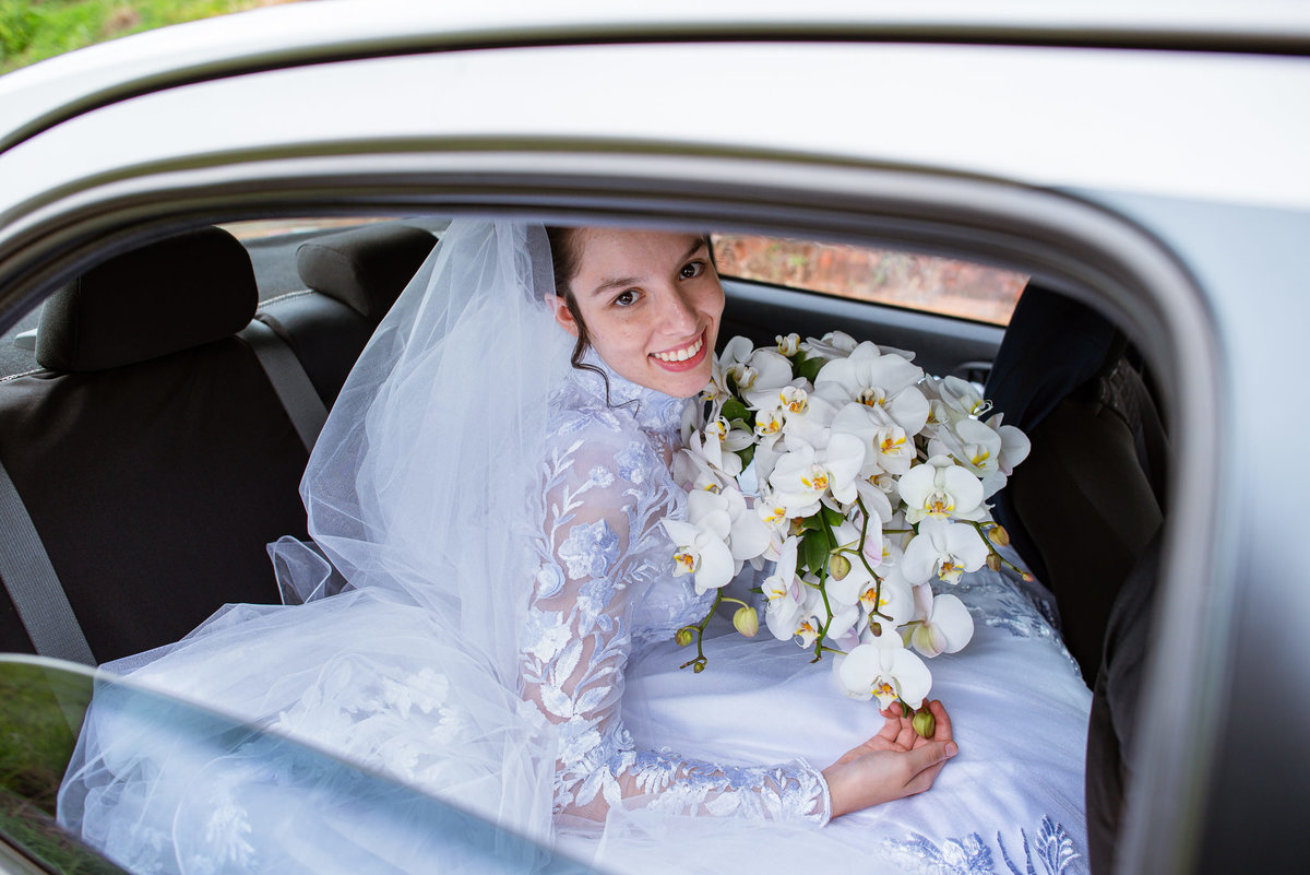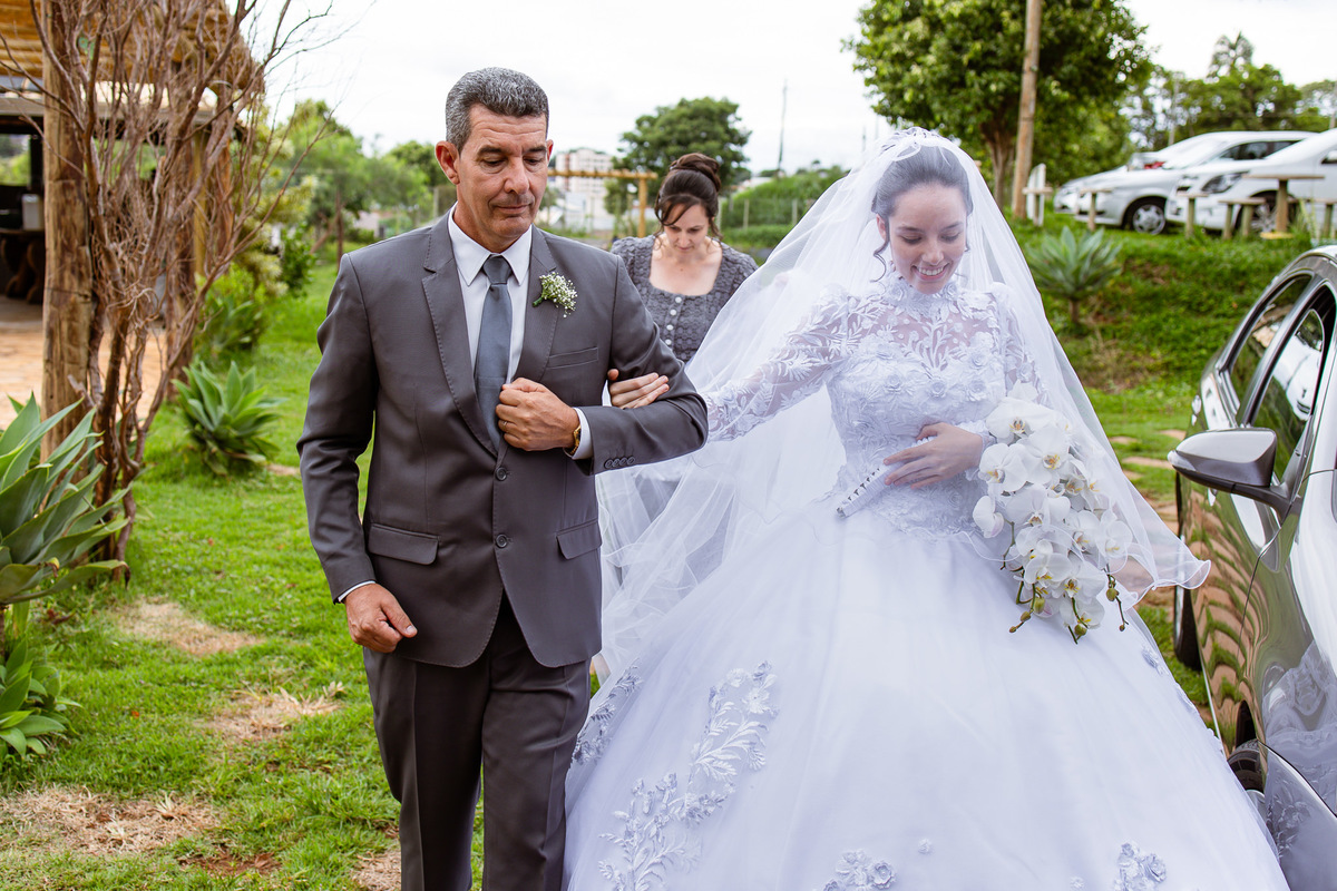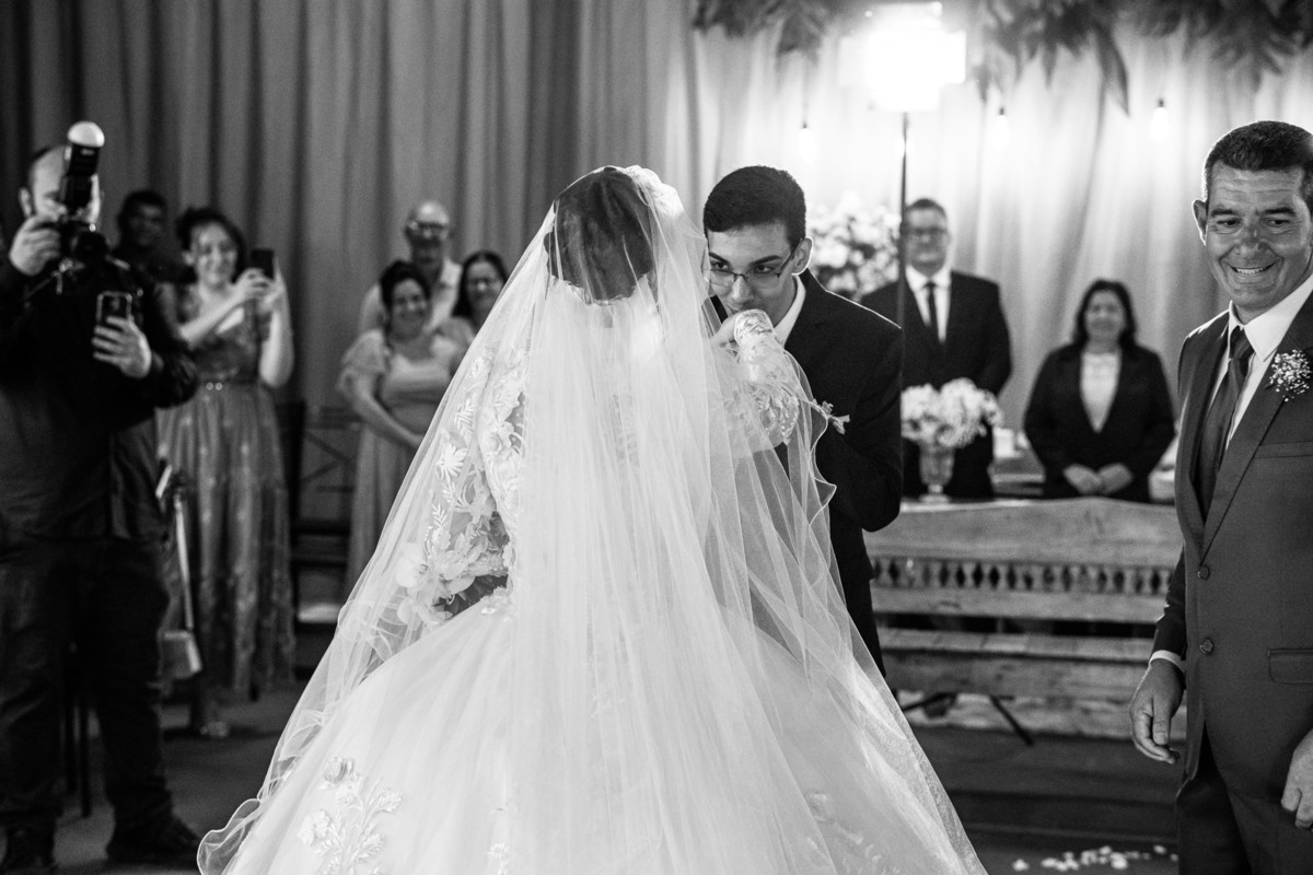 Ela fez também questão de que seu pai a visse pela primeira vez vestida de noiva e registrássemos a reação dele. E foi incrível ver tudo isso acontecendo dentro do lar deles. Registramos tudo e ainda tivemos tempo de fazer alguns retratos da noiva do lado de fora da casa. Então, partimos para a cerimônia. Lá chegando, os convidados estavam terminando de se organizar. Eduarda exalava felicidade, transbordando alegria. Fizemos suas tradicionais fotografias no carro e então a cerimônia foi iniciada. Padrinhos e madrinhas entraram e também a florista. Pouco depois, era a vez do noivo. Eduarda desceu do carro com a ajuda de seu pai que já de antemão estava ali do lado dela o tempo todo. De braços dados, eles se encaminharam para a entrada do salão. As cortinas foram fechadas e por entre elas era possível ver a silhueta dos dois. Adriel estava posicionado de costas para ter a melhor reação ao ver sua noiva pela primeira vez.