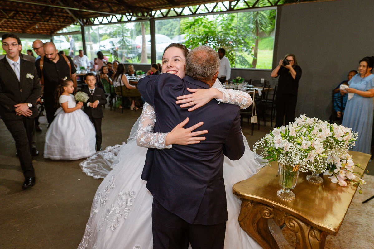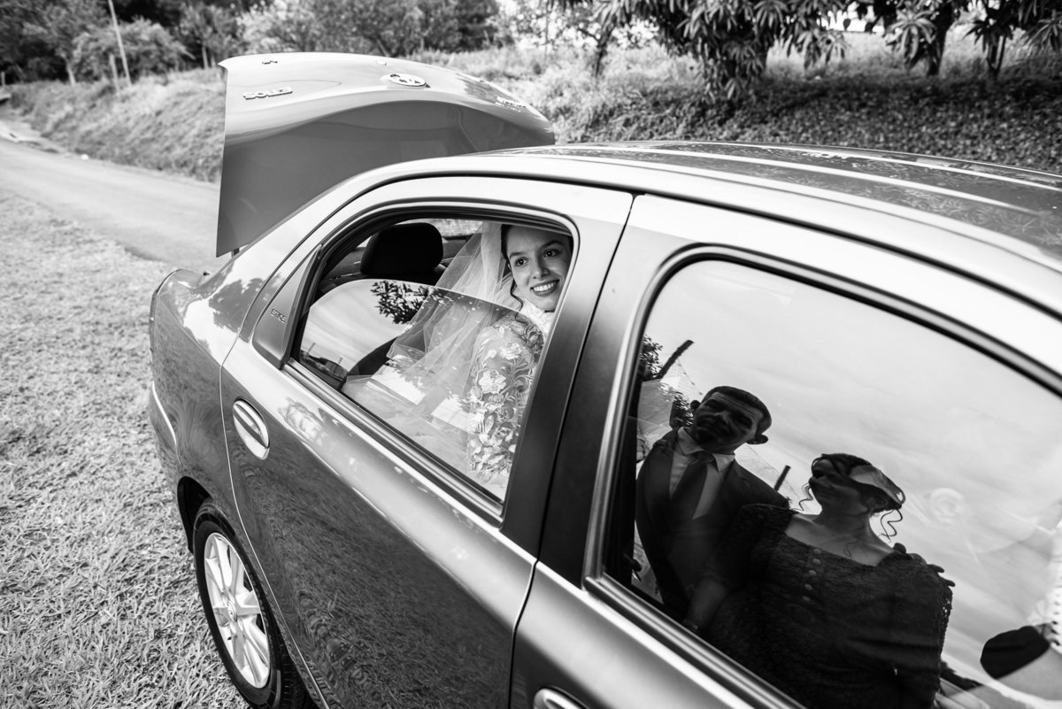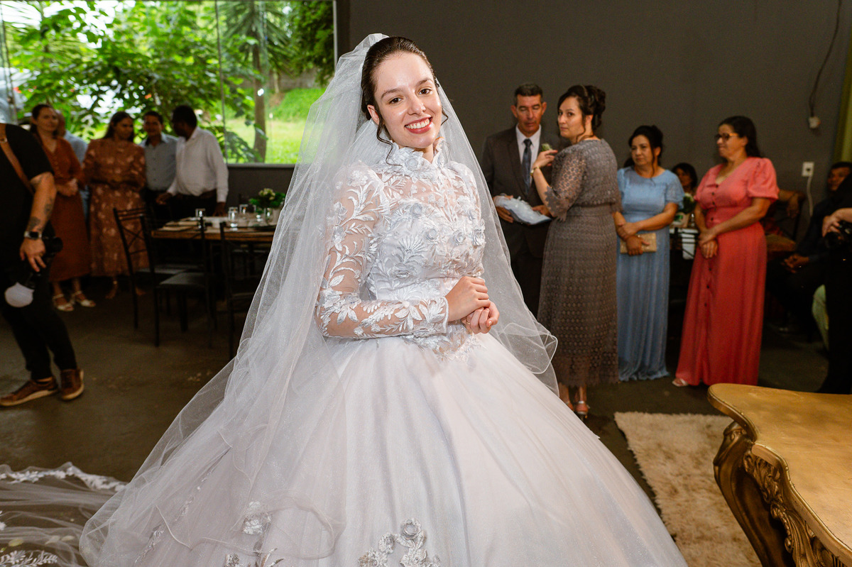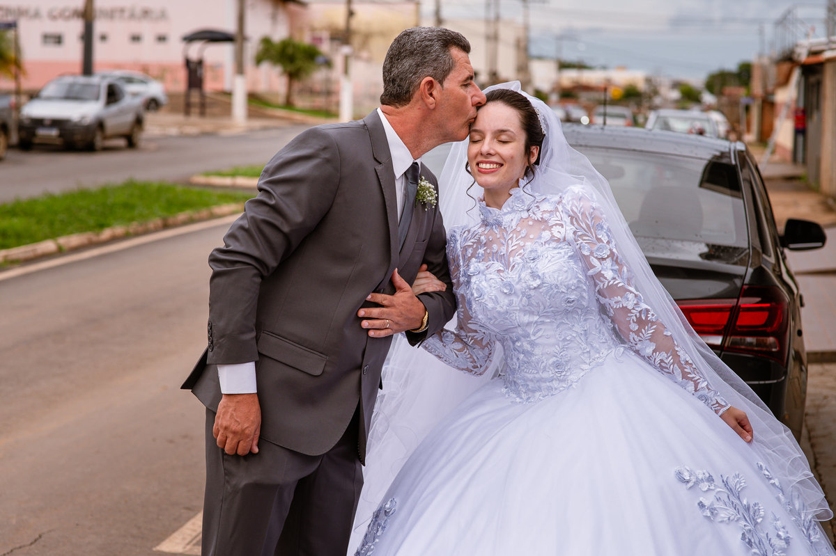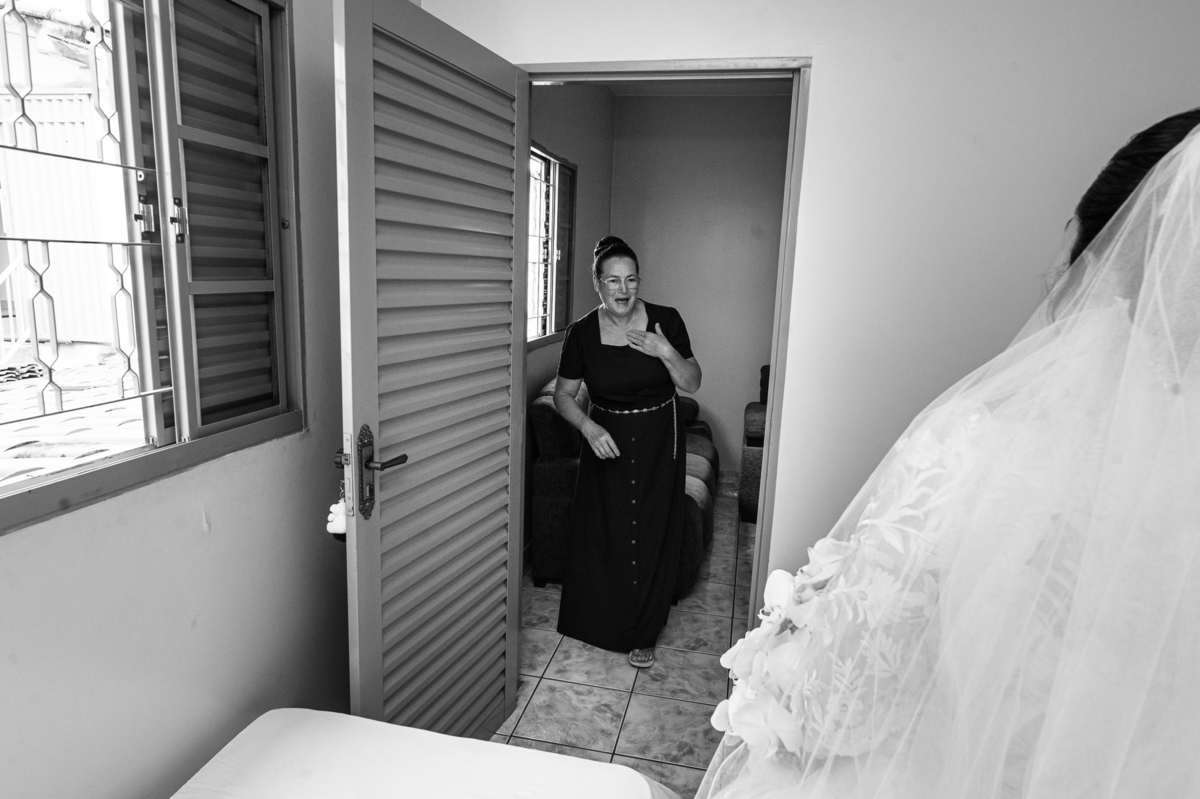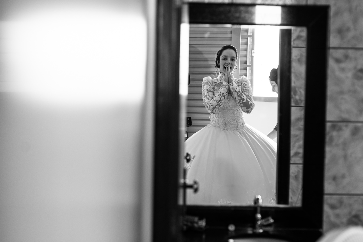 Ela fez também questão de que seu pai a visse pela primeira vez vestida de noiva e registrássemos a reação dele. E foi incrível ver tudo isso acontecendo dentro do lar deles. Registramos tudo e ainda tivemos tempo de fazer alguns retratos da noiva do lado de fora da casa. Então, partimos para a cerimônia. Lá chegando, os convidados estavam terminando de se organizar. Eduarda exalava felicidade, transbordando alegria. Fizemos suas tradicionais fotografias no carro e então a cerimônia foi iniciada. Padrinhos e madrinhas entraram e também a florista. Pouco depois, era a vez do noivo. Eduarda desceu do carro com a ajuda de seu pai que já de antemão estava ali do lado dela o tempo todo. De braços dados, eles se encaminharam para a entrada do salão. As cortinas foram fechadas e por entre elas era possível ver a silhueta dos dois. Adriel estava posicionado de costas para ter a melhor reação ao ver sua noiva pela primeira vez.
