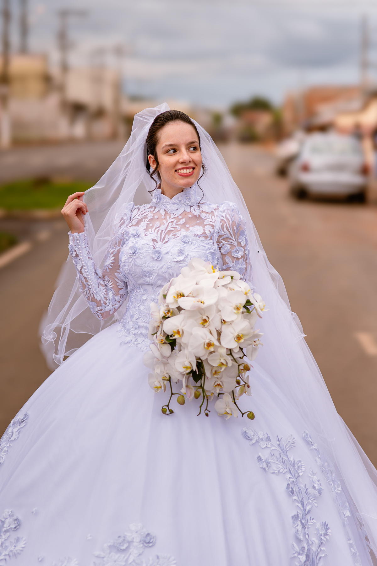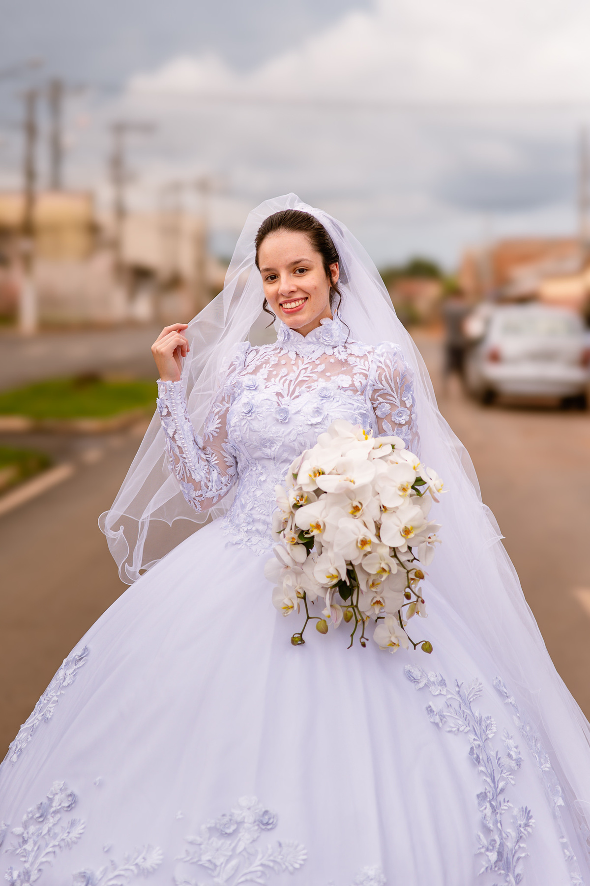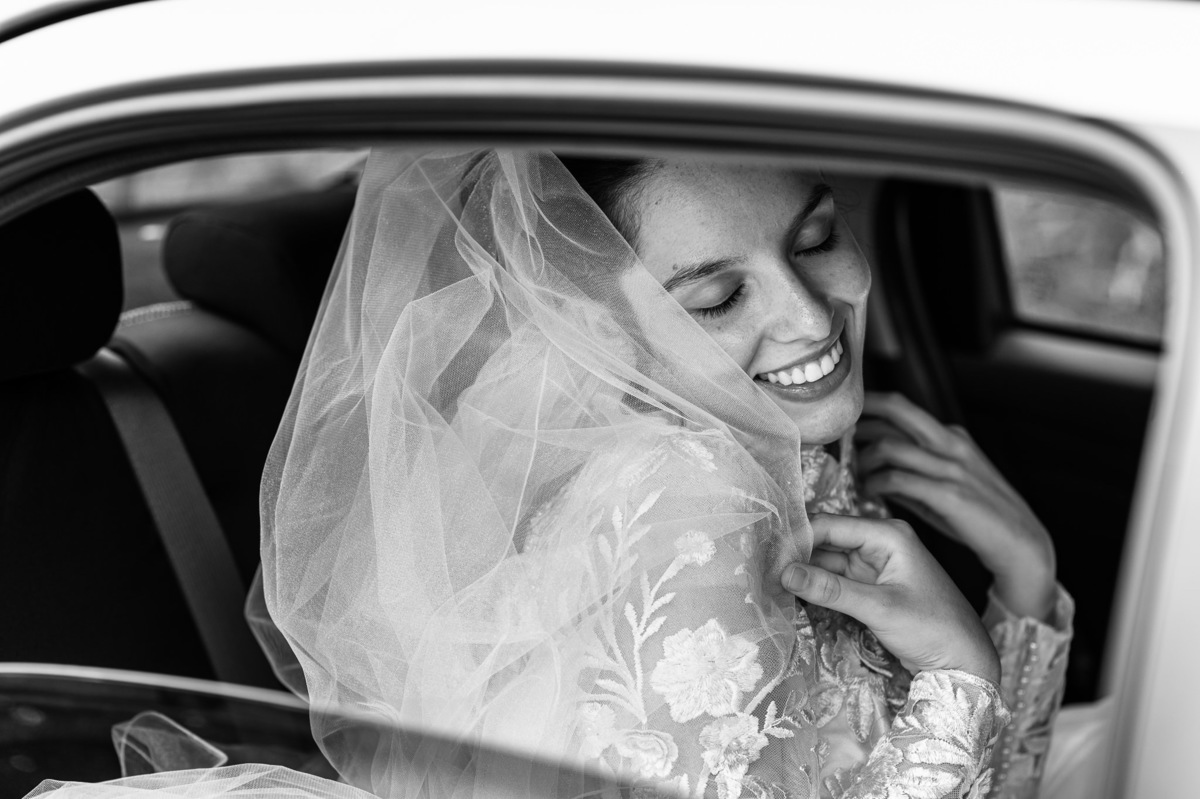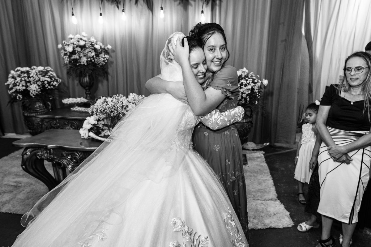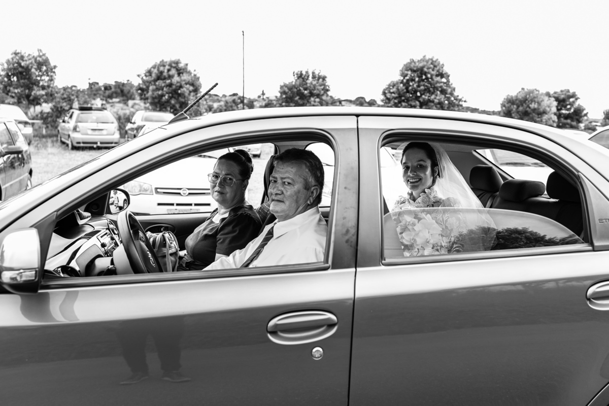 Ela fez também questão de que seu pai a visse pela primeira vez vestida de noiva e registrássemos a reação dele. E foi incrível ver tudo isso acontecendo dentro do lar deles. Registramos tudo e ainda tivemos tempo de fazer alguns retratos da noiva do lado de fora da casa. Então, partimos para a cerimônia. Lá chegando, os convidados estavam terminando de se organizar. Eduarda exalava felicidade, transbordando alegria. Fizemos suas tradicionais fotografias no carro e então a cerimônia foi iniciada. Padrinhos e madrinhas entraram e também a florista. Pouco depois, era a vez do noivo. Eduarda desceu do carro com a ajuda de seu pai que já de antemão estava ali do lado dela o tempo todo. De braços dados, eles se encaminharam para a entrada do salão. As cortinas foram fechadas e por entre elas era possível ver a silhueta dos dois. Adriel estava posicionado de costas para ter a melhor reação ao ver sua noiva pela primeira vez.