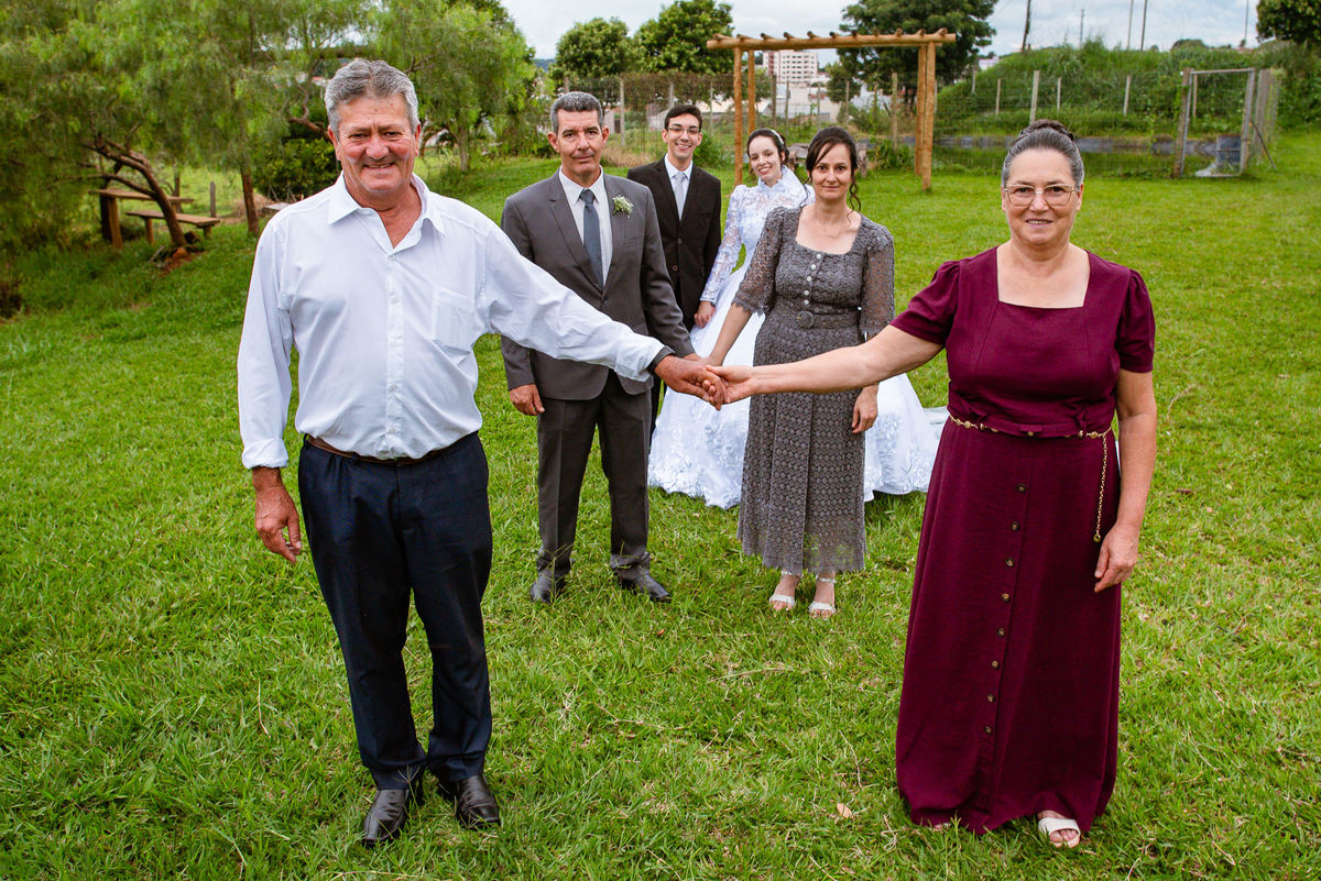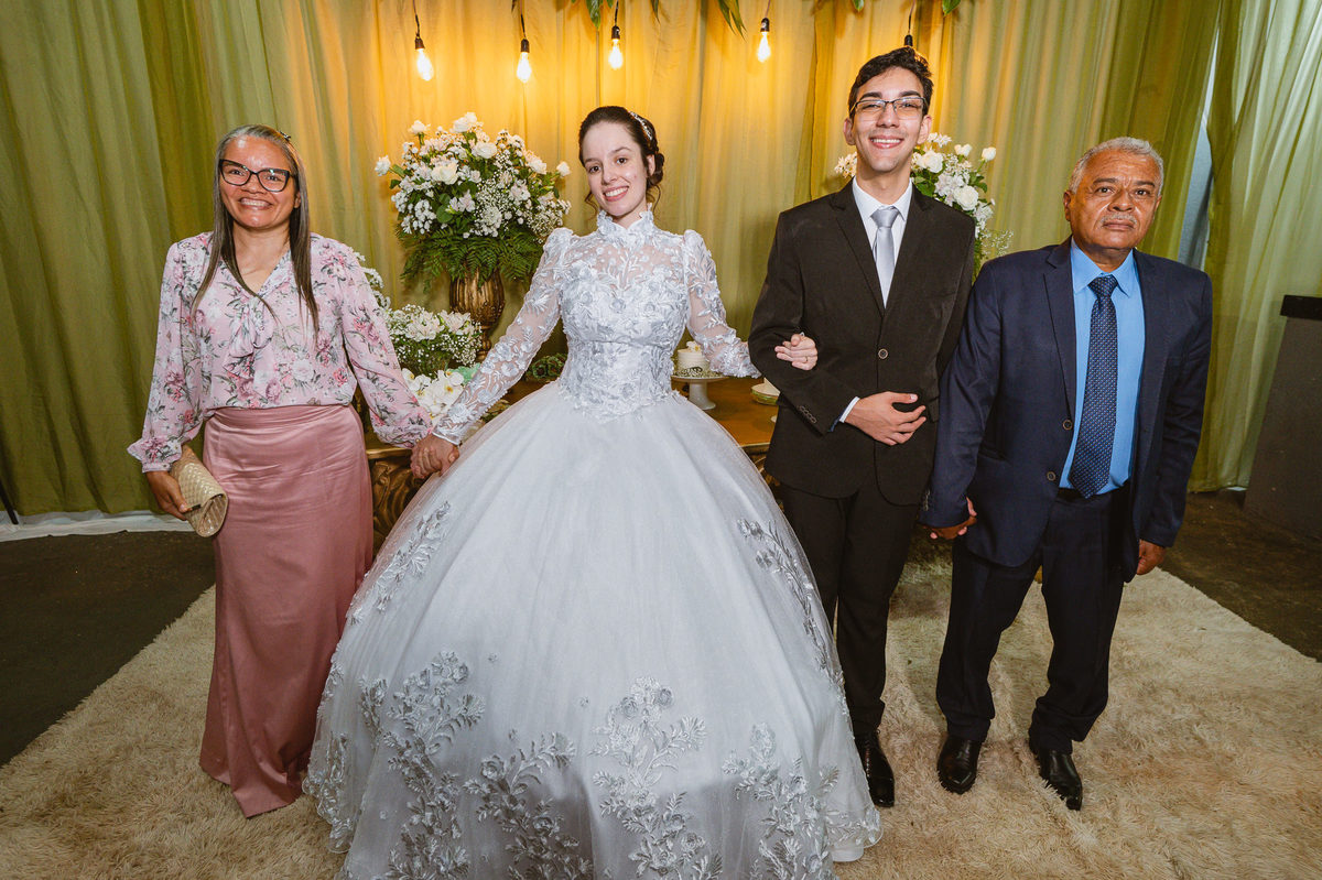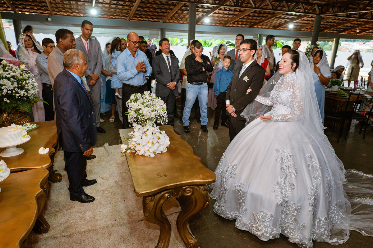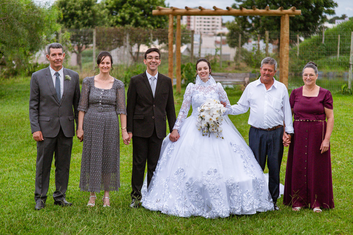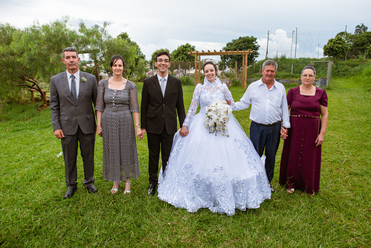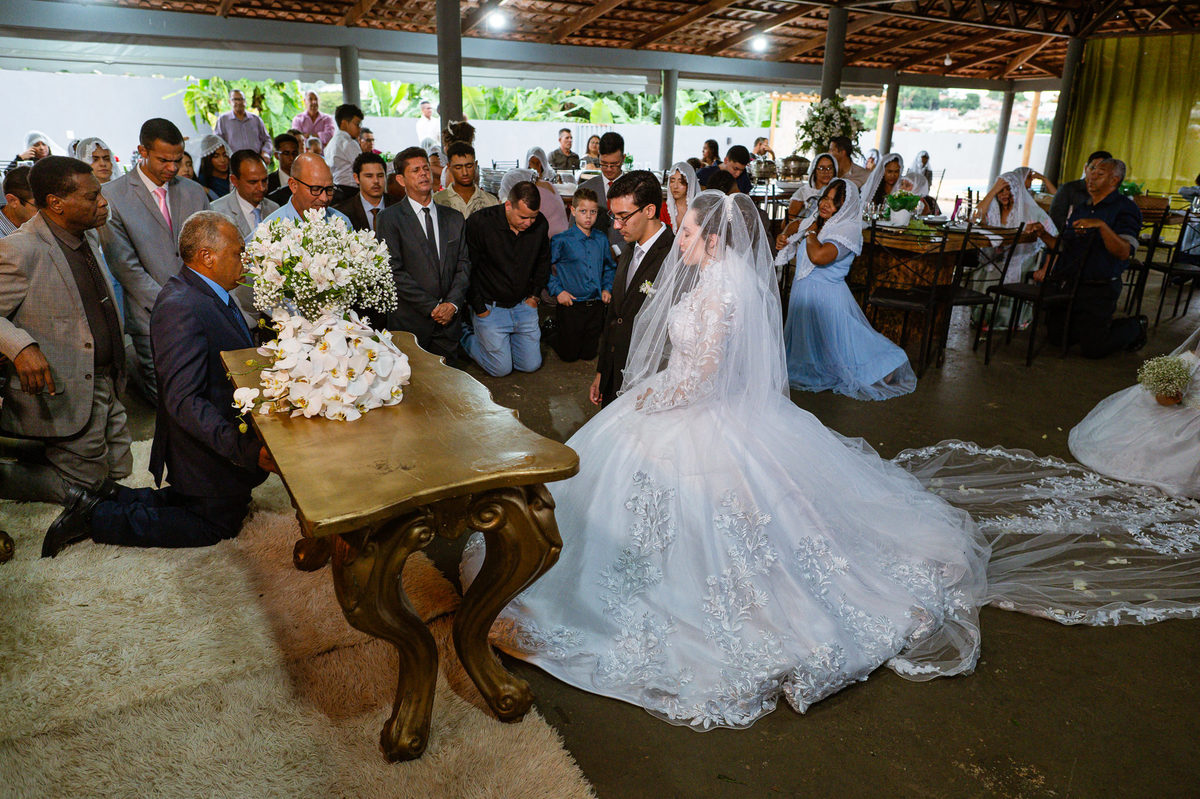 Eles receberam a bênção sobre suas vidas através do ancião, que realizou uma oração maravilhosa, convocando as mais ricas bênçãos de Deus sobre a vida do casal. Esse momento emocionou muita gente. Fizemos também todas as fotografias protocolares e deixamos os recém-casados à vontade para fazer conforme quiseram. Eduarda nos solicitou que durante a sessão de fotos deles, fizéssemos uma foto com os seus pais e avós. Depois, fizemos a sessão somente dos dois.
