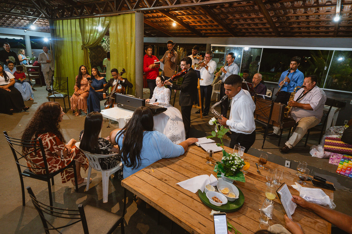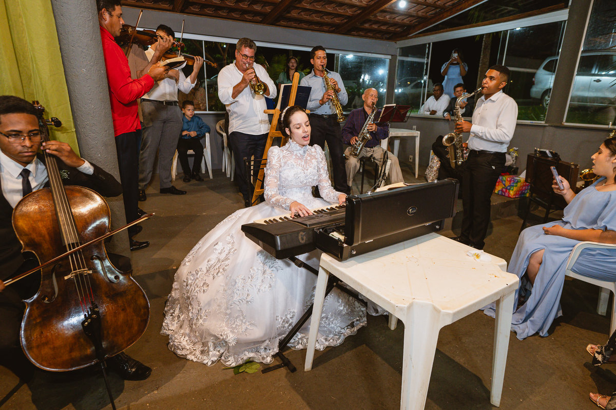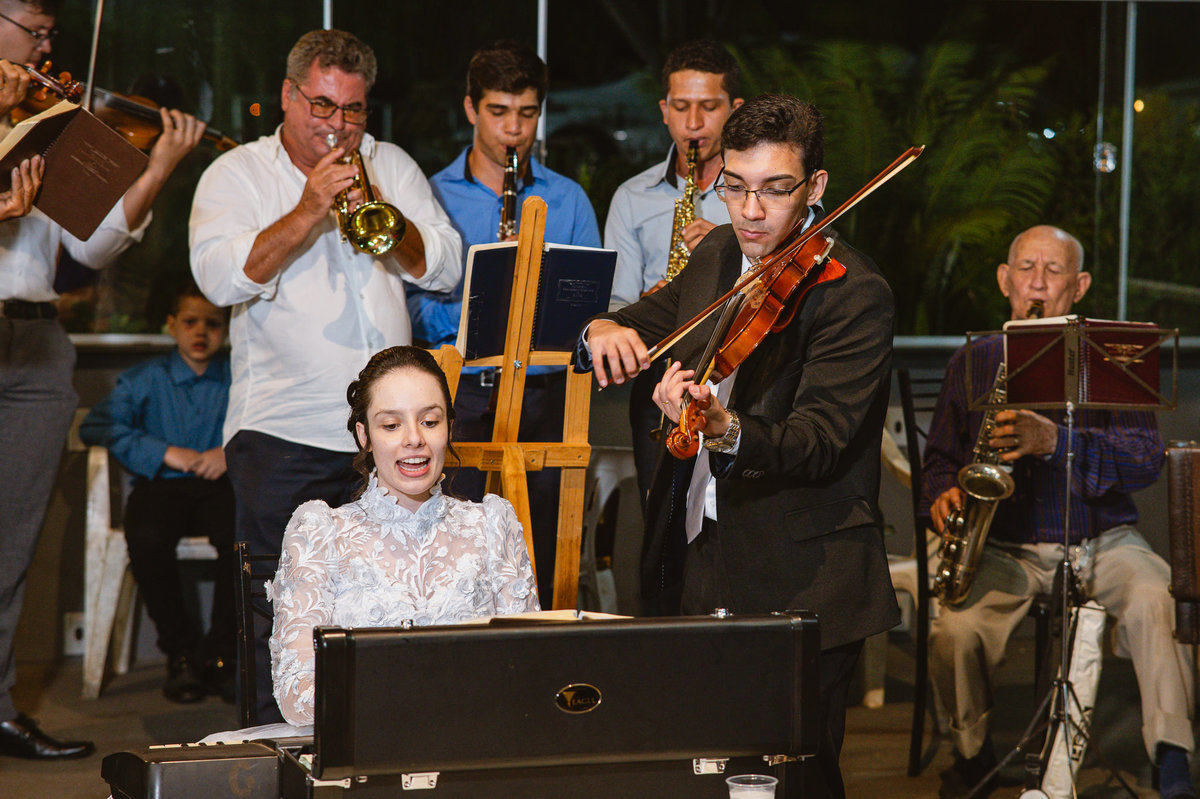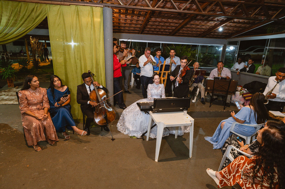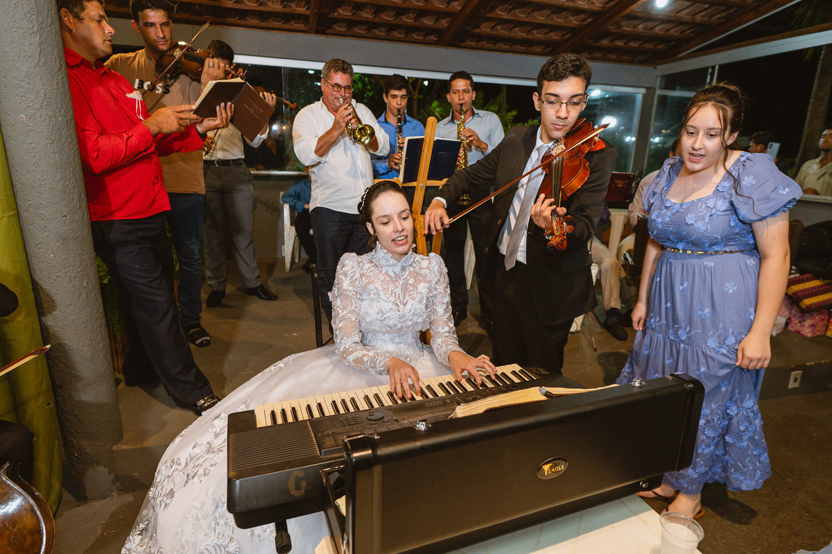 Eles retornaram ao salão e curtiram o evento juntamente com suas famílias. Receberam os cumprimentos de todos os convidados com muito carinho. Todo mundo se divertiu e apreciou as delícias servidas, com um buffet maravilhoso. Enquanto fotografávamos os cumprimentos, pouco a pouco, os músicos da congregação foram um a um chegando e afinando seu instrumento. Quando olhamos para trás, havia quase uma orquestra se reunindo para animar o casamento. Quando o louvor começou, todos os que estavam presentes se reuniram em uma só voz para cantar junto com eles. Eduarda fez questão de participar e logo conseguiram um teclado para que ela puxasse suas canções preferidas. Adriel, que também é músico, sacou seu violino e completou a orquestra celestial. Eles louvaram a Deus com seus instrumentos e também com vozes lindíssimas que mais pareciam terem sido treinadas por Deus para aquele momento. Todos fizeram questão de participar e trazer ainda mais bênção para aquele momento.