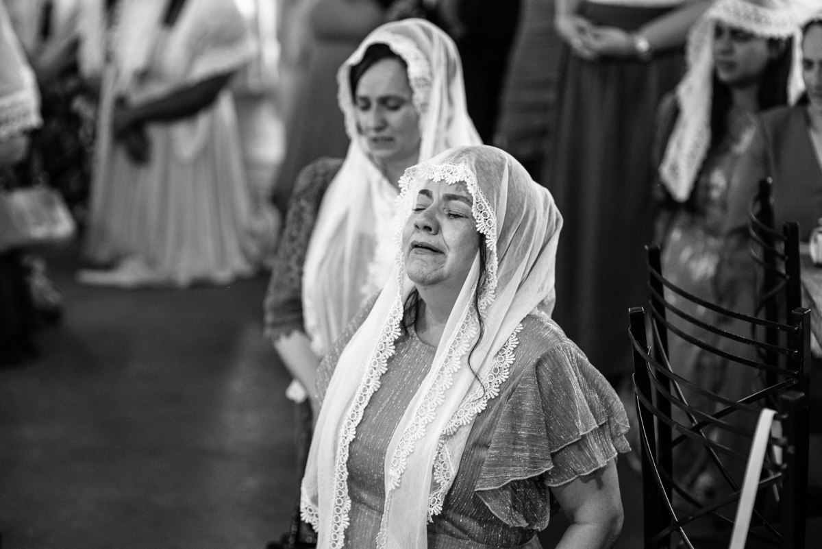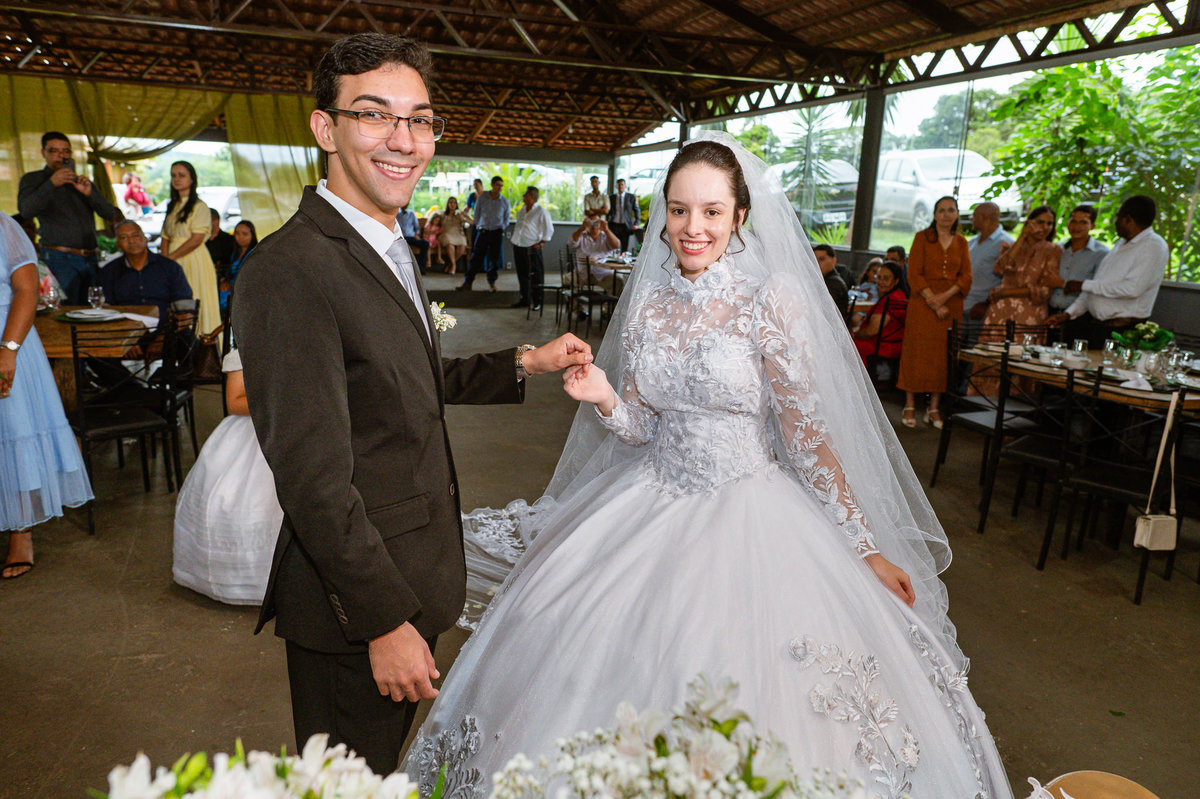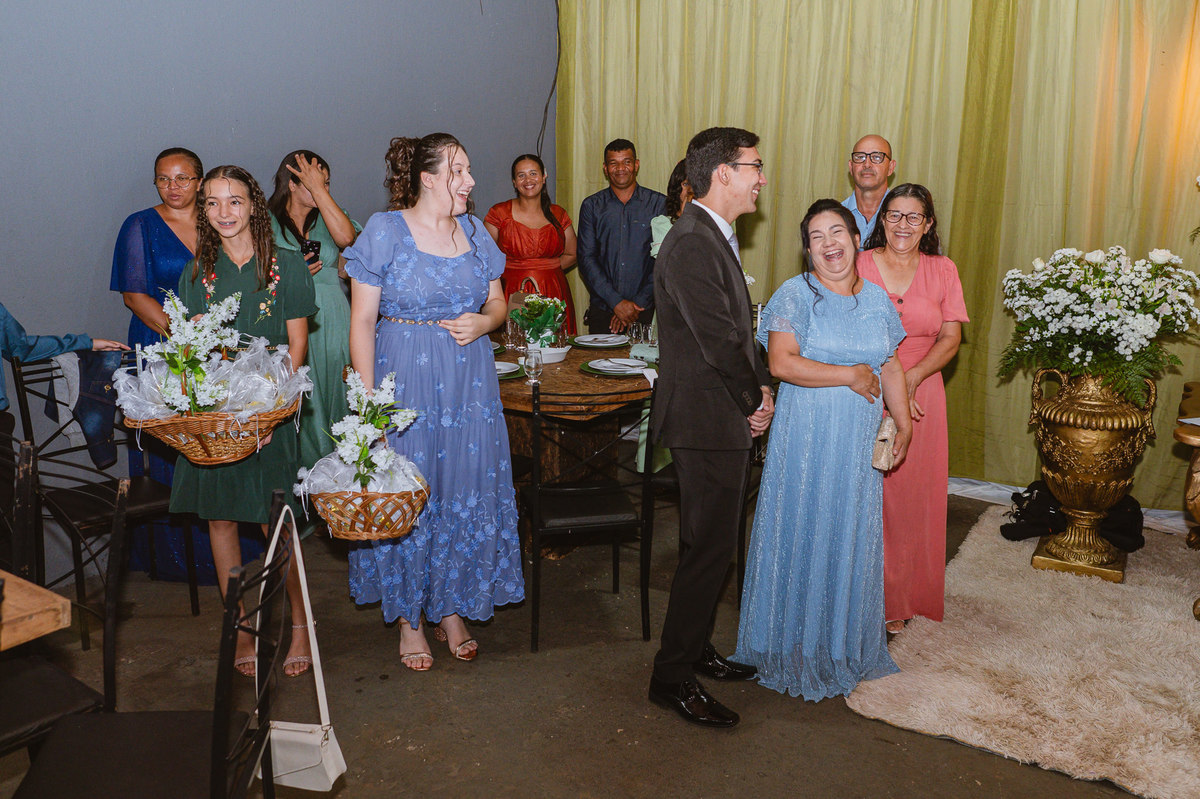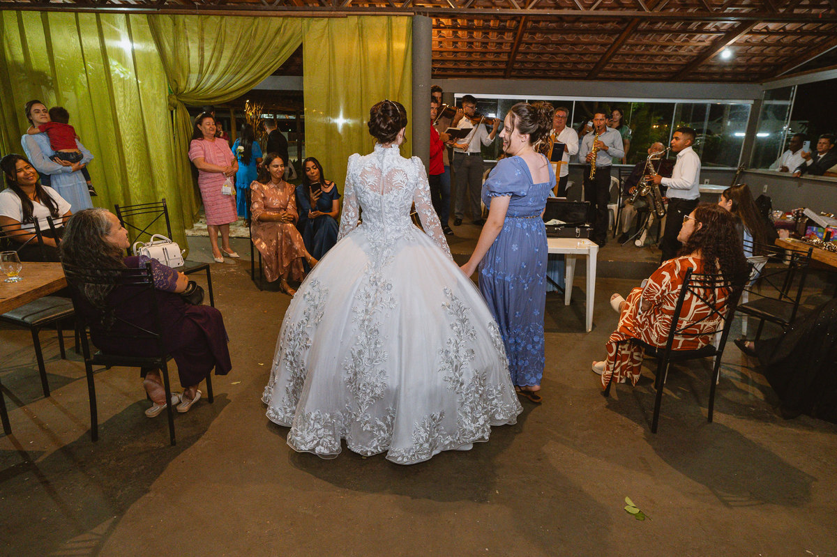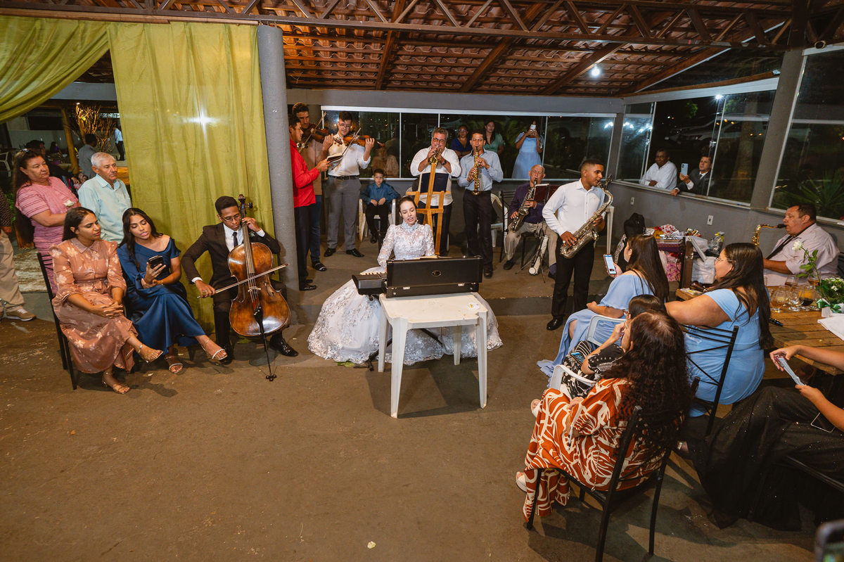 Eles retornaram ao salão e curtiram o evento juntamente com suas famílias. Receberam os cumprimentos de todos os convidados com muito carinho. Todo mundo se divertiu e apreciou as delícias servidas, com um buffet maravilhoso. Enquanto fotografávamos os cumprimentos, pouco a pouco, os músicos da congregação foram um a um chegando e afinando seu instrumento. Quando olhamos para trás, havia quase uma orquestra se reunindo para animar o casamento. Quando o louvor começou, todos os que estavam presentes se reuniram em uma só voz para cantar junto com eles. Eduarda fez questão de participar e logo conseguiram um teclado para que ela puxasse suas canções preferidas. Adriel, que também é músico, sacou seu violino e completou a orquestra celestial. Eles louvaram a Deus com seus instrumentos e também com vozes lindíssimas que mais pareciam terem sido treinadas por Deus para aquele momento. Todos fizeram questão de participar e trazer ainda mais bênção para aquele momento.