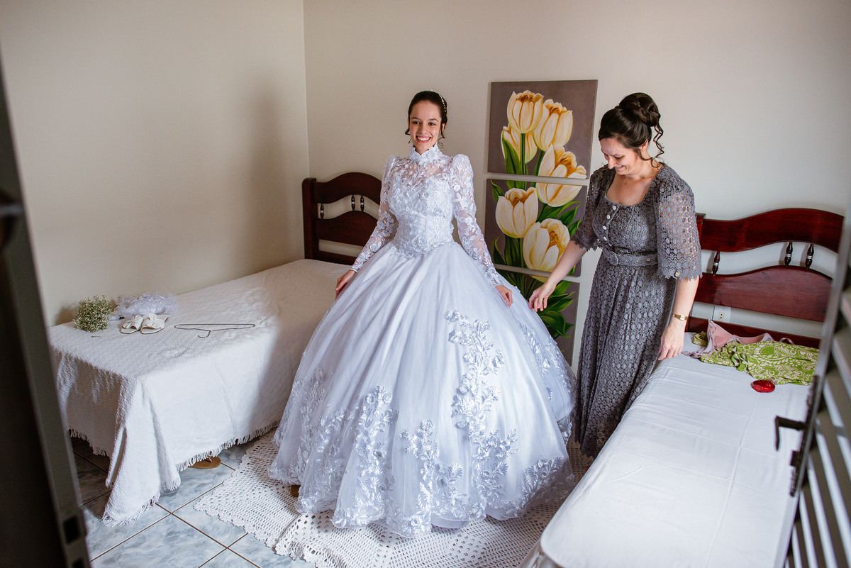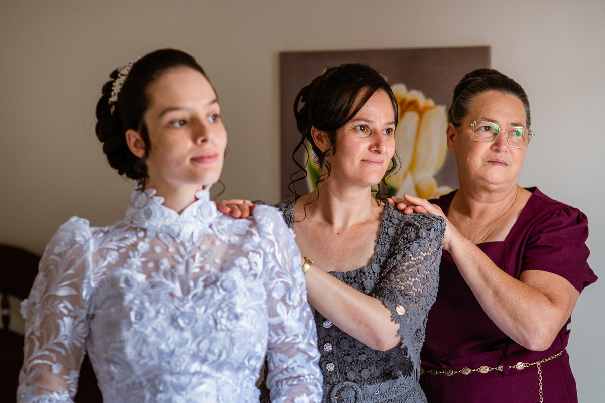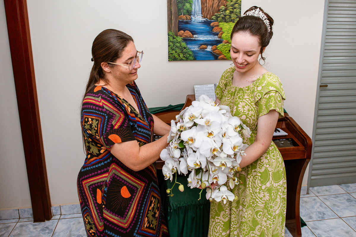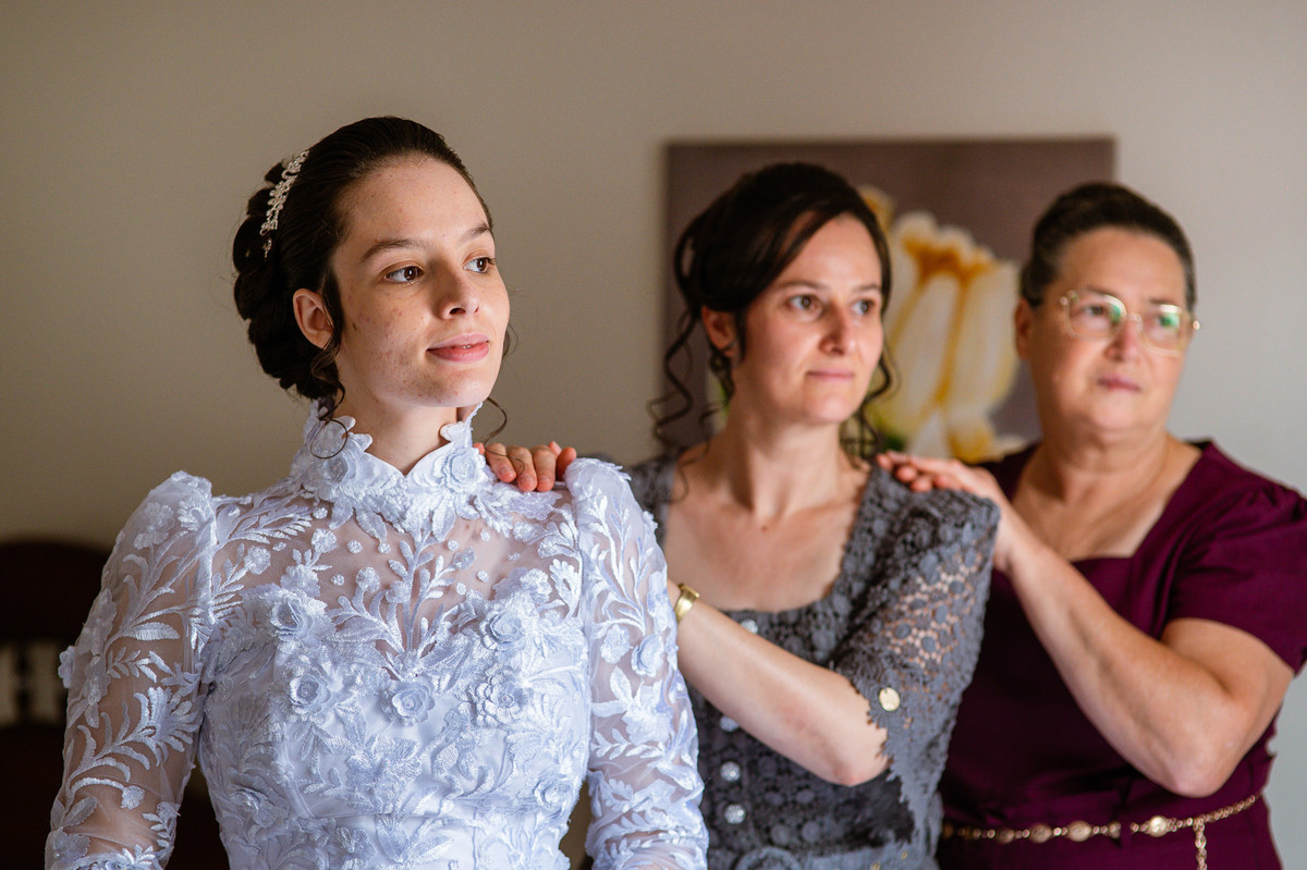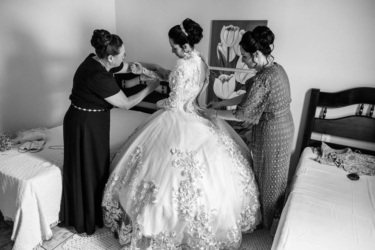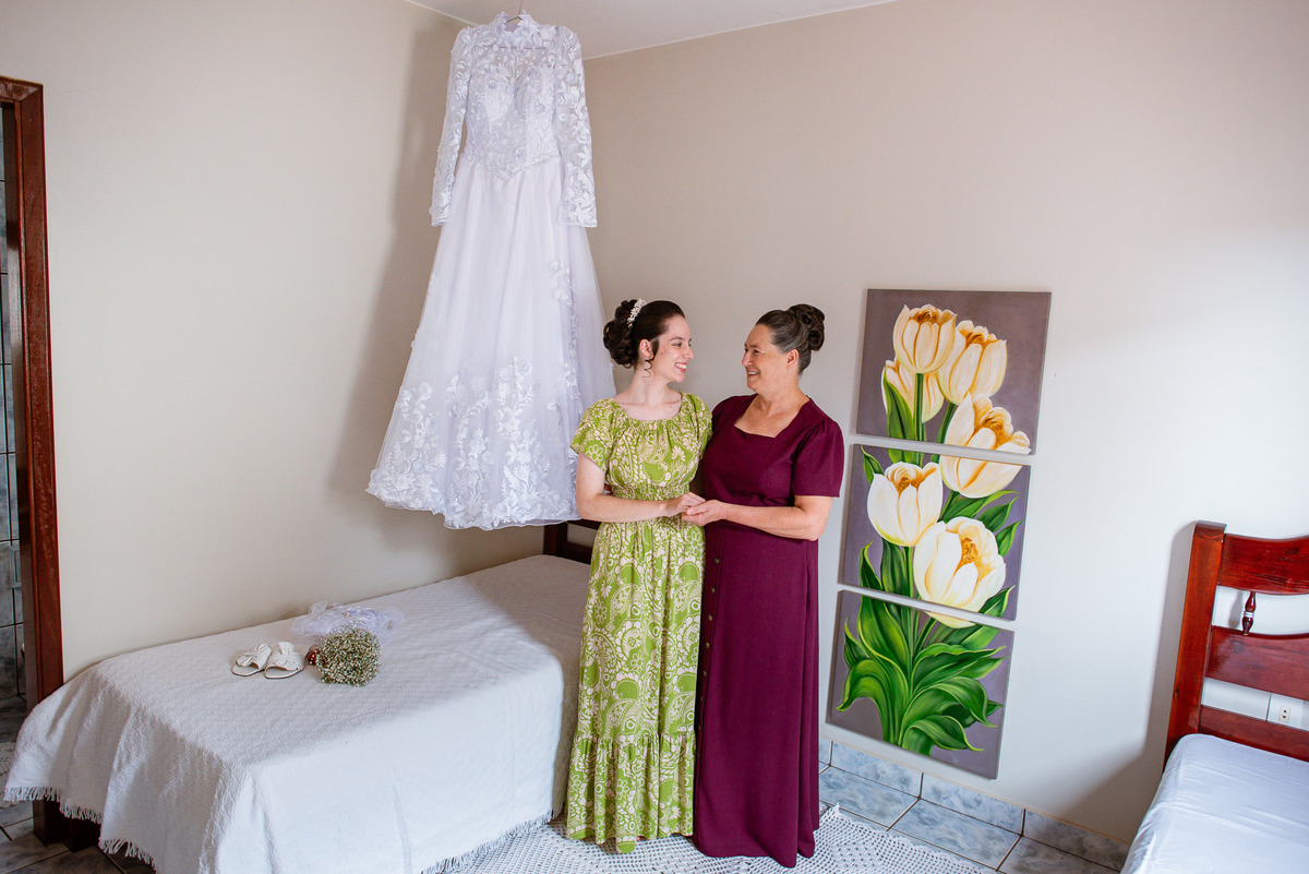 Ela fez questão de sentar e tocar o instrumento com muito louvor. Cantou e tocou algumas músicas que ela gosta muito e nos mostrou como tudo funcionava. Ficamos encantados com tanto talento e dedicação por parte dela. Fizemos algumas fotos dos seus itens de noiva, o vestido maravilhoso dependurado no quarto junto com suas coisinhas. Aos poucos, as pessoas mais importantes de sua vida foram aparecendo e dividiam o tempo entre se arrumar e participar do making of. Sua avó estava lá juntamente com seu esposo e avô de Eduarda. Fizemos as fotos com eles, com os pais da noiva e também com sua irmã querida, que tentou de todas as formas despistar a emoção. Tinha até mesmo uma daminha que estava se arrumando junto com o restante do pessoal. Entre as fotos e conversas, a mãe da noiva também nos deu uma pequena amostra de seu talento. Junto com Eduarda, elas cantaram e tocaram lindamente enquanto fotografávamos tudo. Foi lindo e emocionante ver mãe e filha de talentos tão abençoados. Antes de colocar o vestido, a família ainda preparou um super café da tarde para recarregarmos as energias. E tudo feito pelas mãos delas. Do café colhido na fazenda, passando pelos biscoitos até chegar no queijo que a família também produz.