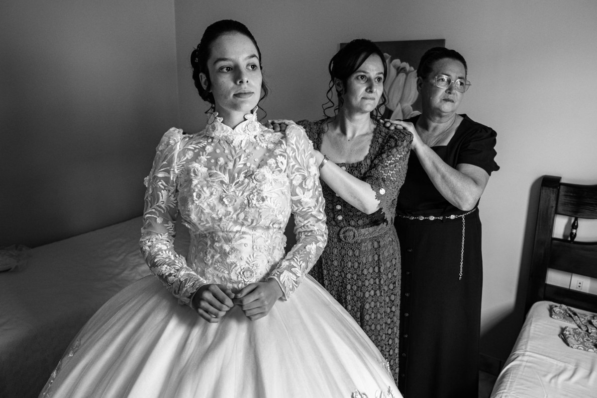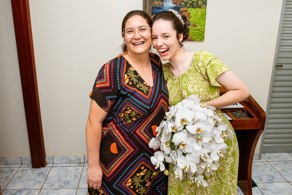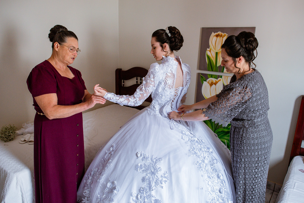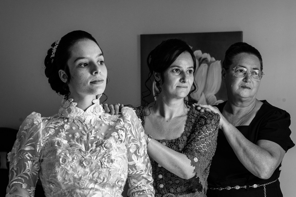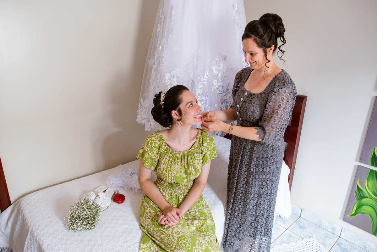 Ela fez questão de sentar e tocar o instrumento com muito louvor. Cantou e tocou algumas músicas que ela gosta muito e nos mostrou como tudo funcionava. Ficamos encantados com tanto talento e dedicação por parte dela. Fizemos algumas fotos dos seus itens de noiva, o vestido maravilhoso dependurado no quarto junto com suas coisinhas. Aos poucos, as pessoas mais importantes de sua vida foram aparecendo e dividiam o tempo entre se arrumar e participar do making of. Sua avó estava lá juntamente com seu esposo e avô de Eduarda. Fizemos as fotos com eles, com os pais da noiva e também com sua irmã querida, que tentou de todas as formas despistar a emoção. Tinha até mesmo uma daminha que estava se arrumando junto com o restante do pessoal. Entre as fotos e conversas, a mãe da noiva também nos deu uma pequena amostra de seu talento. Junto com Eduarda, elas cantaram e tocaram lindamente enquanto fotografávamos tudo. Foi lindo e emocionante ver mãe e filha de talentos tão abençoados. Antes de colocar o vestido, a família ainda preparou um super café da tarde para recarregarmos as energias. E tudo feito pelas mãos delas. Do café colhido na fazenda, passando pelos biscoitos até chegar no queijo que a família também produz.