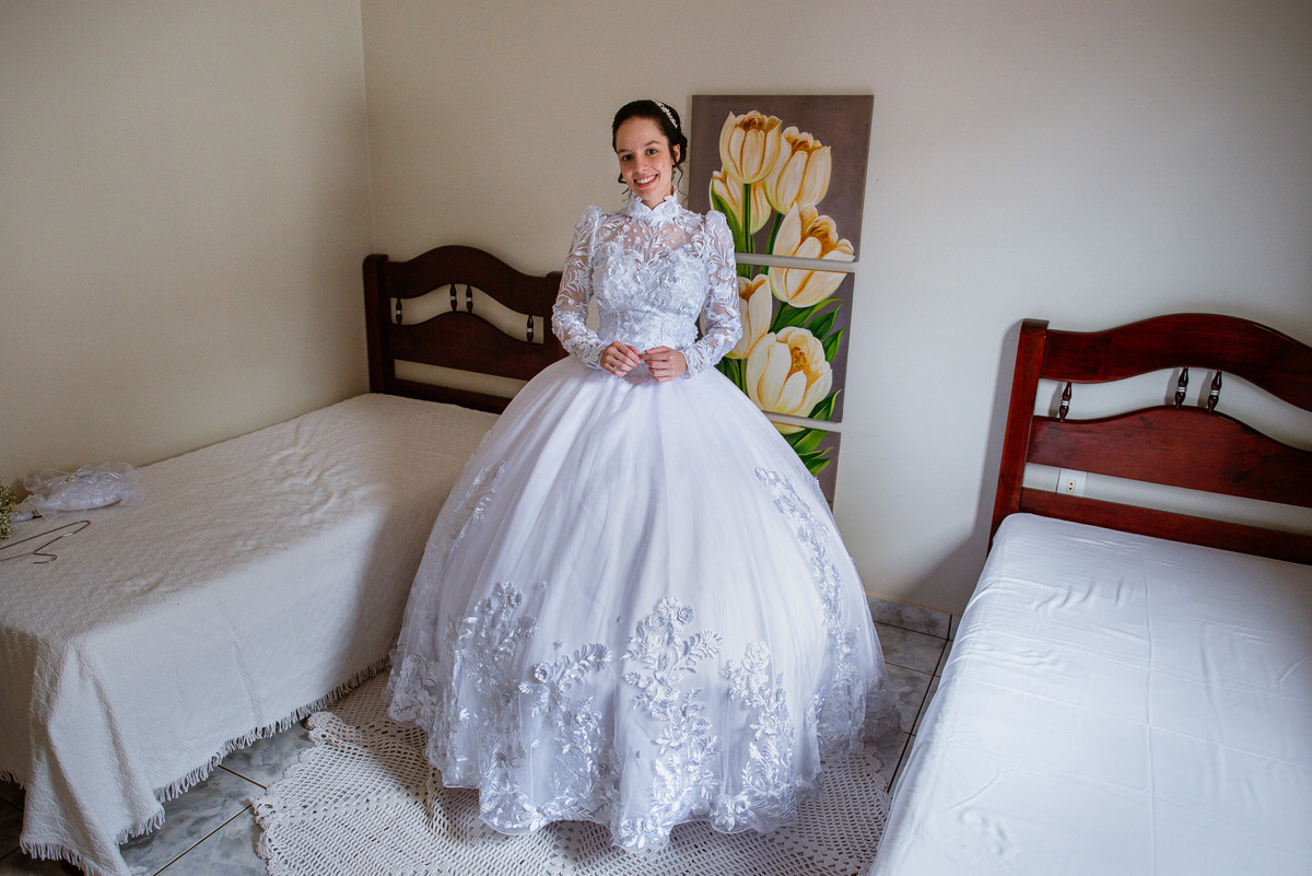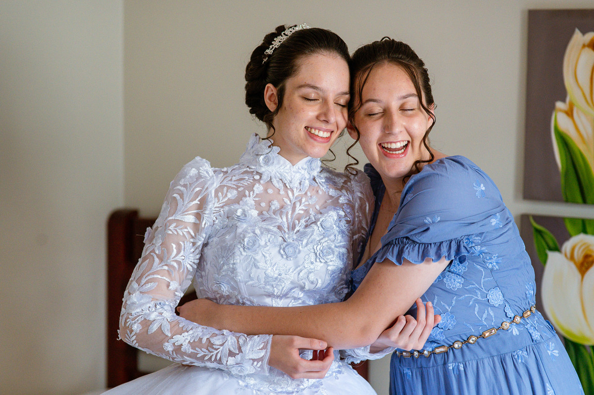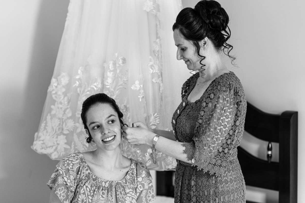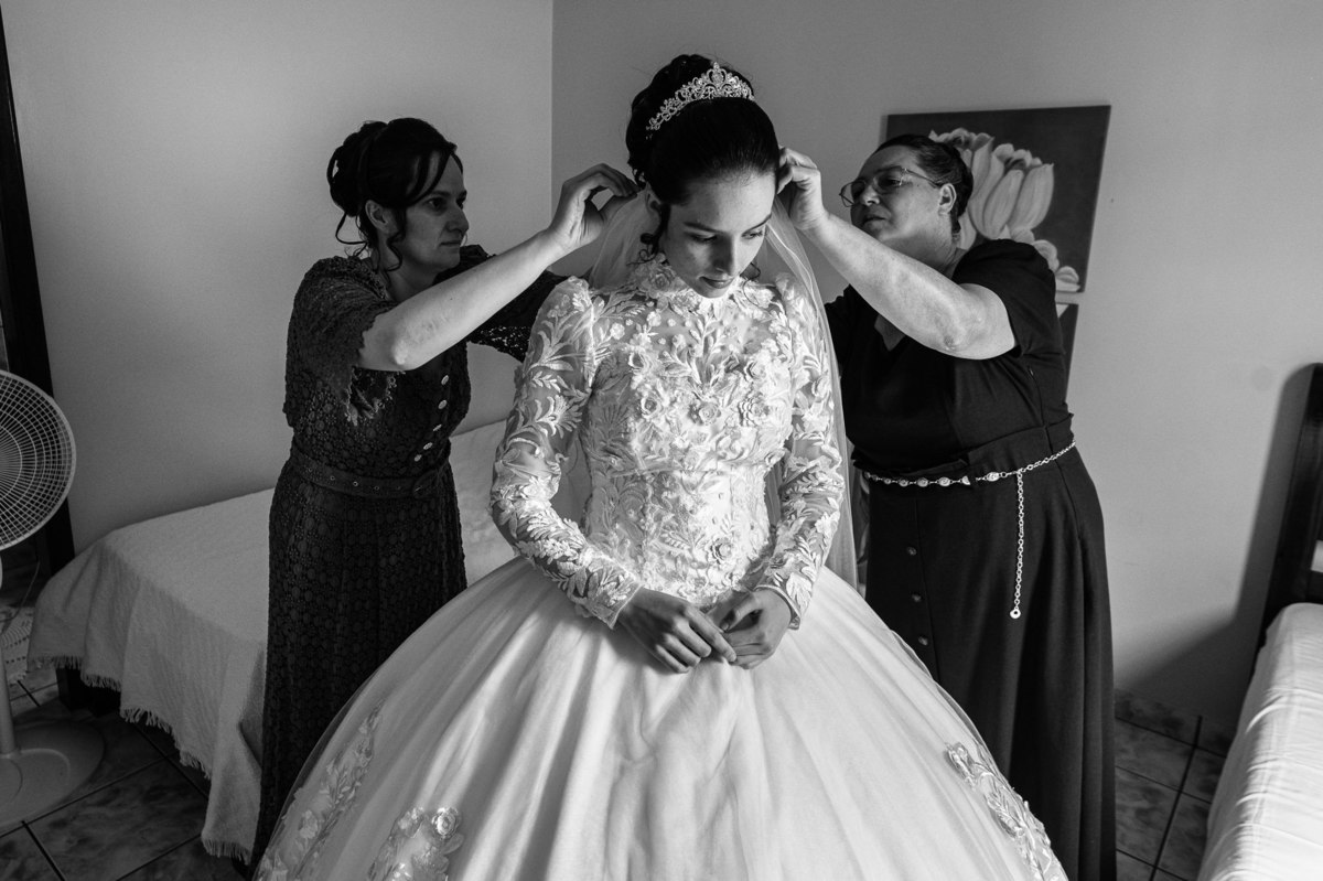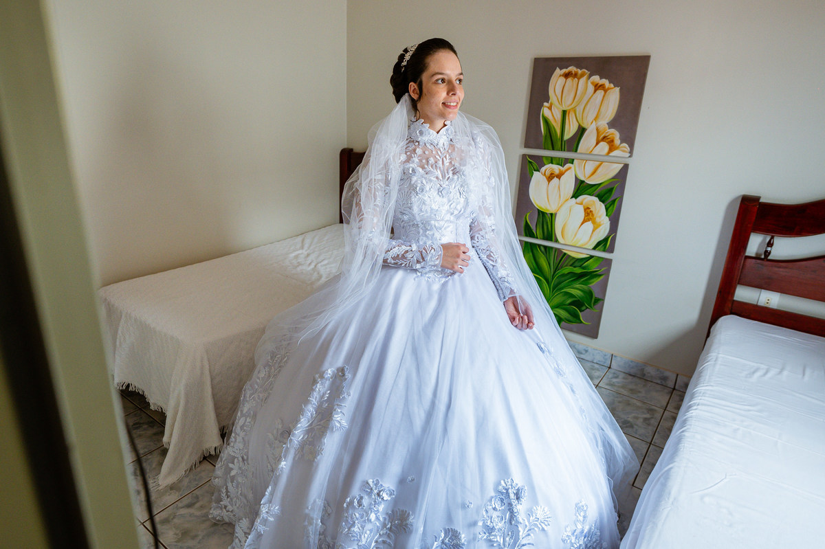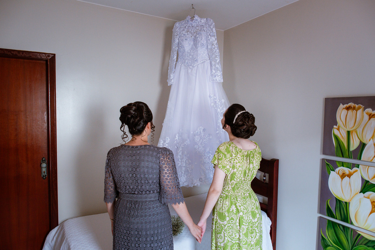 Ela fez questão de sentar e tocar o instrumento com muito louvor. Cantou e tocou algumas músicas que ela gosta muito e nos mostrou como tudo funcionava. Ficamos encantados com tanto talento e dedicação por parte dela. Fizemos algumas fotos dos seus itens de noiva, o vestido maravilhoso dependurado no quarto junto com suas coisinhas. Aos poucos, as pessoas mais importantes de sua vida foram aparecendo e dividiam o tempo entre se arrumar e participar do making of. Sua avó estava lá juntamente com seu esposo e avô de Eduarda. Fizemos as fotos com eles, com os pais da noiva e também com sua irmã querida, que tentou de todas as formas despistar a emoção. Tinha até mesmo uma daminha que estava se arrumando junto com o restante do pessoal. Entre as fotos e conversas, a mãe da noiva também nos deu uma pequena amostra de seu talento. Junto com Eduarda, elas cantaram e tocaram lindamente enquanto fotografávamos tudo. Foi lindo e emocionante ver mãe e filha de talentos tão abençoados. Antes de colocar o vestido, a família ainda preparou um super café da tarde para recarregarmos as energias. E tudo feito pelas mãos delas. Do café colhido na fazenda, passando pelos biscoitos até chegar no queijo que a família também produz.