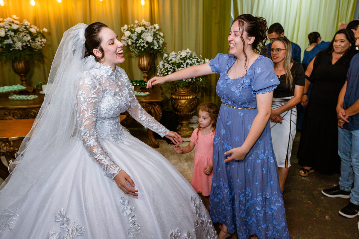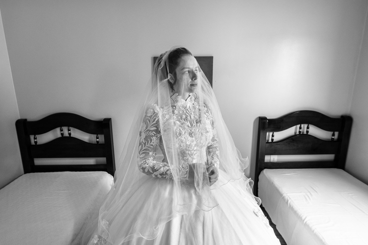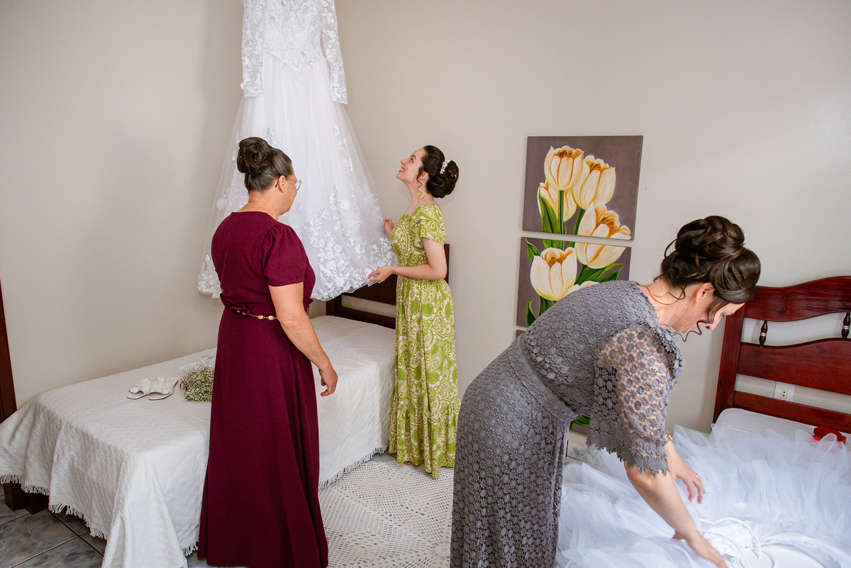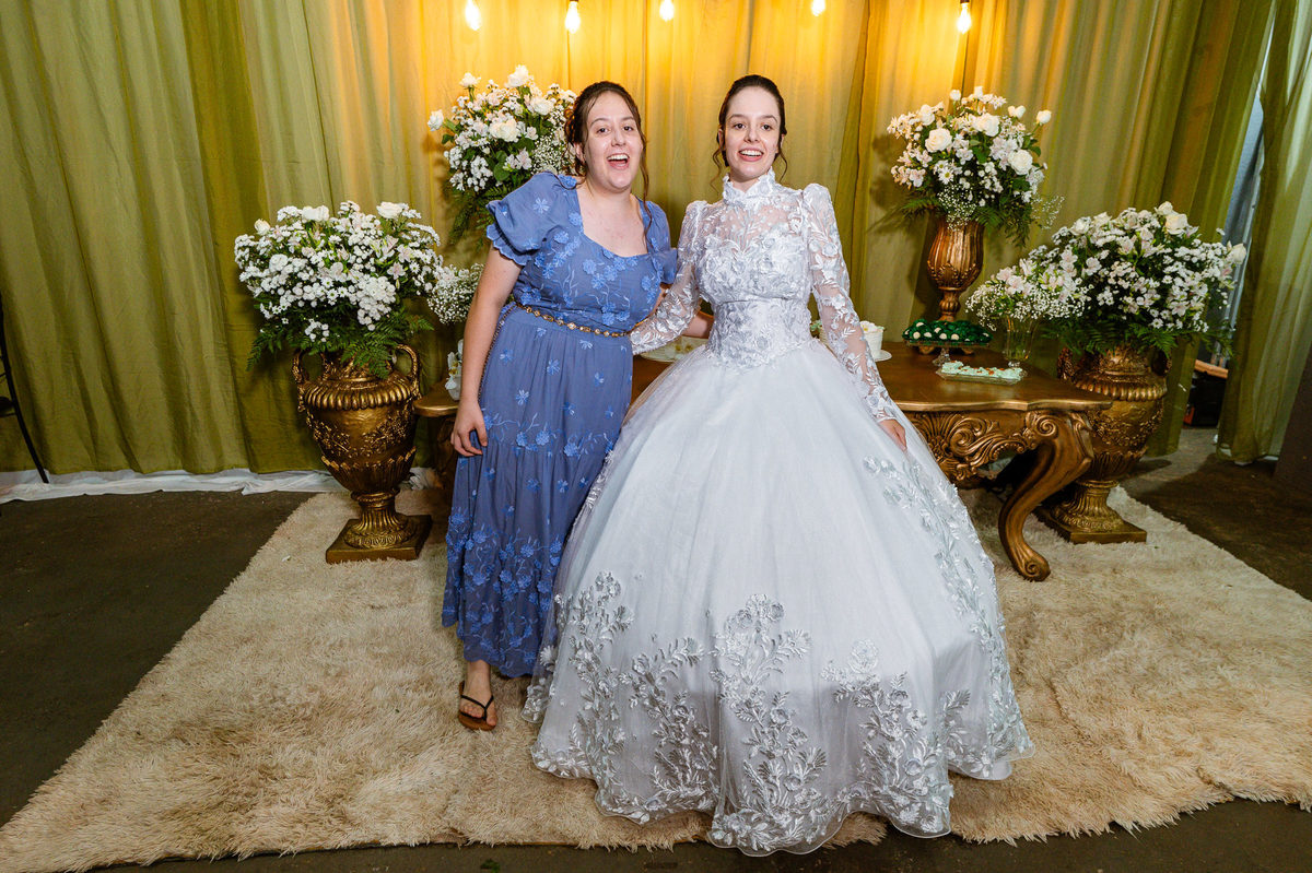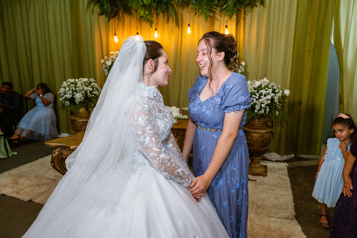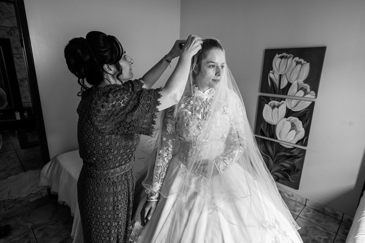 Ela fez questão de sentar e tocar o instrumento com muito louvor. Cantou e tocou algumas músicas que ela gosta muito e nos mostrou como tudo funcionava. Ficamos encantados com tanto talento e dedicação por parte dela. Fizemos algumas fotos dos seus itens de noiva, o vestido maravilhoso dependurado no quarto junto com suas coisinhas. Aos poucos, as pessoas mais importantes de sua vida foram aparecendo e dividiam o tempo entre se arrumar e participar do making of. Sua avó estava lá juntamente com seu esposo e avô de Eduarda. Fizemos as fotos com eles, com os pais da noiva e também com sua irmã querida, que tentou de todas as formas despistar a emoção. Tinha até mesmo uma daminha que estava se arrumando junto com o restante do pessoal. Entre as fotos e conversas, a mãe da noiva também nos deu uma pequena amostra de seu talento. Junto com Eduarda, elas cantaram e tocaram lindamente enquanto fotografávamos tudo. Foi lindo e emocionante ver mãe e filha de talentos tão abençoados. Antes de colocar o vestido, a família ainda preparou um super café da tarde para recarregarmos as energias. E tudo feito pelas mãos delas. Do café colhido na fazenda, passando pelos biscoitos até chegar no queijo que a família também produz.