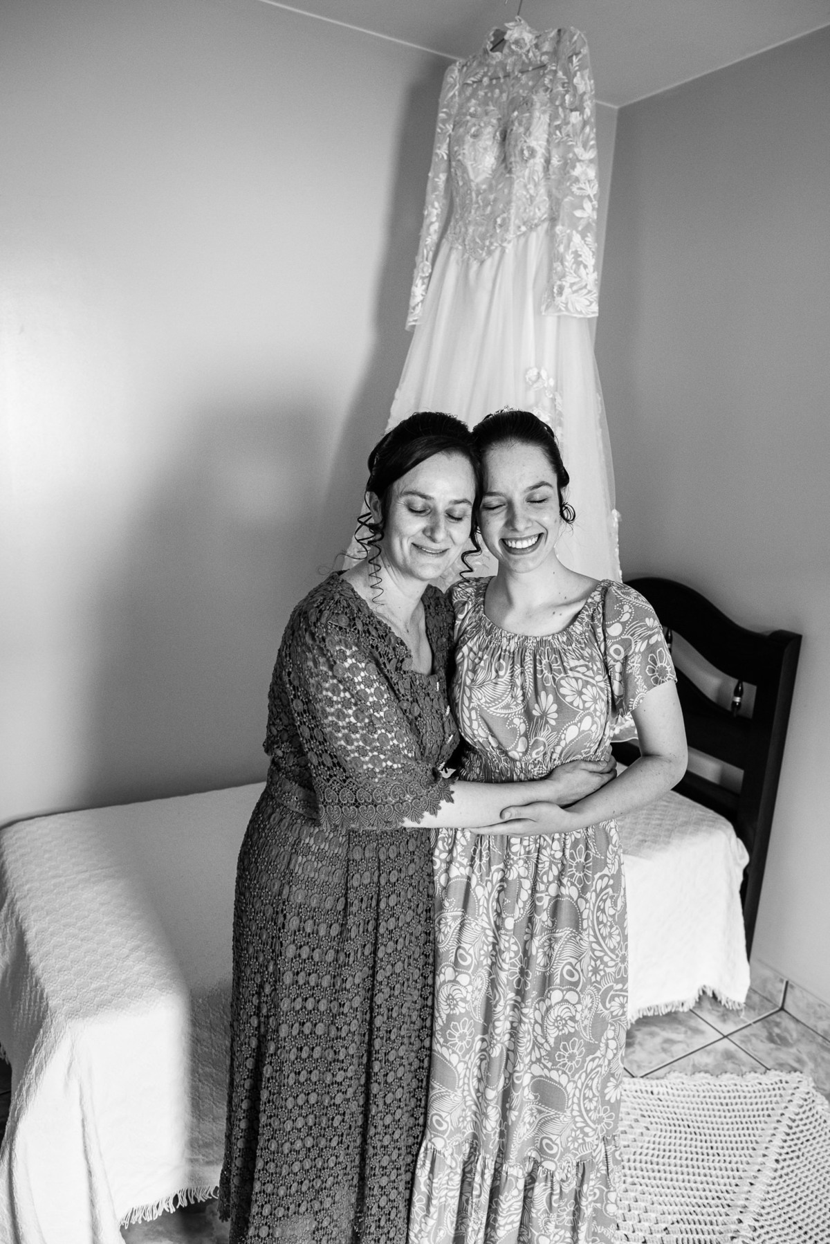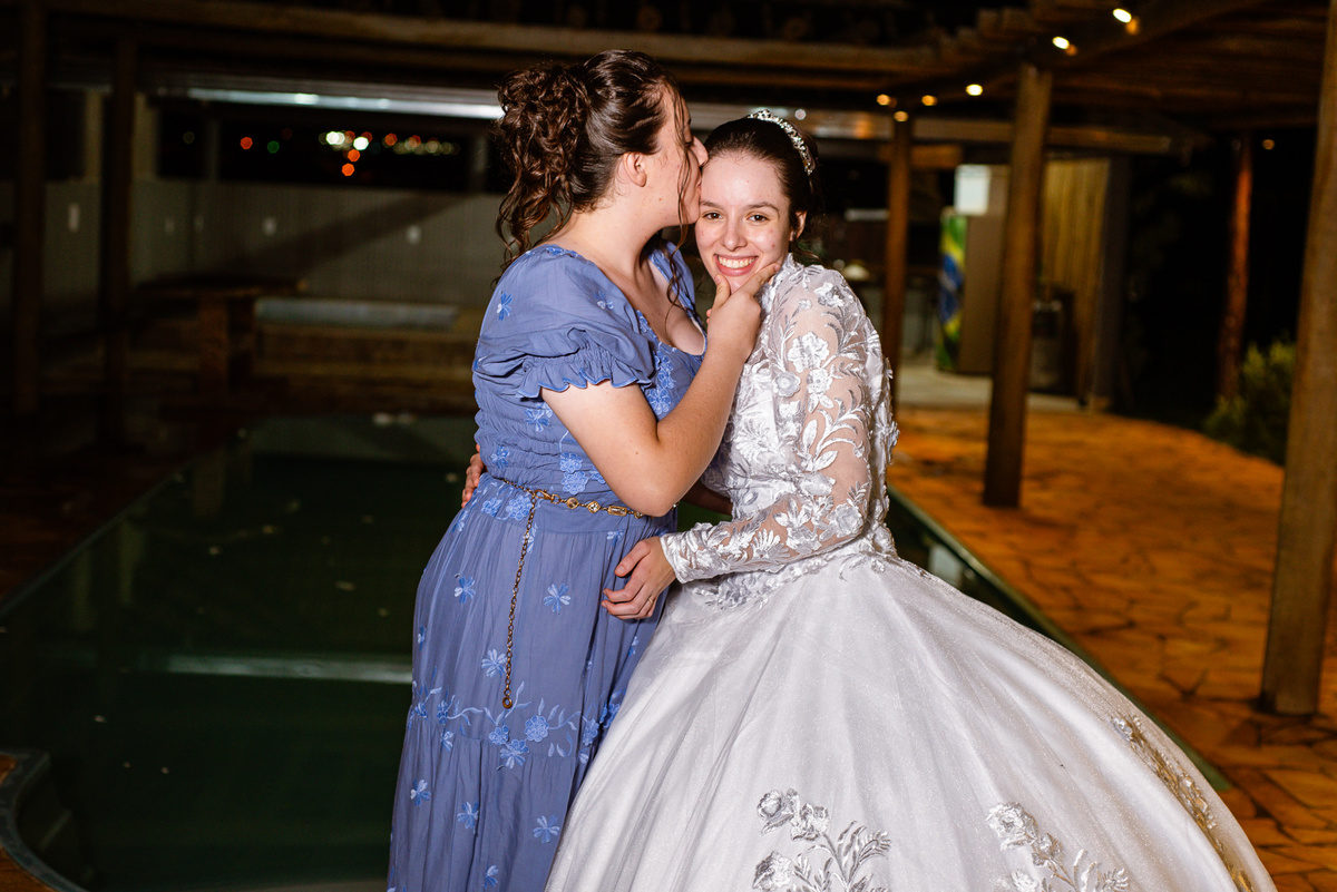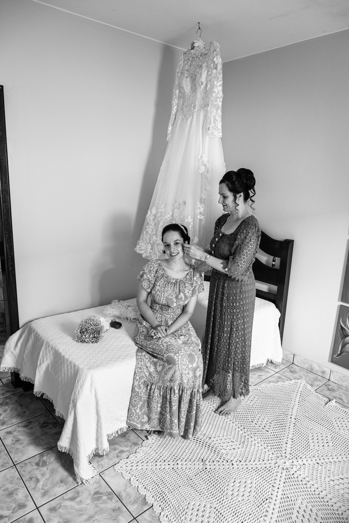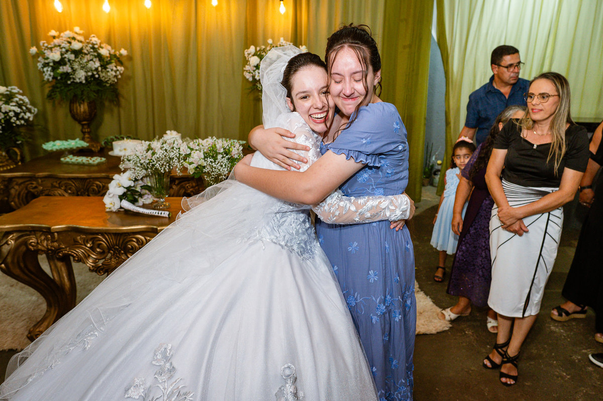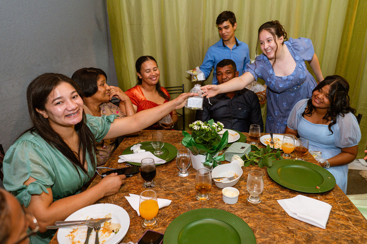 Ela fez questão de sentar e tocar o instrumento com muito louvor. Cantou e tocou algumas músicas que ela gosta muito e nos mostrou como tudo funcionava. Ficamos encantados com tanto talento e dedicação por parte dela. Fizemos algumas fotos dos seus itens de noiva, o vestido maravilhoso dependurado no quarto junto com suas coisinhas. Aos poucos, as pessoas mais importantes de sua vida foram aparecendo e dividiam o tempo entre se arrumar e participar do making of. Sua avó estava lá juntamente com seu esposo e avô de Eduarda. Fizemos as fotos com eles, com os pais da noiva e também com sua irmã querida, que tentou de todas as formas despistar a emoção. Tinha até mesmo uma daminha que estava se arrumando junto com o restante do pessoal. Entre as fotos e conversas, a mãe da noiva também nos deu uma pequena amostra de seu talento. Junto com Eduarda, elas cantaram e tocaram lindamente enquanto fotografávamos tudo. Foi lindo e emocionante ver mãe e filha de talentos tão abençoados. Antes de colocar o vestido, a família ainda preparou um super café da tarde para recarregarmos as energias. E tudo feito pelas mãos delas. Do café colhido na fazenda, passando pelos biscoitos até chegar no queijo que a família também produz.