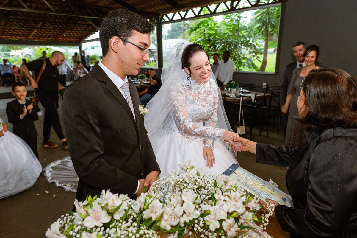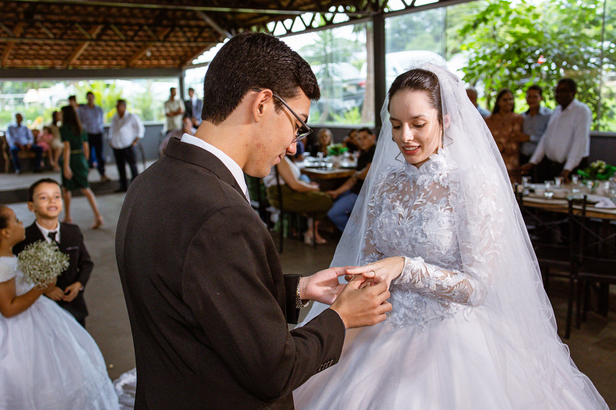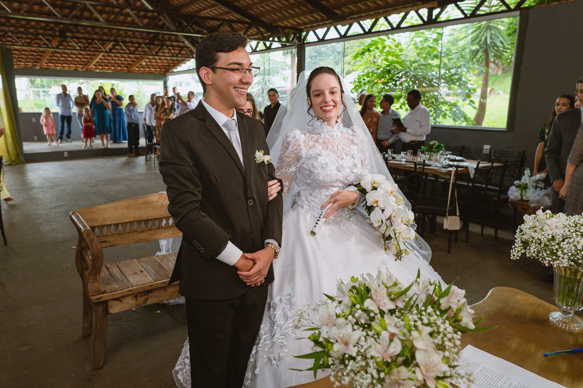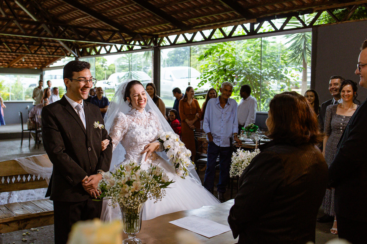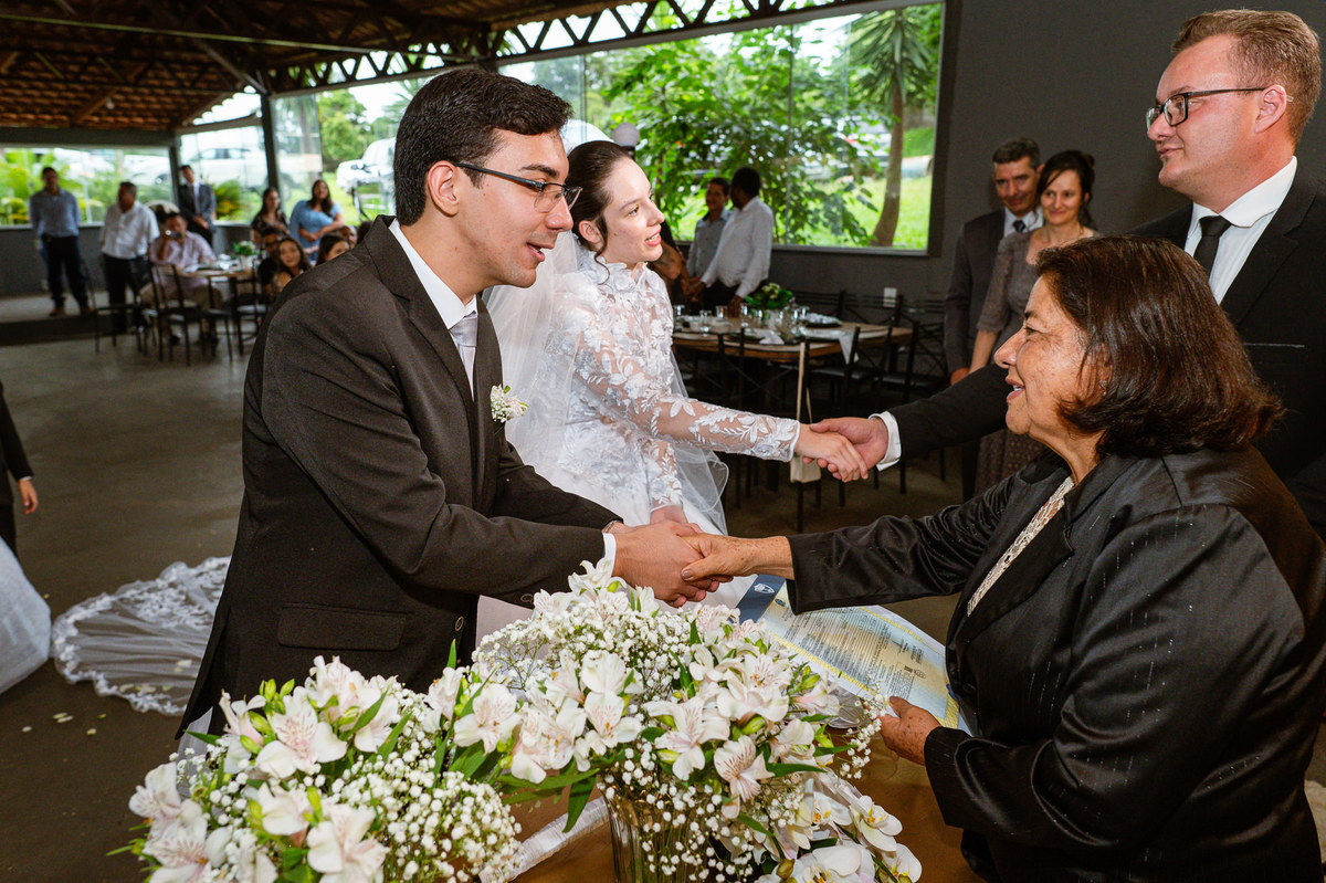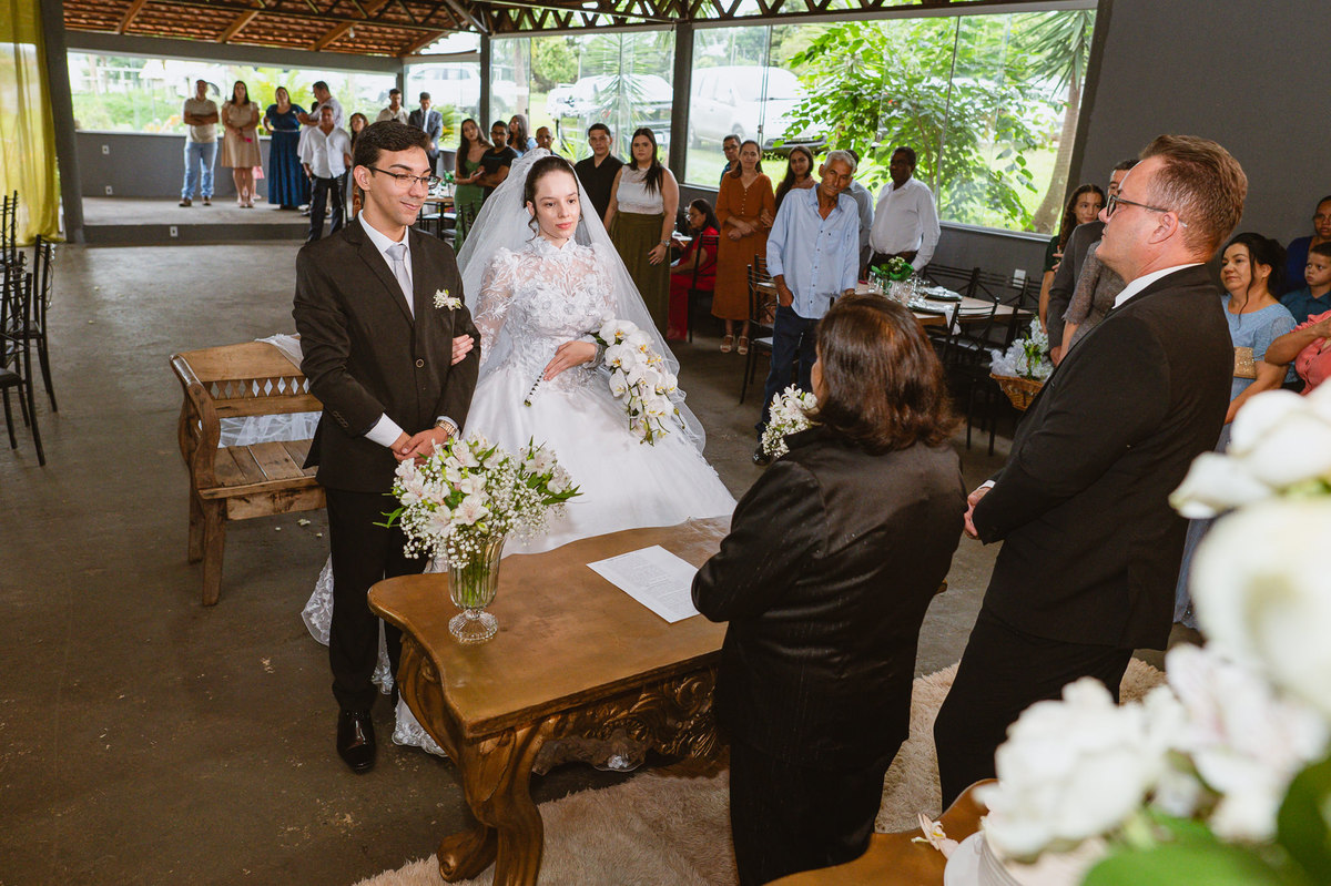Foi um momento muito forte. Todos acompanhavam com muita felicidade. A juíza os recebeu e iniciou a celebração do casamento. E mesmo não sendo celebrante, ela nos trouxe uma palavra muito cativante. Parabenizou os dois pela atitude e destacou a importância do casamento nos dias atuais. Posteriormente, confirmou os votos de casamento dos dois que prontamente afirmaram em alto e bom som. Depois, as alianças foram trazidas por um casal de pajens que trouxe mais leveza ainda para esse momento. Adriel e Eduarda trocaram as alianças e prometeram amor e fidelidade um ao outro para sempre, fechando aquele instante com um beijo da aliança um do outro. Por fim, eles foram declarados casados e prosseguimos com a assinatura dos documentos.