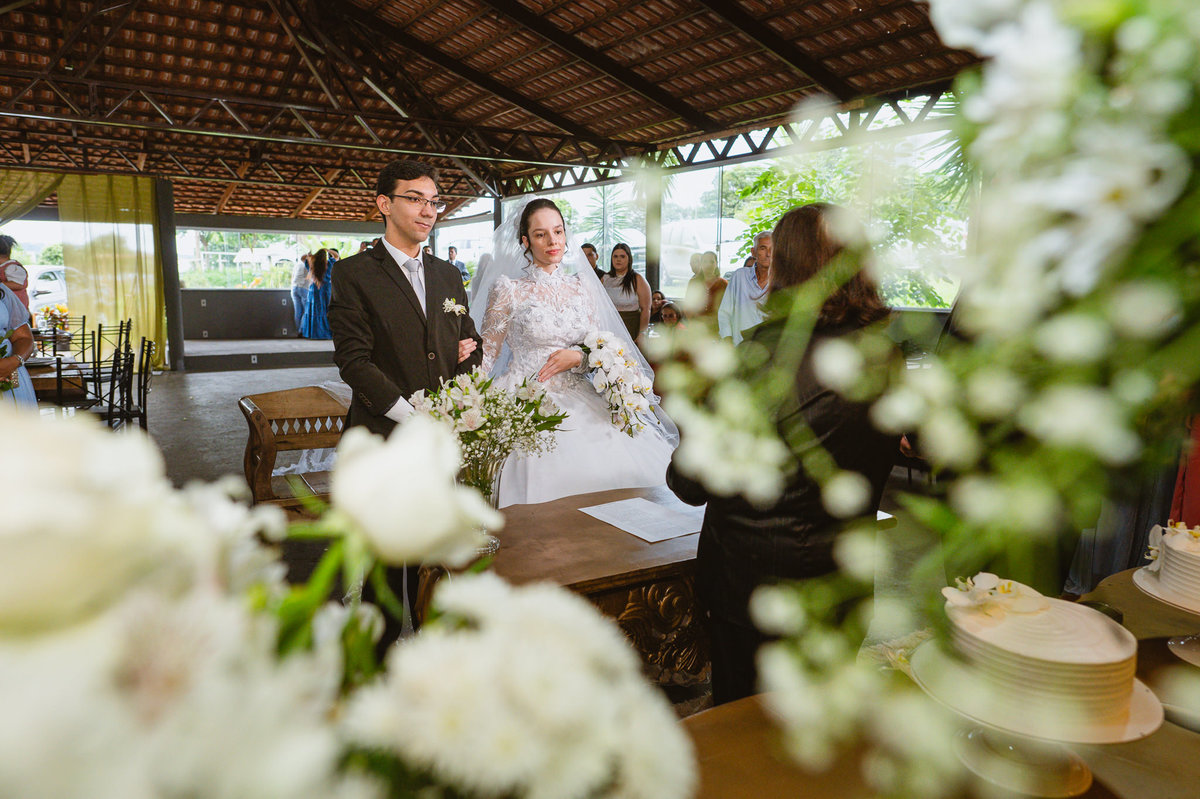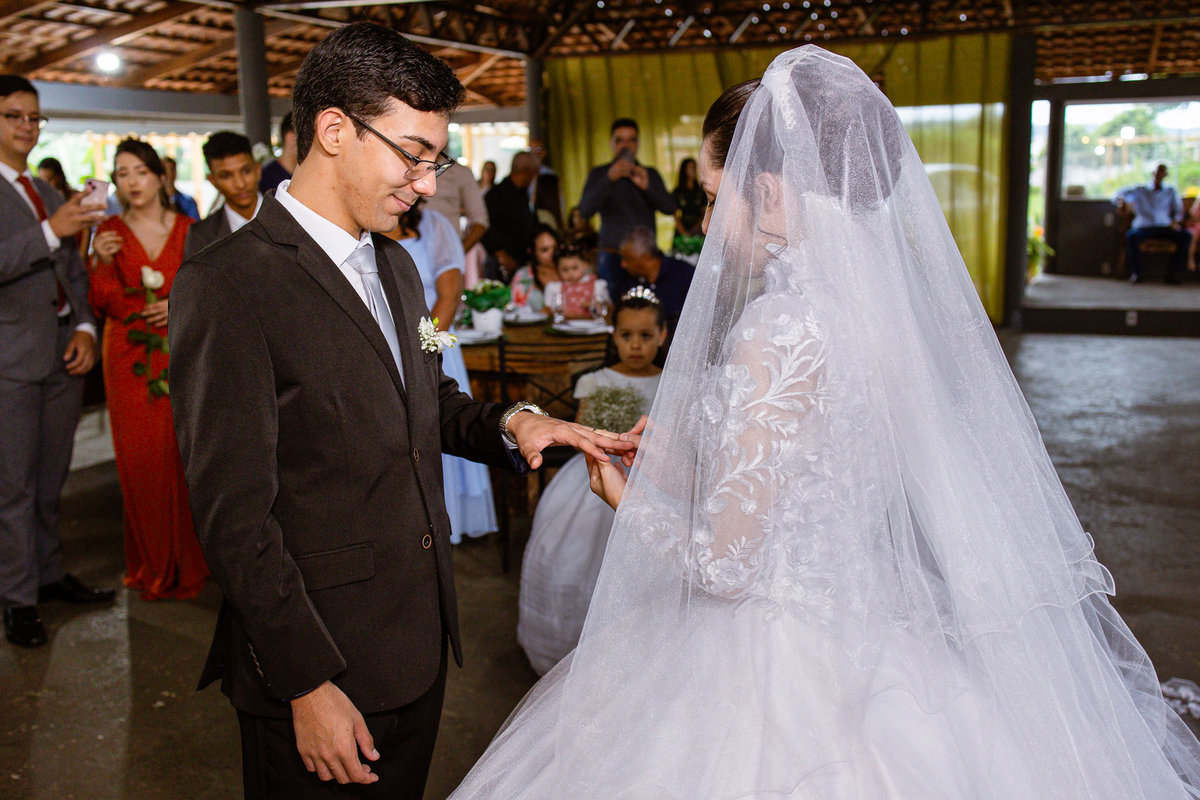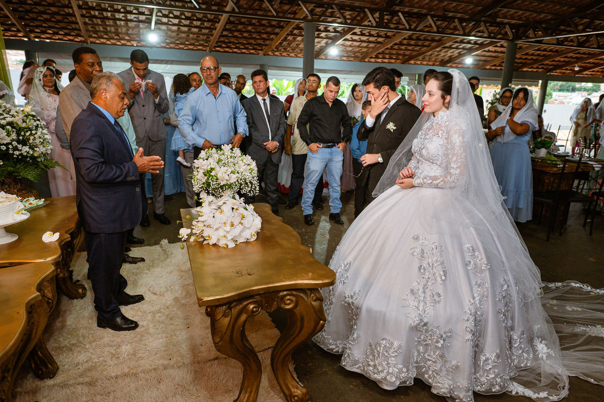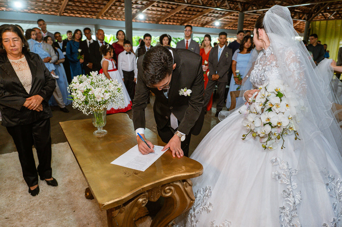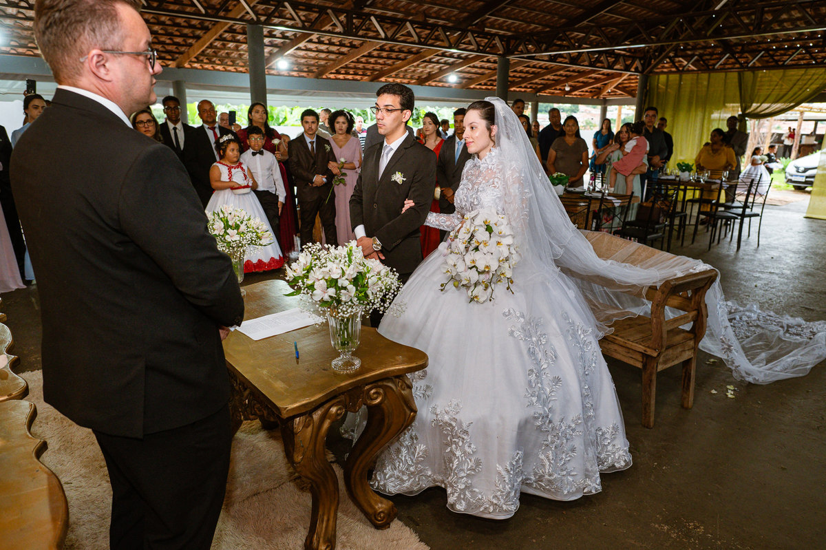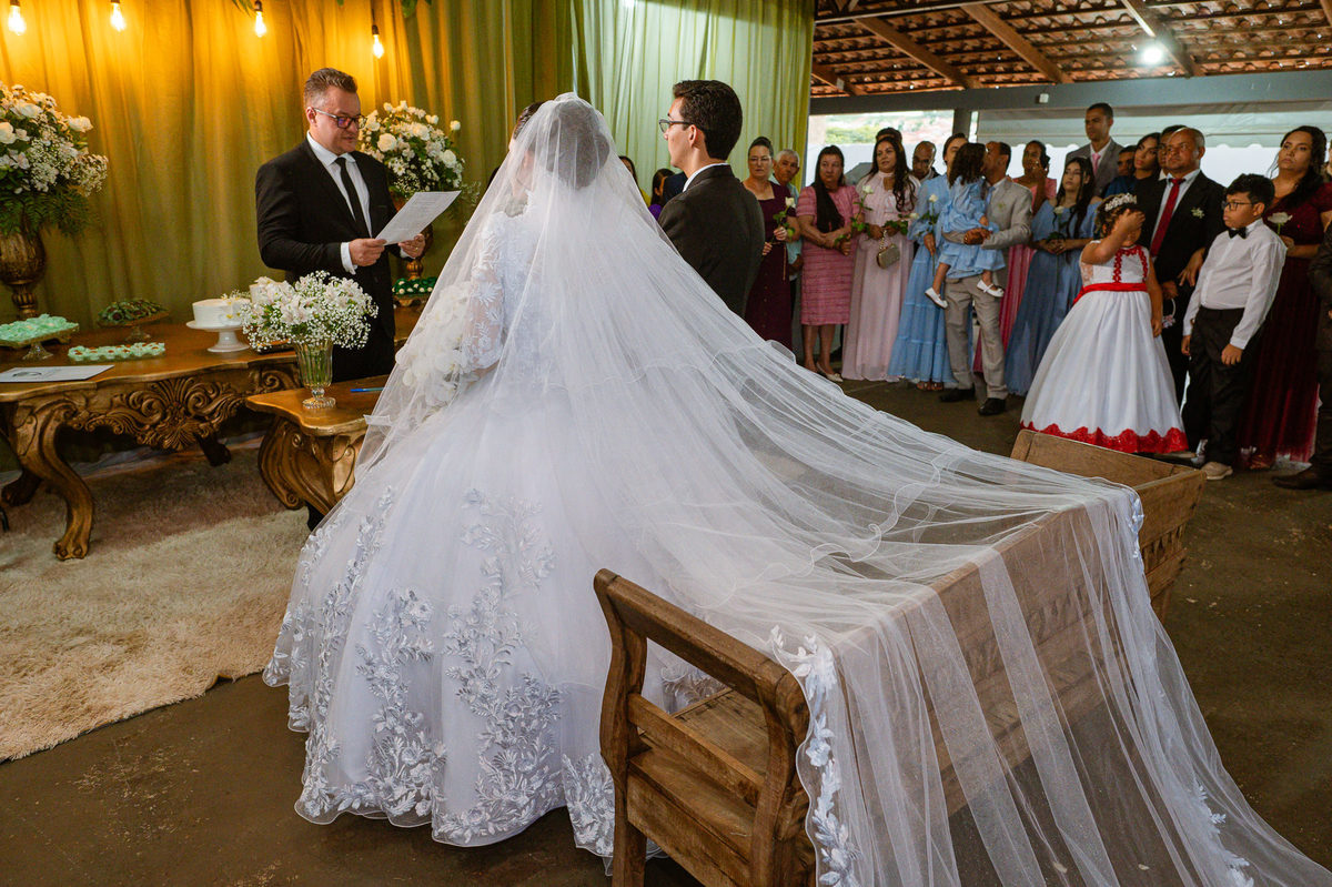 Foi um momento muito forte. Todos acompanhavam com muita felicidade. A juíza os recebeu e iniciou a celebração do casamento. E mesmo não sendo celebrante, ela nos trouxe uma palavra muito cativante. Parabenizou os dois pela atitude e destacou a importância do casamento nos dias atuais. Posteriormente, confirmou os votos de casamento dos dois que prontamente afirmaram em alto e bom som. Depois, as alianças foram trazidas por um casal de pajens que trouxe mais leveza ainda para esse momento. Adriel e Eduarda trocaram as alianças e prometeram amor e fidelidade um ao outro para sempre, fechando aquele instante com um beijo da aliança um do outro. Por fim, eles foram declarados casados e prosseguimos com a assinatura dos documentos.