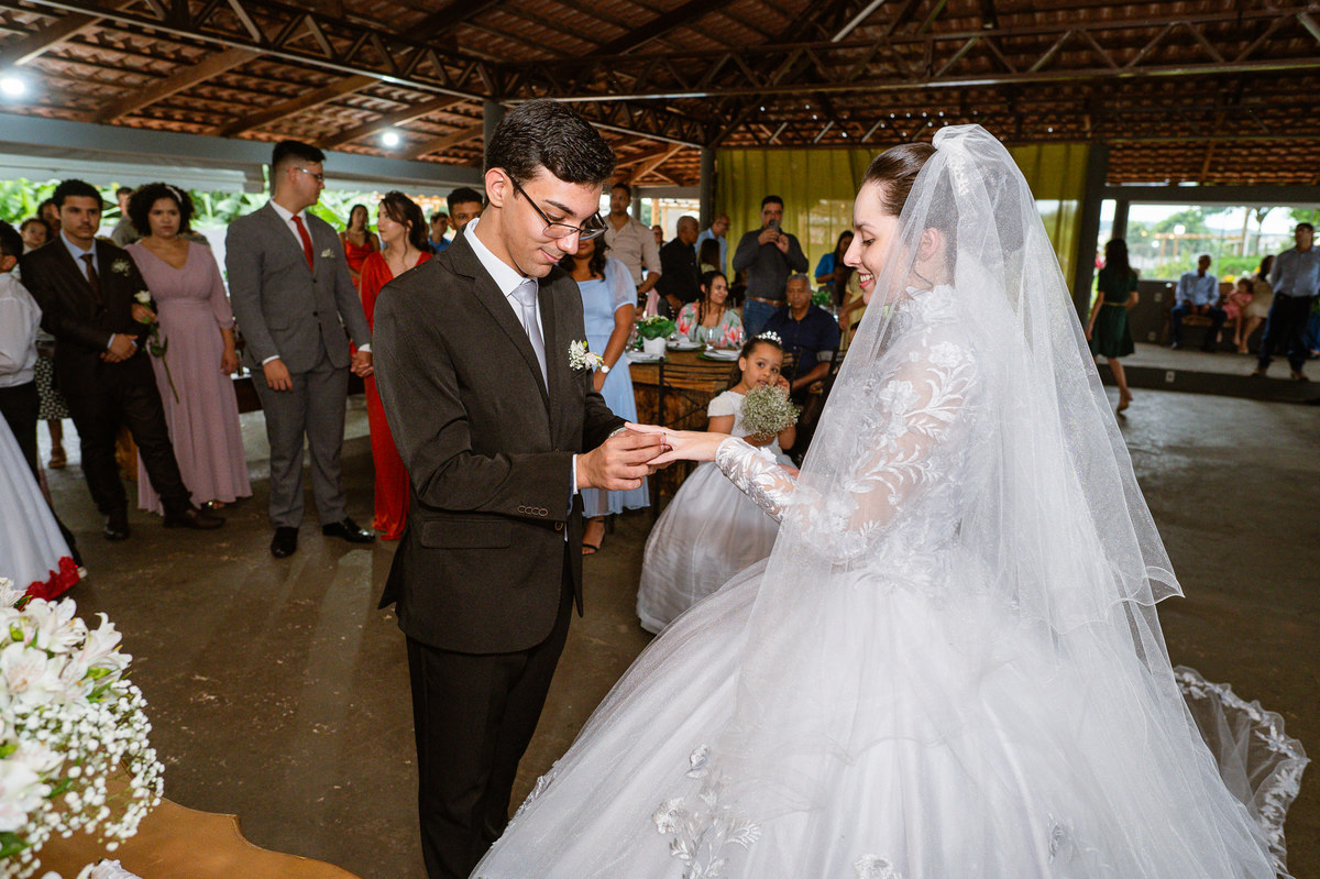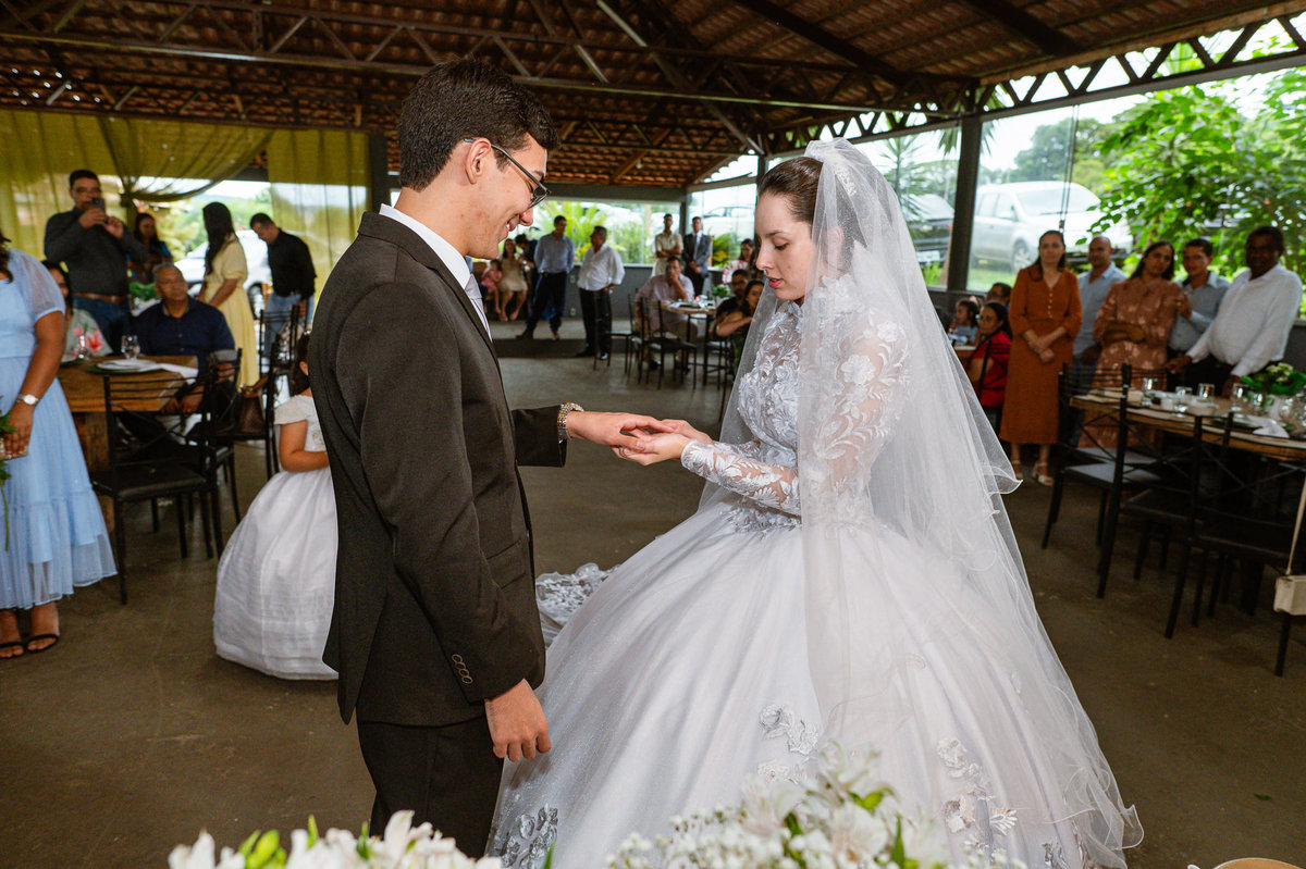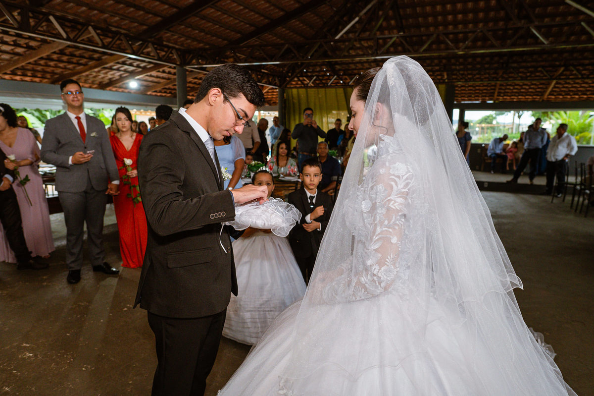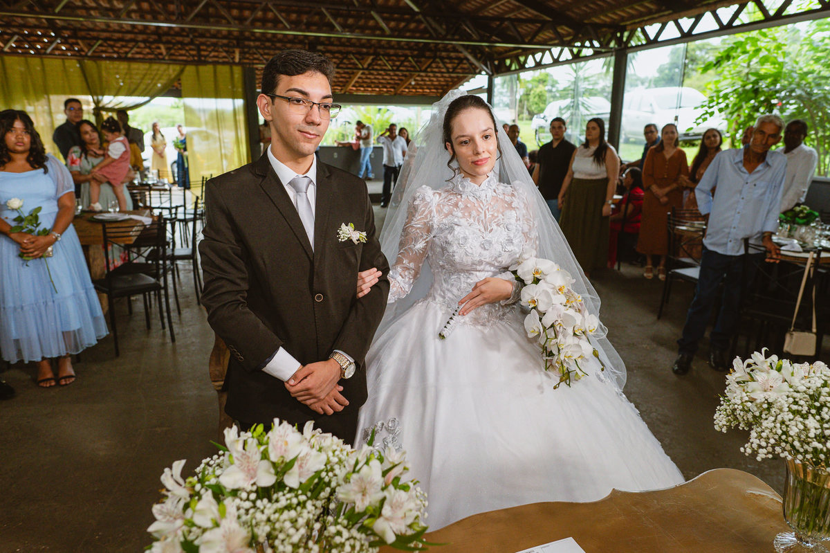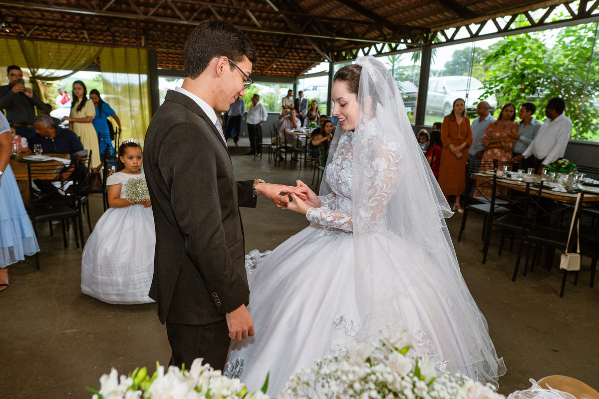 Foi um momento muito forte. Todos acompanhavam com muita felicidade. A juíza os recebeu e iniciou a celebração do casamento. E mesmo não sendo celebrante, ela nos trouxe uma palavra muito cativante. Parabenizou os dois pela atitude e destacou a importância do casamento nos dias atuais. Posteriormente, confirmou os votos de casamento dos dois que prontamente afirmaram em alto e bom som. Depois, as alianças foram trazidas por um casal de pajens que trouxe mais leveza ainda para esse momento. Adriel e Eduarda trocaram as alianças e prometeram amor e fidelidade um ao outro para sempre, fechando aquele instante com um beijo da aliança um do outro. Por fim, eles foram declarados casados e prosseguimos com a assinatura dos documentos.