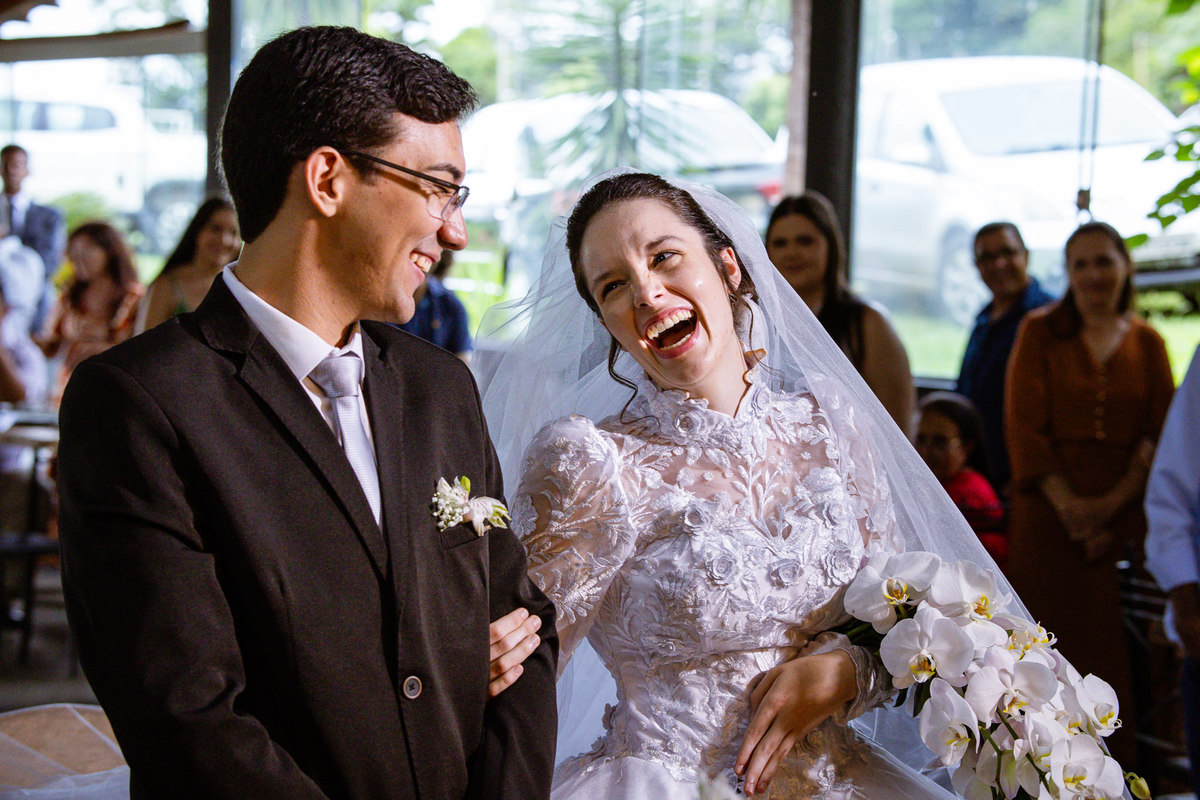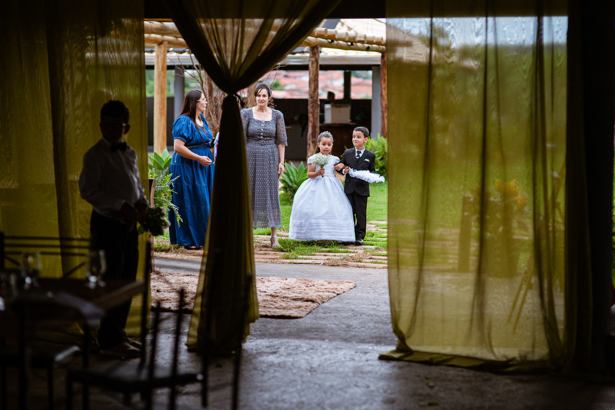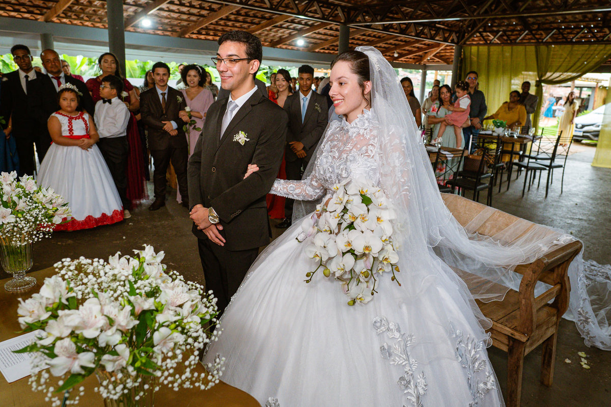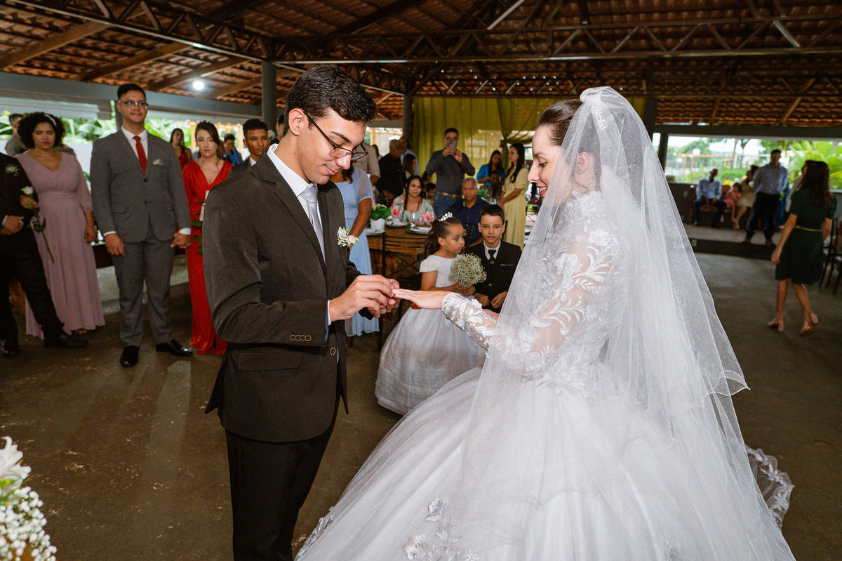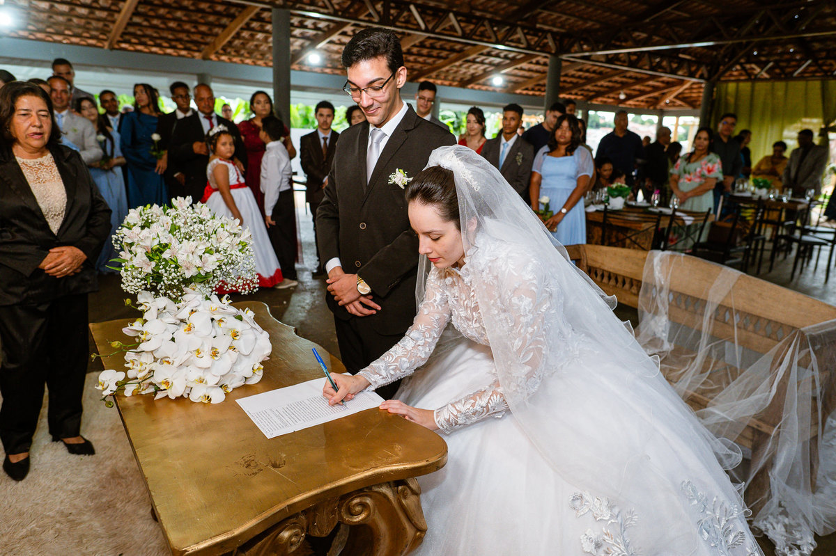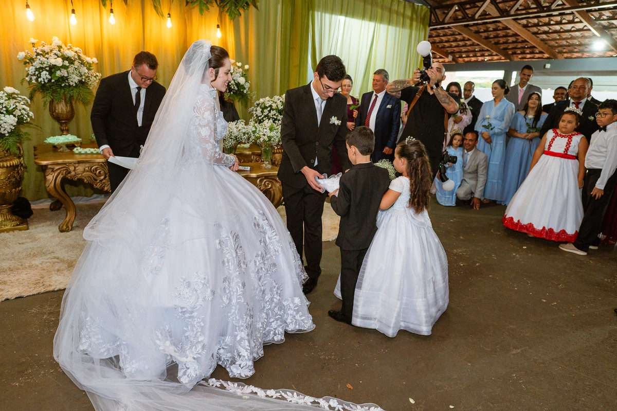 Foi um momento muito forte. Todos acompanhavam com muita felicidade. A juíza os recebeu e iniciou a celebração do casamento. E mesmo não sendo celebrante, ela nos trouxe uma palavra muito cativante. Parabenizou os dois pela atitude e destacou a importância do casamento nos dias atuais. Posteriormente, confirmou os votos de casamento dos dois que prontamente afirmaram em alto e bom som. Depois, as alianças foram trazidas por um casal de pajens que trouxe mais leveza ainda para esse momento. Adriel e Eduarda trocaram as alianças e prometeram amor e fidelidade um ao outro para sempre, fechando aquele instante com um beijo da aliança um do outro. Por fim, eles foram declarados casados e prosseguimos com a assinatura dos documentos.