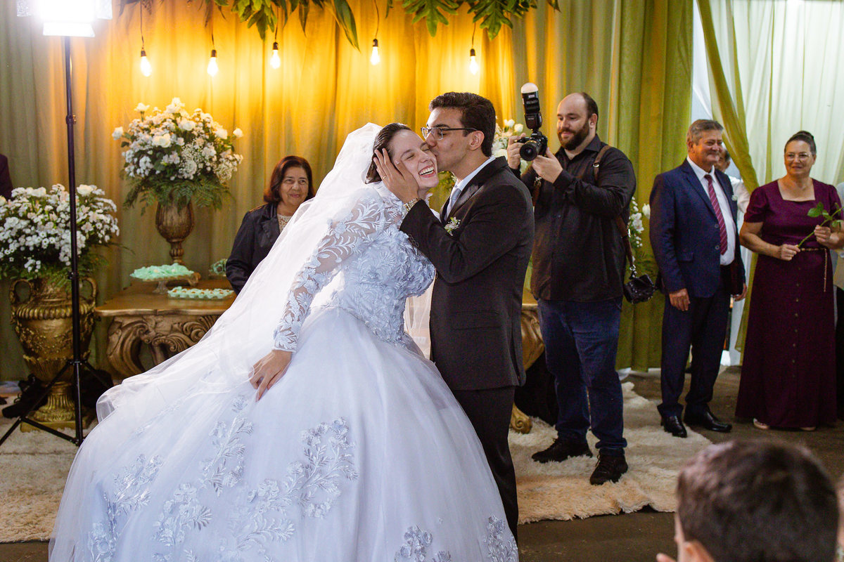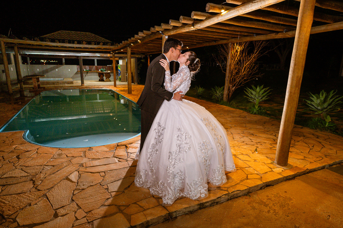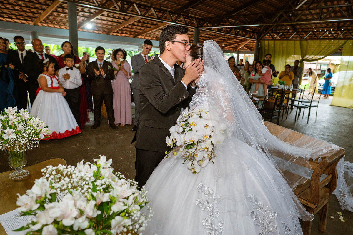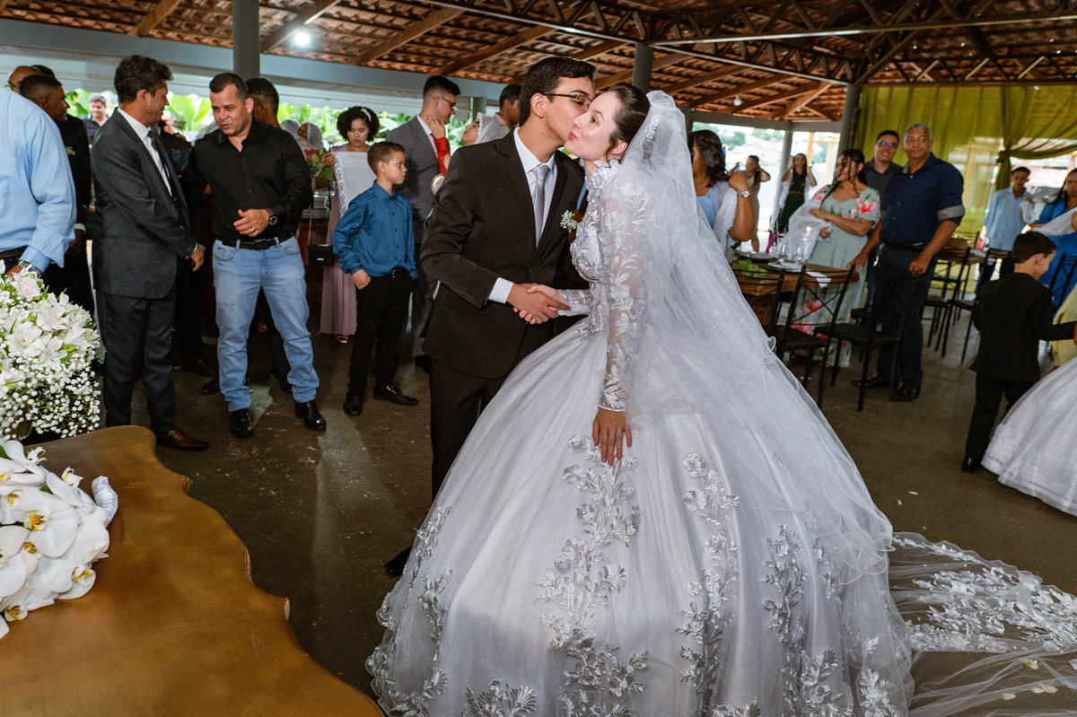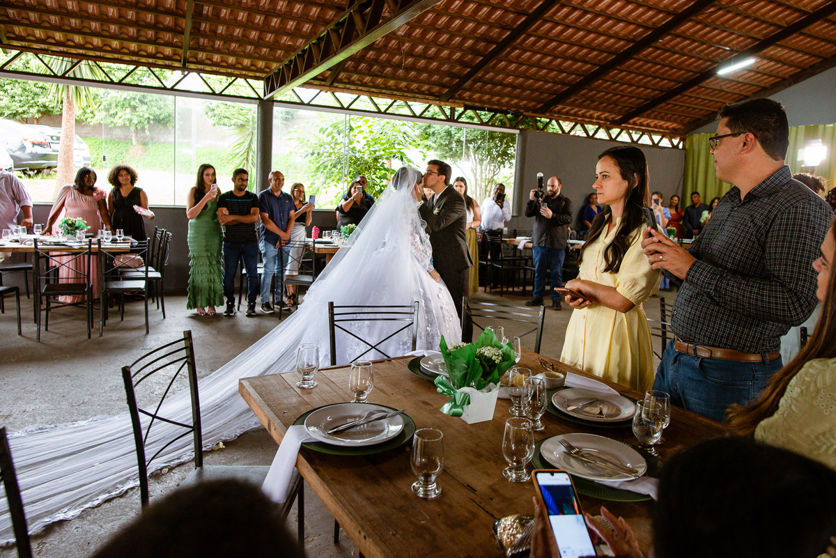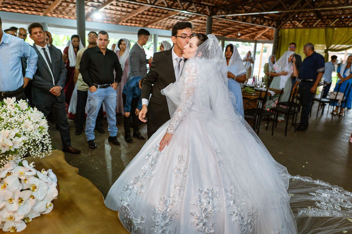 Até esse momento, o casal não havia se beijado, desde que se conheceram até o momento do casamento. Esse era um voto dos dois até aquele momento. Depois de fazermos todas as nossas fotos, bem no finalzinho do casamento, Eduarda me pediu que registrasse esse feito. Eles decidiram que ali seria realizado o primeiro beijo do casal. Mesmo acanhados com a presença dos pais na festa, olhando de longe, eles finalmente deram seu primeiro beijo depois de tantos anos de espera e comprometimento. Cada casal tem suas particularidade e nos dias atuais um ato como esse é quase inacreditável, mas pela fé e compromisso dos dois, eles conseguiram realizar e só se beijaram no final da festa, conforme seus corações quiseram. Assim, nós encerramos nossa participação no casamento dos dois e nos despedimos com a certeza de ter realizado um trabalho muito dedicado e com o coração em cada fotografia registrada.