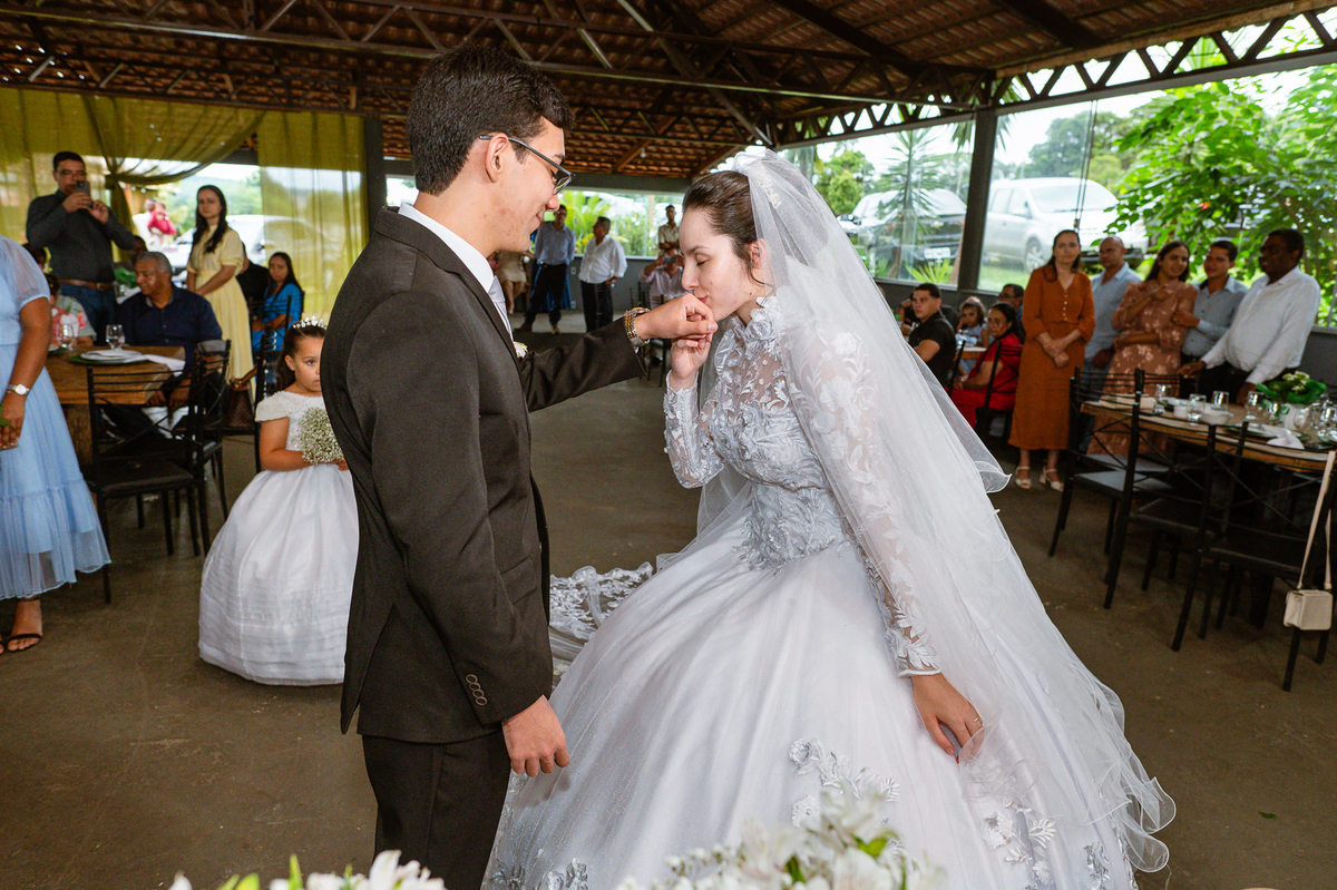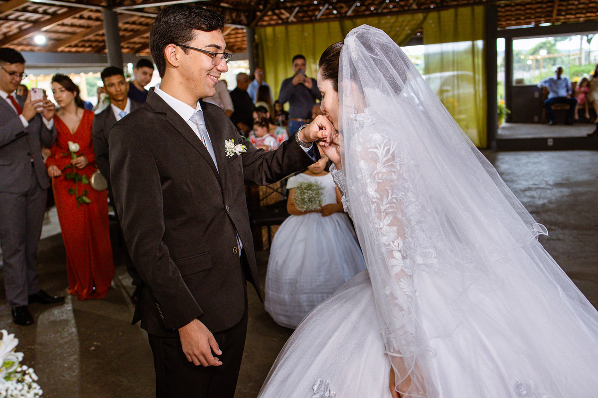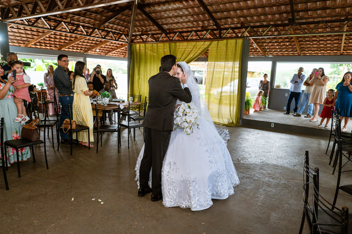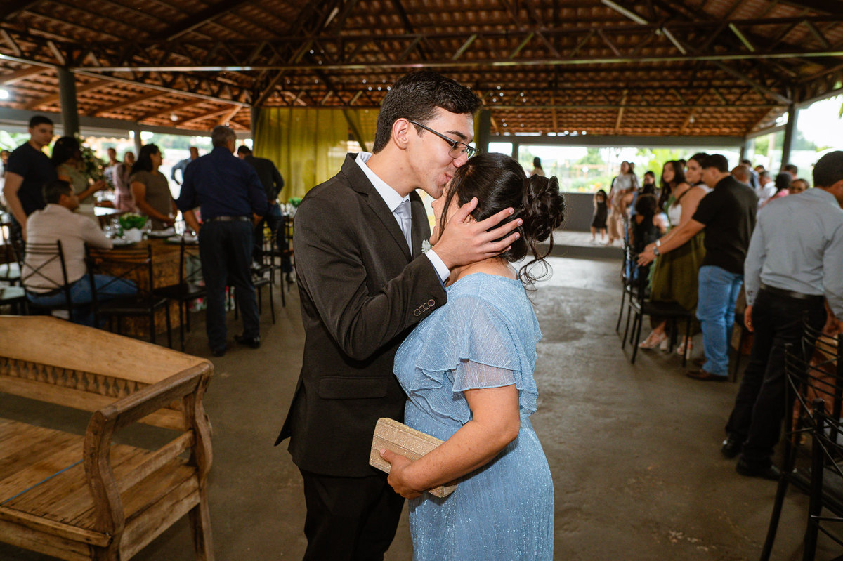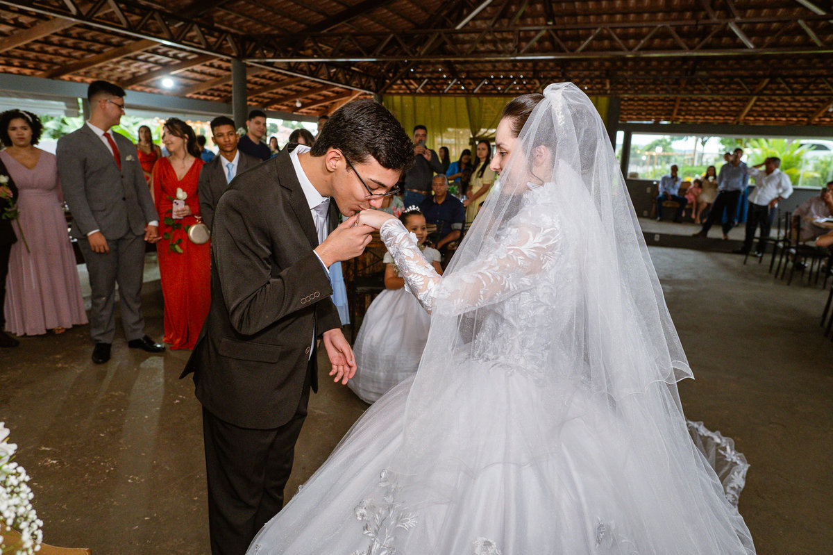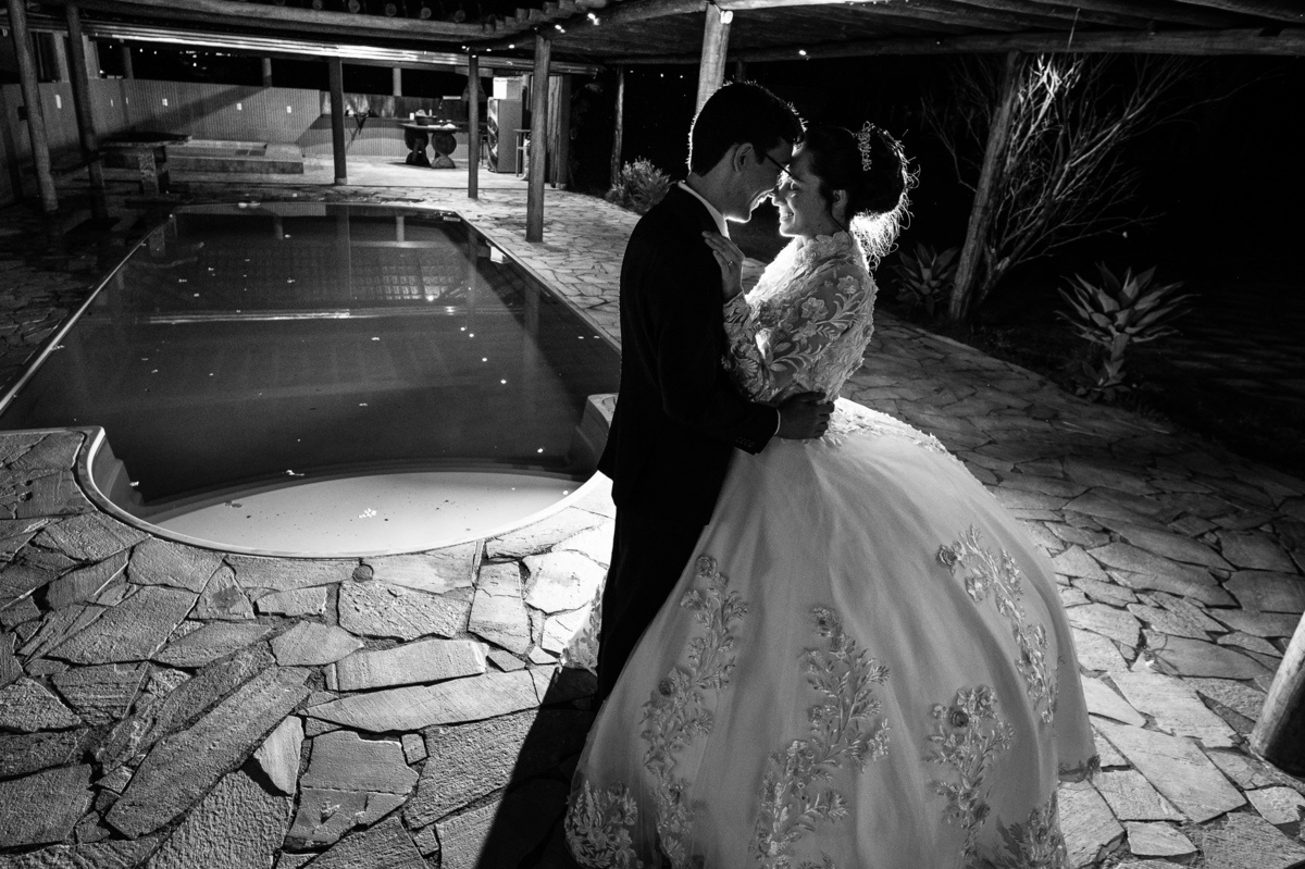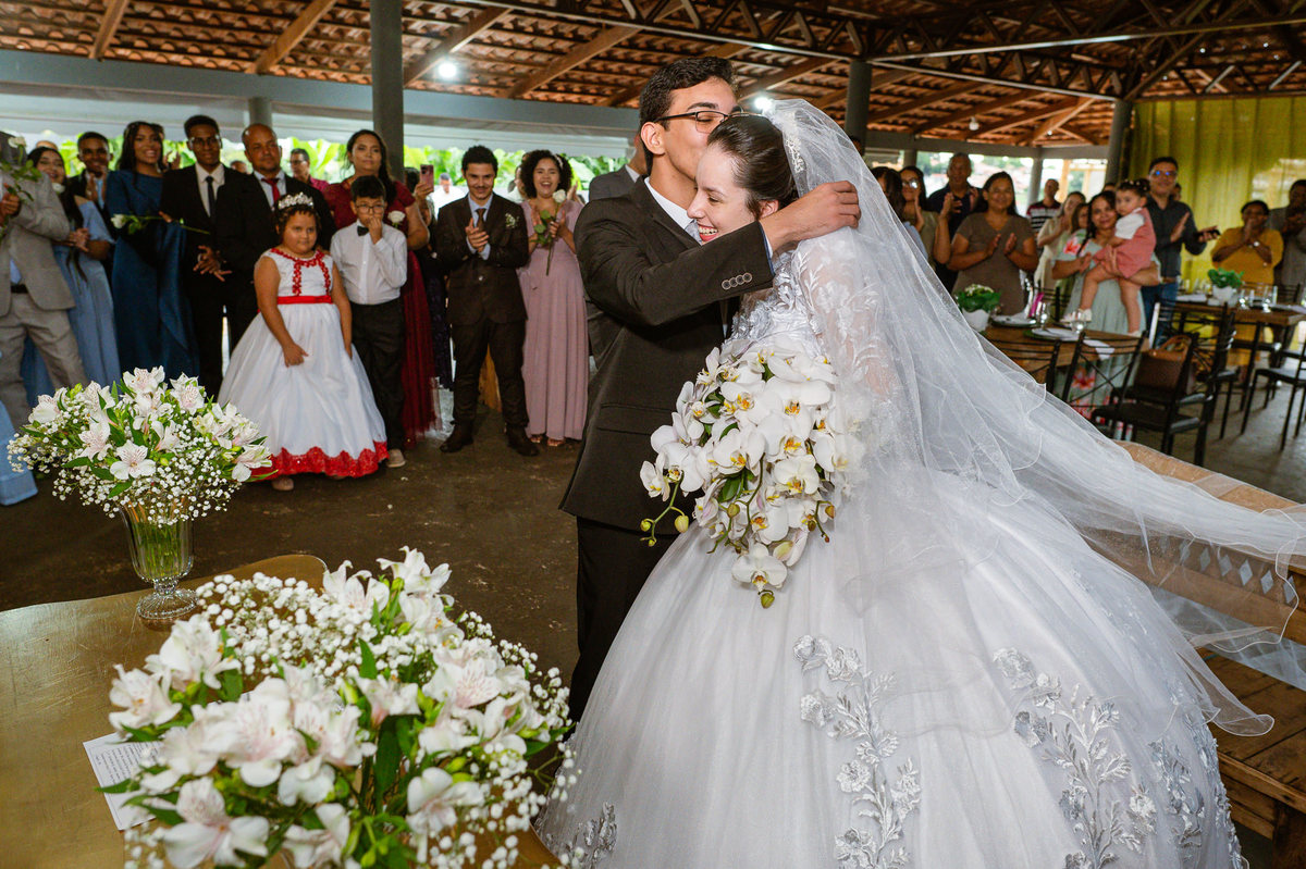 Até esse momento, o casal não havia se beijado, desde que se conheceram até o momento do casamento. Esse era um voto dos dois até aquele momento. Depois de fazermos todas as nossas fotos, bem no finalzinho do casamento, Eduarda me pediu que registrasse esse feito. Eles decidiram que ali seria realizado o primeiro beijo do casal. Mesmo acanhados com a presença dos pais na festa, olhando de longe, eles finalmente deram seu primeiro beijo depois de tantos anos de espera e comprometimento. Cada casal tem suas particularidade e nos dias atuais um ato como esse é quase inacreditável, mas pela fé e compromisso dos dois, eles conseguiram realizar e só se beijaram no final da festa, conforme seus corações quiseram. Assim, nós encerramos nossa participação no casamento dos dois e nos despedimos com a certeza de ter realizado um trabalho muito dedicado e com o coração em cada fotografia registrada.