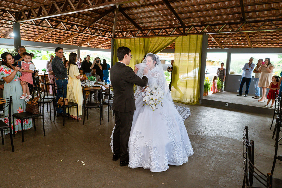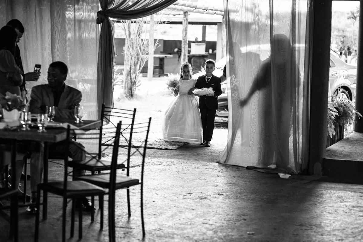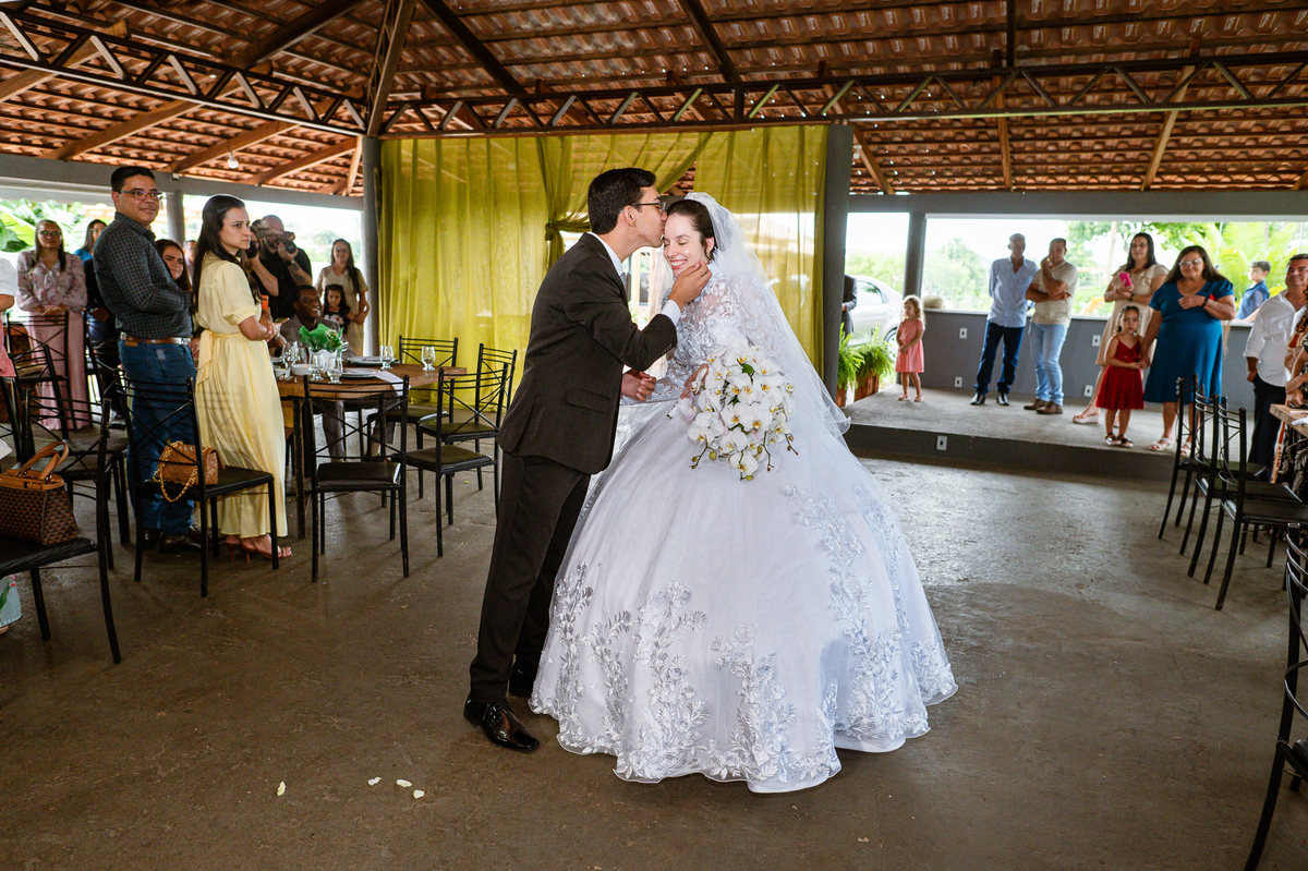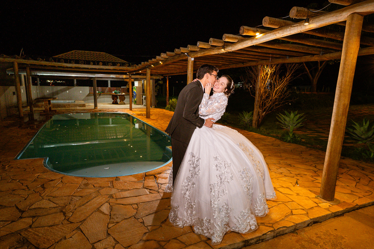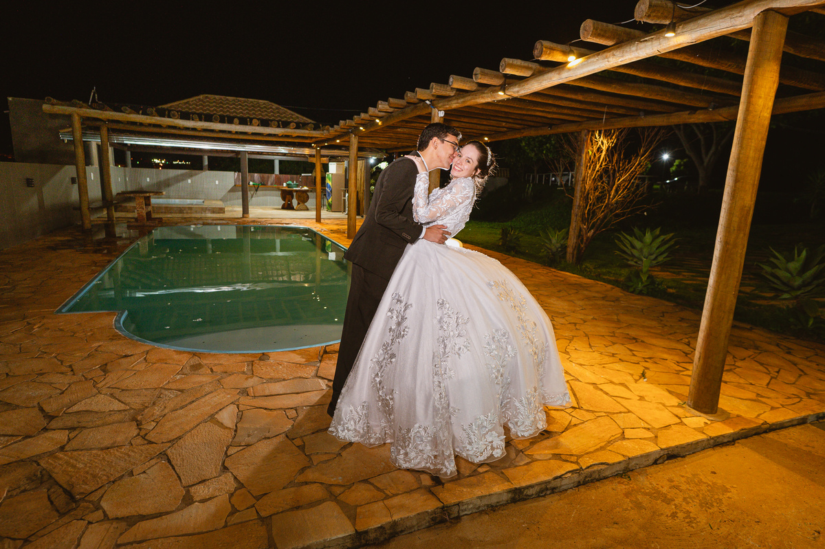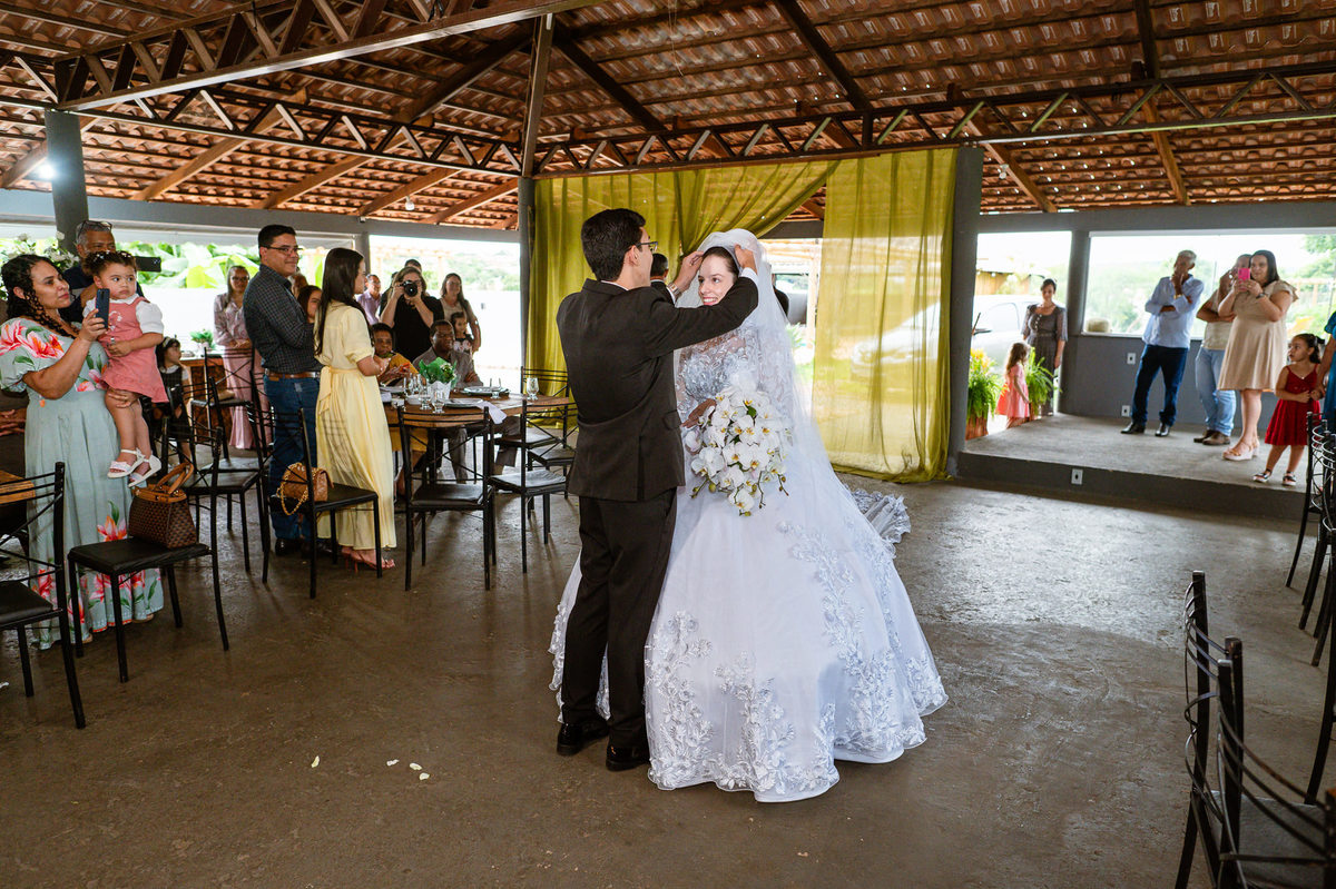 Até esse momento, o casal não havia se beijado, desde que se conheceram até o momento do casamento. Esse era um voto dos dois até aquele momento. Depois de fazermos todas as nossas fotos, bem no finalzinho do casamento, Eduarda me pediu que registrasse esse feito. Eles decidiram que ali seria realizado o primeiro beijo do casal. Mesmo acanhados com a presença dos pais na festa, olhando de longe, eles finalmente deram seu primeiro beijo depois de tantos anos de espera e comprometimento. Cada casal tem suas particularidade e nos dias atuais um ato como esse é quase inacreditável, mas pela fé e compromisso dos dois, eles conseguiram realizar e só se beijaram no final da festa, conforme seus corações quiseram. Assim, nós encerramos nossa participação no casamento dos dois e nos despedimos com a certeza de ter realizado um trabalho muito dedicado e com o coração em cada fotografia registrada.