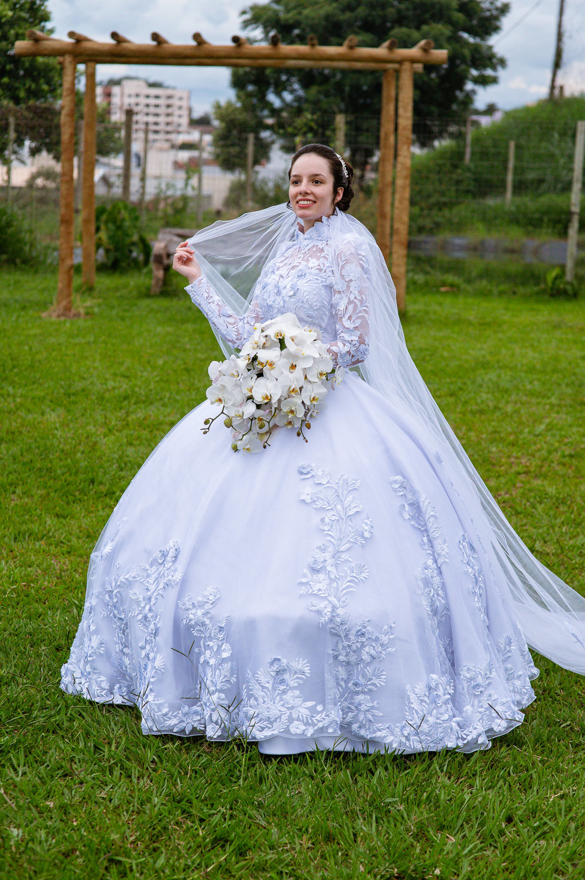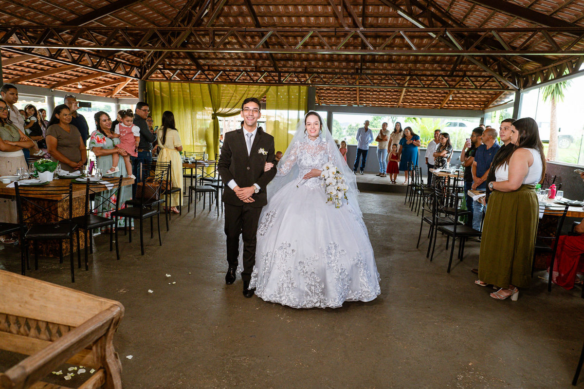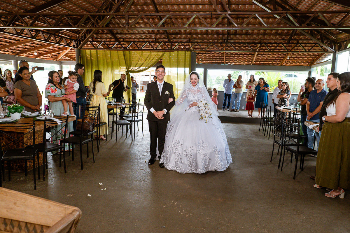 Poucos segundos depois, as cortinas foram abertas e Eduarda adentrou o salão de braços dados com seu pai. Os olhos de todos se voltaram para ela que estava deslumbrante. Adriel se virou para ver toda formosura de sua noiva. Ele mal podia acreditar no que seus olhos contemplavam. Com um sorriso de júbilo, era possível ver seus olhos brilhando como nunca antes. Poucos passos os separavam agora. Eduarda caminhou com seu pai e despedindo-se ele com um forte abraço, recebeu a presença de seu querido noivo. Adriel cumprimentou carinhosamente seu sogro e recebeu a mão de sua amada com todo carinho. Eduarda, ainda com o véu cobrindo sua face, recebeu seu noivo diante de todos. Adriel beijou a mão dela, cuidadosamente retirou o véu da face de sua noiva e com um beijo respeitoso em sua fronte ele selou aquele momento para sempre. Agora juntos, os dois caminharam rumo ao altar para receberem um ao outro diante do juiz de paz.