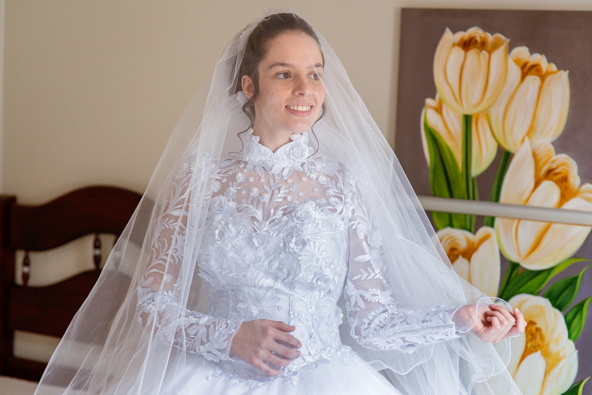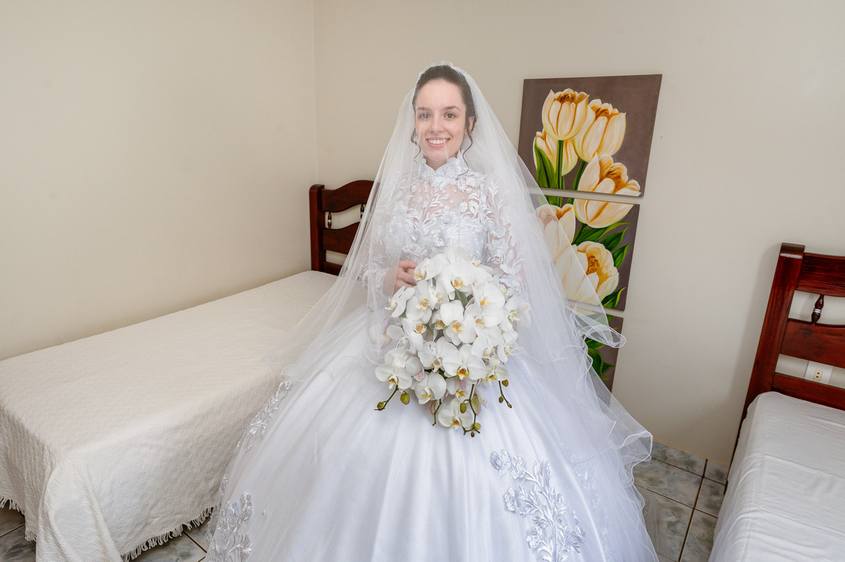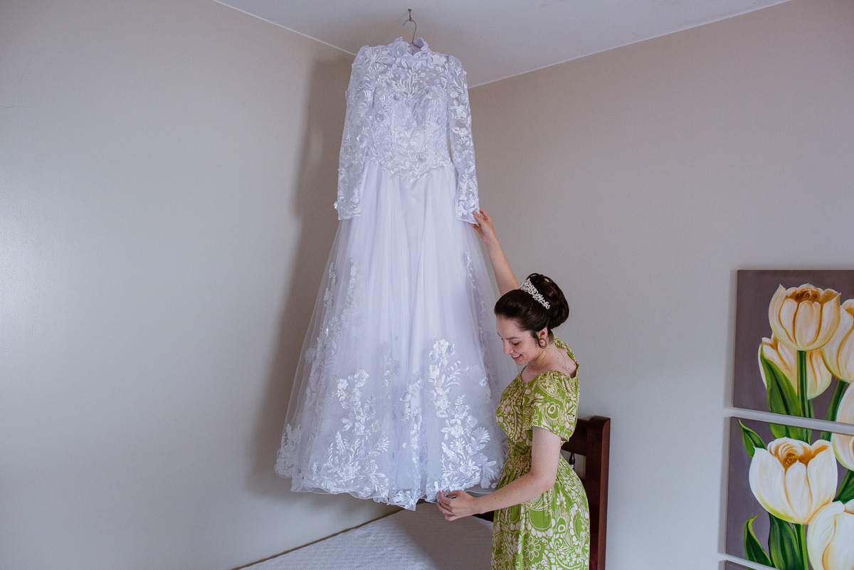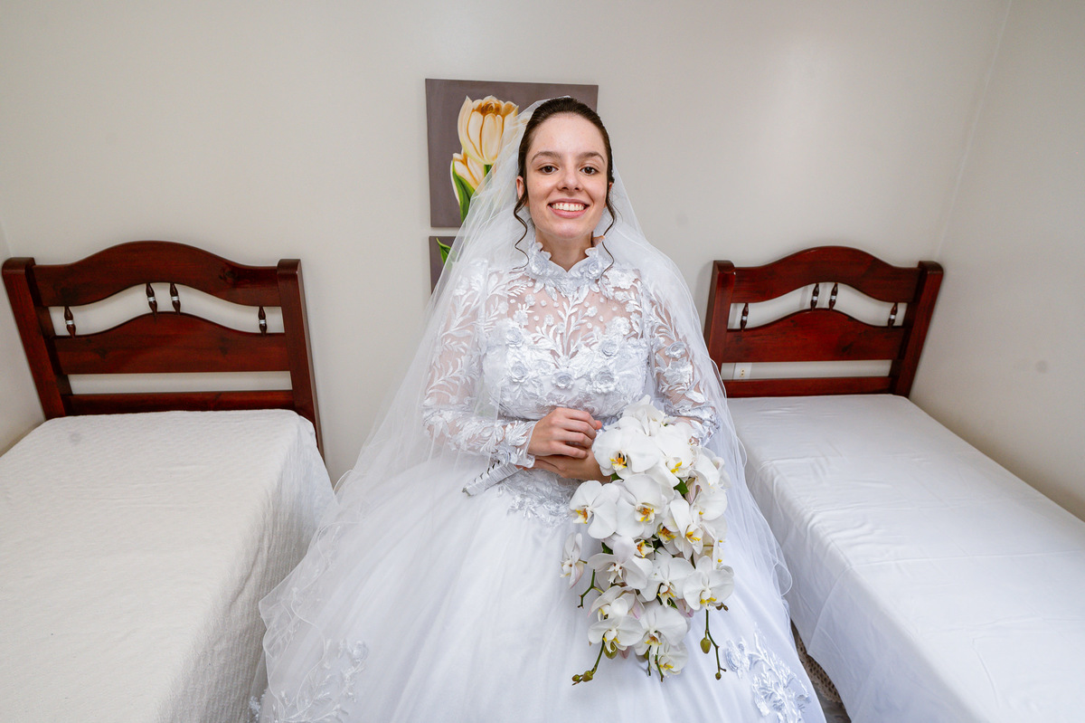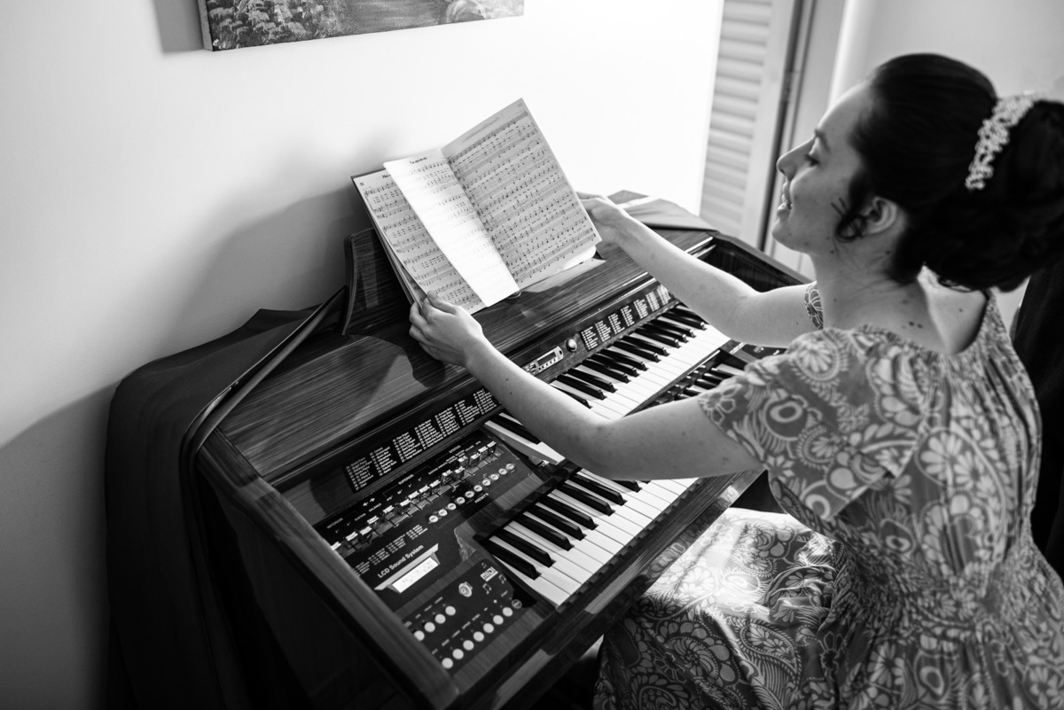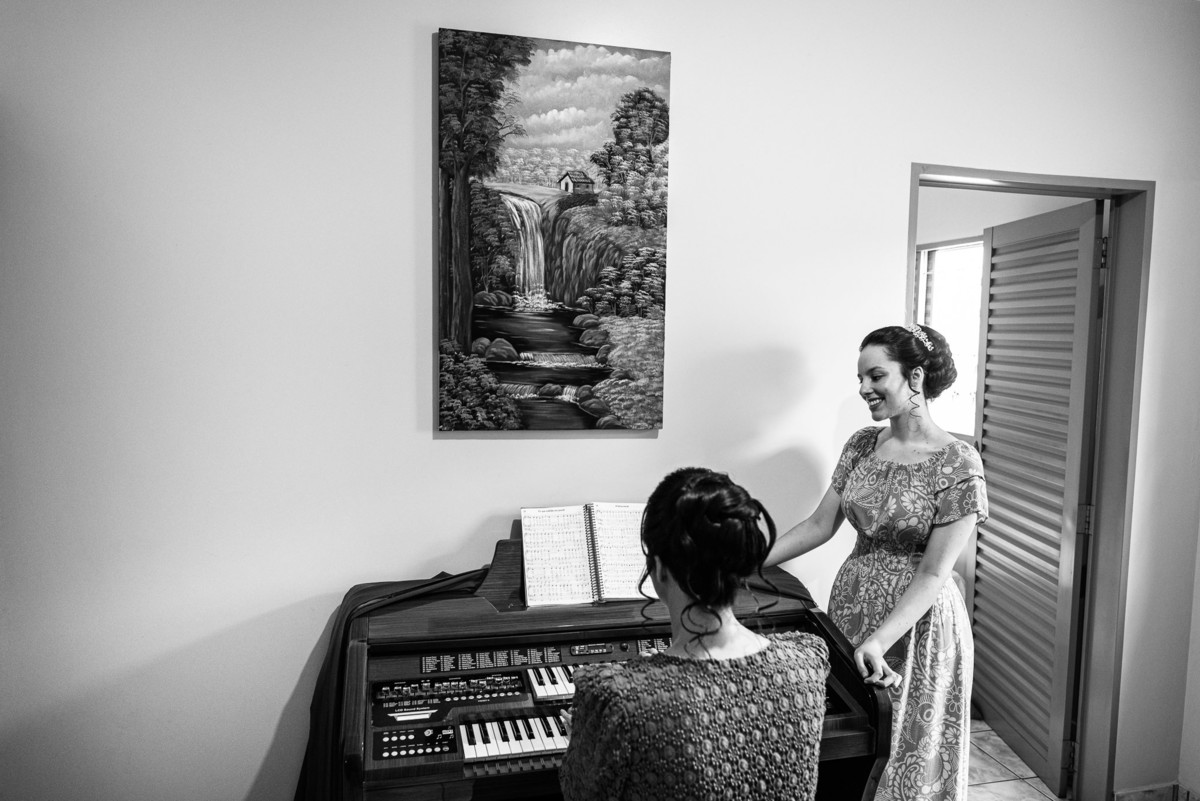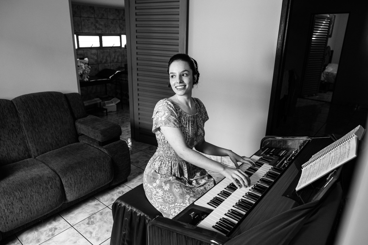 Me lembro de que nesse mesmo dia, Eduarda entrou em contato comigo me perguntando se haveria problemas em ela realizar seu dia de noiva em casa. Prontamente, disse à ela que não teria problema algum e que eu sempre indico para que as noivas façam seu dia de acordo com seu sonho, onde esse lugar for. Assim, alteramos o roteiro e partimos para a casa dela. O dia estava radiante e ao chegar lá encontramos uma noivinha muito feliz e animada com seu dia. Ela havia preparado todos os detalhes que gostaria que fotografássemos e também com as pessoas especiais que ela gostaria que participassem. Então, mais que depressa iniciamos o making of por lá. Ao adentrar pela casa, nos deparamos com um órgão digital lindíssimo bem na sala. Perguntei para ela o que seria aquele instrumento e quem sabia tocar. Nessa hora os olhinhos dela mais que brilharam. Ela nos contou que ensina os membros da Igreja que ela faz parte a tocarem e que aprendeu tudo desde muito pequena, ensinamentos vindos de sua mãe.