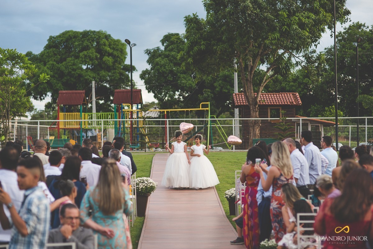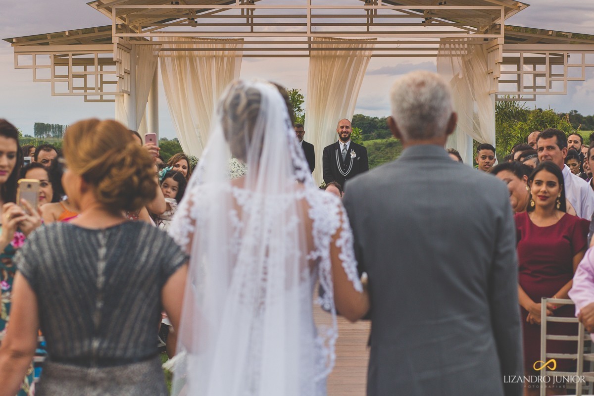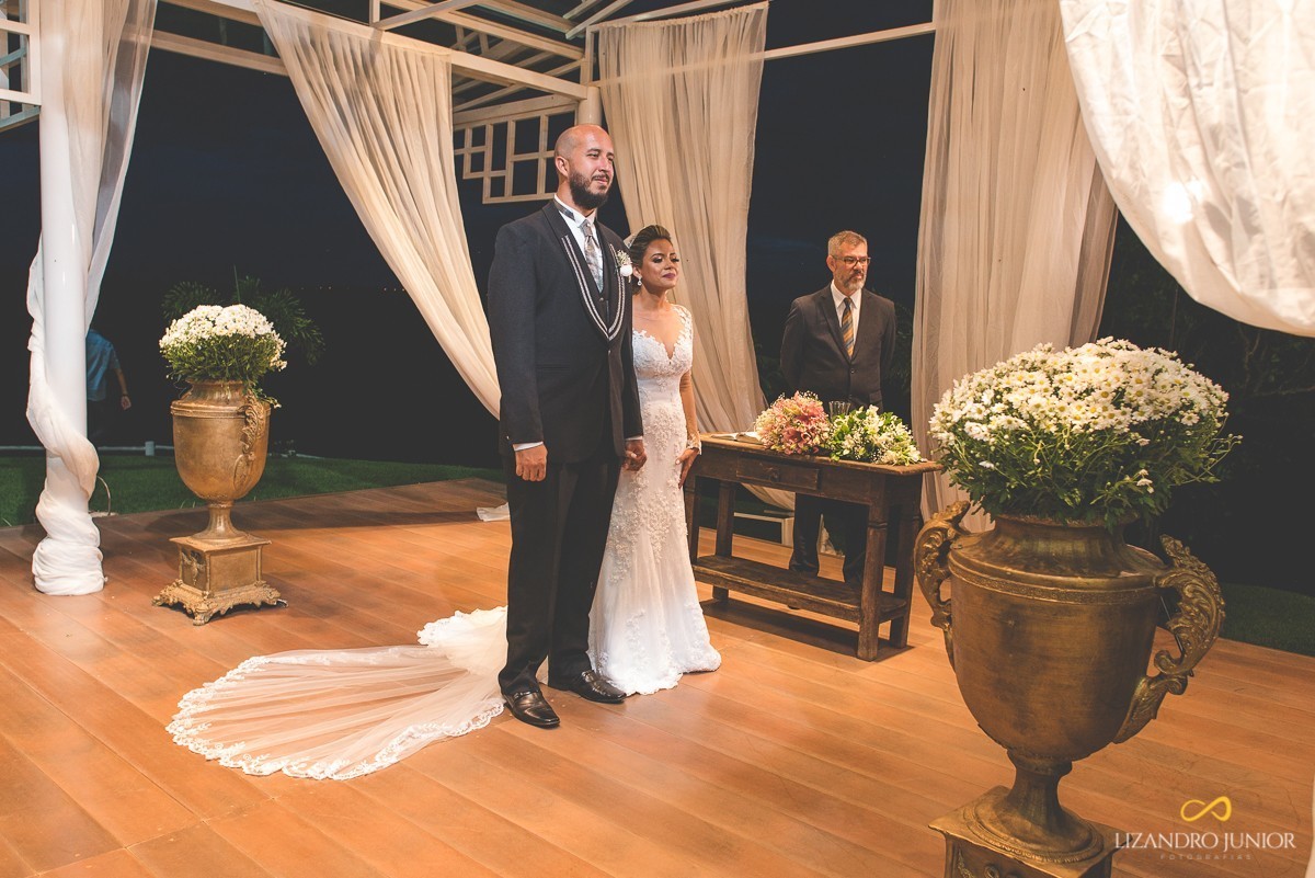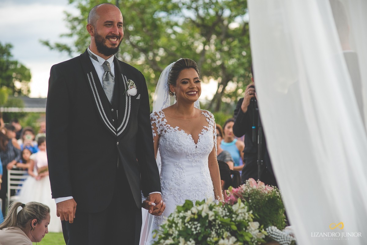 Os noivos escolheram o sítio Tõe do Jó, que está sendo um dos mais belos locais para casamentos ao ar livre. Acertaram em cheio na escolha. A luz, o local e a decoração estavam impecáveis. Os convidados aguardavam ansiosos pela chegada da noiva. Assim que o casamento começou, as crianças deram o ar da graça e fizeram suas entradas maravilhosamente. Lívia apareceu no corredor de mãos dadas com seus pais rumo ao altar. Chegando ao noivo, eles se abraçaram emocionados e a noiva surpreendeu com um banquinho - isso mesmo - um banquinho para ficar da mesma altura do noivo! Foi incrível! E enfim, aquele respeitoso beijo na testa e caminharam para a bênção.
