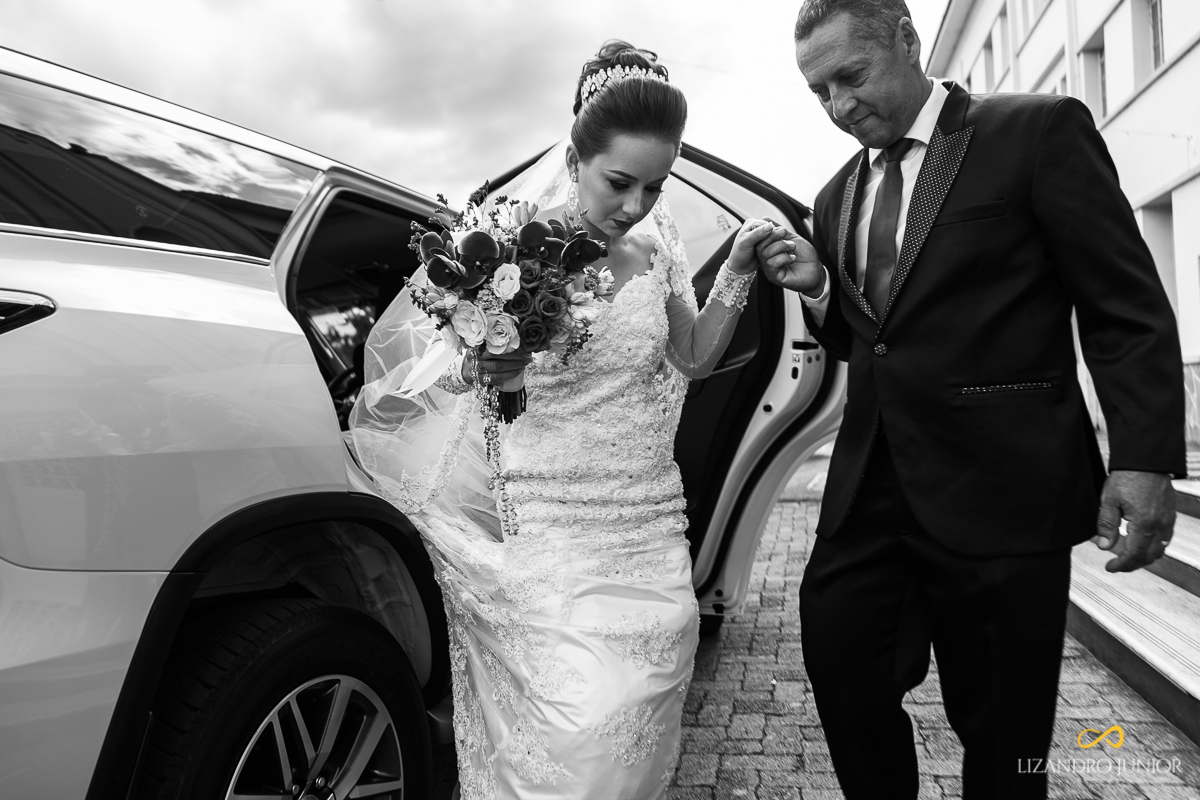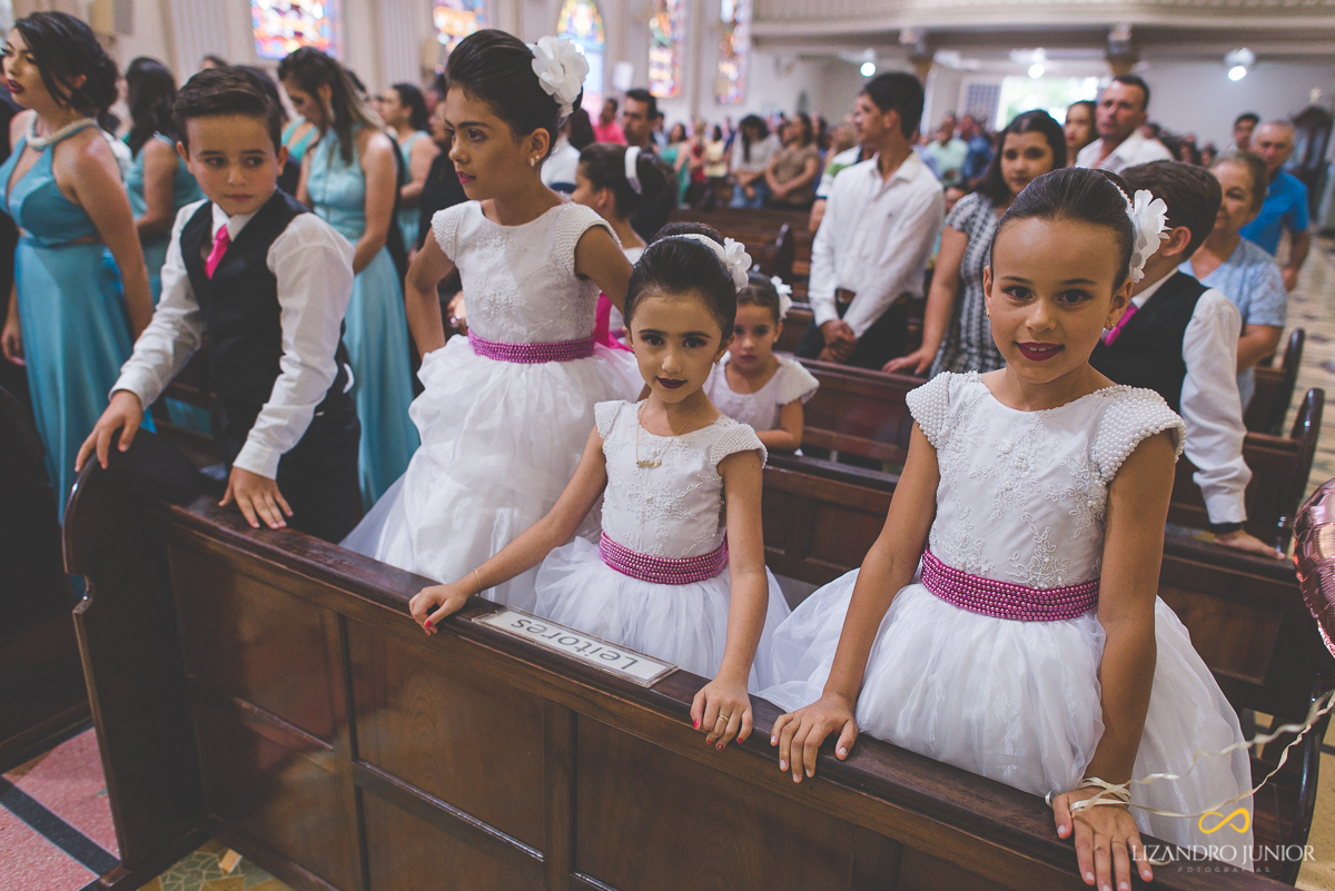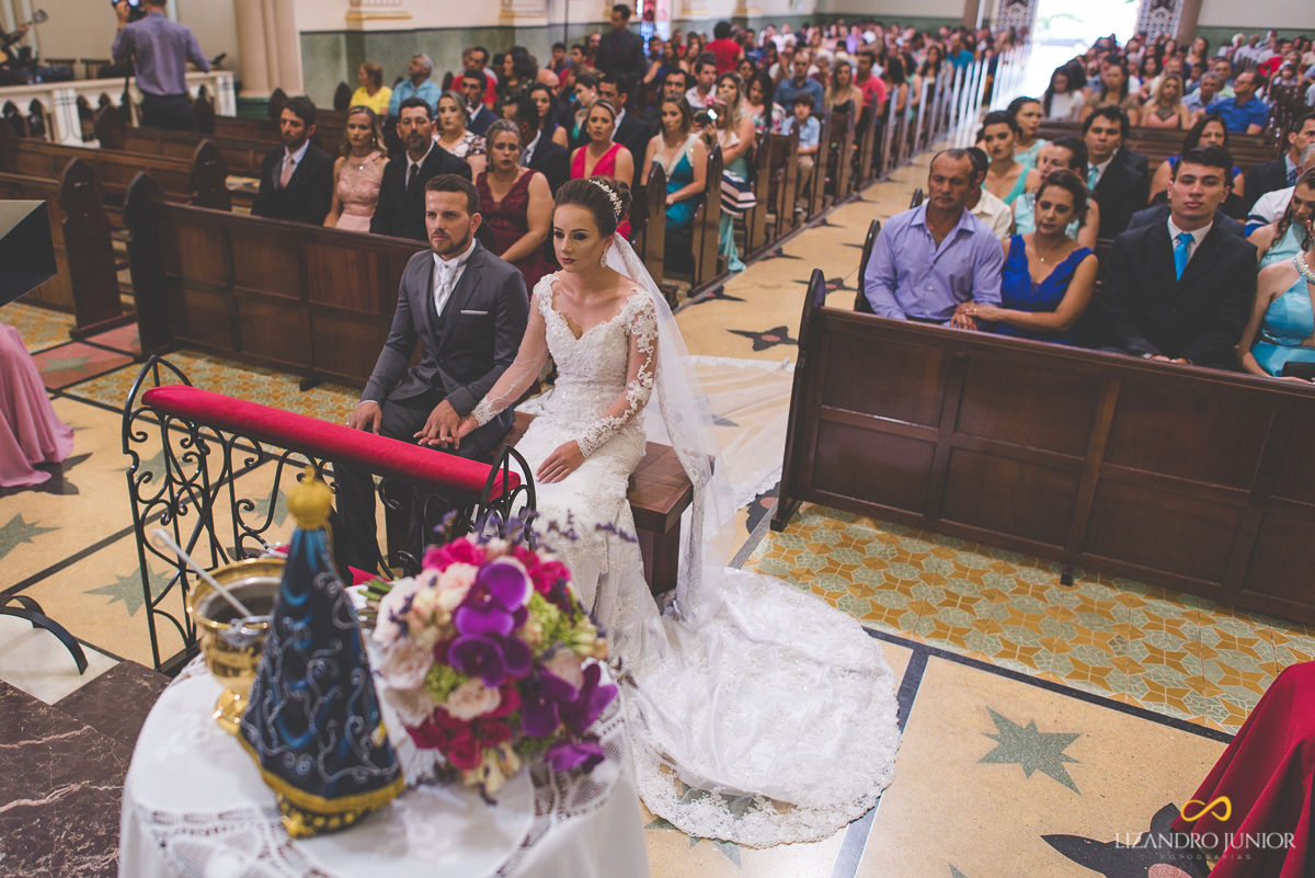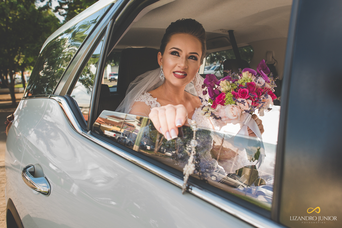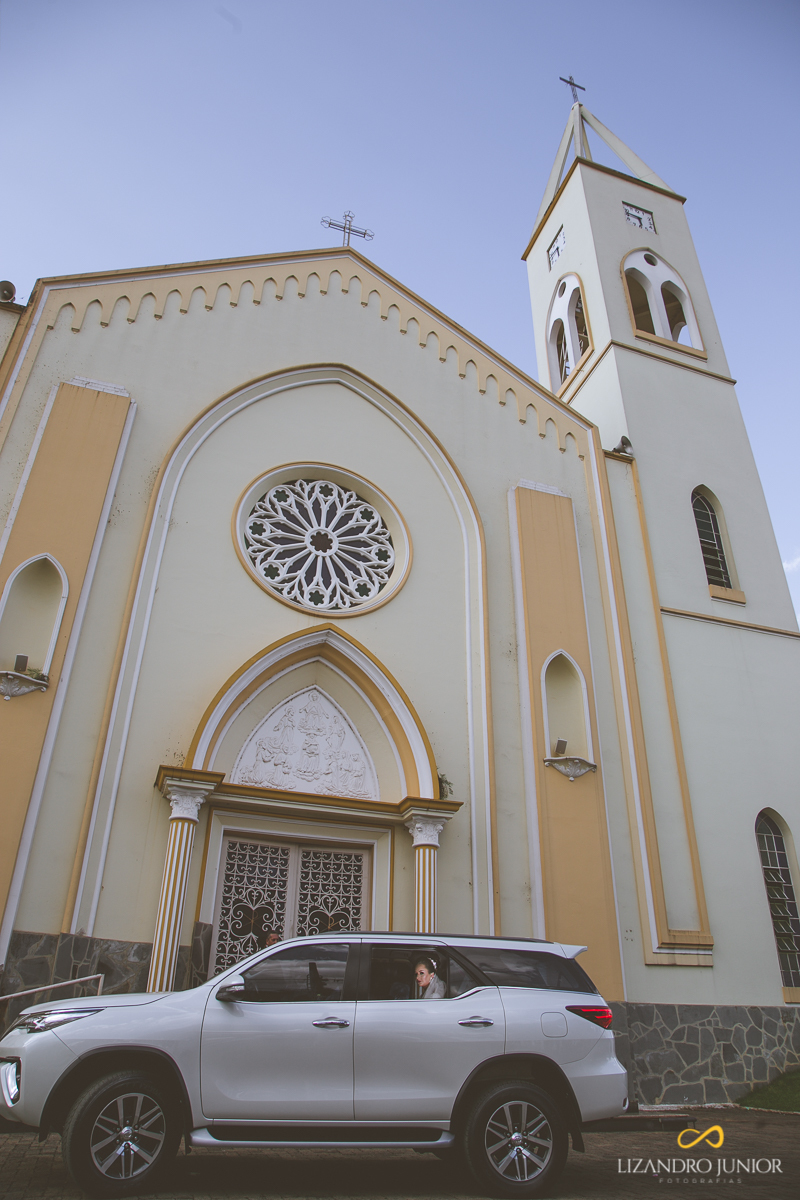 Depois de se prepararem no salão, ambos prontinhos, partimos para a Igreja. Eles escolheram a maravilhosa Igreja dos Capuchinhos, tradicionalíssima em casamentos aqui na cidade de Patos. Sua beleza encantadora, se mistura com a beleza do momento do casamento. E é assim que nasce um evento maravilhoso. No carro, pouco antes de entrar e dizer sim, Ana Carolina assistia à entrada dos padrinhos e pajens ficava sorrindo quase que sem querer.