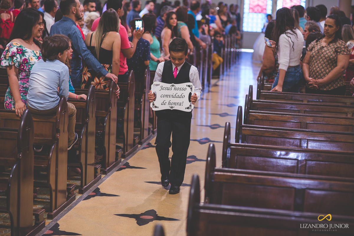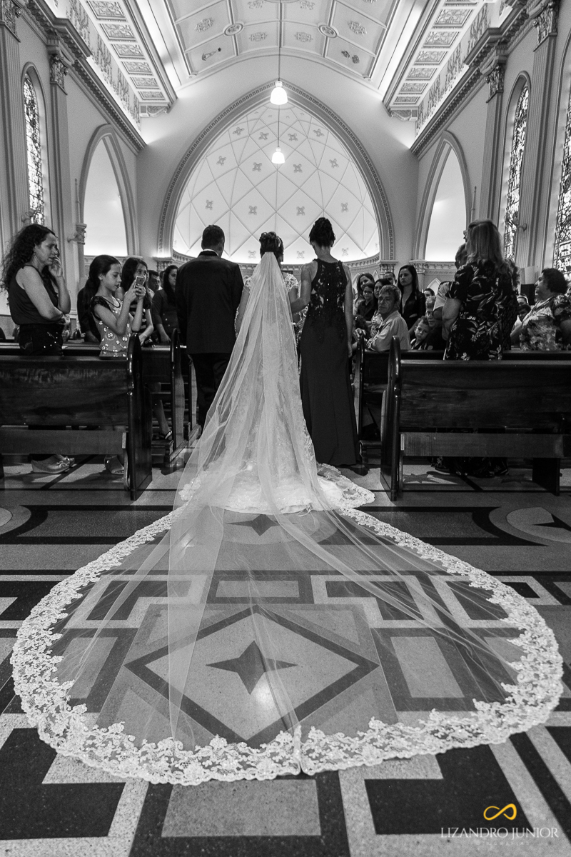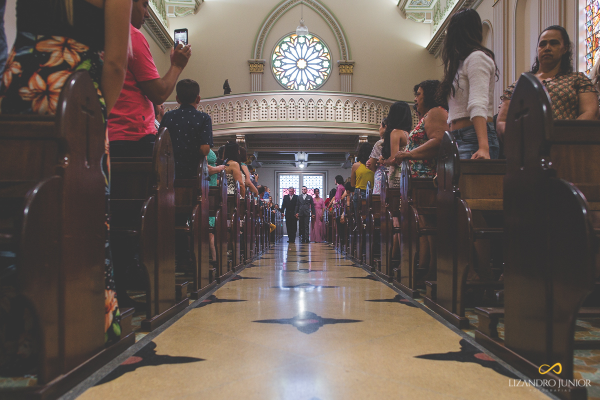 O noivo, de pé no altar, após de despedir dos seus pais, aguardava ansiosamente sua querida e futura esposa adentrar. As portas se fecham, os corações dos convidados e de todos que ali estão ficam disparados aguardando emfim a noiva adentrar. A música escolhida pela noiva para sua entrada foi Ave Maria, de Shubert D, que só de ouvir já arrepia, pensem assistindo a sua futura mulher adentrando a igreja... Muitos convidados e padrinhos olhavam para aquela cena com os olhos cheios d'água. E não era pra menos. De braços dados com seus pais, Ana Carolina fez uma entrada deslumbrante. Com um vestido assinado pela Essencial Noivos, ela estava simplesmente maravilhosa. Afrânio, com aquele sorriso imenso no rosto, mal podia esperar chegar o momento de enfim receber sua noiva.