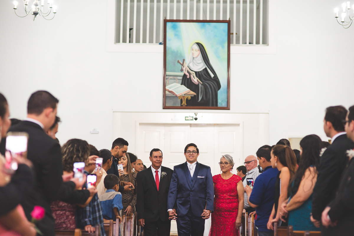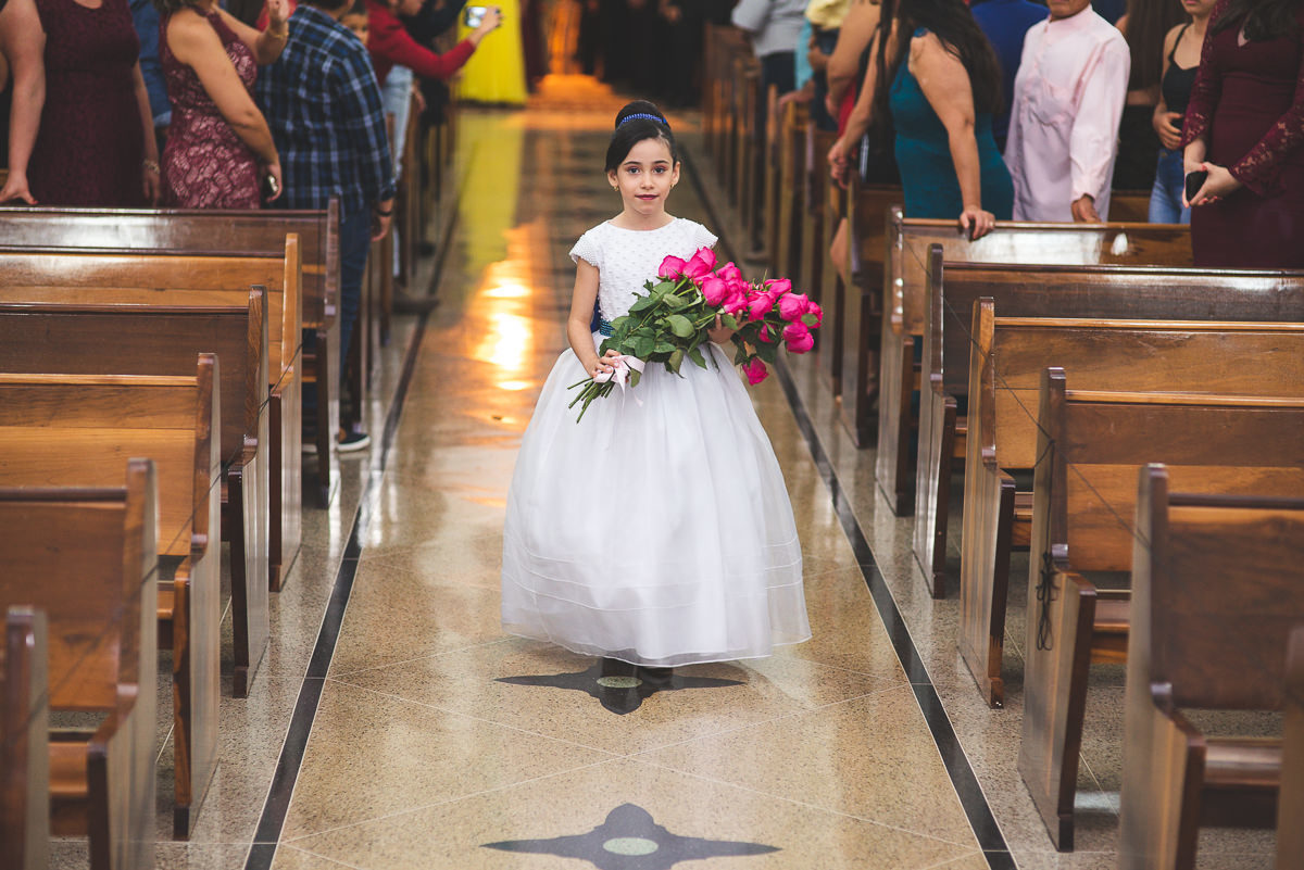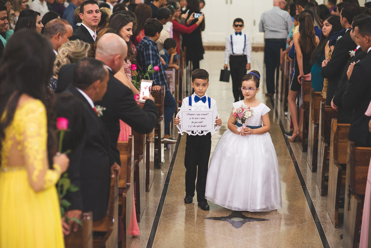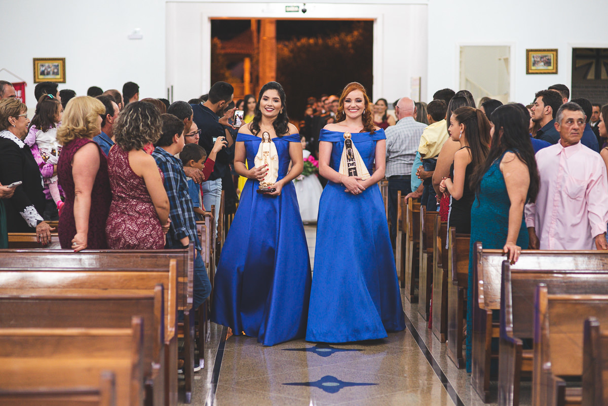 Iniciada a cerimônia, aos cuidados do Cerimonial Magnificat, tudo muito bem organizado e no tempo certo. Padrinhos adentrando, crianças e pajens dando seu show à parte. As mademoiselles que prometeram à noiva que seriam suas damas quando casasse cumpriram sua promessa. E entraram lindamente com seus vestidos azul bic. Elas chamaram a atenção ao entrar com duas santinhas, uma com cada.