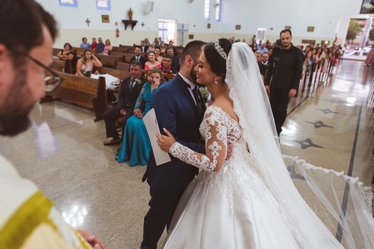 E como não se emocionar vendo uma cena dessas? O amor de sua vida caminhando belíssima ao seu encontro. Cada passo, o sim se aproximava e a certeza de ter escolhido a pessoa certa era mais constante. Coração palpita no peito, a emoção fala mais alto e o sorriso toma conta do rosto de canto a canto. Era chegado o momento do encontro. O beijo respeitoso na mão e na testa, enfim agora, caminhando juntos para o altar.