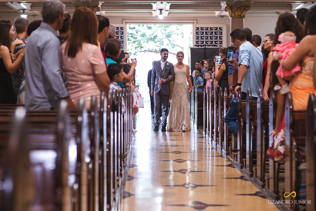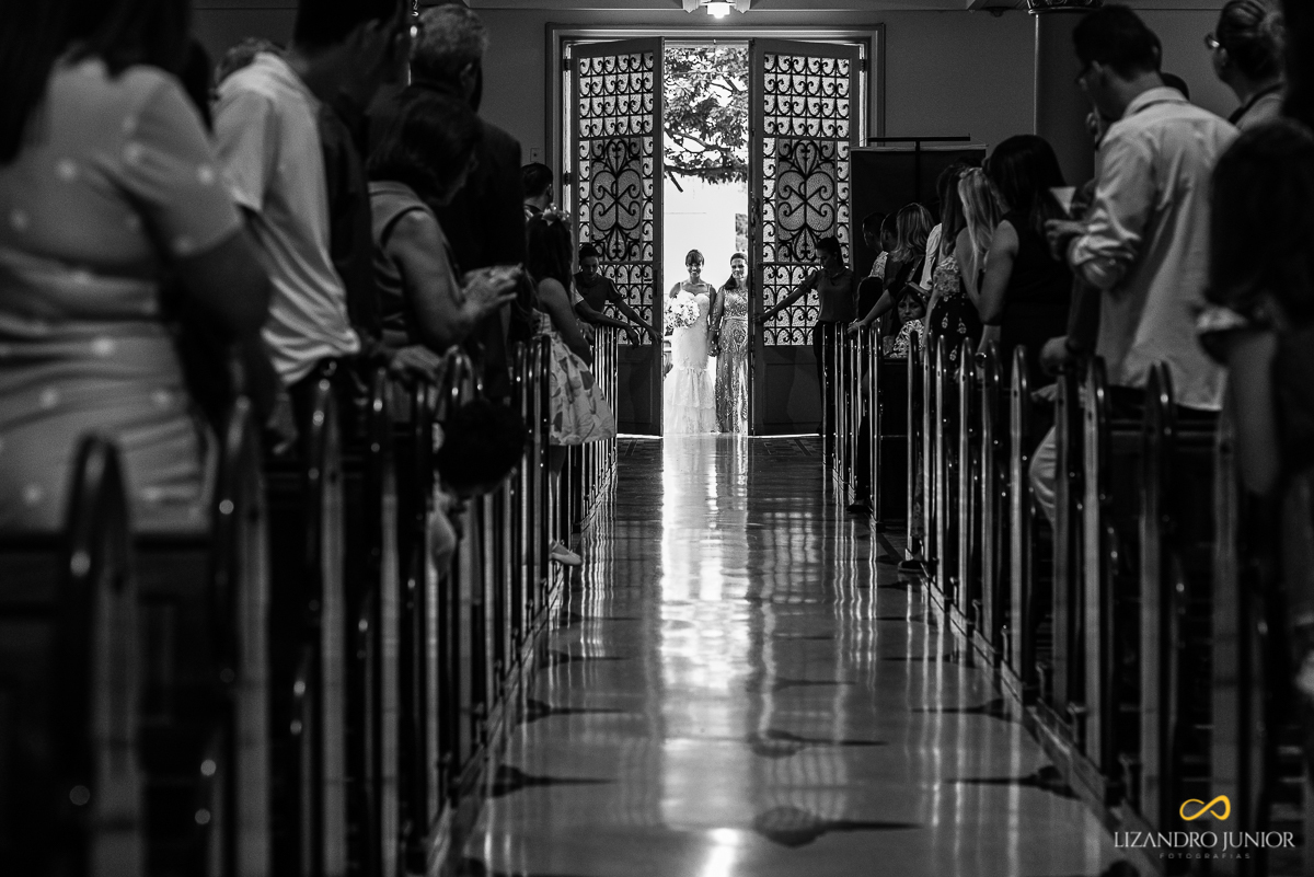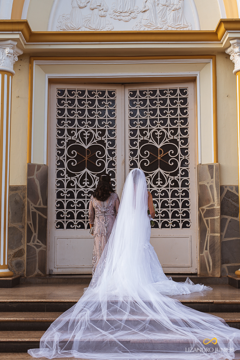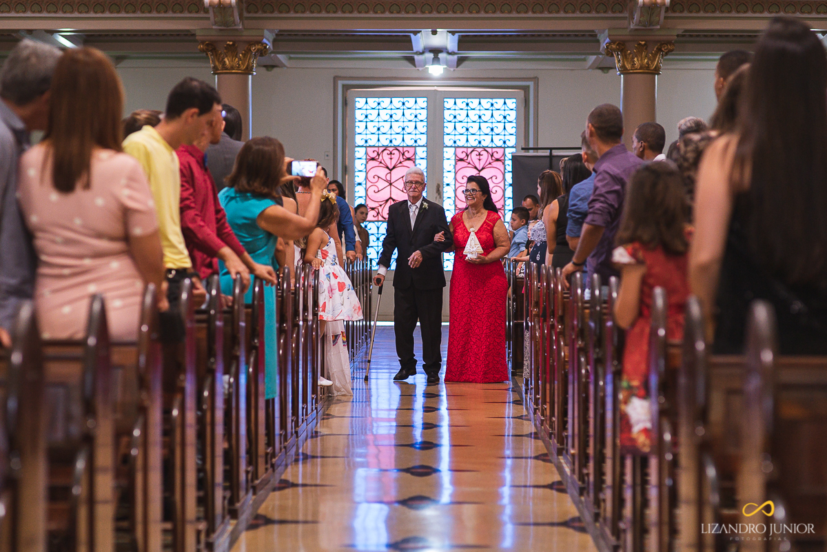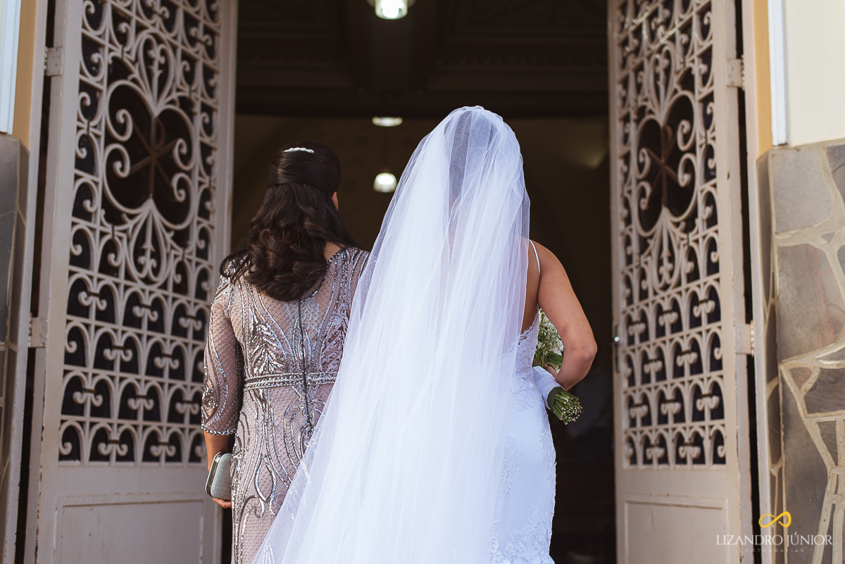 Ao som de Rejane Siqueira e Banda, os padrinhos entravam sorrindo de canto a canto do rosto. Denise havia escolhido a cor Vermelha para suas madrinhas que entraram arrasando. A cor forte destacava a cada entrada. Depois de algumas fotos no carro, Denise foi conduzida pela equipe de Cerimonial Rose Vieira a porta da Igreja. Nesse momento, com elas fechadas, todos ficam aguardando o tão esperado momento. Eis que a Marcha Nupcial é tocada e então o toque da Ave Maria se inicia. É chegado o momento de os noivos se encontrarem para o sim.