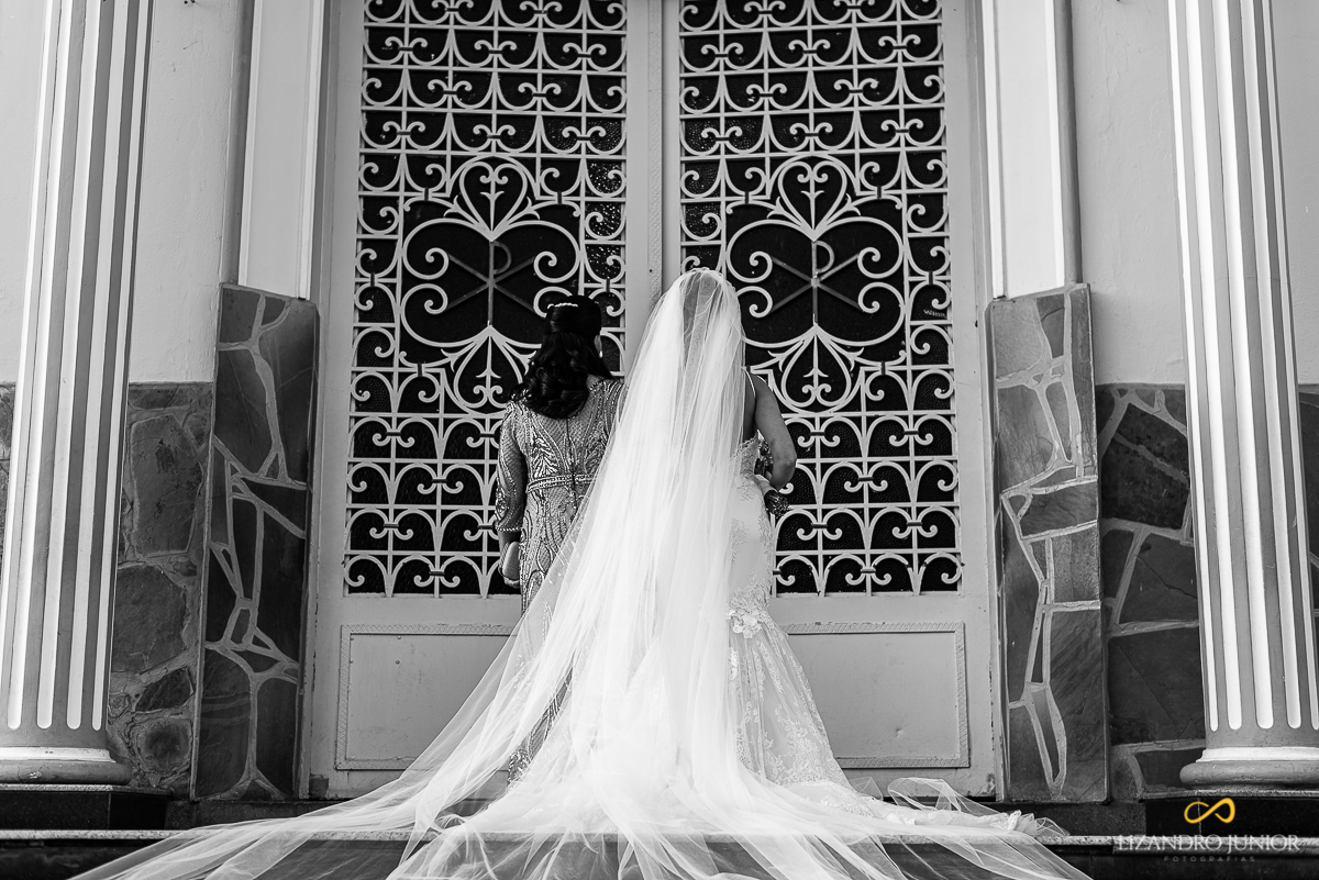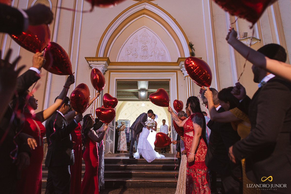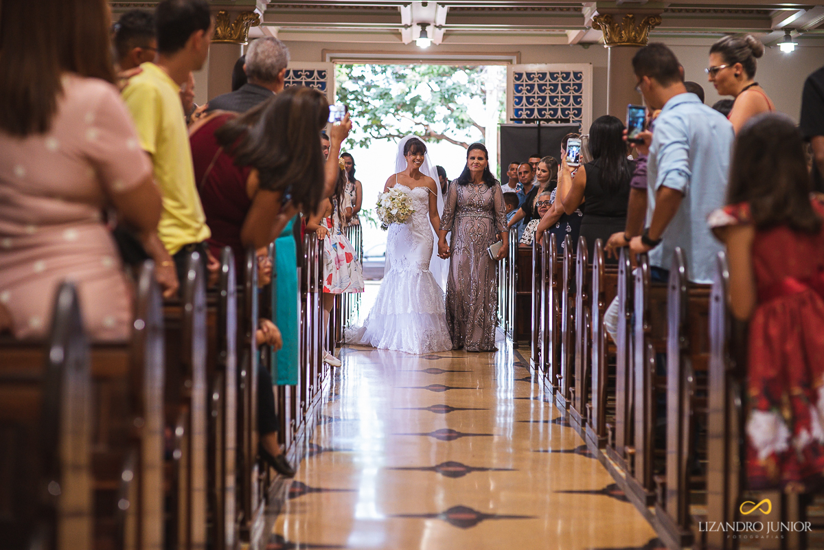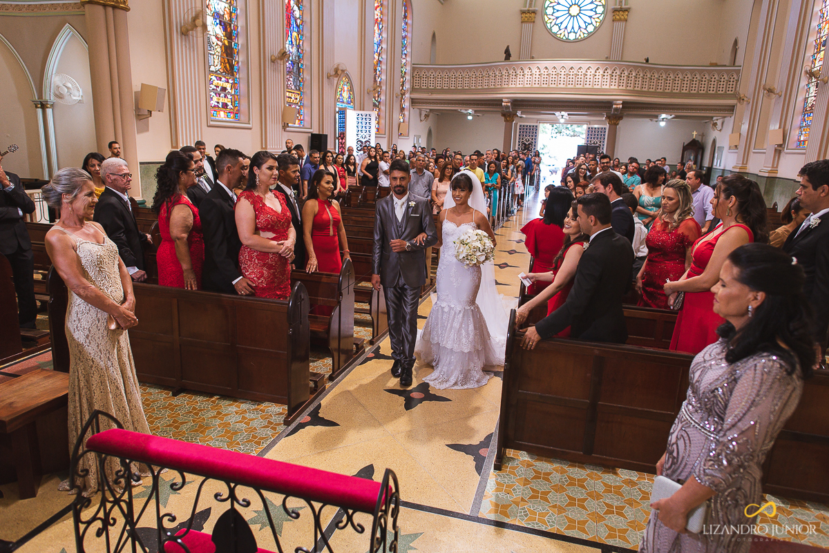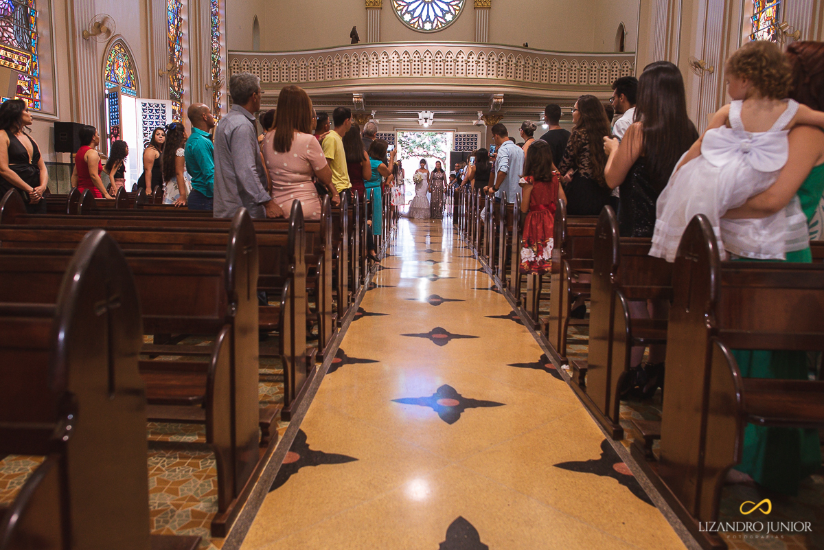 Ao som de Rejane Siqueira e Banda, os padrinhos entravam sorrindo de canto a canto do rosto. Denise havia escolhido a cor Vermelha para suas madrinhas que entraram arrasando. A cor forte destacava a cada entrada. Depois de algumas fotos no carro, Denise foi conduzida pela equipe de Cerimonial Rose Vieira a porta da Igreja. Nesse momento, com elas fechadas, todos ficam aguardando o tão esperado momento. Eis que a Marcha Nupcial é tocada e então o toque da Ave Maria se inicia. É chegado o momento de os noivos se encontrarem para o sim.