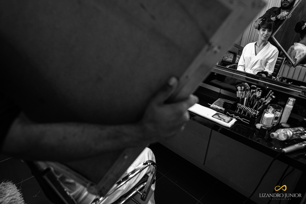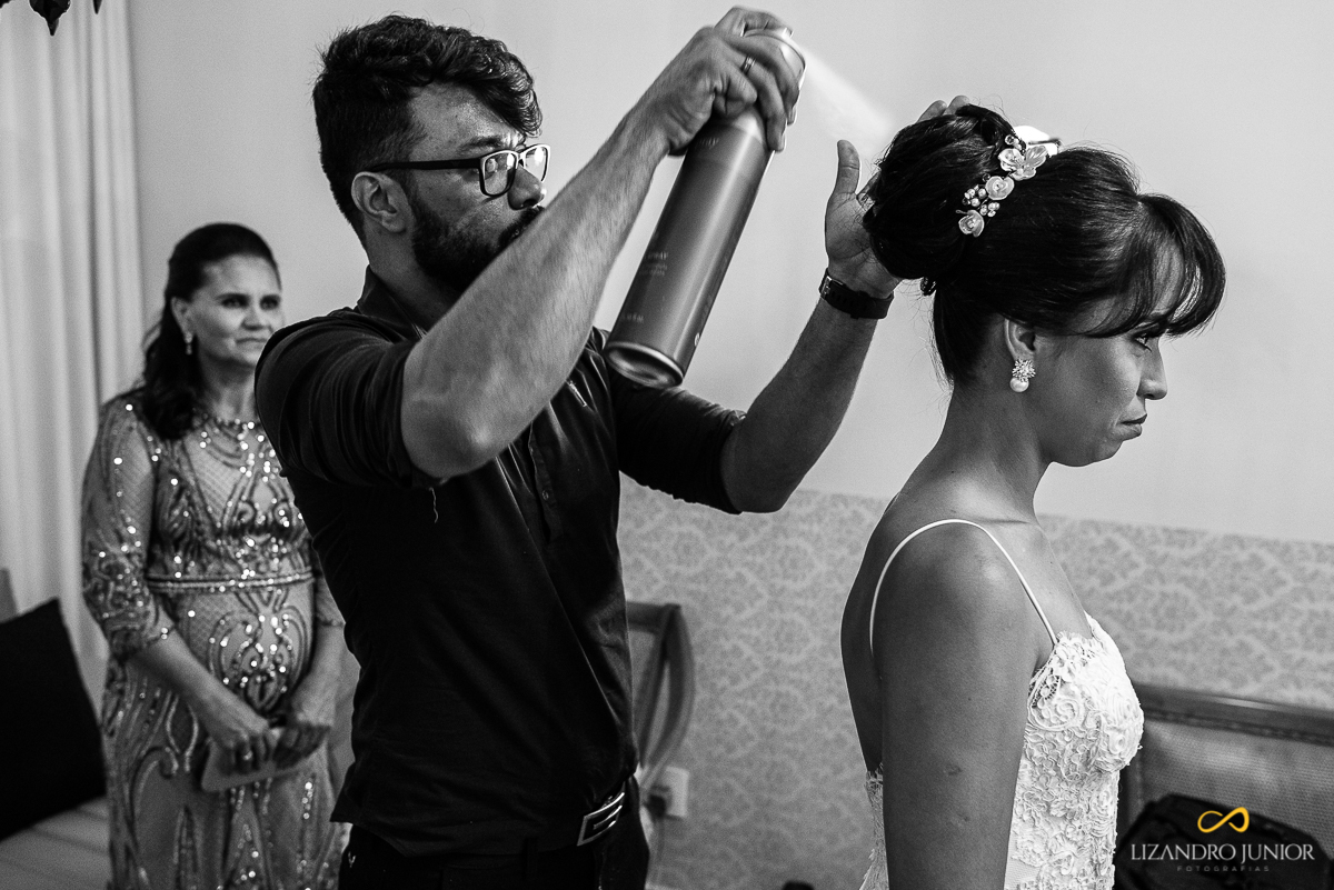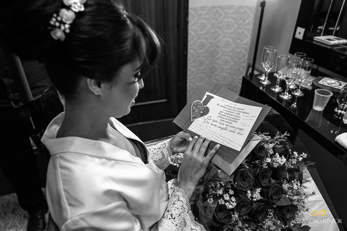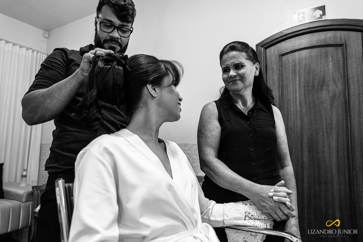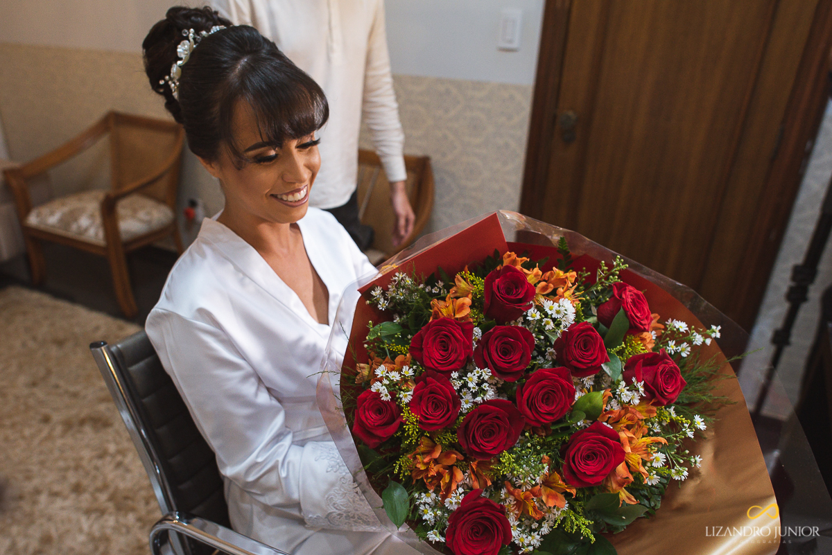 Creio que por ter sua mãe apoiando em todos os momentos durante a sua produção, Denise se sentia muito à vontade. Aos poucos, seu penteado maravilhoso tomava forma. Fizemos algumas fotos e logo ela estava pronta. Wender também se arrumou no salão Salvatore, porta a porta com sua amada. E claro, não poderia deixar de a surpreender com um mega buquê de flores. Com um cartão escrito à mão, uma mensagem de amor para ela. Os olhinhos brilhavam!