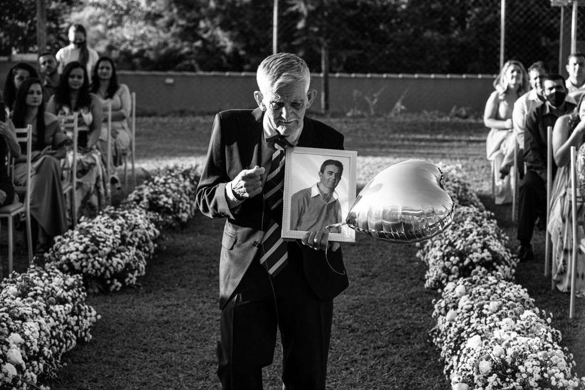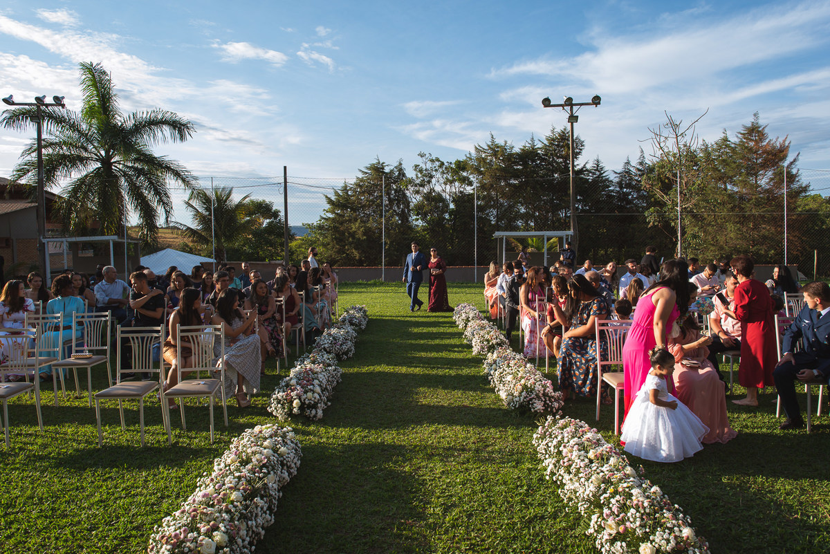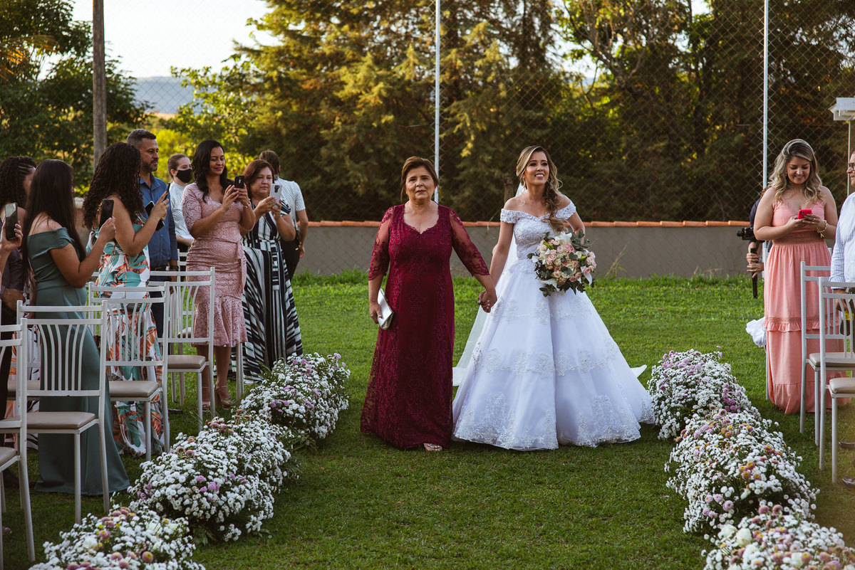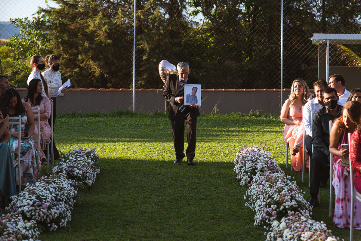 Isabela escolheu o veículo Ford 1929 da Neo Old Car que é um charme à parte. Ali se uniu a beleza da noiva com o charme desse carro maravilhoso. Iniciada a cerimônia, Wilton caminhou juntamente com sua mãe rumo ao altar logo após os pajens também entrarem. Uma das daminhas entrou correndo e muito sorridente. Esse momento foi muito divertido! Agora, Wilton se despediu de sua mãe e aguardou a entrada triunfal da sua noiva. Isabela preparou uma surpresa muito, mas muito emocionante mesmo. Seu papai faleceu há algum tempo e ela fez questão de homenagear seu genitor. Foi recitado um texto belíssimo e enquanto era falado, seu avô entrou carregando a foto do seu filho (Papai da noiva) e com um balão escrito "PAI", que simbolizava a presença dele na cerimônia.