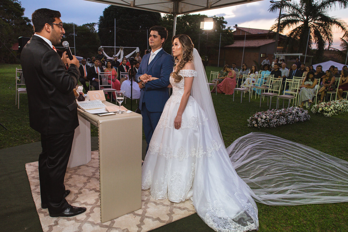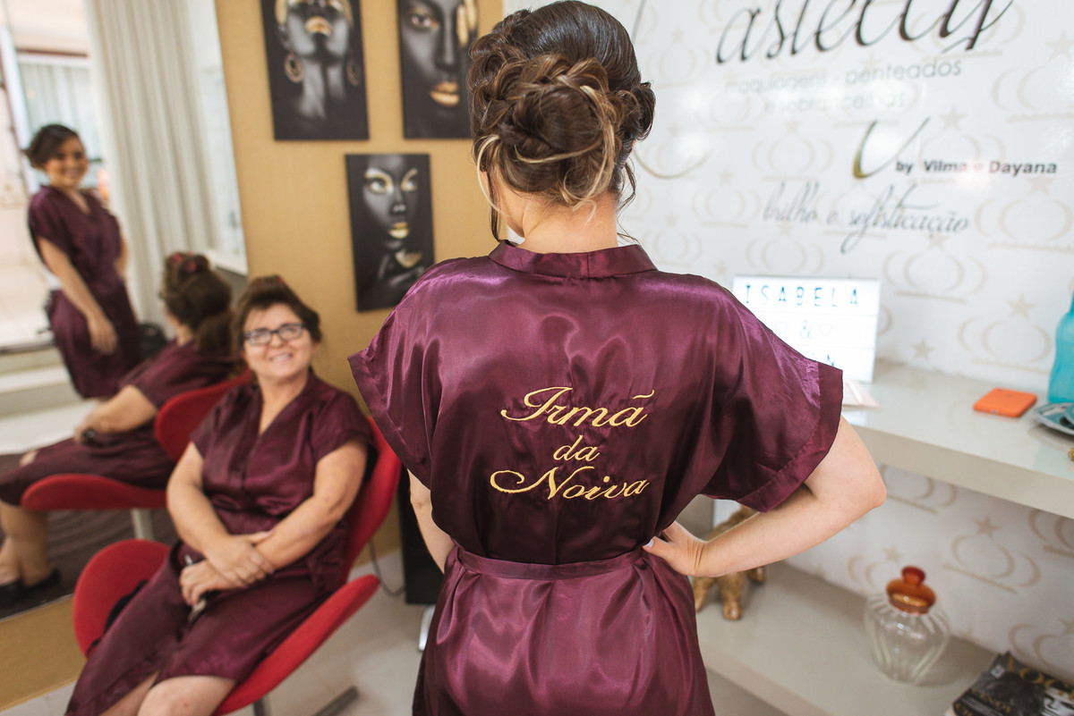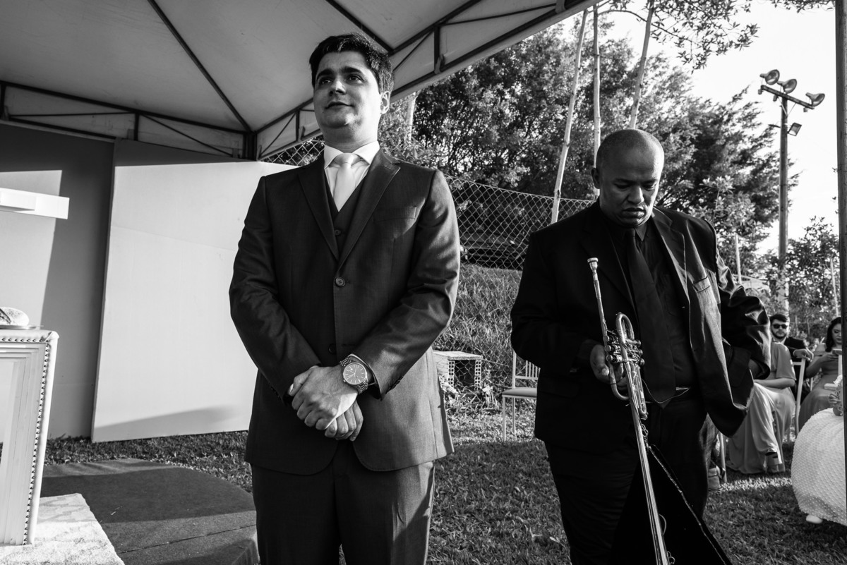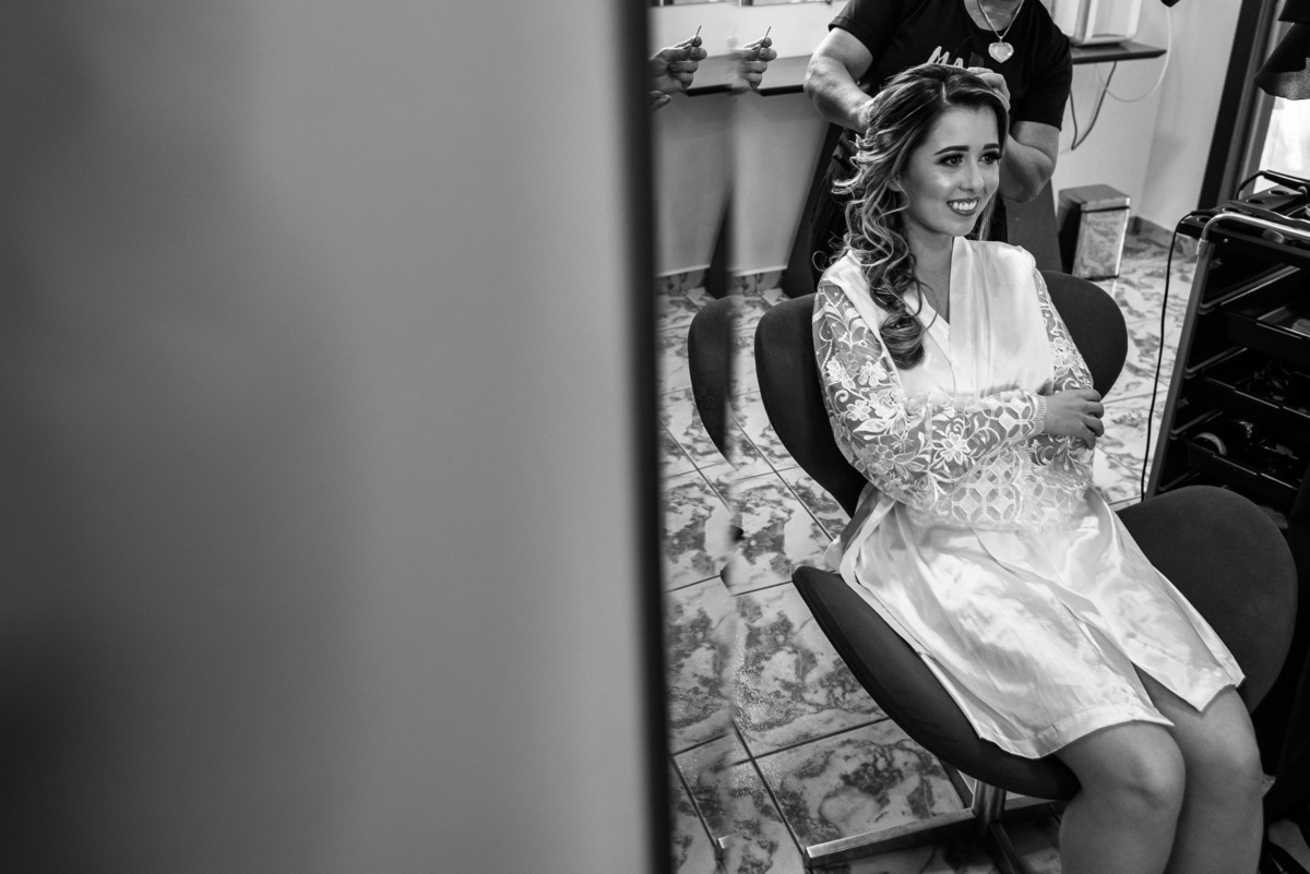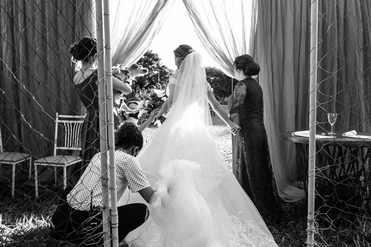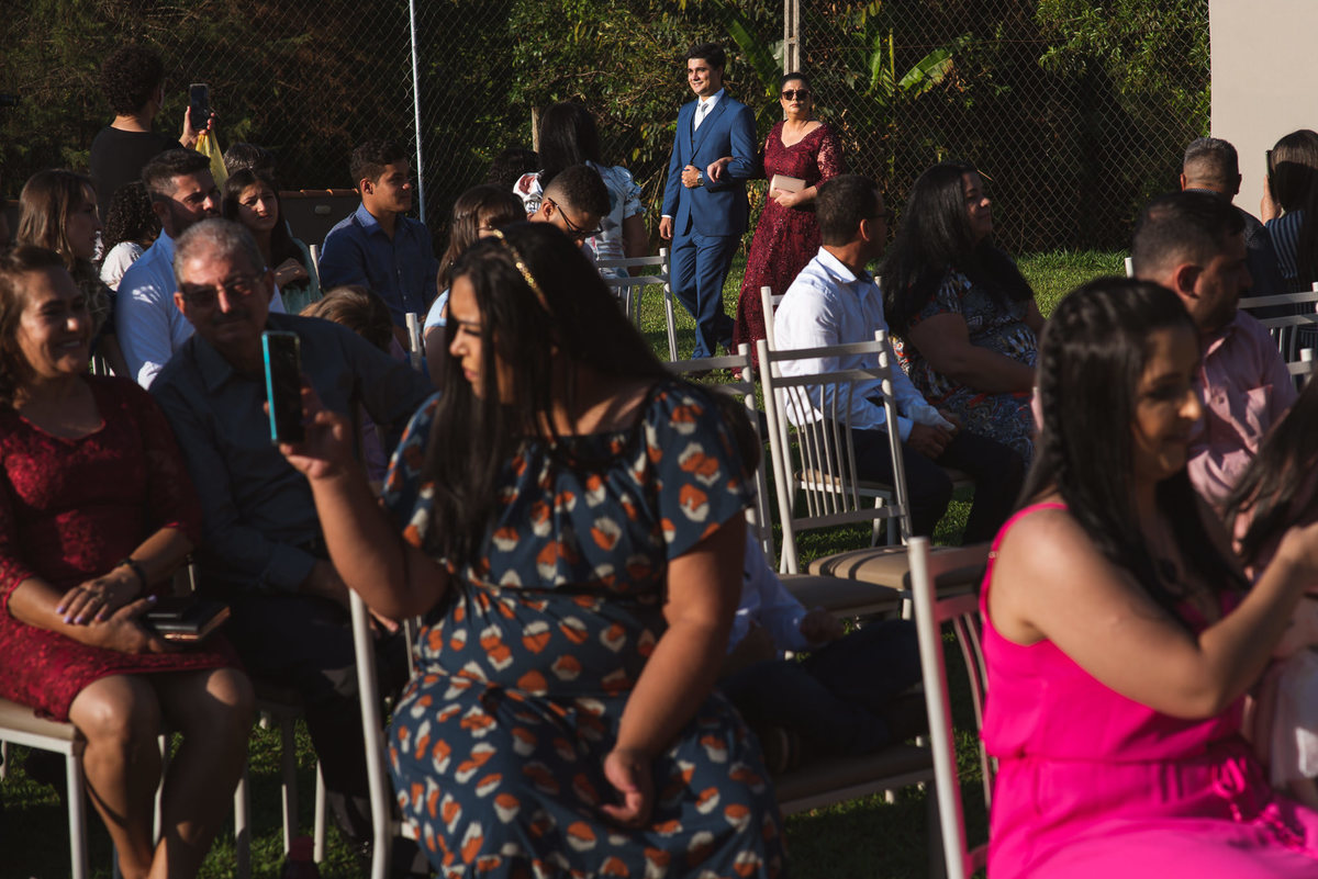 Tudo isso foi descontraindo a noiva e fazendo com que o making of ficasse ainda mais leve e divertido. O vestido que Isabela escolheu é da Tailiny Coelho Alta Costura, e foi muito bem escolhido. Assim que ela vestiu, parecia ter sido feito sob medida pra noiva. Agora, finalizando sua produção, com o penteado maravilhoso feito pelas mãos de Vilma Castelly, a noiva estava prontinha. Fizemos algumas fotos e partimos para o local da cerimônia, chamado Chácara Resende. Lá chegando, encontrei com o noivo todo sorridente e feliz. Ansioso pela chegada da sua noiva, ele cumprimentava os convidados que ali chegavam.