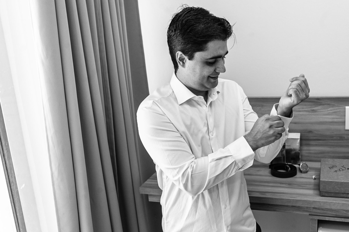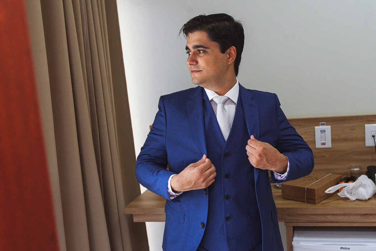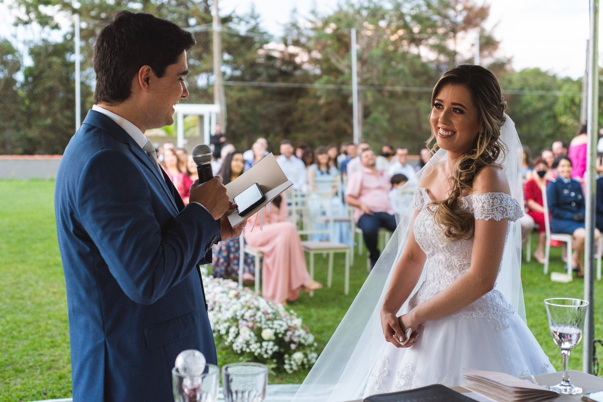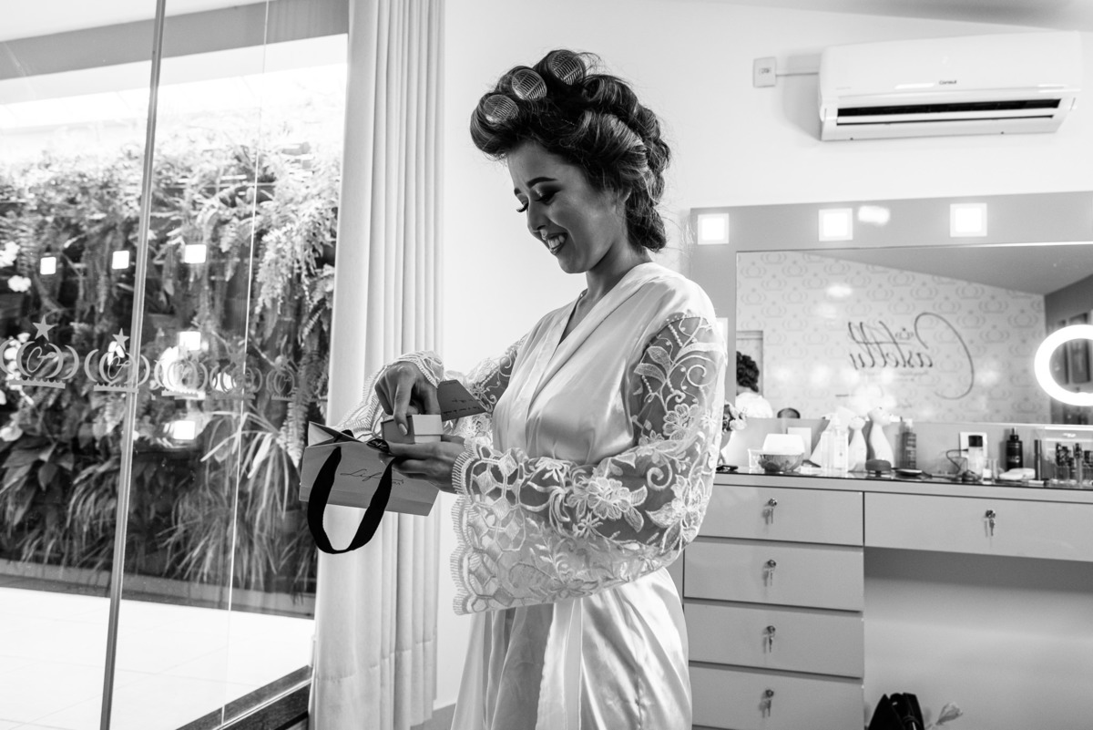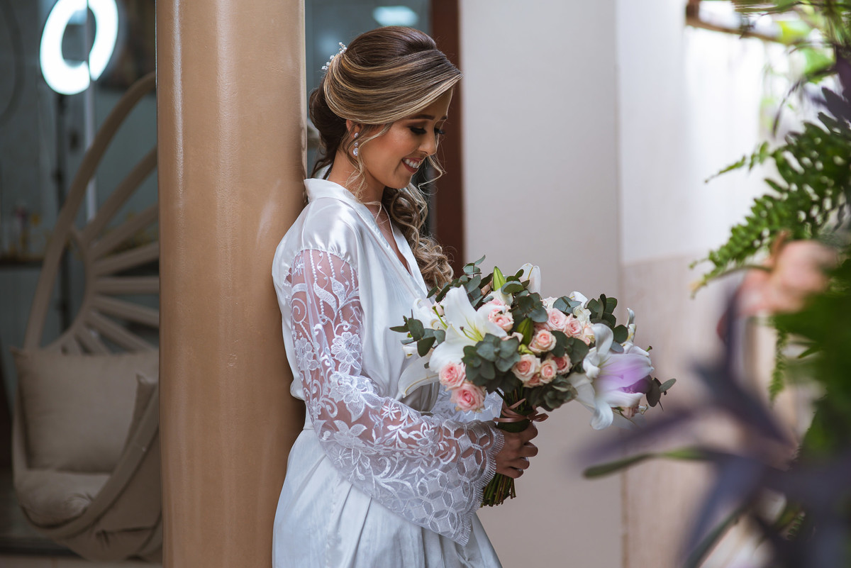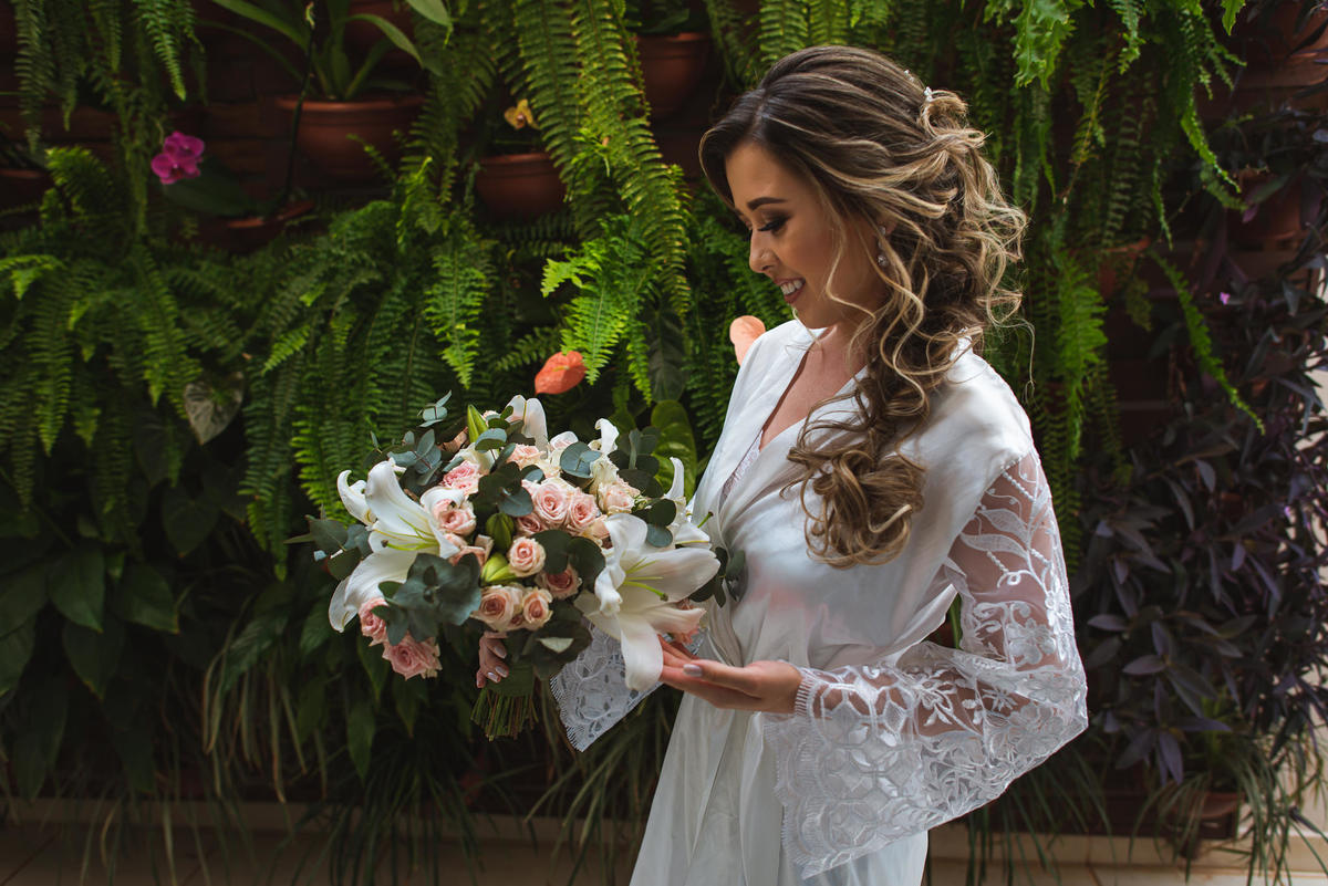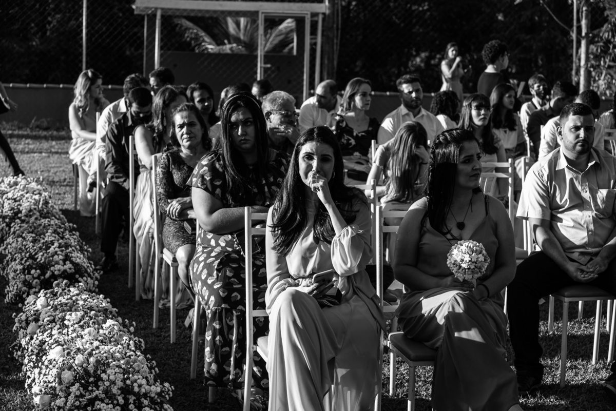 Tudo isso foi descontraindo a noiva e fazendo com que o making of ficasse ainda mais leve e divertido. O vestido que Isabela escolheu é da Tailiny Coelho Alta Costura, e foi muito bem escolhido. Assim que ela vestiu, parecia ter sido feito sob medida pra noiva. Agora, finalizando sua produção, com o penteado maravilhoso feito pelas mãos de Vilma Castelly, a noiva estava prontinha. Fizemos algumas fotos e partimos para o local da cerimônia, chamado Chácara Resende. Lá chegando, encontrei com o noivo todo sorridente e feliz. Ansioso pela chegada da sua noiva, ele cumprimentava os convidados que ali chegavam.