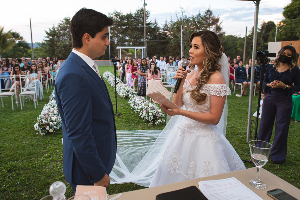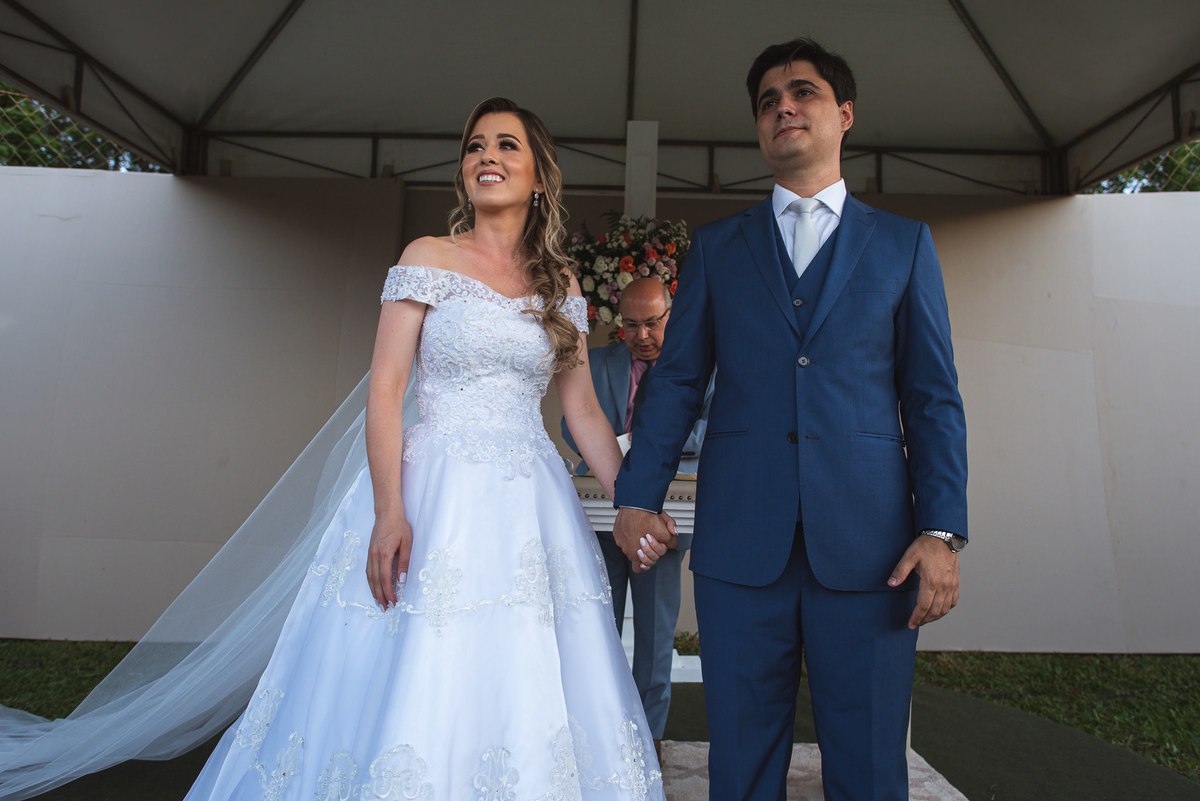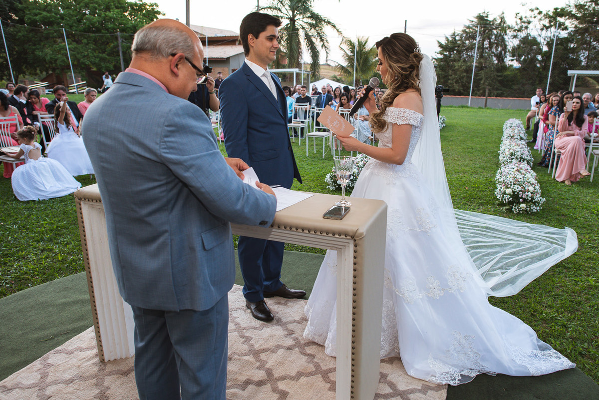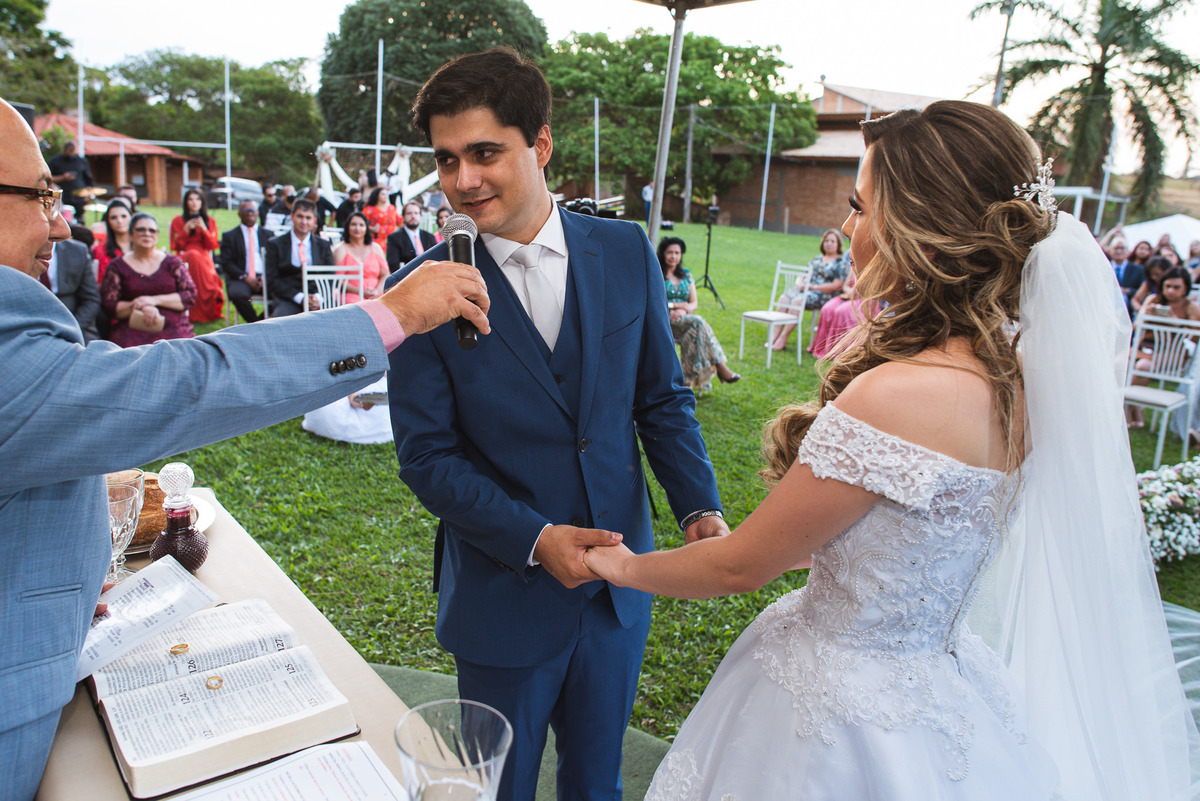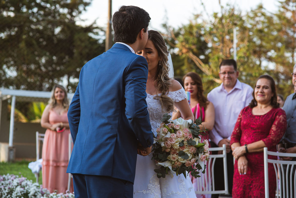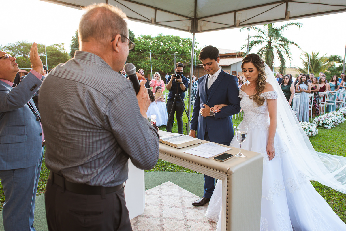 Pra começar, eles fizeram um voto de dar o primeiro beijo somente no altar! Sim, é difícil de acreditar que hoje ainda existam casais tão românticos e dedicados à palavra de Deus que possam ainda fazer um voto assim. Pois eles fizeram e cumpriram. Foi certamente um casamento muito especial, ainda mais por ter esse detalhe. A semana que antecedeu o casamento foi um pouco conturbada. Estava programado muito chuva para toda a região aqui do alto Paranaíba, e claro, todos envolvidos no casamento estavam apreensivos com essa possibilidade.